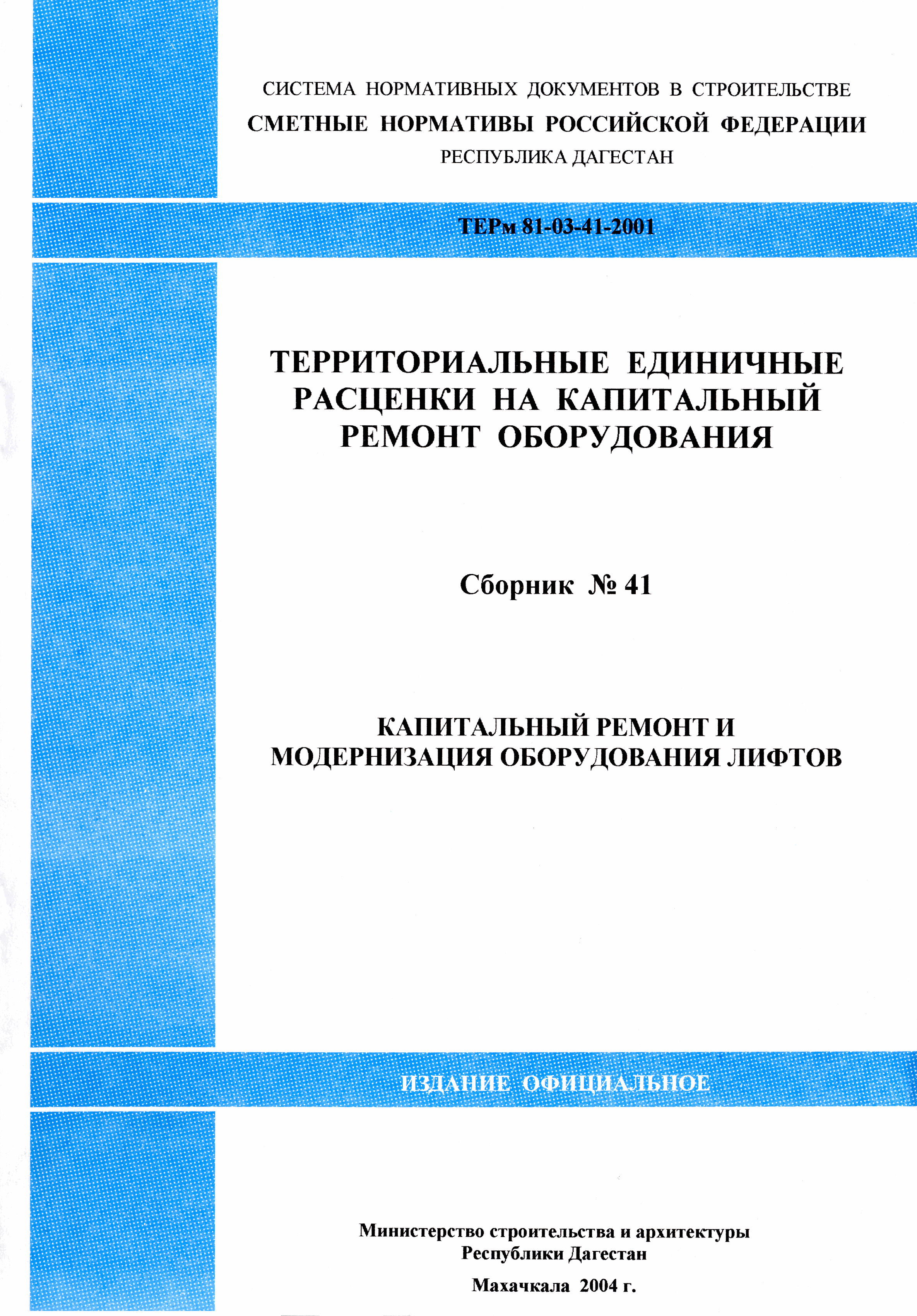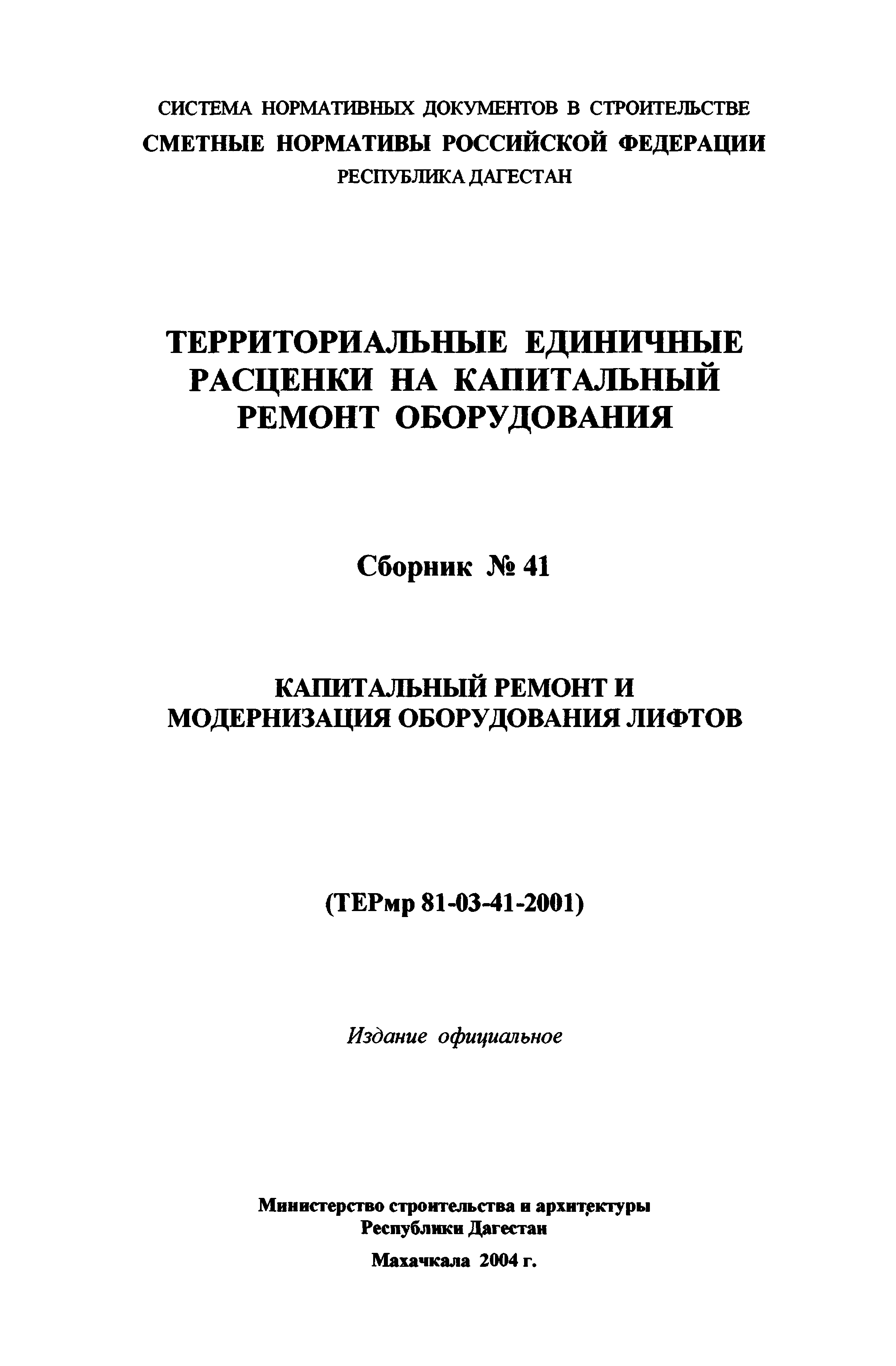 Скачать ТЕРмр Республика Дагестан 81-03-41-2001 Капитальный ремонт и модернизация оборудования лифтов. Территориальные единичные расценки на капитальный ремонт оборудованияДата актуализации: 01.01.2021