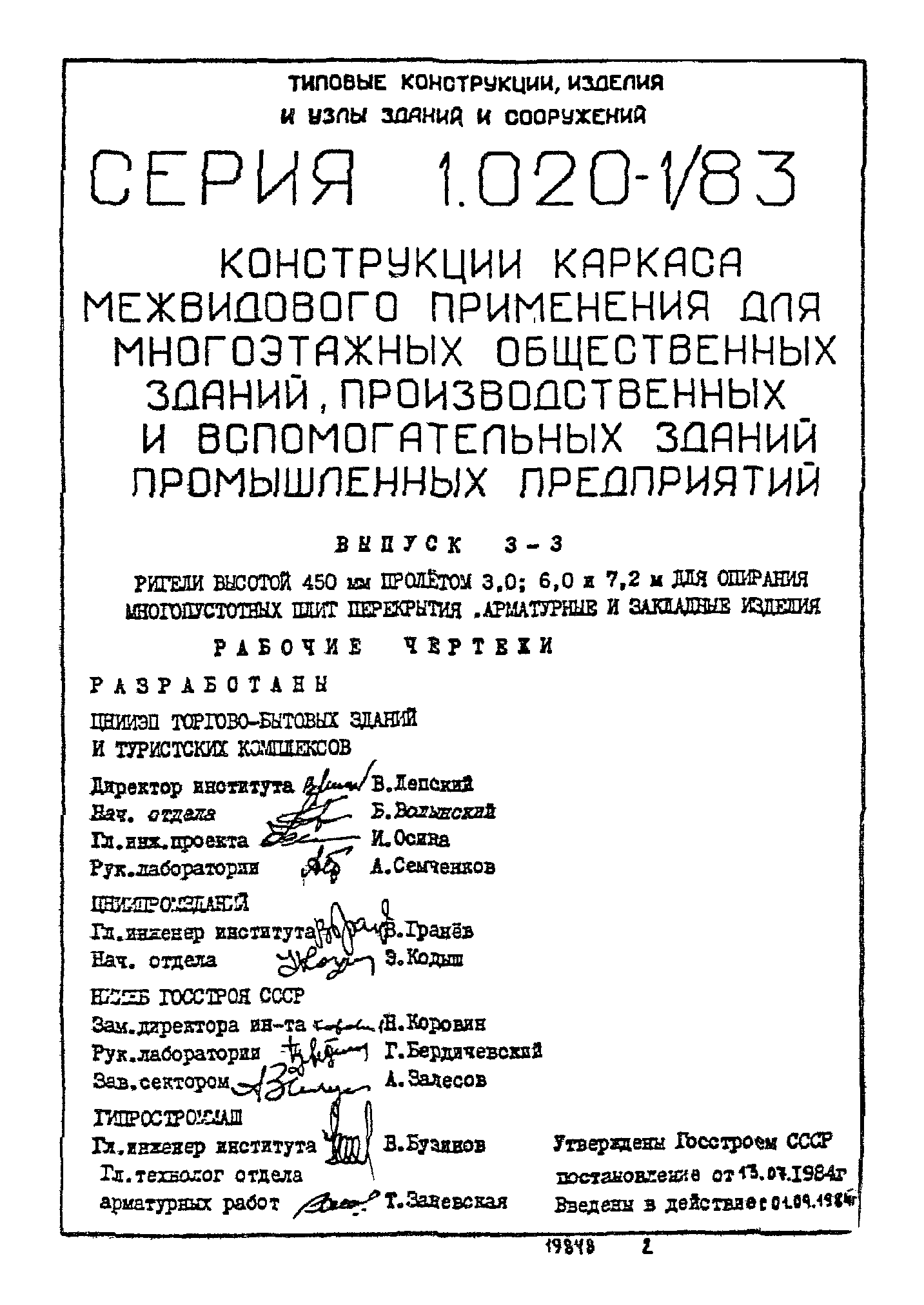 | Разработан: | НИИЖБ Госстроя СССР ЦНИИпромзданий ЦНИИЭП торгово-бытовых зданий и туристских комплексов Гипростроммаш |