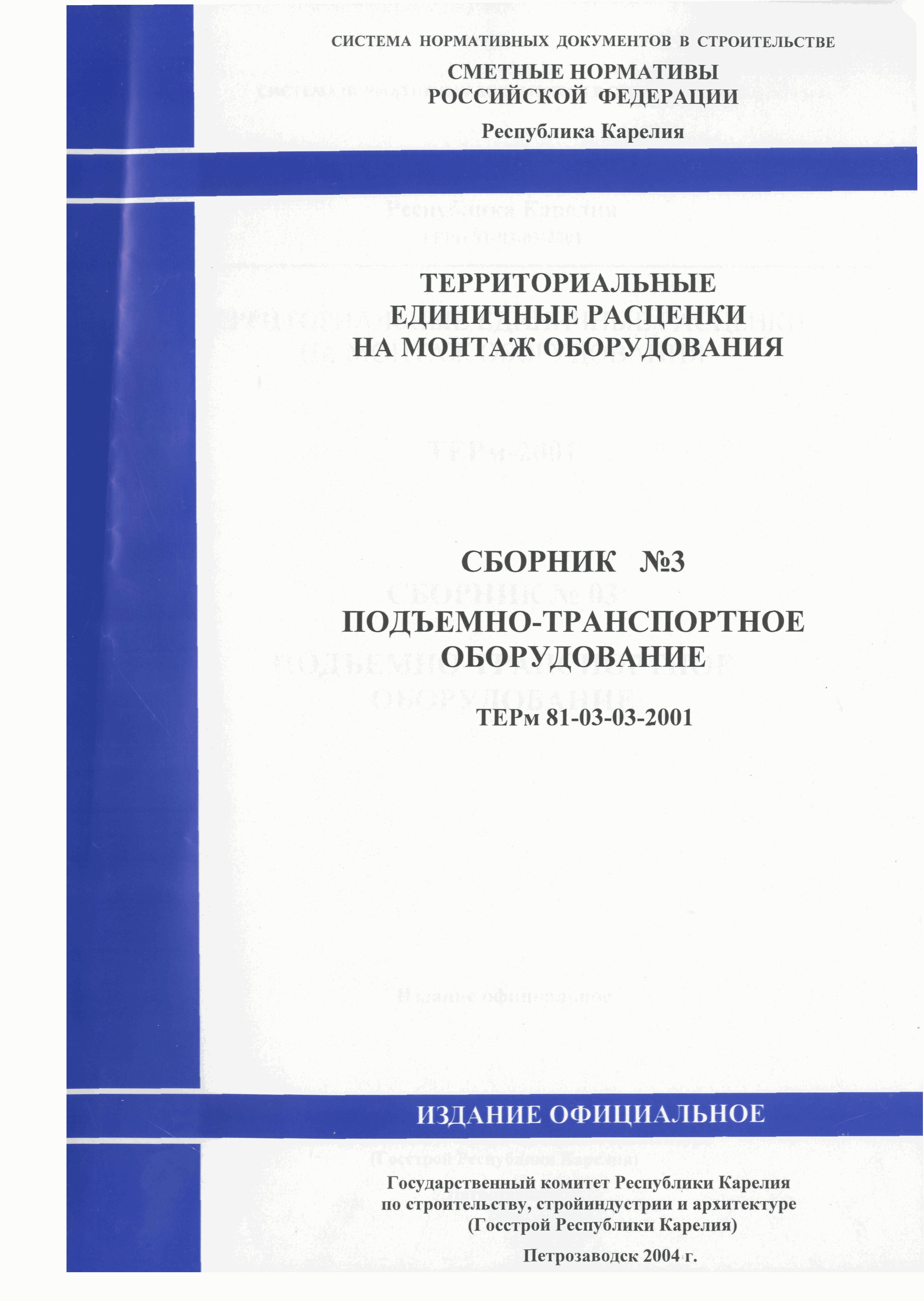 Скачать ТЕРм Республика Карелия 2001-03 Подъемно-транспортное оборудование. Территориальные единичные расценки на монтаж оборудования в Республике КарелияДата актуализации: 01.01.2021