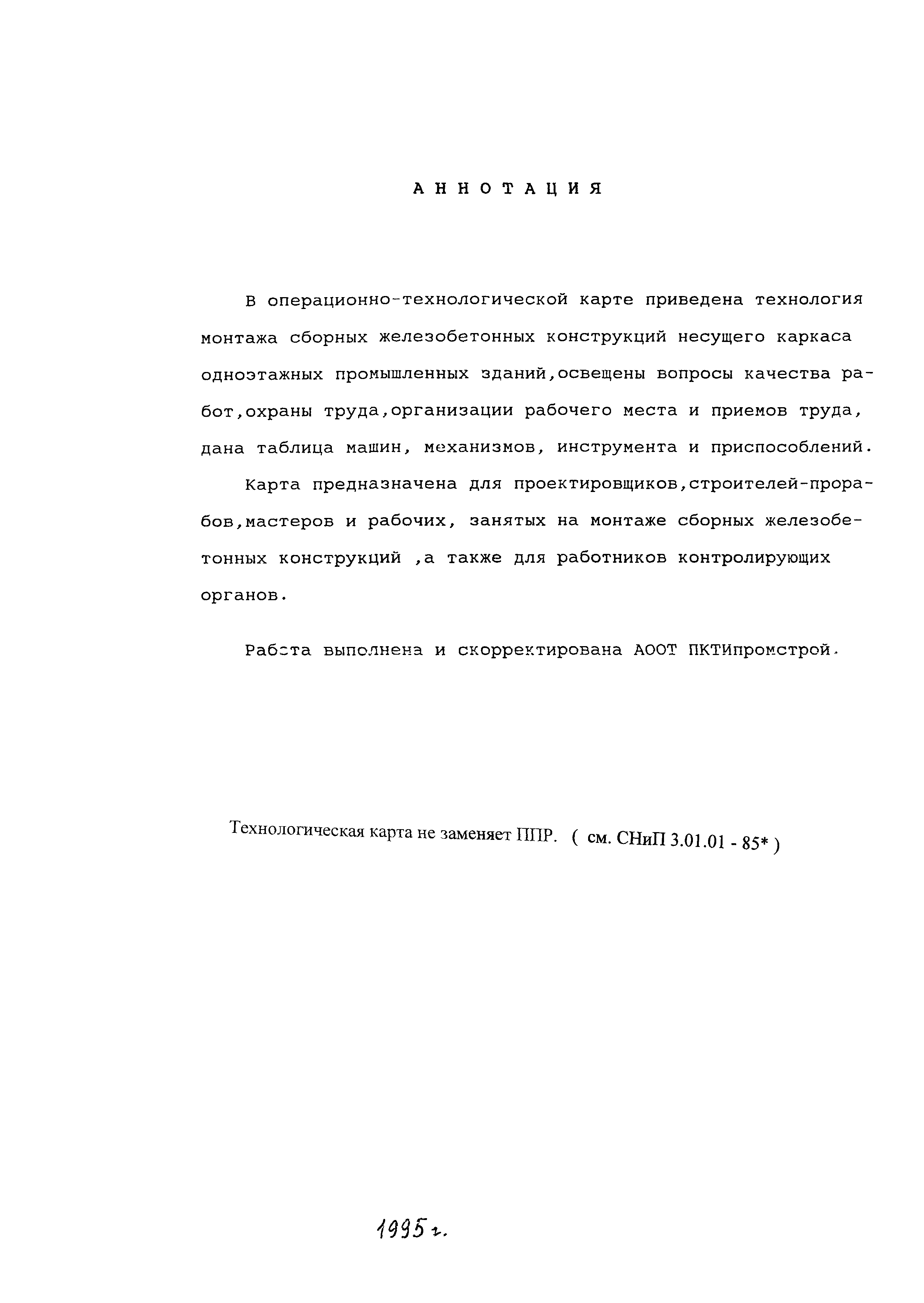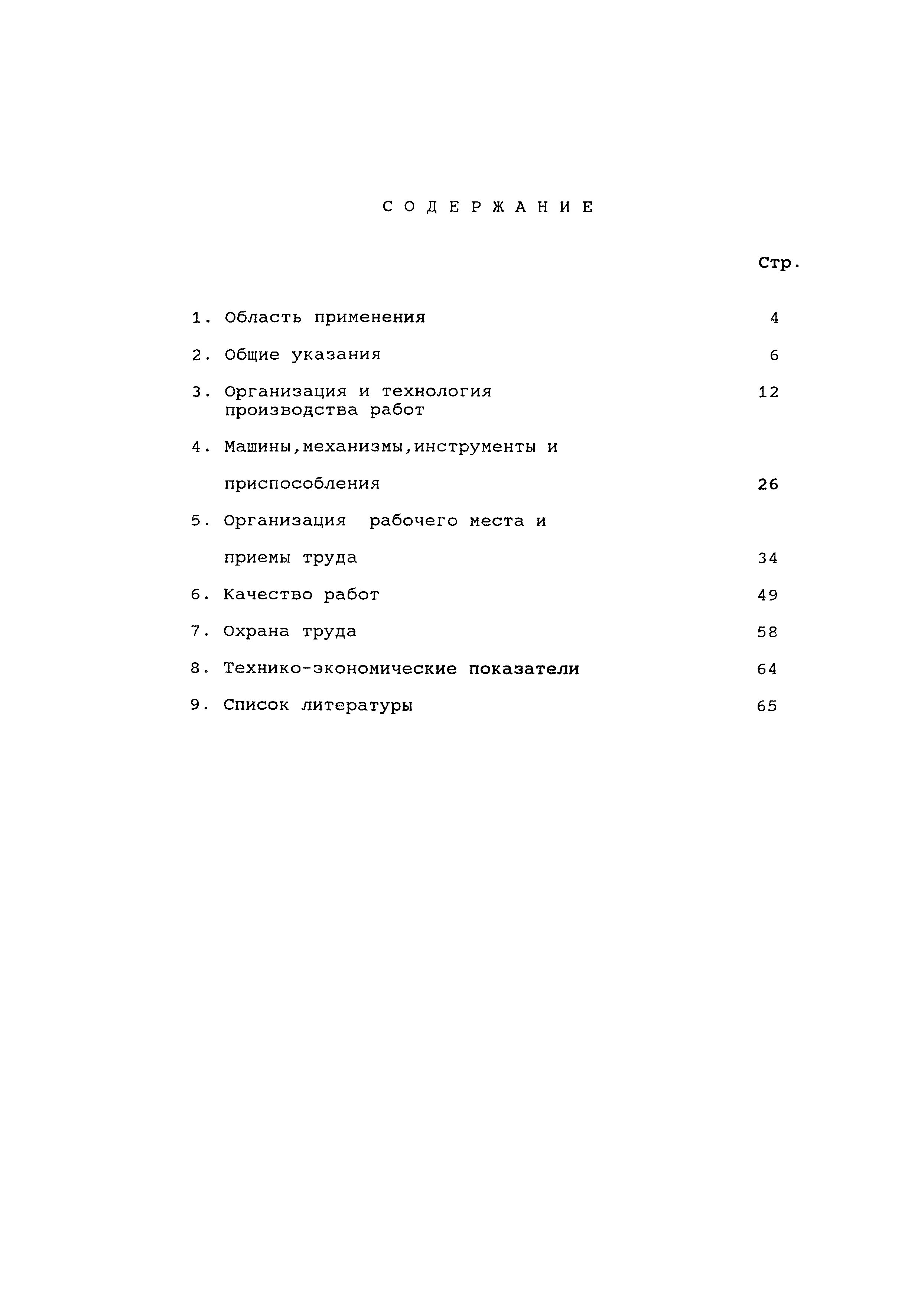 | Оглавление: | 1 Область применения 2 Общие указания 3 Организация и технология производства работ 4 Машины, механизмы, инструменты и приспособления 5 Организация рабочего места и приемы труда 6 Качество работ 7 Охрана труда 8 Технико-экономические показатели 9 Список литературы |