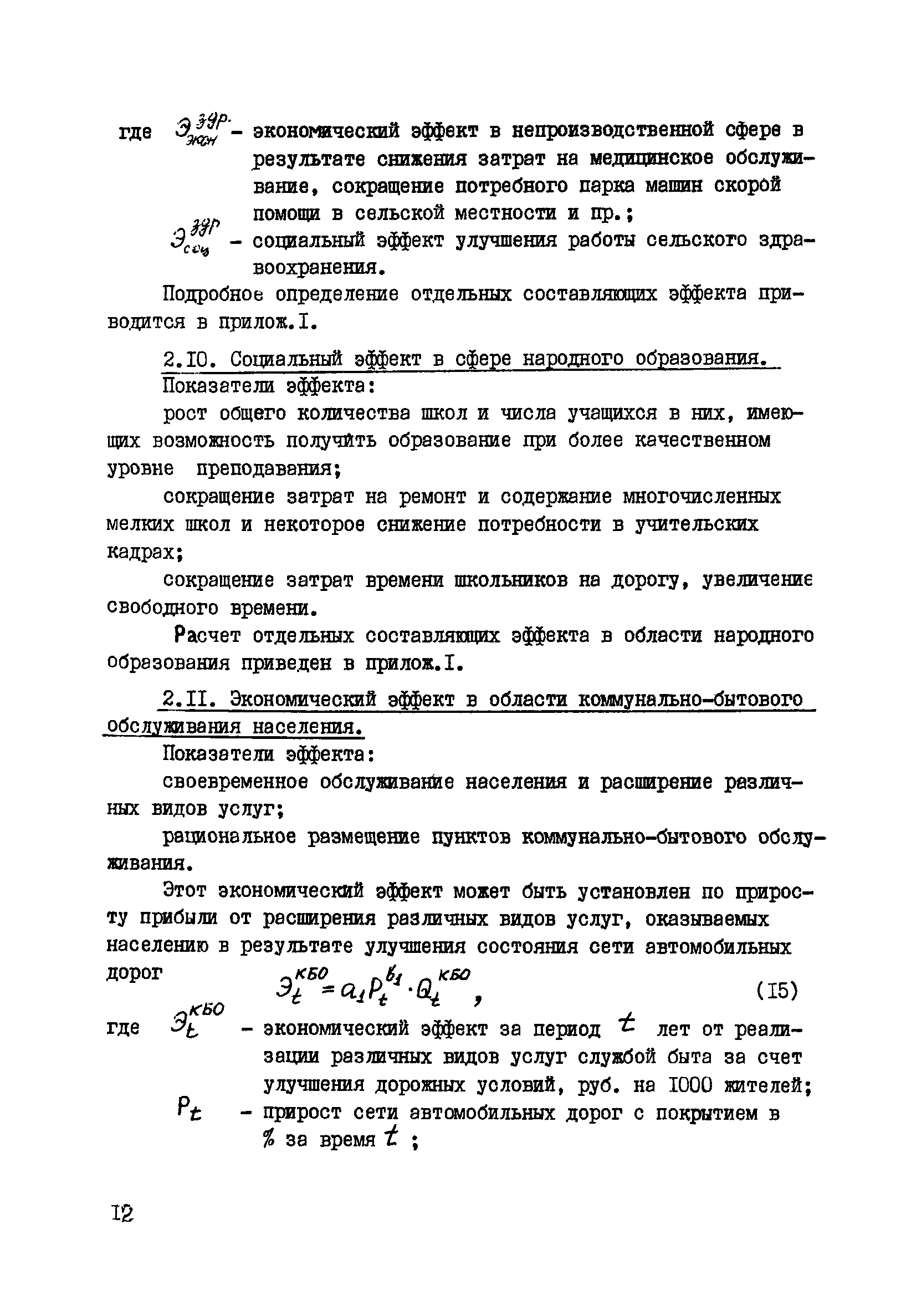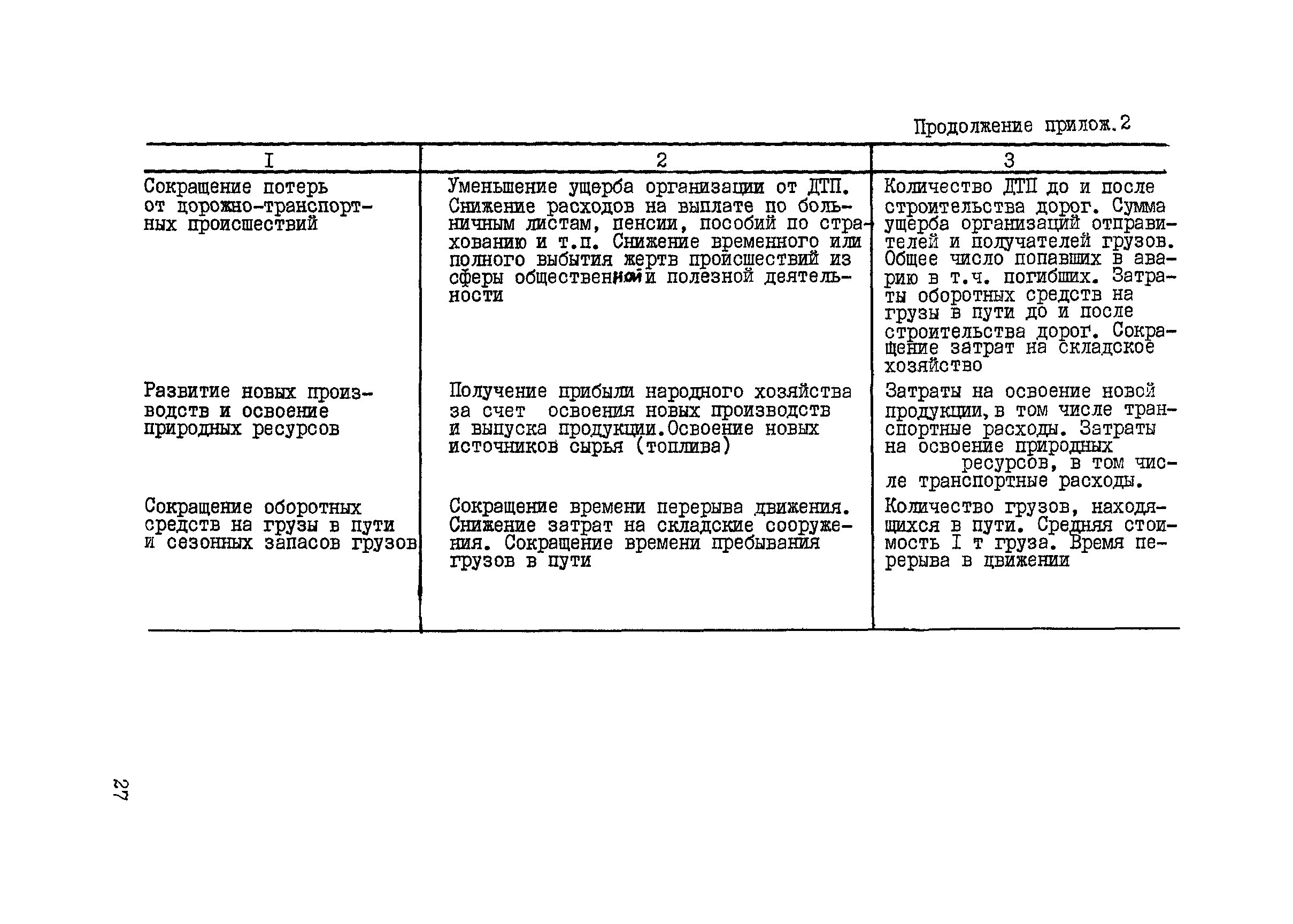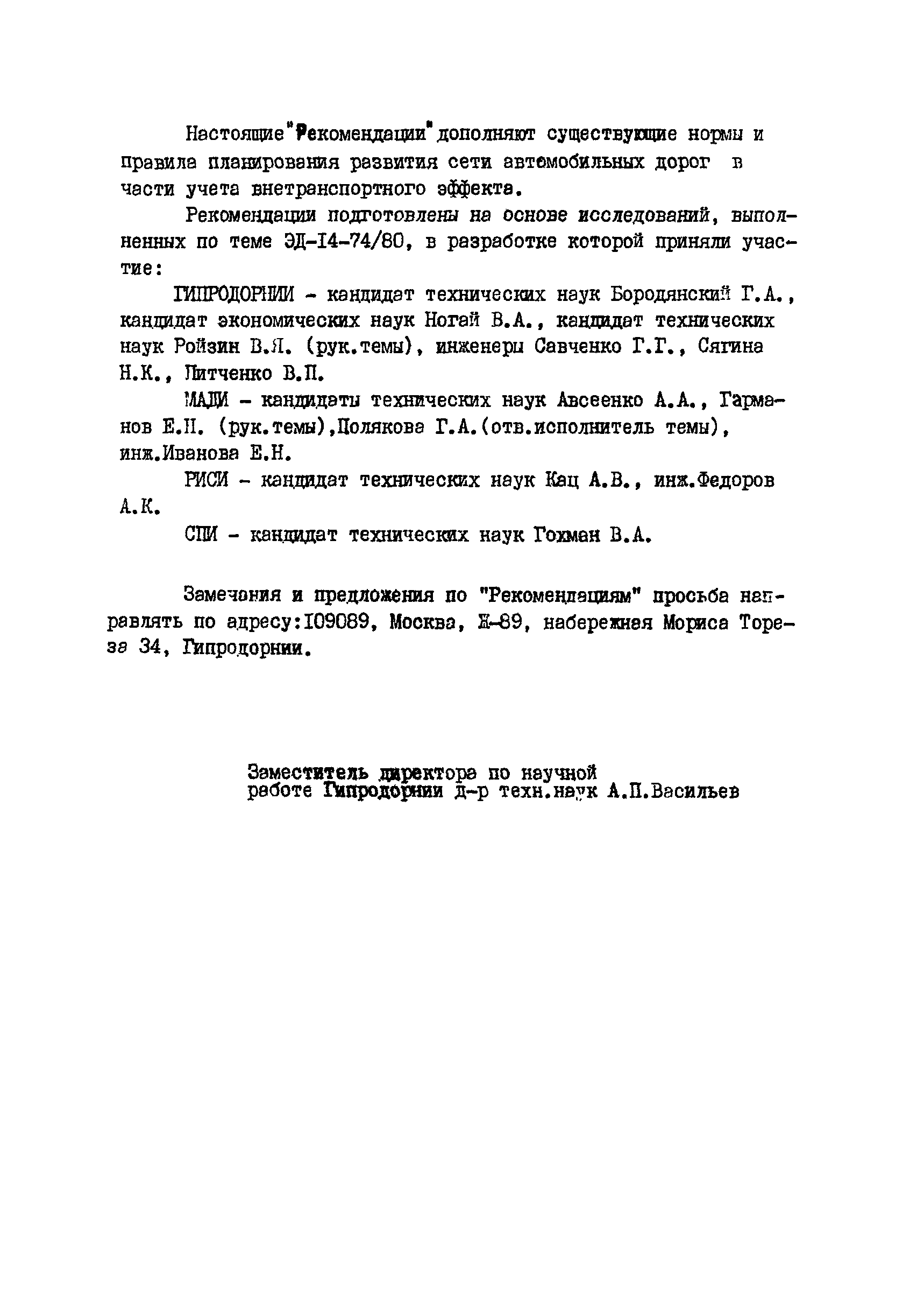 Рекомендации по учету внетранспортного эффекта при планировании сети автомобильных дорог| Статус: | действует | | Название рус.: | Рекомендации по учету внетранспортного эффекта при планировании сети автомобильных дорог | | Дата добавления в базу: | 01.09.2013 | | Дата актуализации: | 01.01.2021 | | Оглавление: | 1 Общие положения 2 Разновидности внетранспортного эффекта и основные расчетные формулы Приложение 1. Определение отдельных составляющих внетранспортного эффекта Приложение 2. Состав показателей, необходимых для сбора данных о внетранспортном эффекте Приложение 3. Таблицы и нормативные показатели Приложение 4. Пример расчета внетранспортного эффекта | | Разработан: | РИСИ МАДИ Гипродорнии