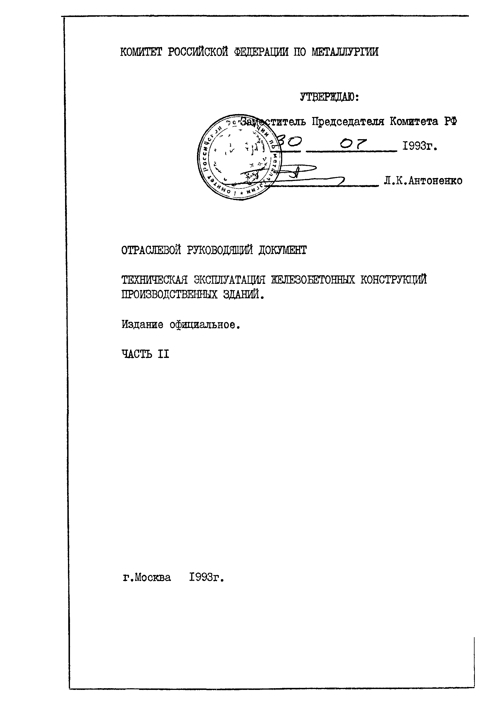 | Название рус.: | Отраслевой руководящий документ. Техническая эксплуатация железобетонных конструкций производственных зданий. Часть II |