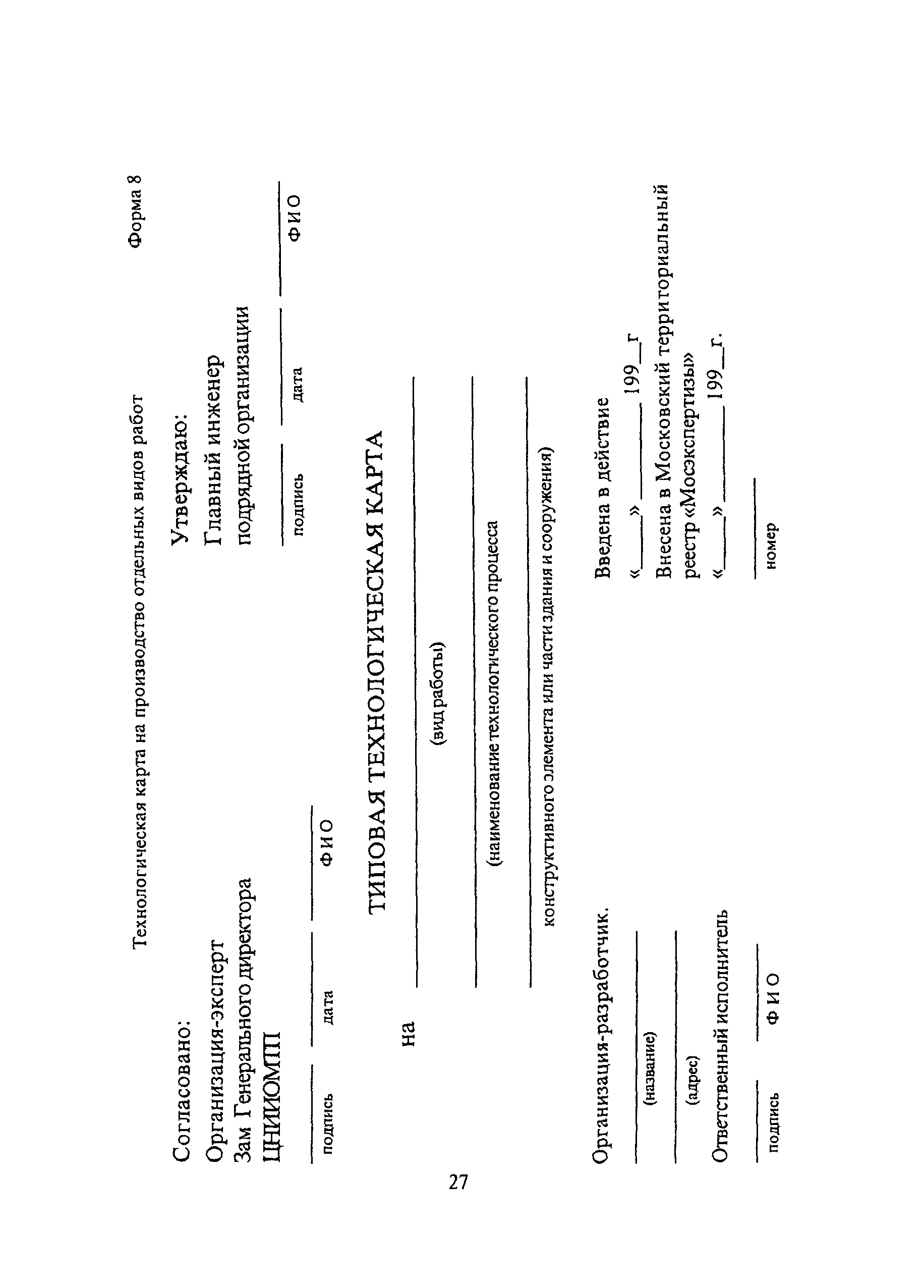 | Оглавление: | 1. Общие положения 2. Состав и содержание технологической карты 3. Порядок разработки, экспертизы, привязки, утверждению и регистрации технологических карт Приложение |