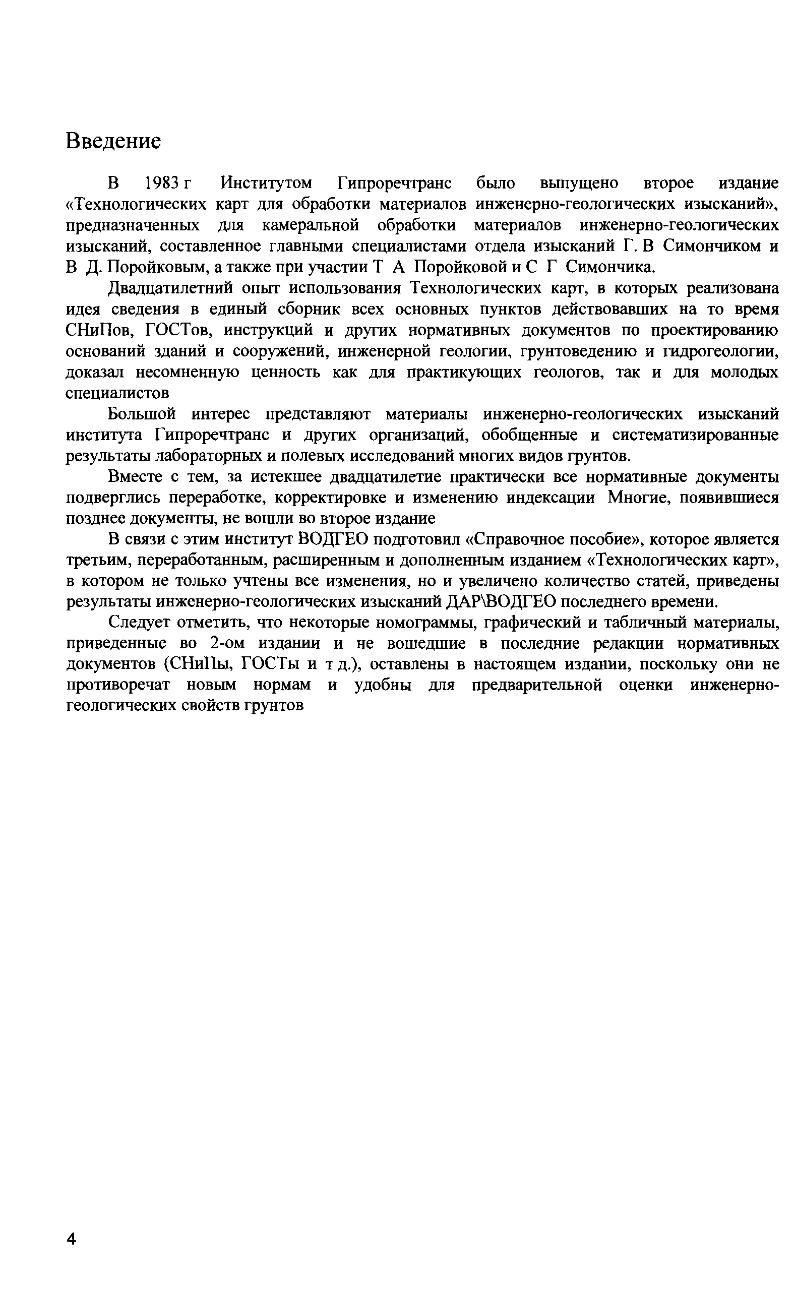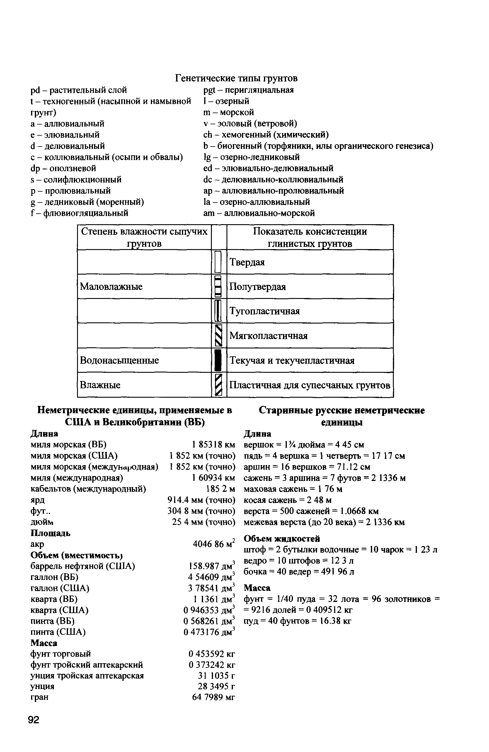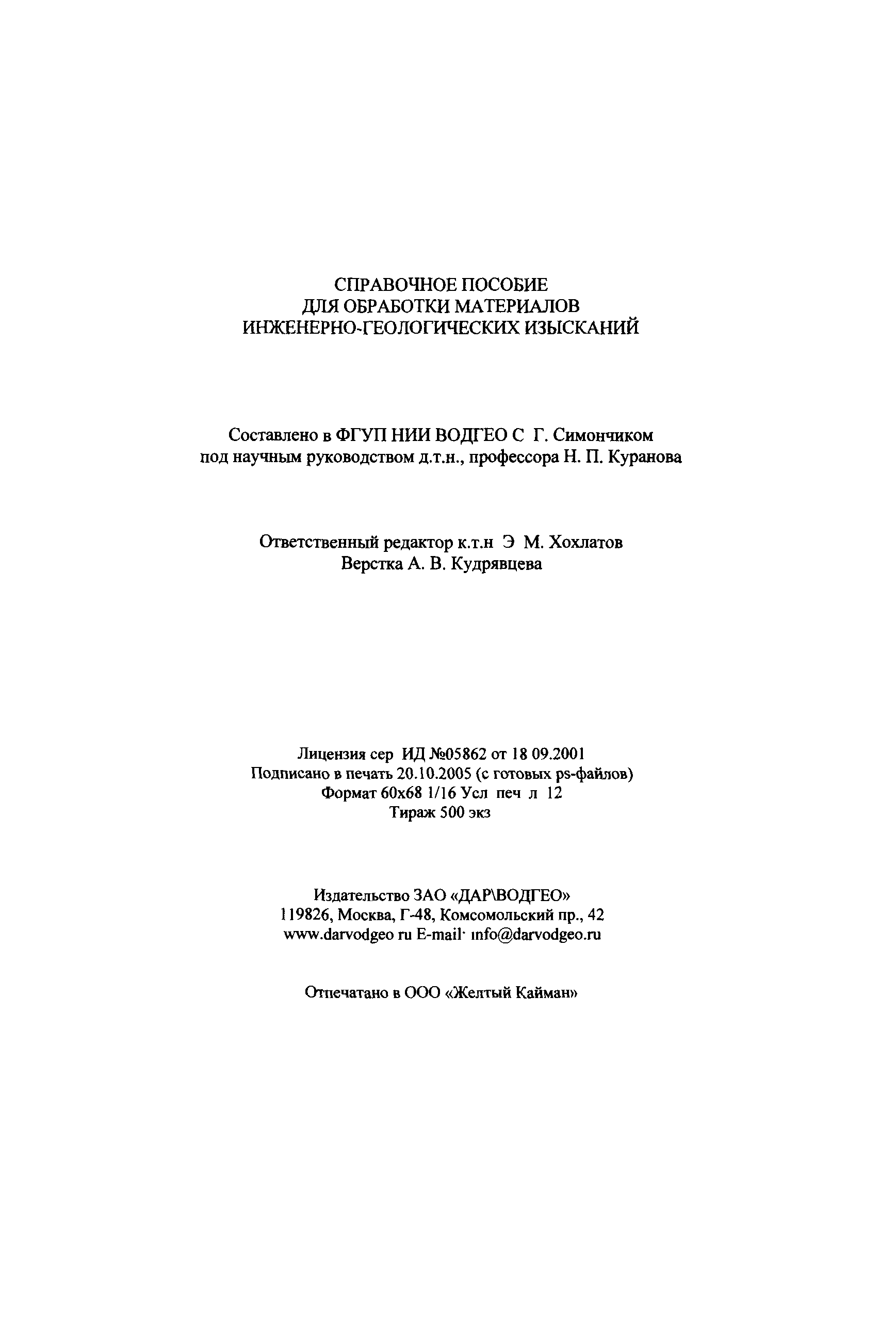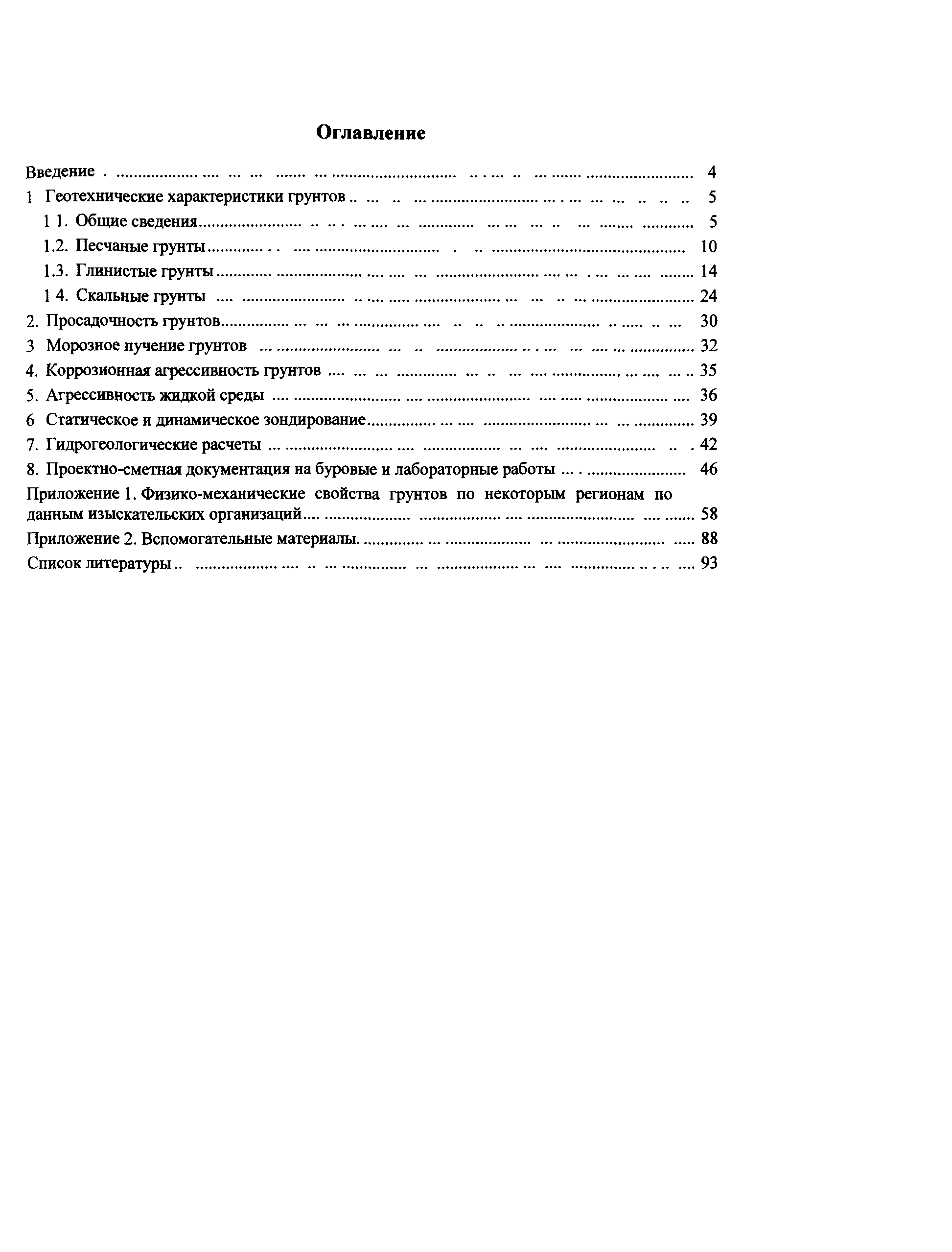 | Оглавление: | Введение 1 Геотехнические характеристики грунтов 1.1 Общие сведения 1.2 Песчаные грунты 1.3 Глинистые грунты 1.4 Скальные грунты 2 Просадочность грунтов 3 Морозное пучение грунтов 4 Коррозионная агрессивность грунтов 5 Агрессивность жидкой среды 6 Статическое и динамическое зондирование 7 Гидрогеологические расчеты 8 Проектно-сметная документация на буровые и лабораторные работы Приложение 1 Физико-механические свойства грунтов по некоторым регионам по данным изыскательских организаций Приложение 2 Вспомогательные материалы Список литературы |