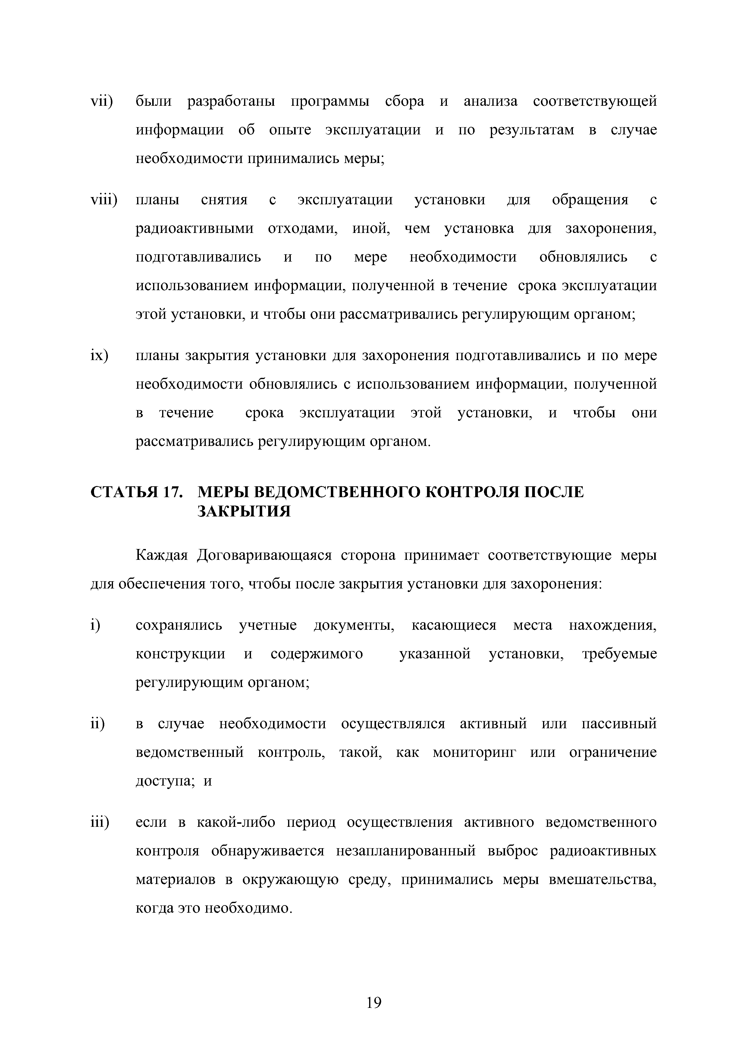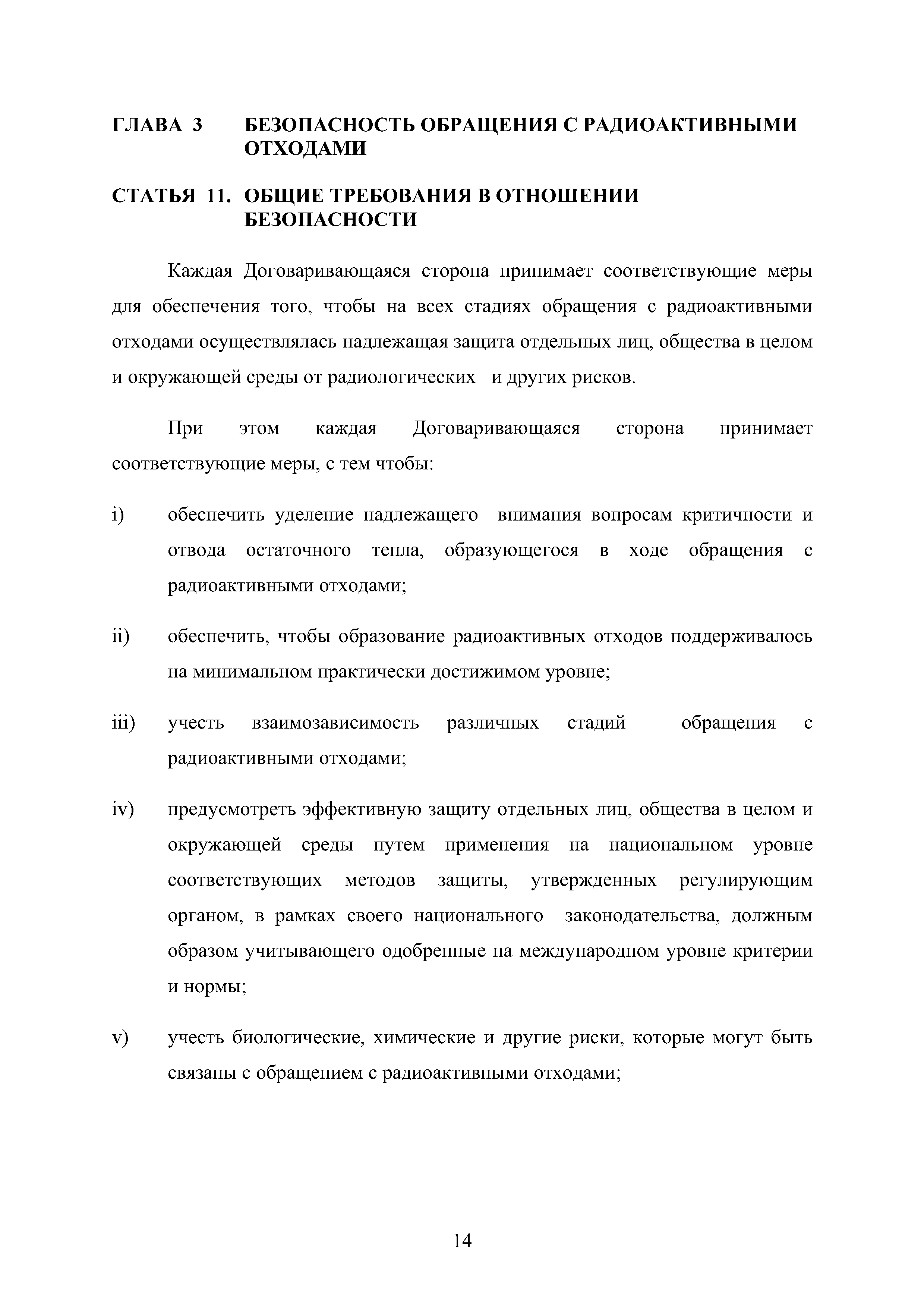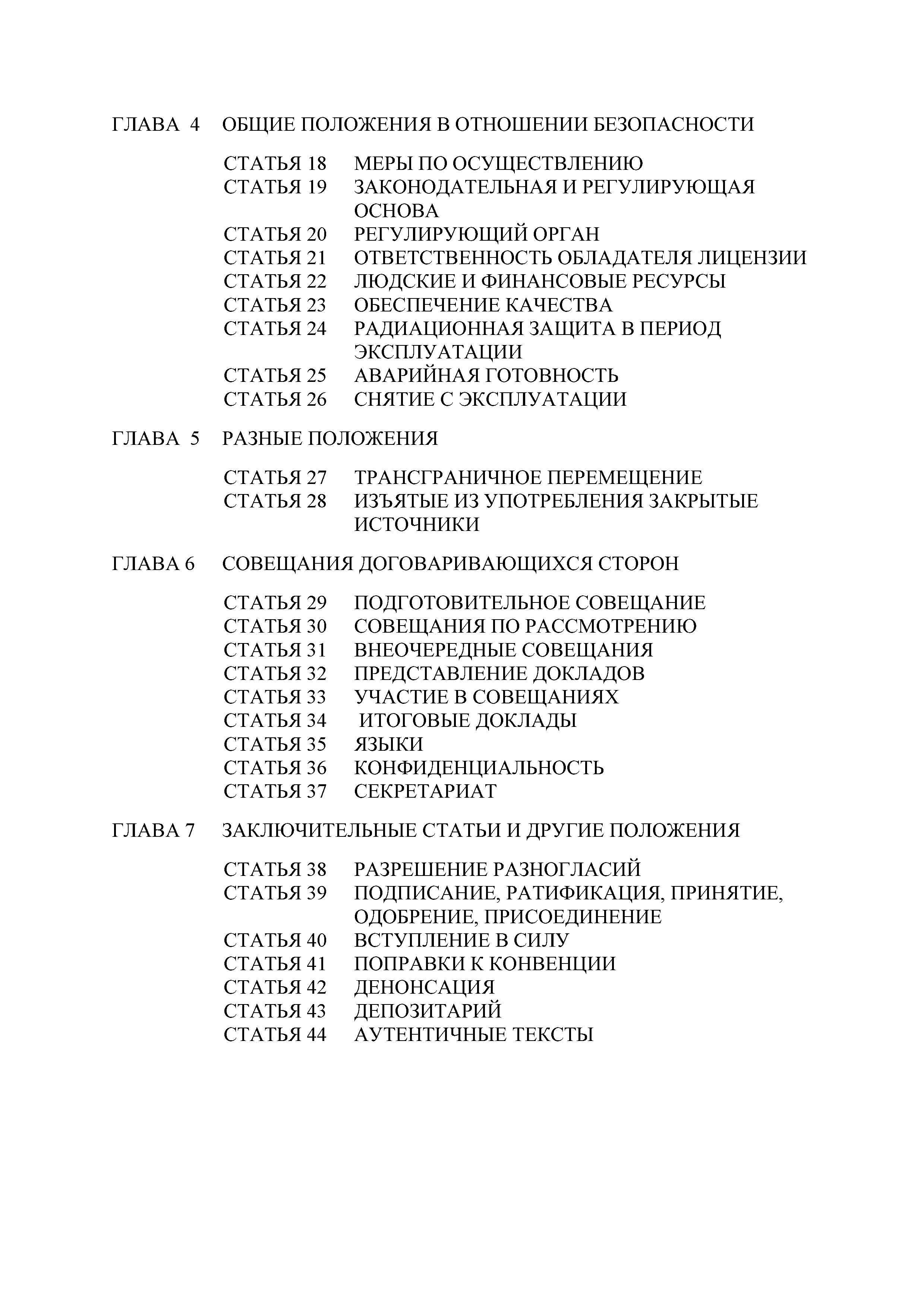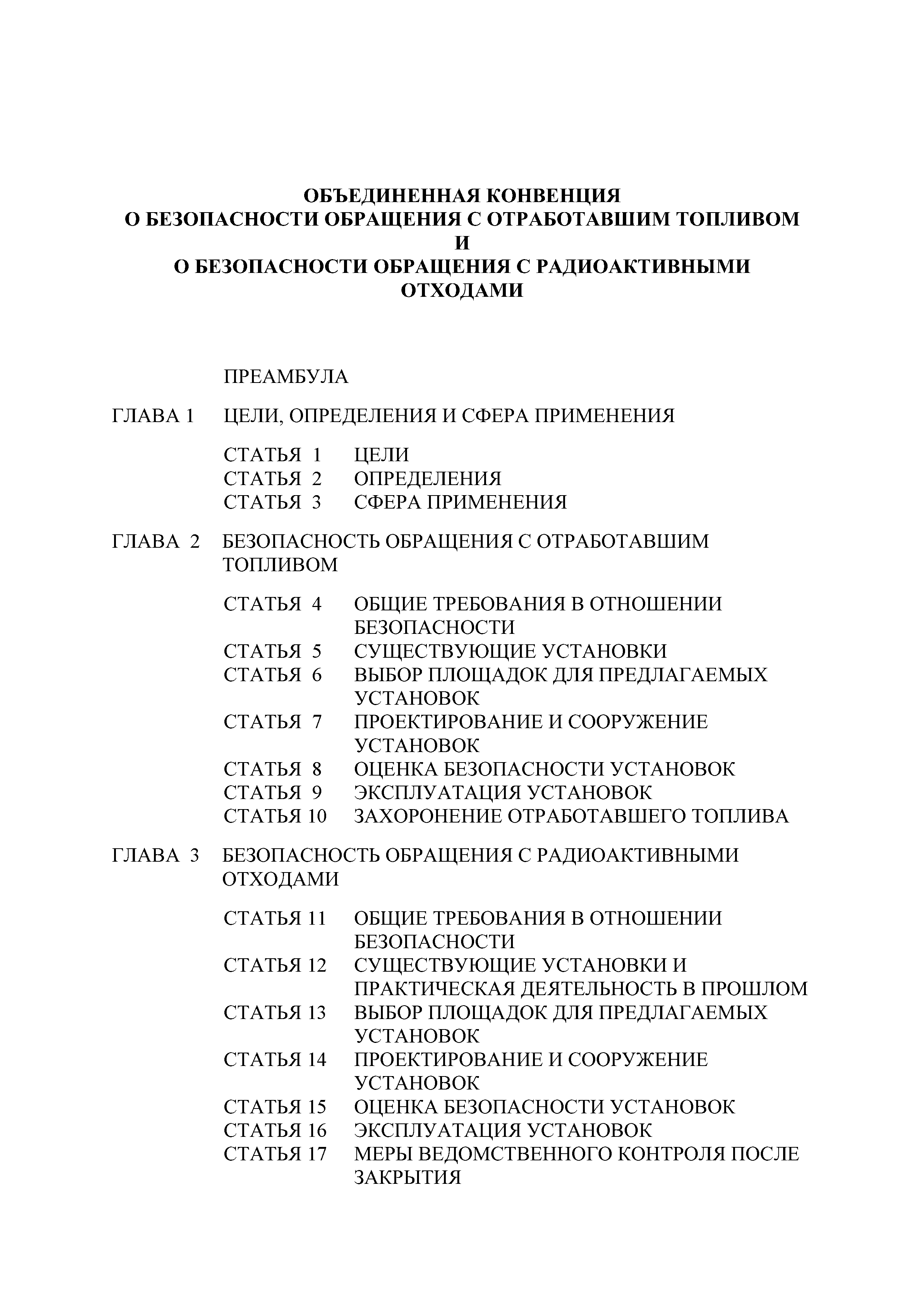 | Оглавление: | Информационный циркуляр Оглавление Преамбула Глава 1. Цели, определения и сфера применения Глава 2. Безопасность обращения с отработавшим топливом Глава 3. Безопасность обращения с радиоактивными отходами Глава 4. Общие положения в отношении безопасности Глава 5. Разные положения Глава 6. Совещания договаривающихся сторон Глава 7. Заключительные статьи и другие положения |