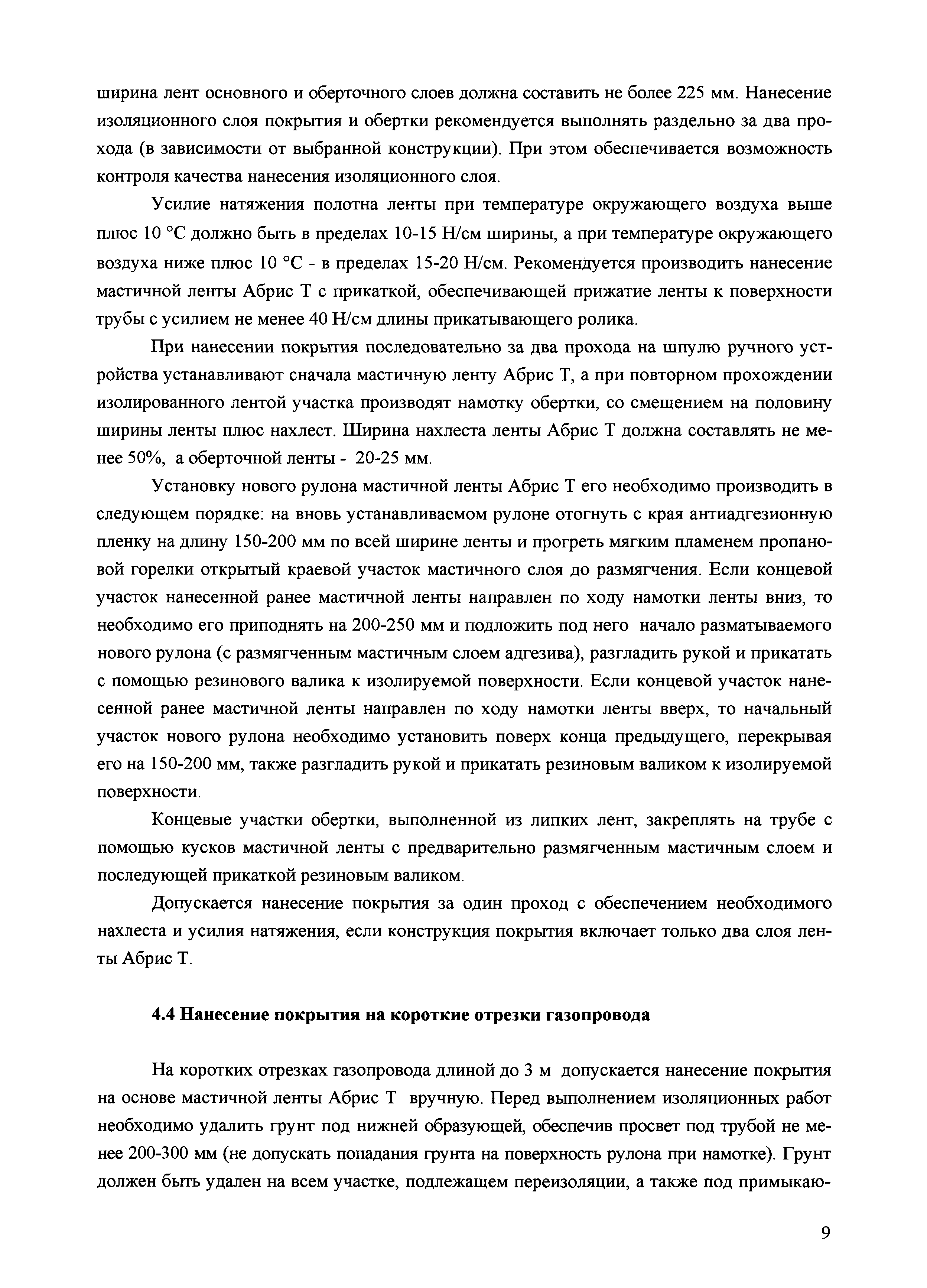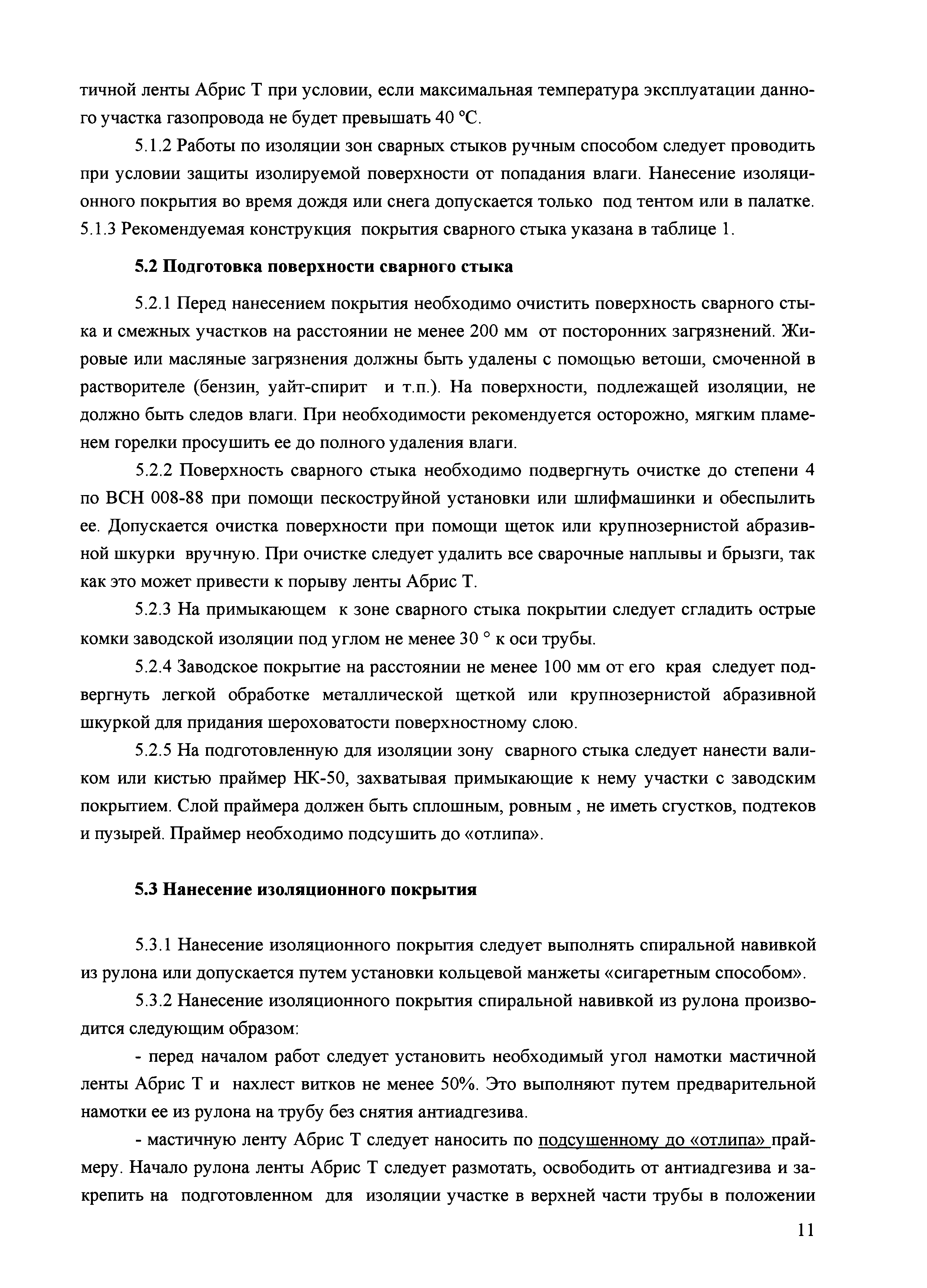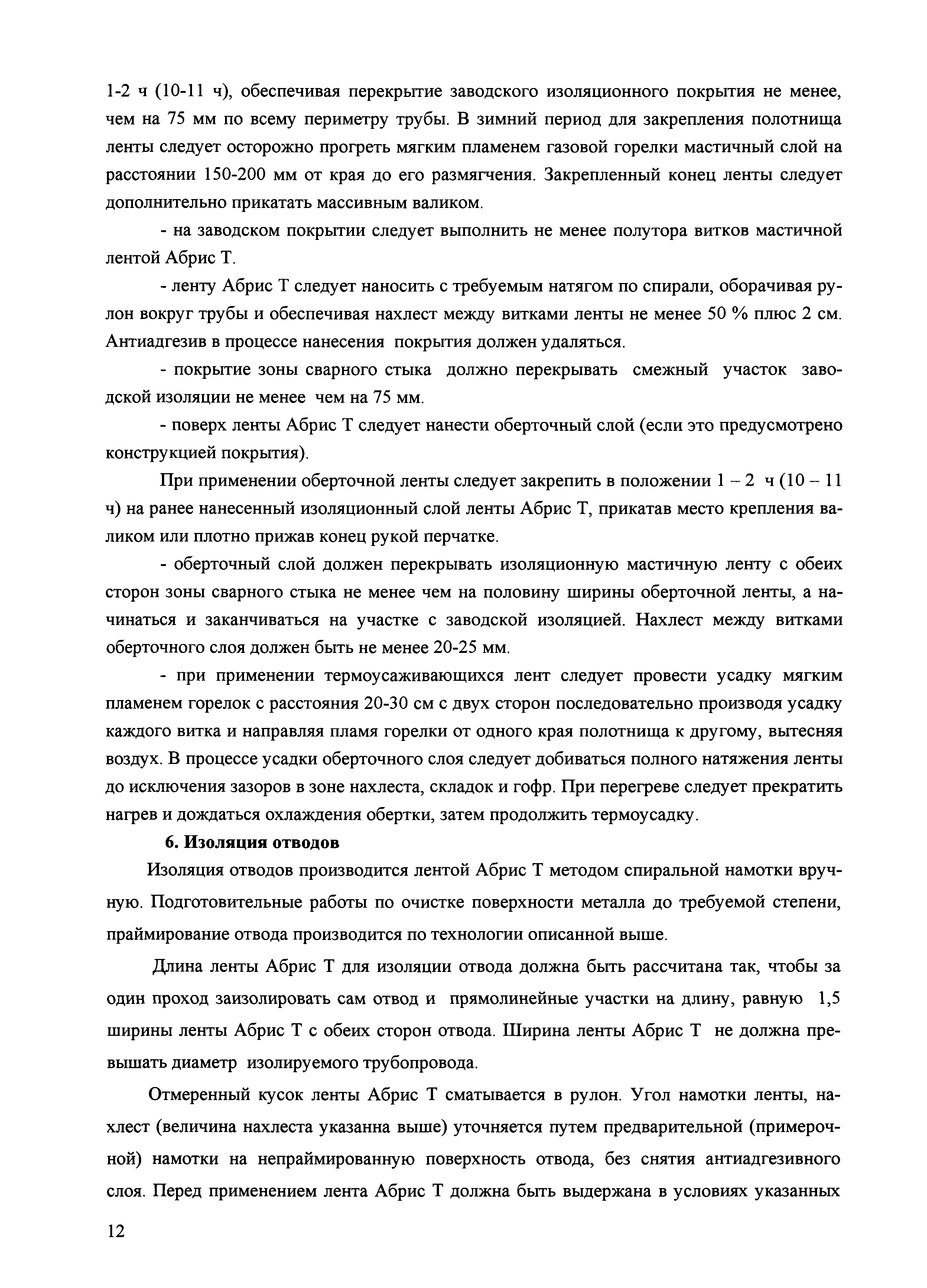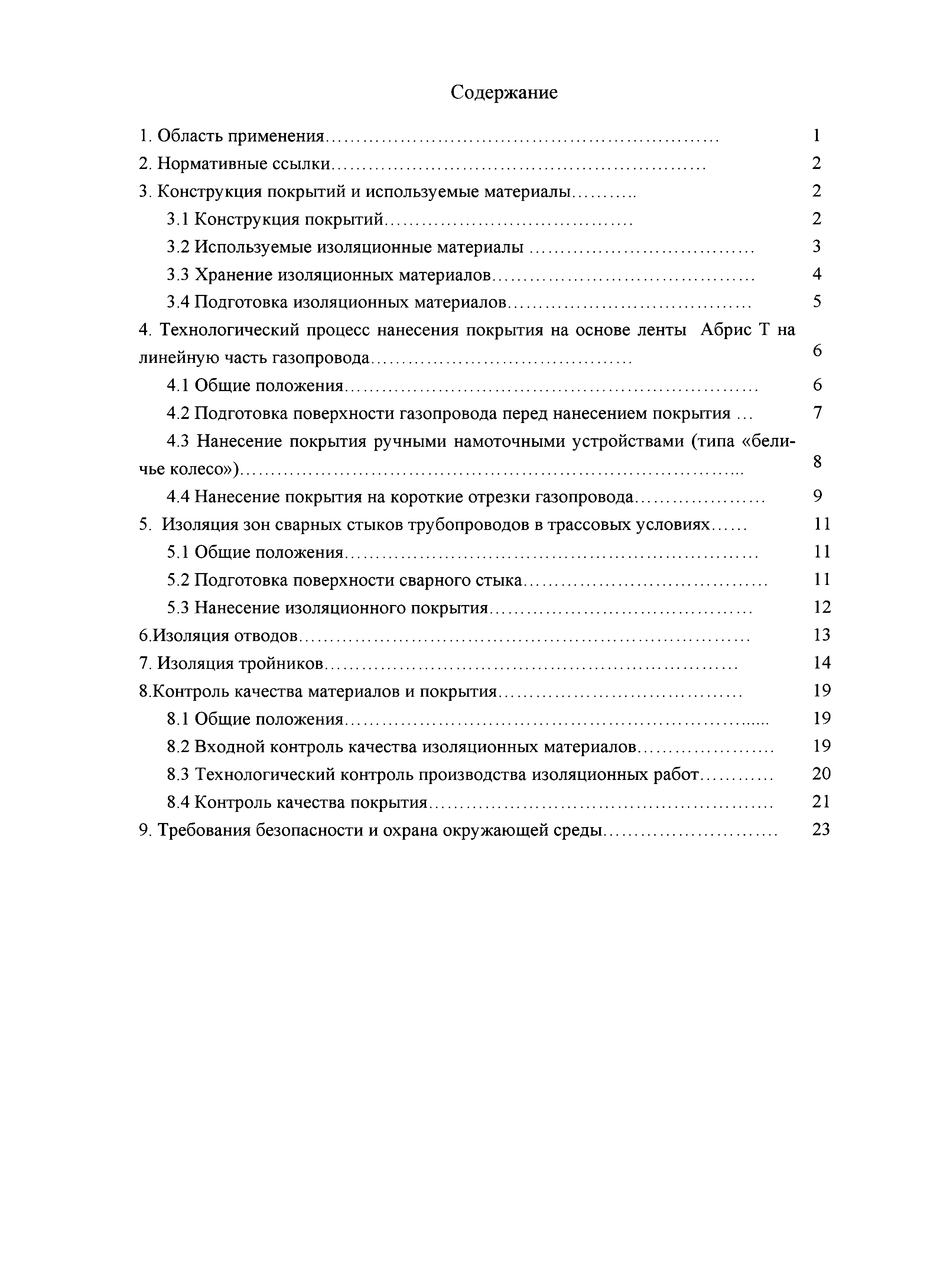 | Оглавление: | 1 Область применения 2 Нормативные ссылки 3 Конструкция покрытий и используемые материалы 3.1 Конструкция покрытий 3.2 Используемые изоляционные материалы 3.3 Хранение изоляционных материалов 3.4 Подготовка изоляционных материалов 4 Технологический процесс нанесения покрытия на основе ленты Абрис Т на линейную часть газопровода 4.1 Общие положения 4.2 Подготовка поверхности газопровода перед нанесением покрытия 4.3 Нанесение покрытия ручными намоточными устройствами (типа "беличье колесо") 4.4 Нанесение покрытия на короткие отрезки газопровода 5 Изоляция зон сварных стыков трубопроводов в трассовых условиях 5.1 Общие положения 5.2 Подготовка поверхности сварного стыка 5.3 Нанесение изоляционного покрытия 6 Изоляция отводов 7 Изоляция тройников 8 Контроль качества материалов и покрытия 8.1 Общие положения 8.2 Входной контроль качества изоляционных материалов 8.3 Технологический контроль производства изоляционных работ 8.4 Контроль качества покрытия 9 Требования безопасности и охрана окружающей среды |