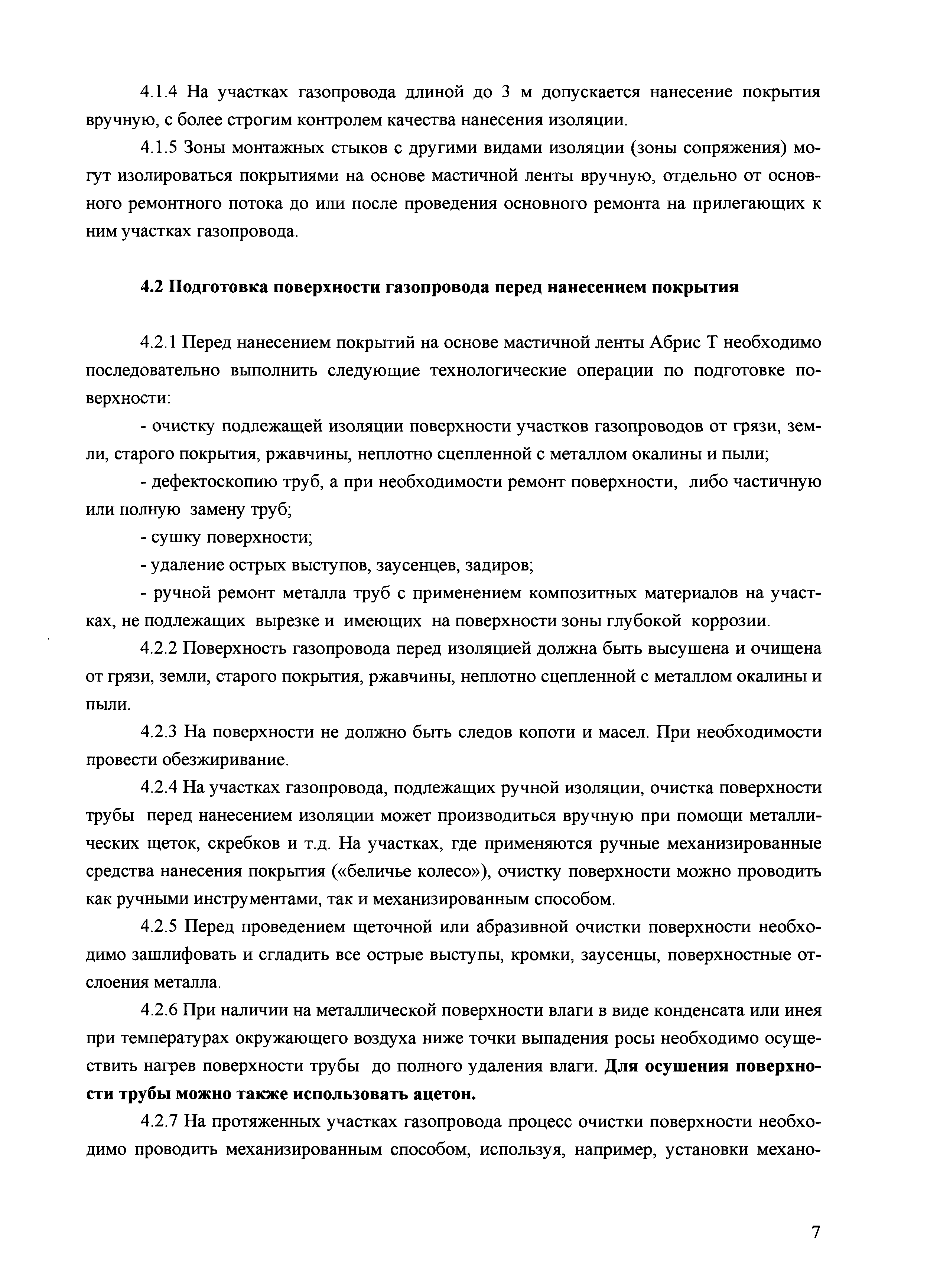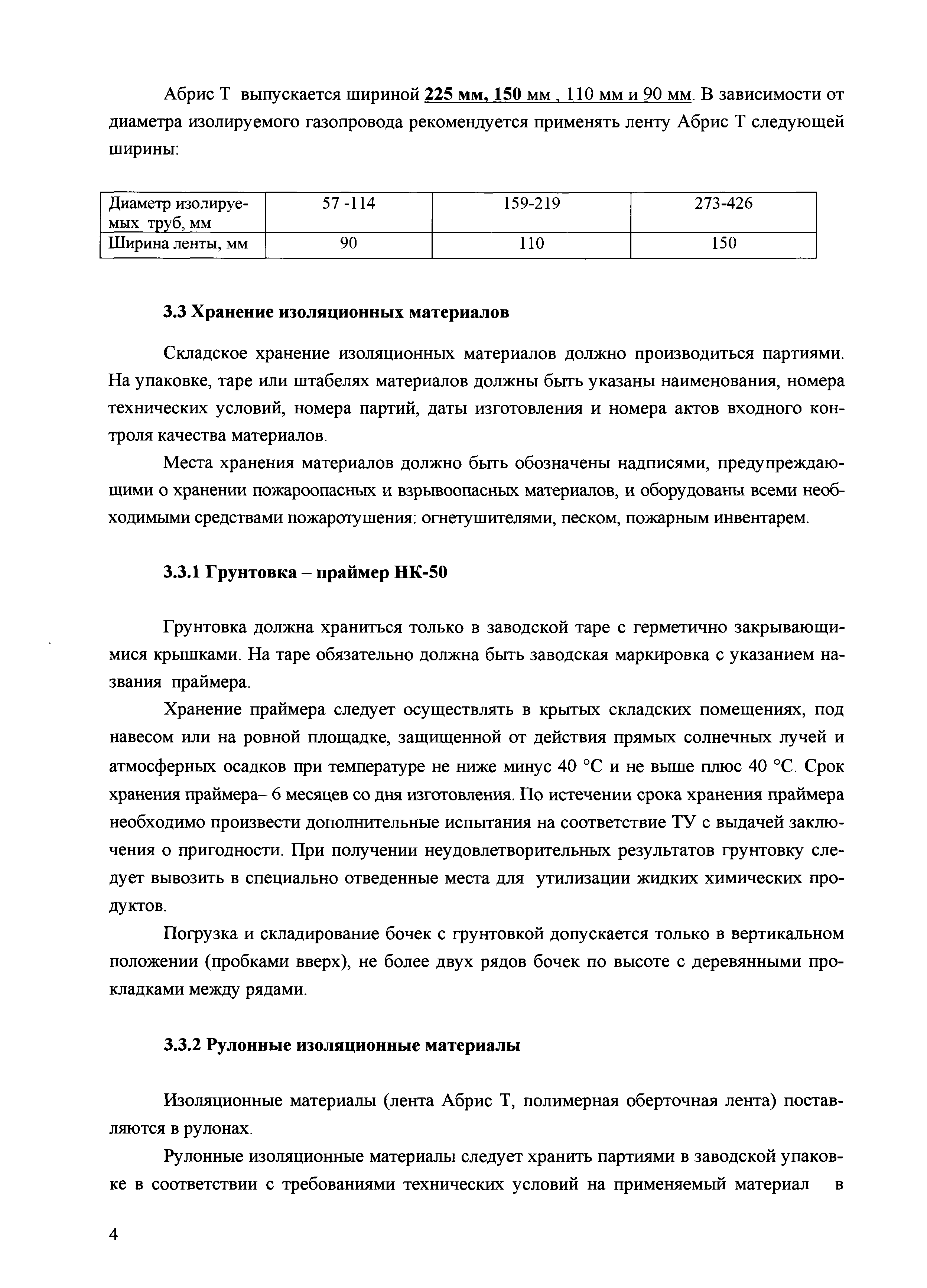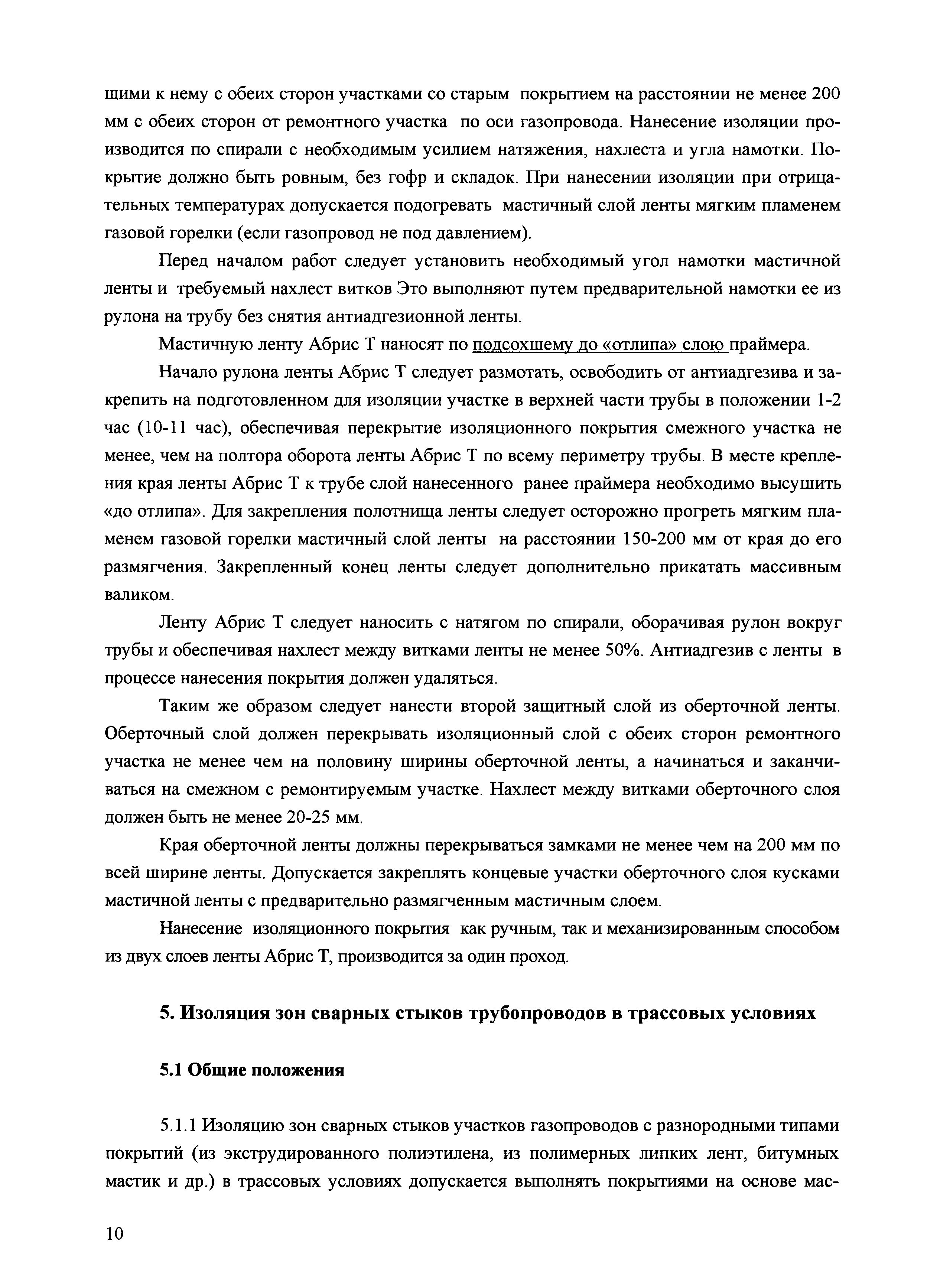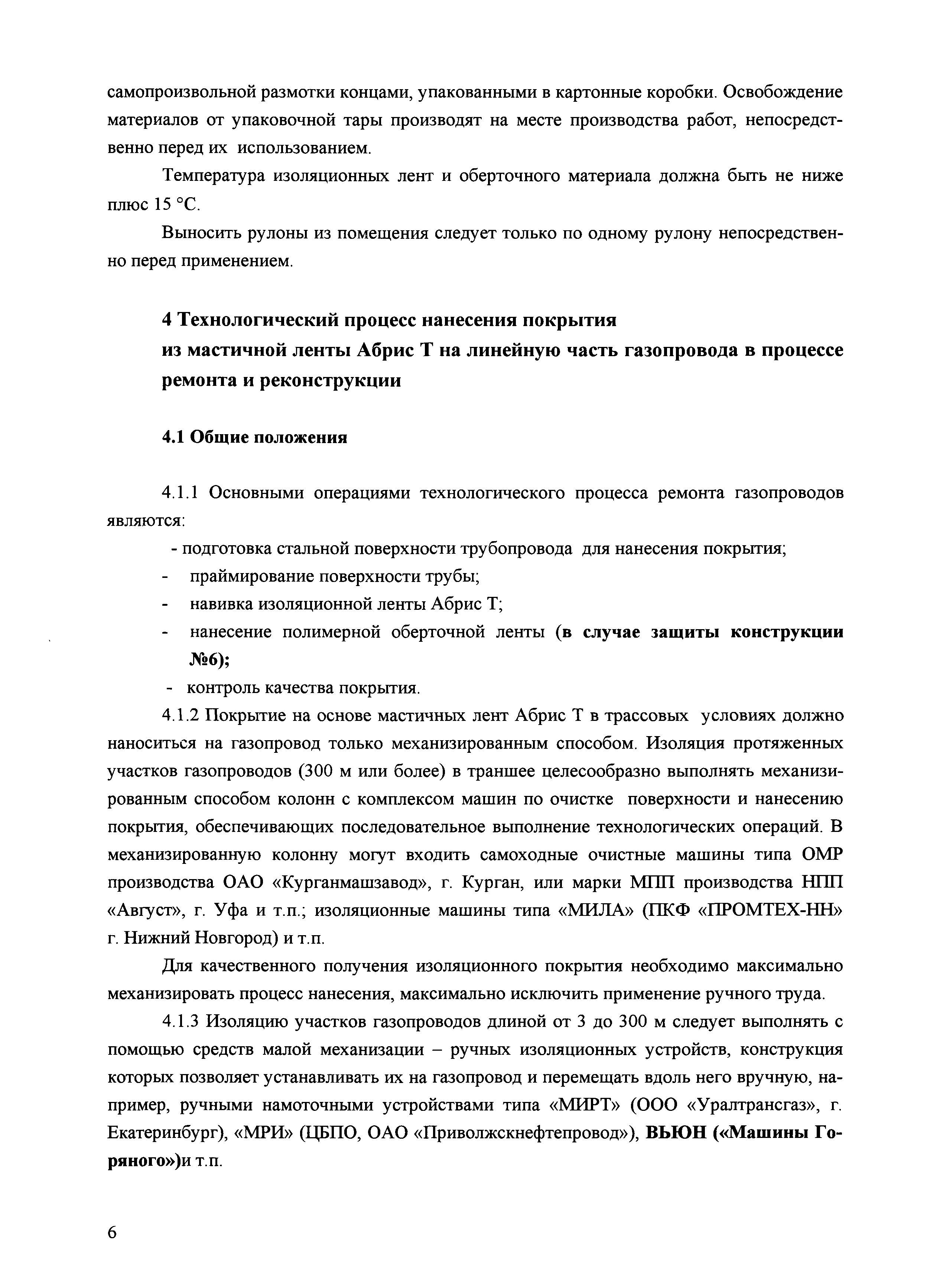 | Оглавление: | 1 Область применения 2 Нормативные ссылки 3 Конструкция покрытий и используемые материалы 3.1 Конструкция покрытий 3.2 Используемые изоляционные материалы 3.3 Хранение изоляционных материалов 3.4 Подготовка изоляционных материалов 4 Технологический процесс нанесения покрытия на основе ленты Абрис Т на линейную часть газопровода 4.1 Общие положения 4.2 Подготовка поверхности газопровода перед нанесением покрытия 4.3 Нанесение покрытия ручными намоточными устройствами (типа "беличье колесо") 4.4 Нанесение покрытия на короткие отрезки газопровода 5 Изоляция зон сварных стыков трубопроводов в трассовых условиях 5.1 Общие положения 5.2 Подготовка поверхности сварного стыка 5.3 Нанесение изоляционного покрытия 6 Изоляция отводов 7 Изоляция тройников 8 Контроль качества материалов и покрытия 8.1 Общие положения 8.2 Входной контроль качества изоляционных материалов 8.3 Технологический контроль производства изоляционных работ 8.4 Контроль качества покрытия 9 Требования безопасности и охрана окружающей среды |