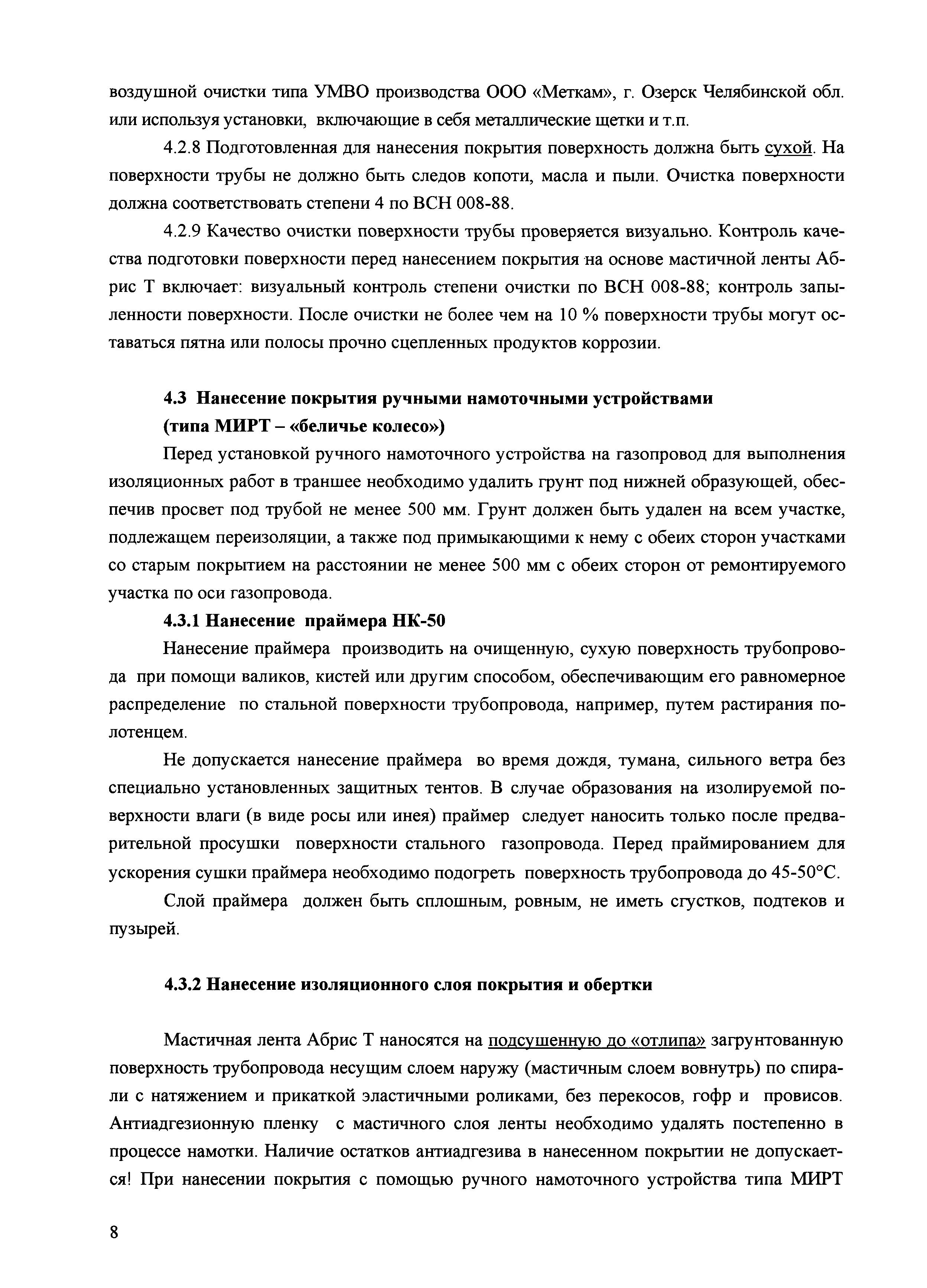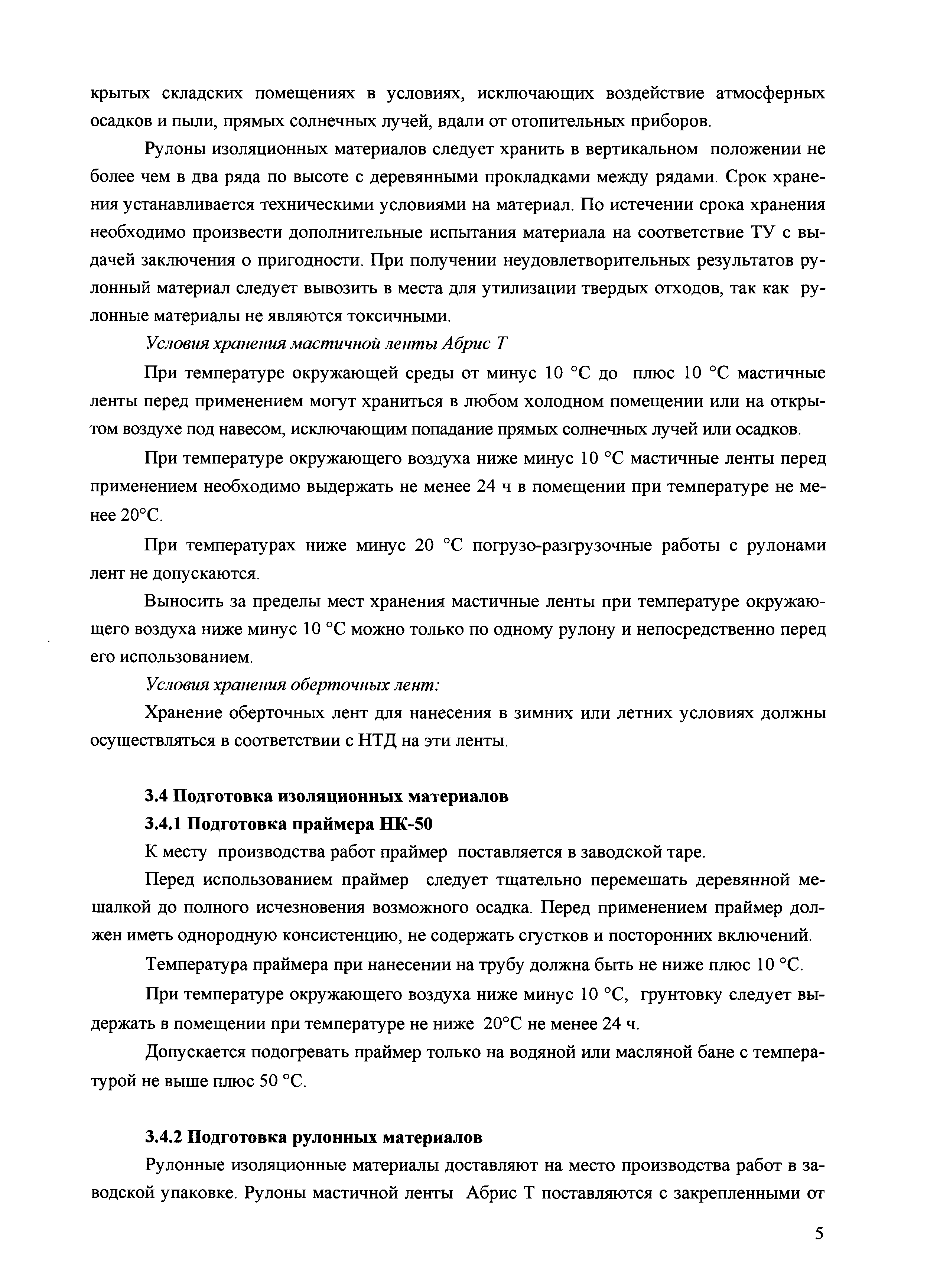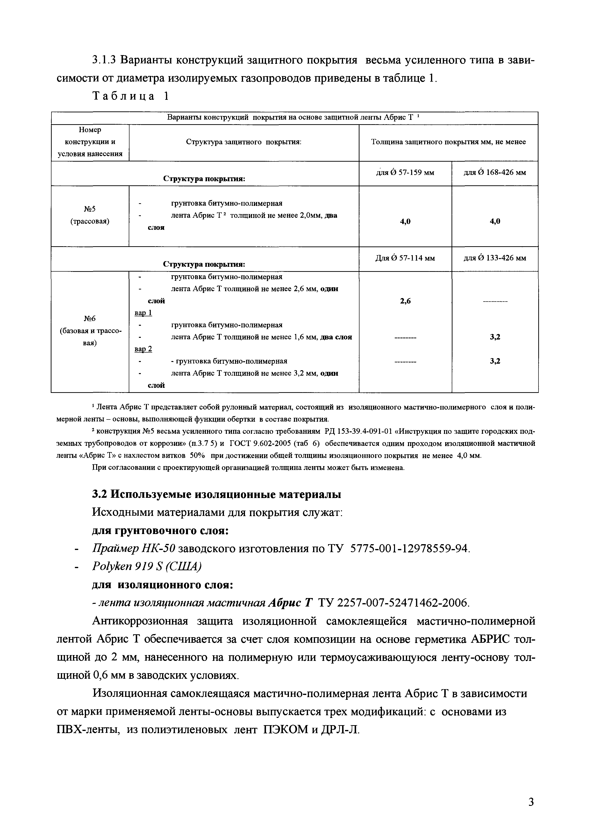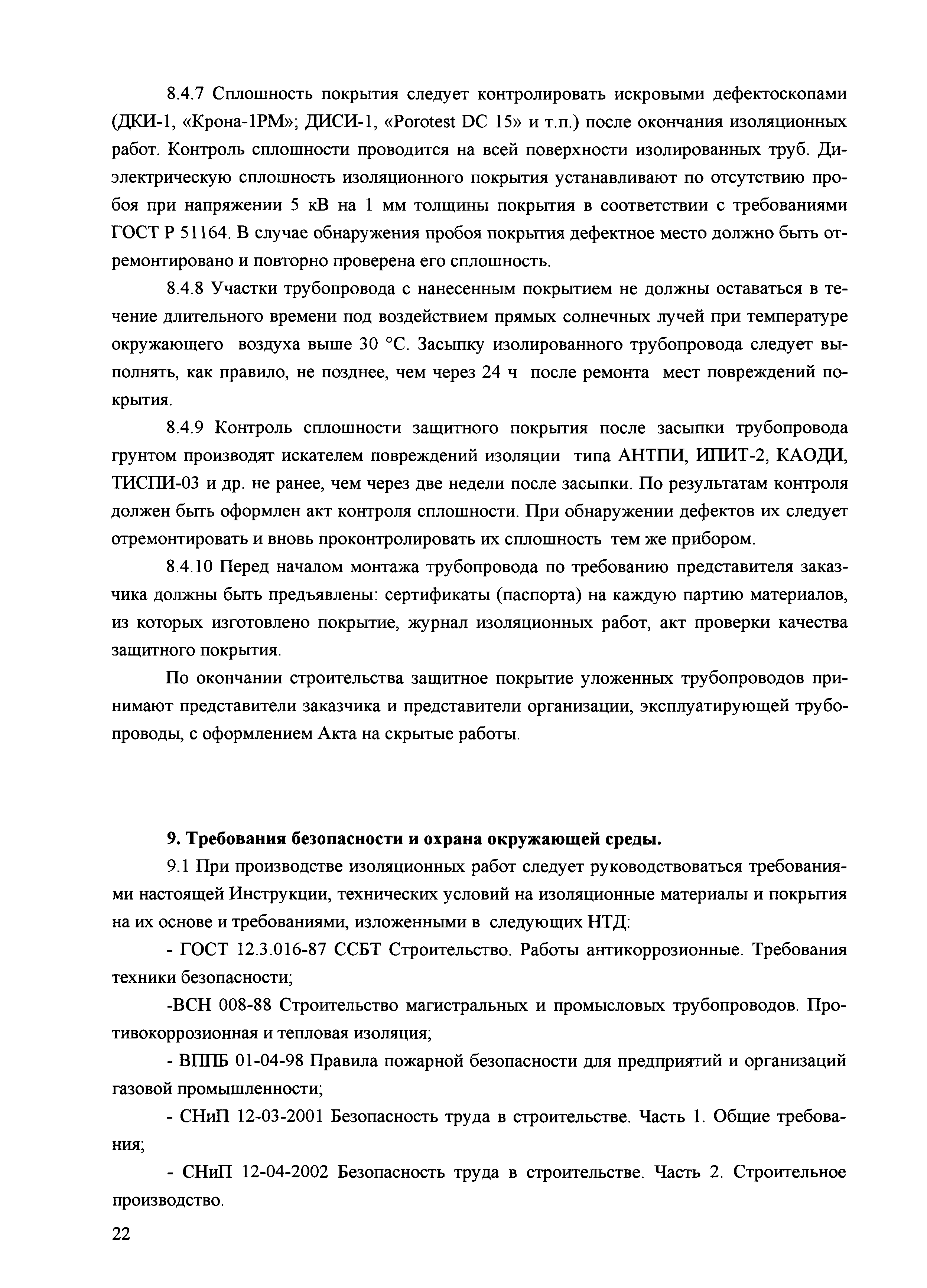 | Оглавление: | 1 Область применения 2 Нормативные ссылки 3 Конструкция покрытий и используемые материалы 3.1 Конструкция покрытий 3.2 Используемые изоляционные материалы 3.3 Хранение изоляционных материалов 3.4 Подготовка изоляционных материалов 4 Технологический процесс нанесения покрытия на основе ленты Абрис Т на линейную часть газопровода 4.1 Общие положения 4.2 Подготовка поверхности газопровода перед нанесением покрытия 4.3 Нанесение покрытия ручными намоточными устройствами (типа "беличье колесо") 4.4 Нанесение покрытия на короткие отрезки газопровода 5 Изоляция зон сварных стыков трубопроводов в трассовых условиях 5.1 Общие положения 5.2 Подготовка поверхности сварного стыка 5.3 Нанесение изоляционного покрытия 6 Изоляция отводов 7 Изоляция тройников 8 Контроль качества материалов и покрытия 8.1 Общие положения 8.2 Входной контроль качества изоляционных материалов 8.3 Технологический контроль производства изоляционных работ 8.4 Контроль качества покрытия 9 Требования безопасности и охрана окружающей среды |
