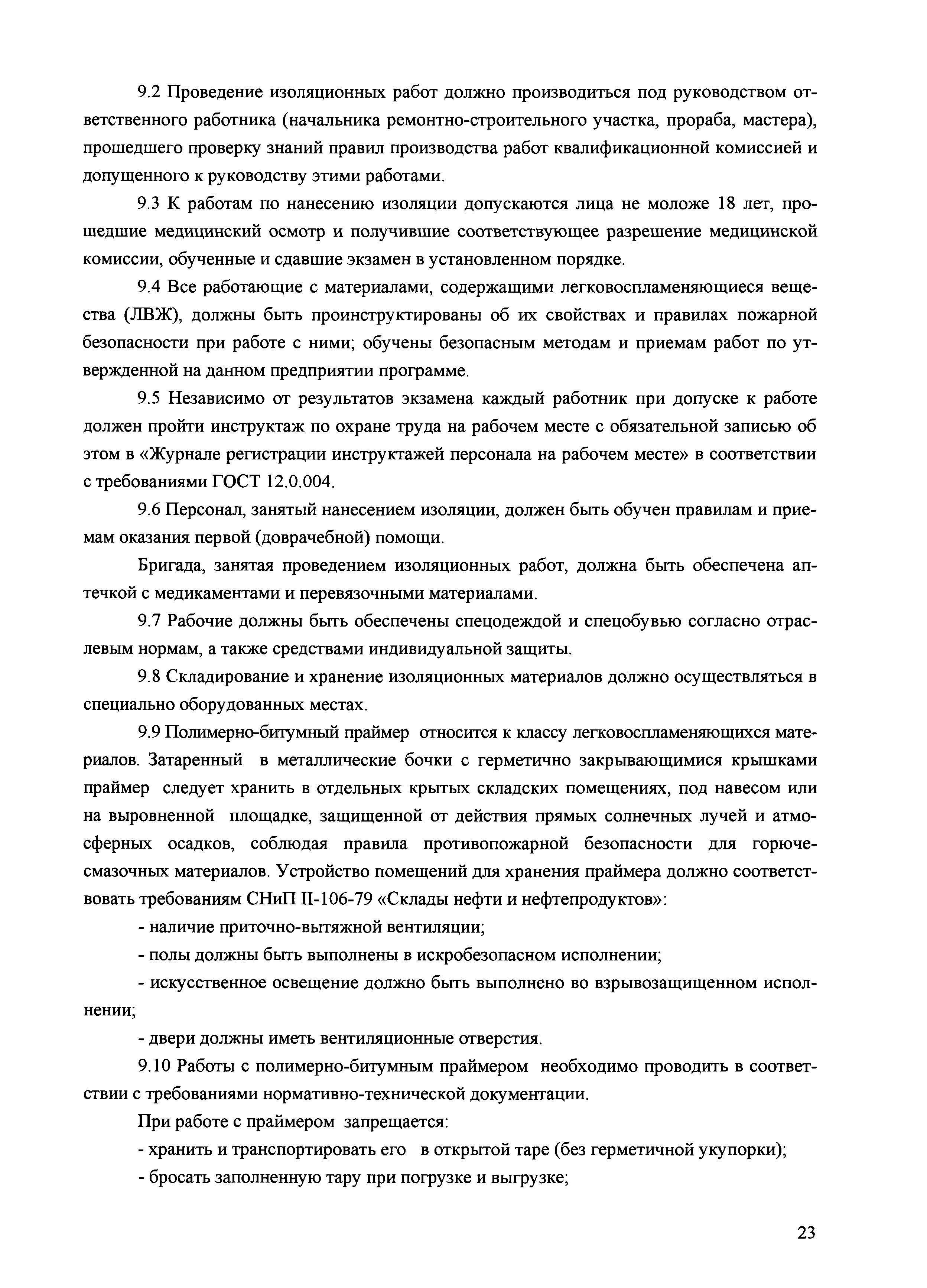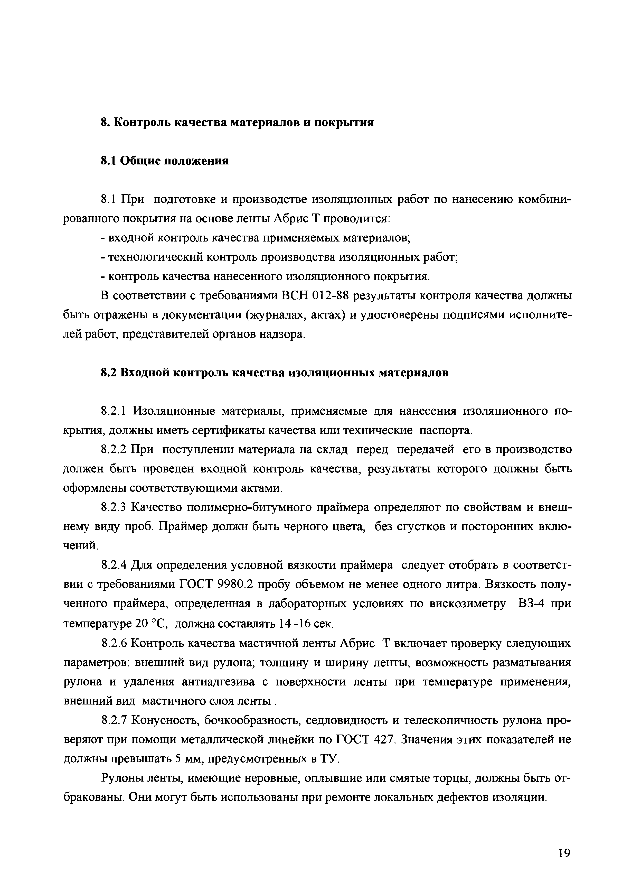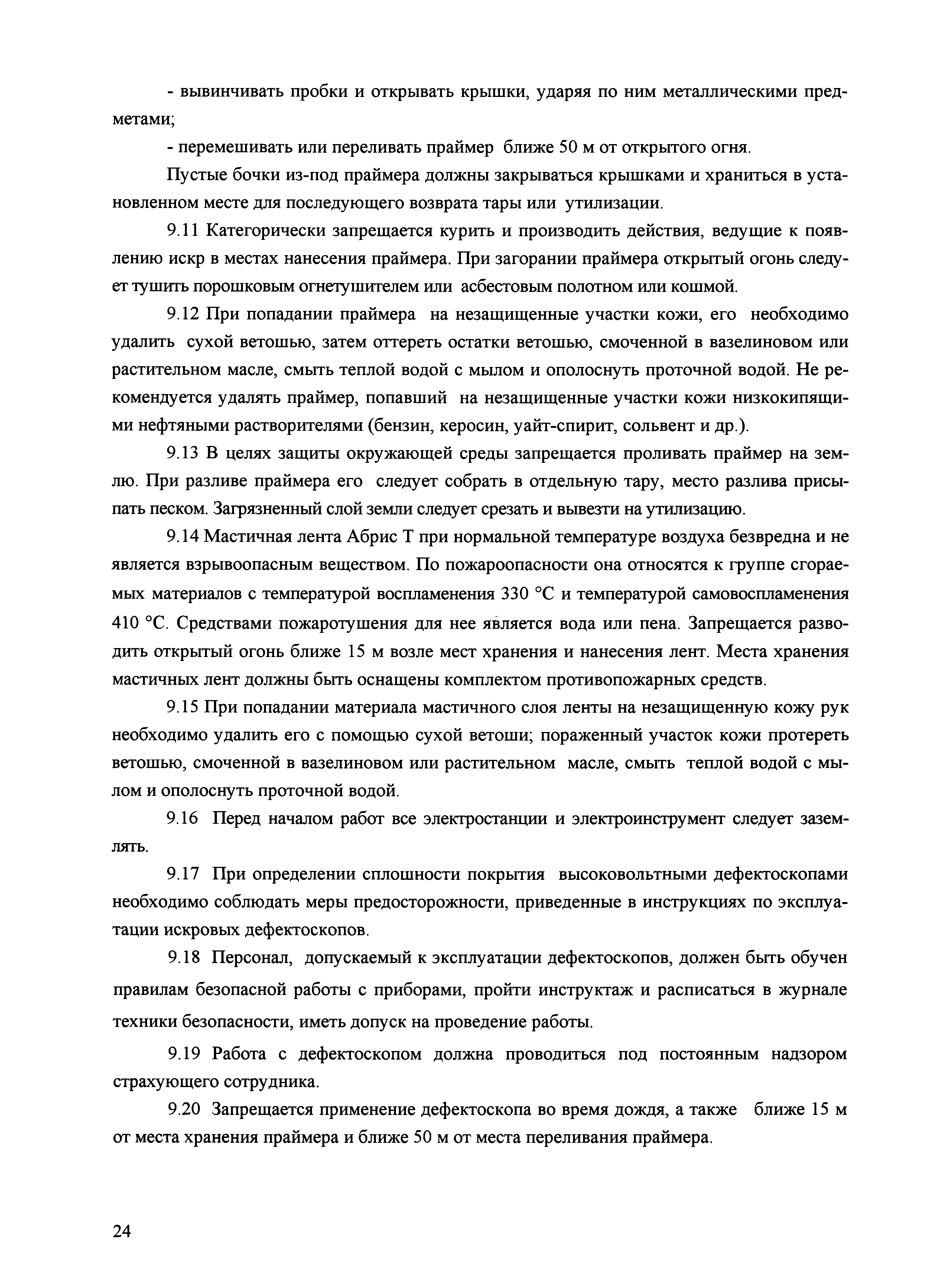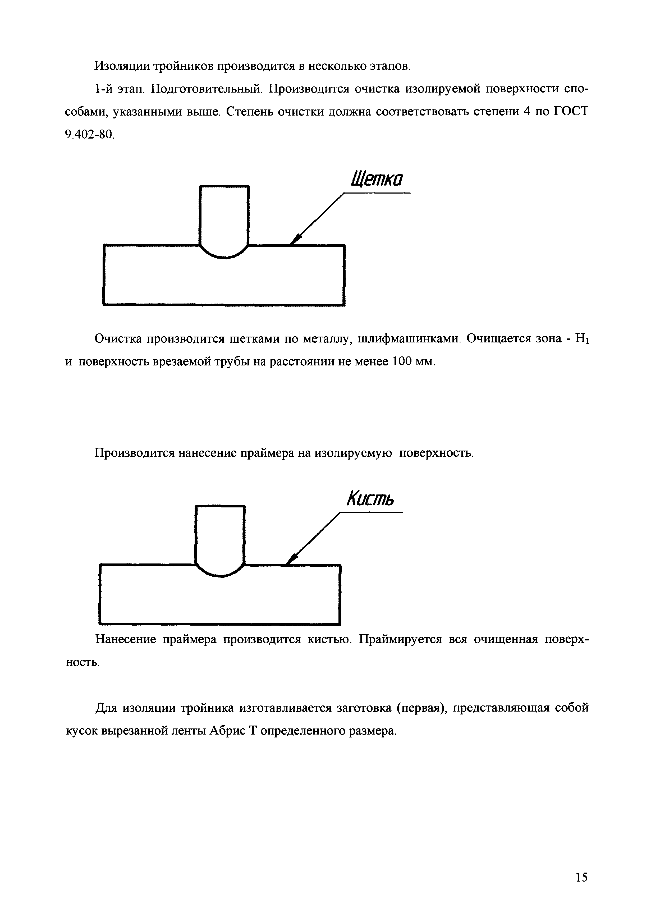 | Оглавление: | 1 Область применения 2 Нормативные ссылки 3 Конструкция покрытий и используемые материалы 3.1 Конструкция покрытий 3.2 Используемые изоляционные материалы 3.3 Хранение изоляционных материалов 3.4 Подготовка изоляционных материалов 4 Технологический процесс нанесения покрытия на основе ленты Абрис Т на линейную часть газопровода 4.1 Общие положения 4.2 Подготовка поверхности газопровода перед нанесением покрытия 4.3 Нанесение покрытия ручными намоточными устройствами (типа "беличье колесо") 4.4 Нанесение покрытия на короткие отрезки газопровода 5 Изоляция зон сварных стыков трубопроводов в трассовых условиях 5.1 Общие положения 5.2 Подготовка поверхности сварного стыка 5.3 Нанесение изоляционного покрытия 6 Изоляция отводов 7 Изоляция тройников 8 Контроль качества материалов и покрытия 8.1 Общие положения 8.2 Входной контроль качества изоляционных материалов 8.3 Технологический контроль производства изоляционных работ 8.4 Контроль качества покрытия 9 Требования безопасности и охрана окружающей среды |
