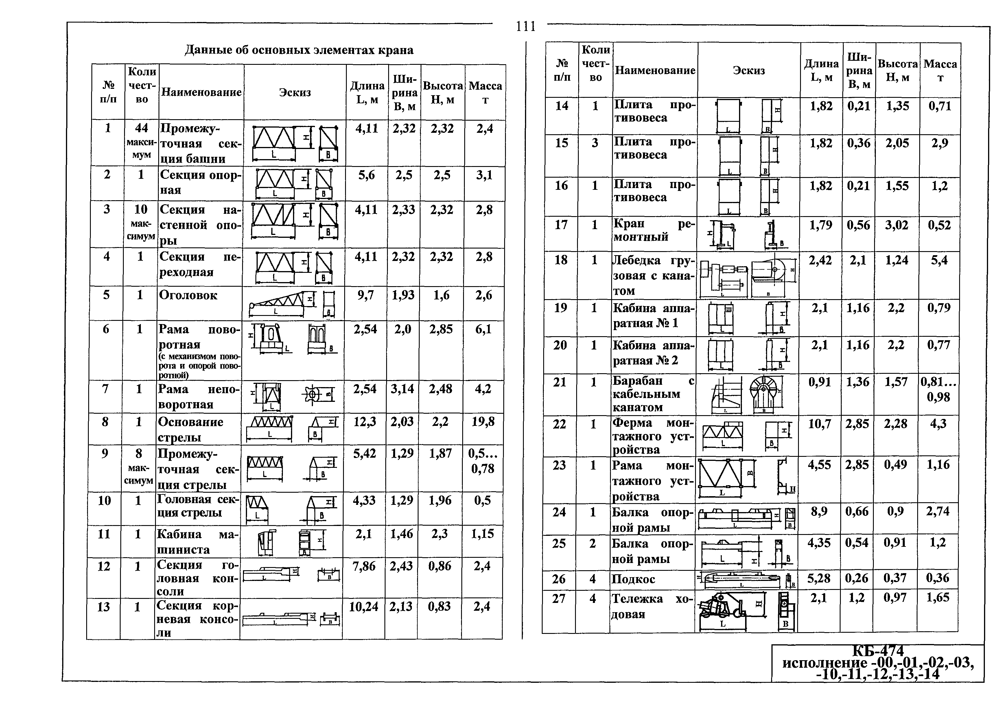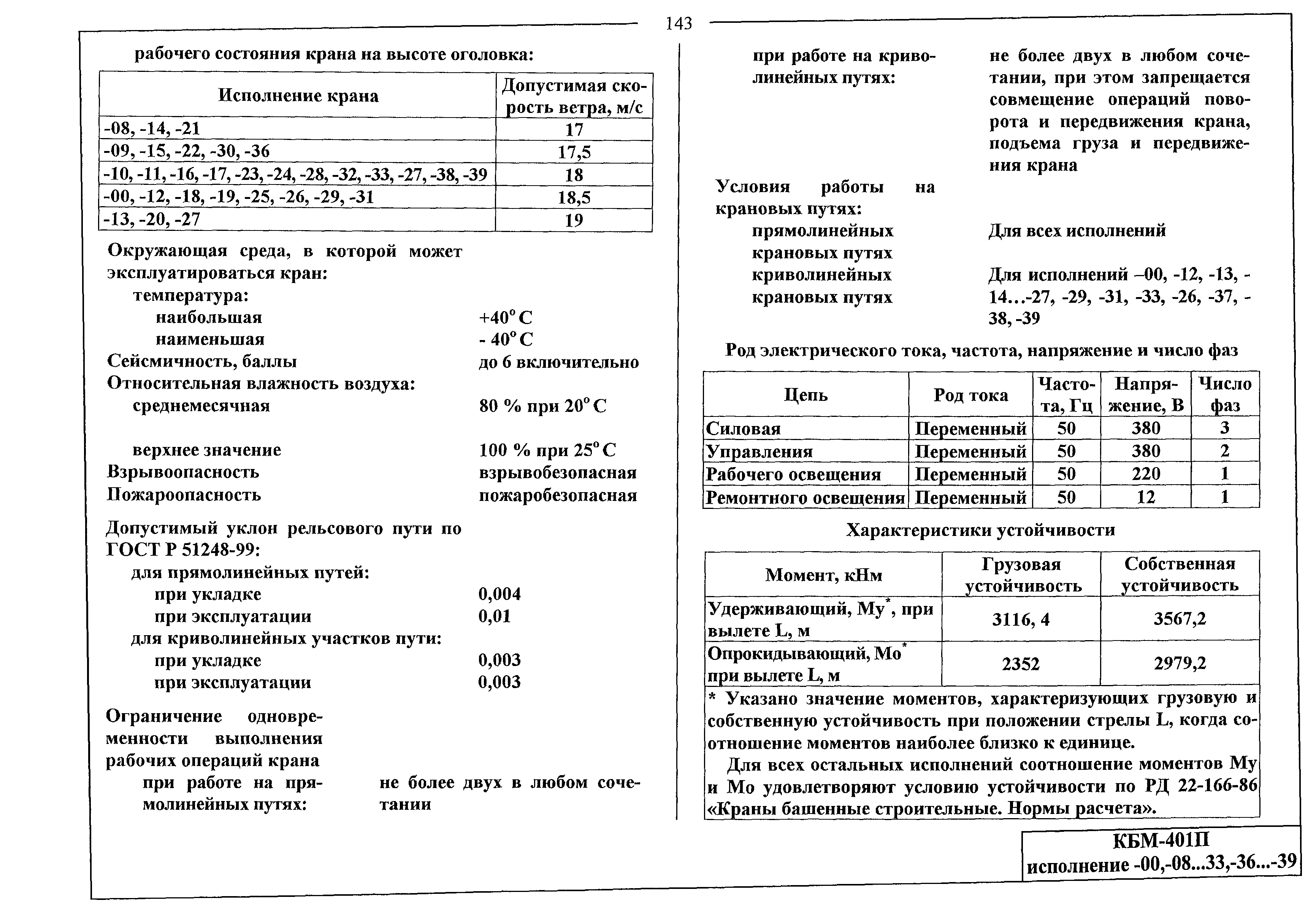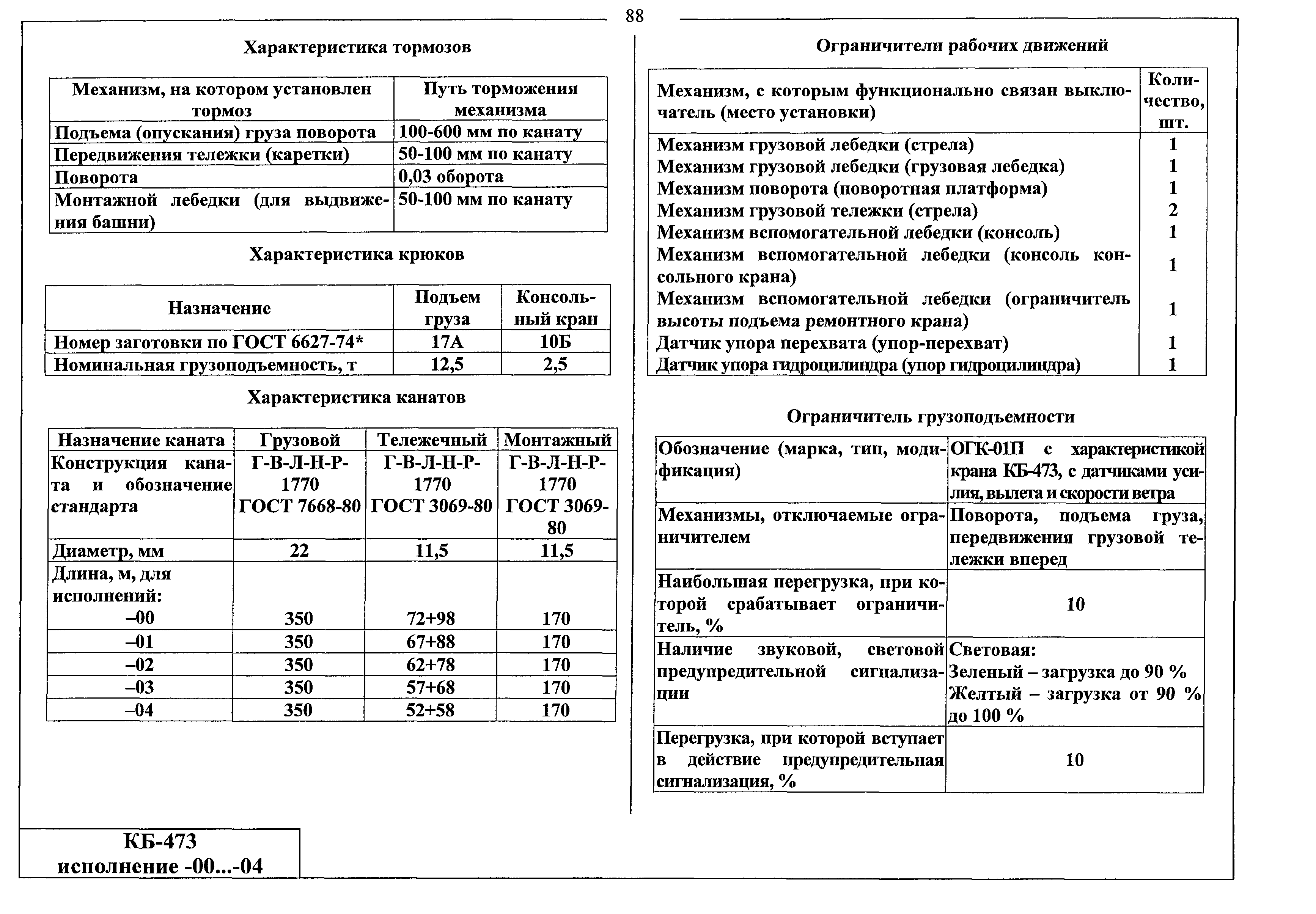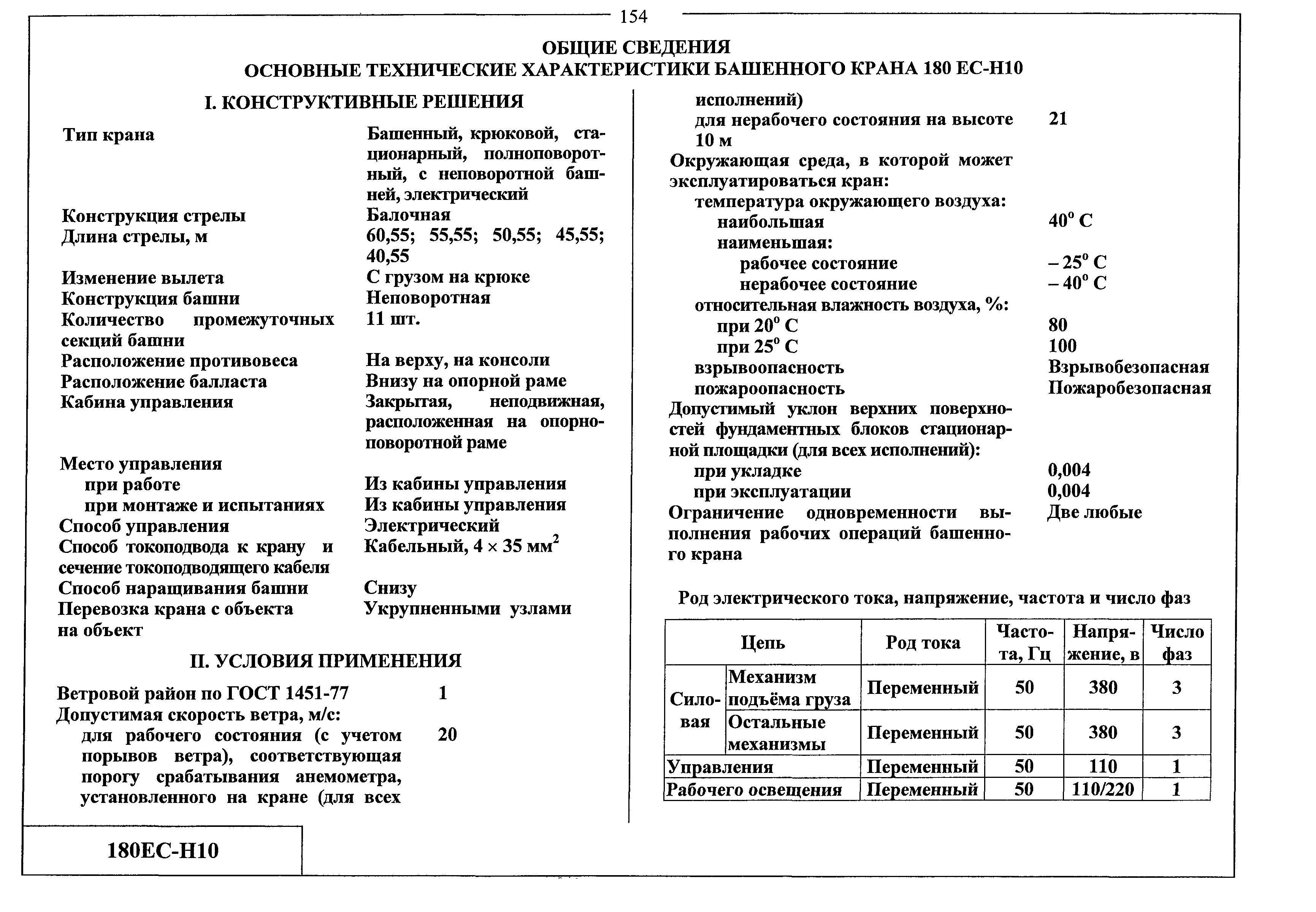 | Оглавление: | Общая часть Техническая характеристика башенных кранов Общие сведения. Основные техзнические характеристики башенных кранов 1. РБК-2.20 2. РБК-3.40 3. 34К 4. 32ТТ 5. РБК-5.60 6. 56К 7. 80LC 8. КБ-311 9. КБ-473 (исполнение -00 … -04) 10. КБ-473 (исполнение -05 … -09) 11. КБ-474 (исполнение -00; -01; -02; -03; -10; -11; -12; -13; -14) 12. КБ-405.1А; КБ-405.1А-01; КБ-405.1А-02; КБ-405.2А 13. КБ-415 УХЛ 14. КБ-408.21 15. КБ-411.06 16. КБМ-401П (исполнение -00; -08; … -33; -36 … -39) 17. 180ЕС-Н10 18. КБ-504А.08 и КБ-504А.08-02 Приложение - "О системе ограничения зоны работы башенного крана в стесненных условиях" "СОЗР" |