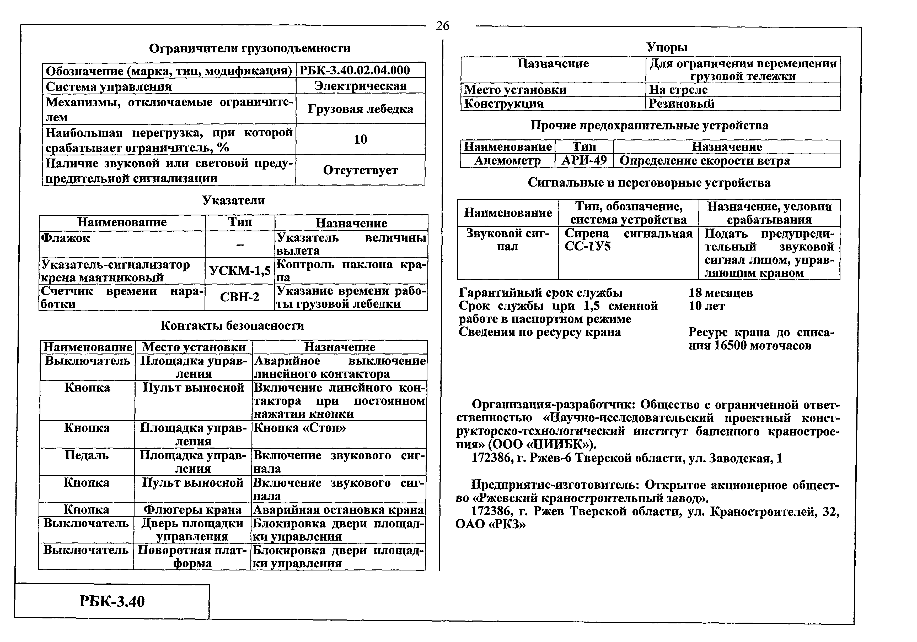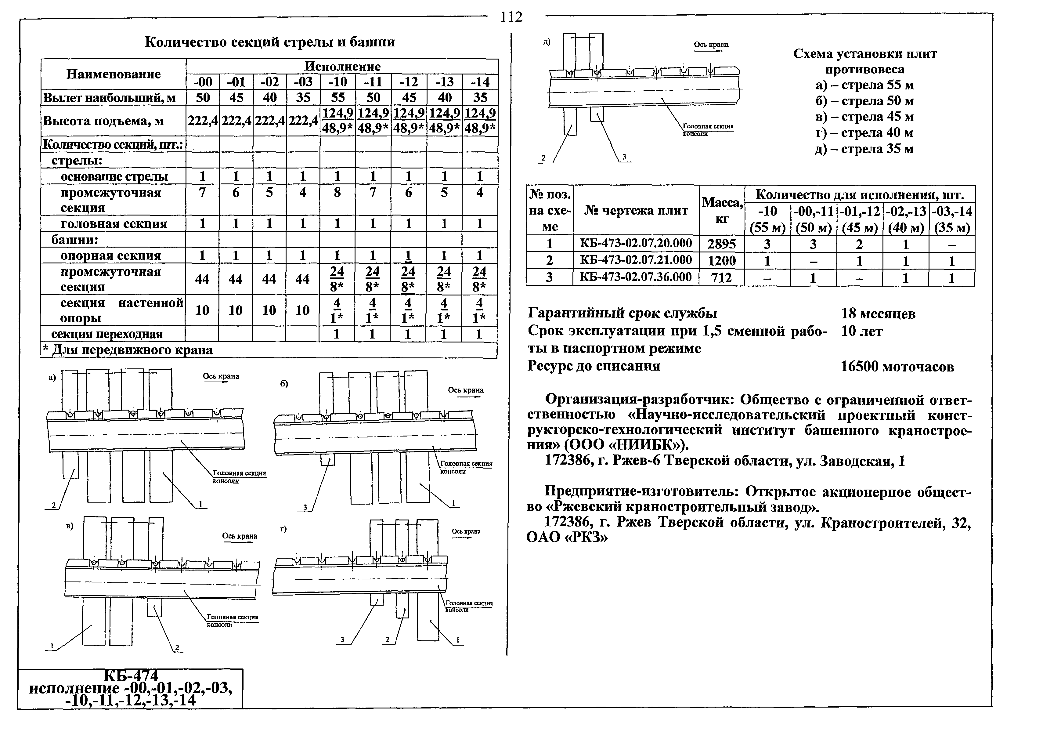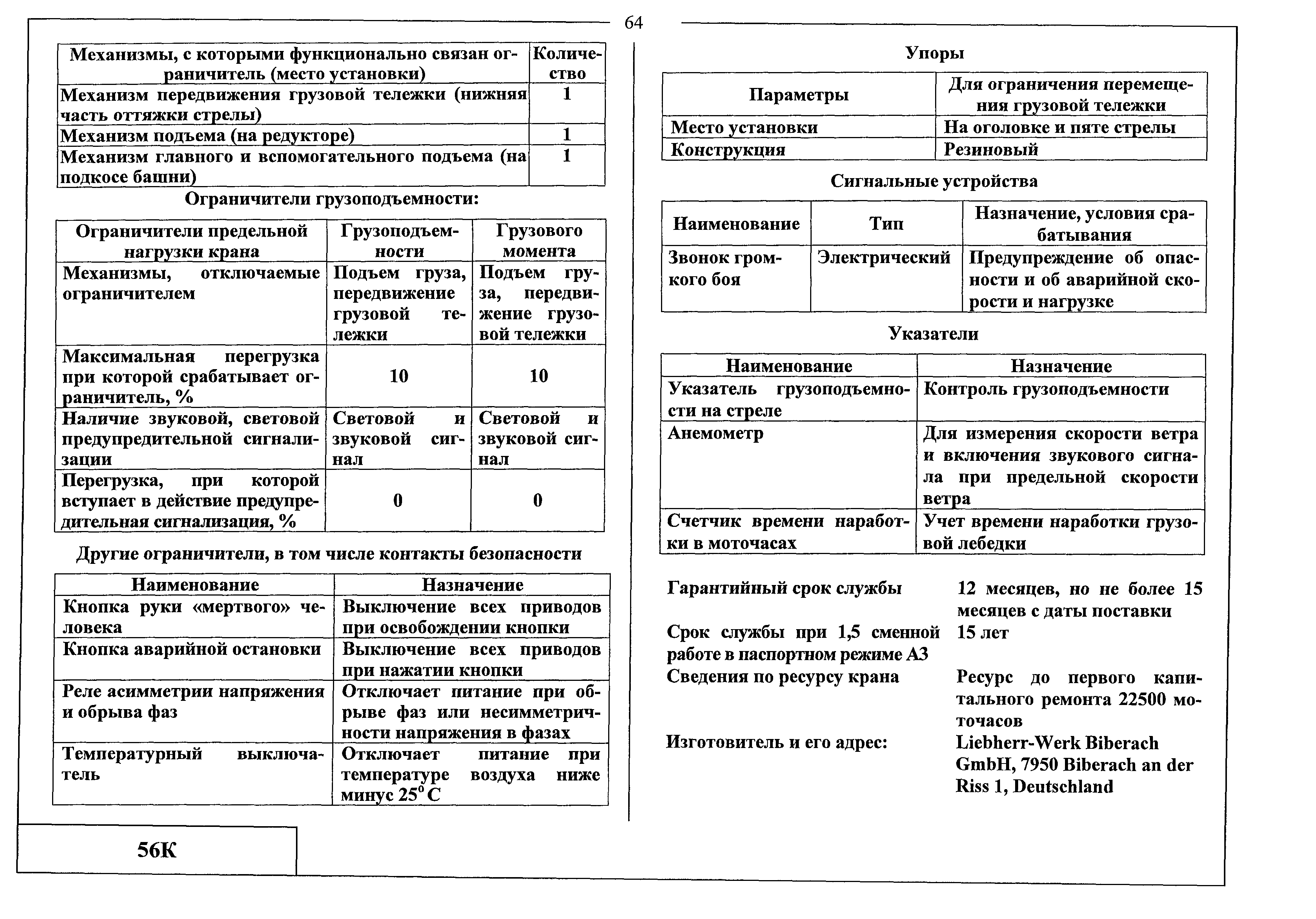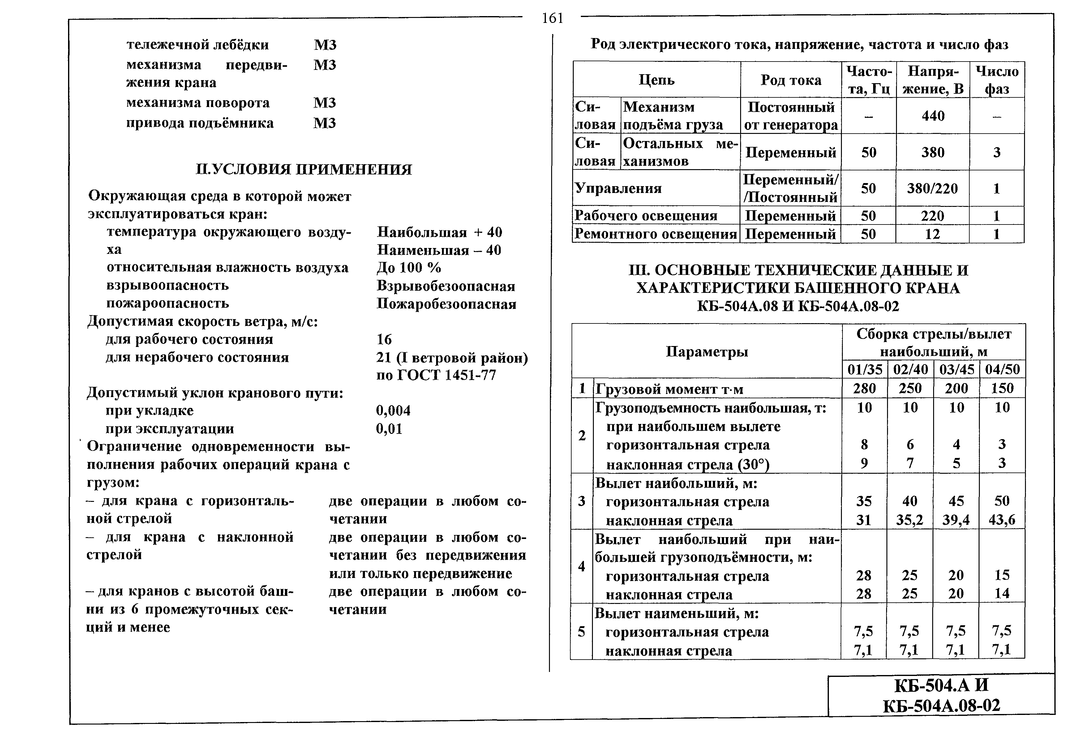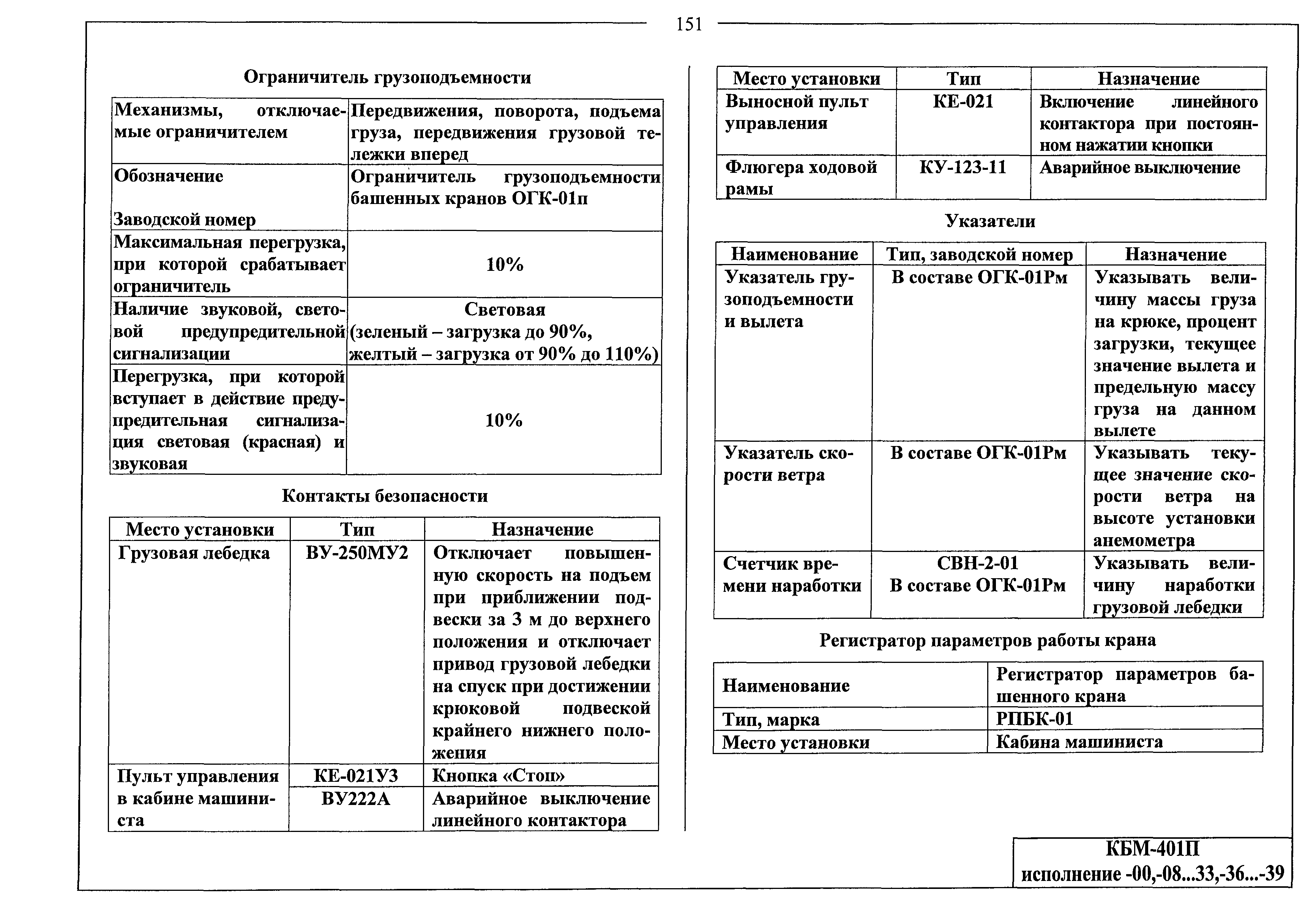 | Оглавление: | Общая часть Техническая характеристика башенных кранов Общие сведения. Основные техзнические характеристики башенных кранов 1. РБК-2.20 2. РБК-3.40 3. 34К 4. 32ТТ 5. РБК-5.60 6. 56К 7. 80LC 8. КБ-311 9. КБ-473 (исполнение -00 … -04) 10. КБ-473 (исполнение -05 … -09) 11. КБ-474 (исполнение -00; -01; -02; -03; -10; -11; -12; -13; -14) 12. КБ-405.1А; КБ-405.1А-01; КБ-405.1А-02; КБ-405.2А 13. КБ-415 УХЛ 14. КБ-408.21 15. КБ-411.06 16. КБМ-401П (исполнение -00; -08; … -33; -36 … -39) 17. 180ЕС-Н10 18. КБ-504А.08 и КБ-504А.08-02 Приложение - "О системе ограничения зоны работы башенного крана в стесненных условиях" "СОЗР" |