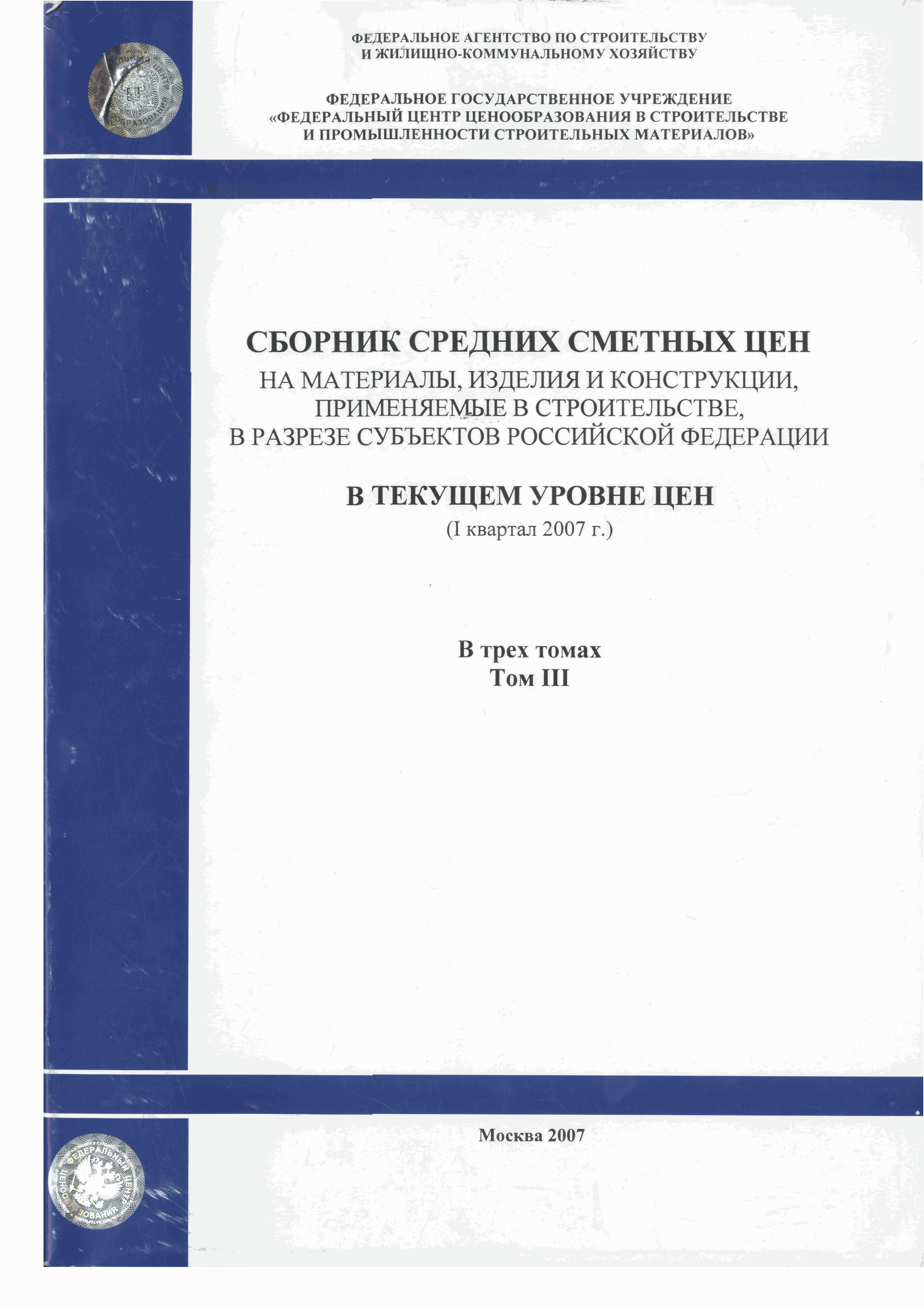 Скачать Том III. Сборник средних сметных цен на материалы, изделия и конструкции, применяемые в строительстве, в разрезе субъектов Российской Федерации. В текущем уровне цен (I квартал 2007 г.)Дата актуализации: 01.01.2021