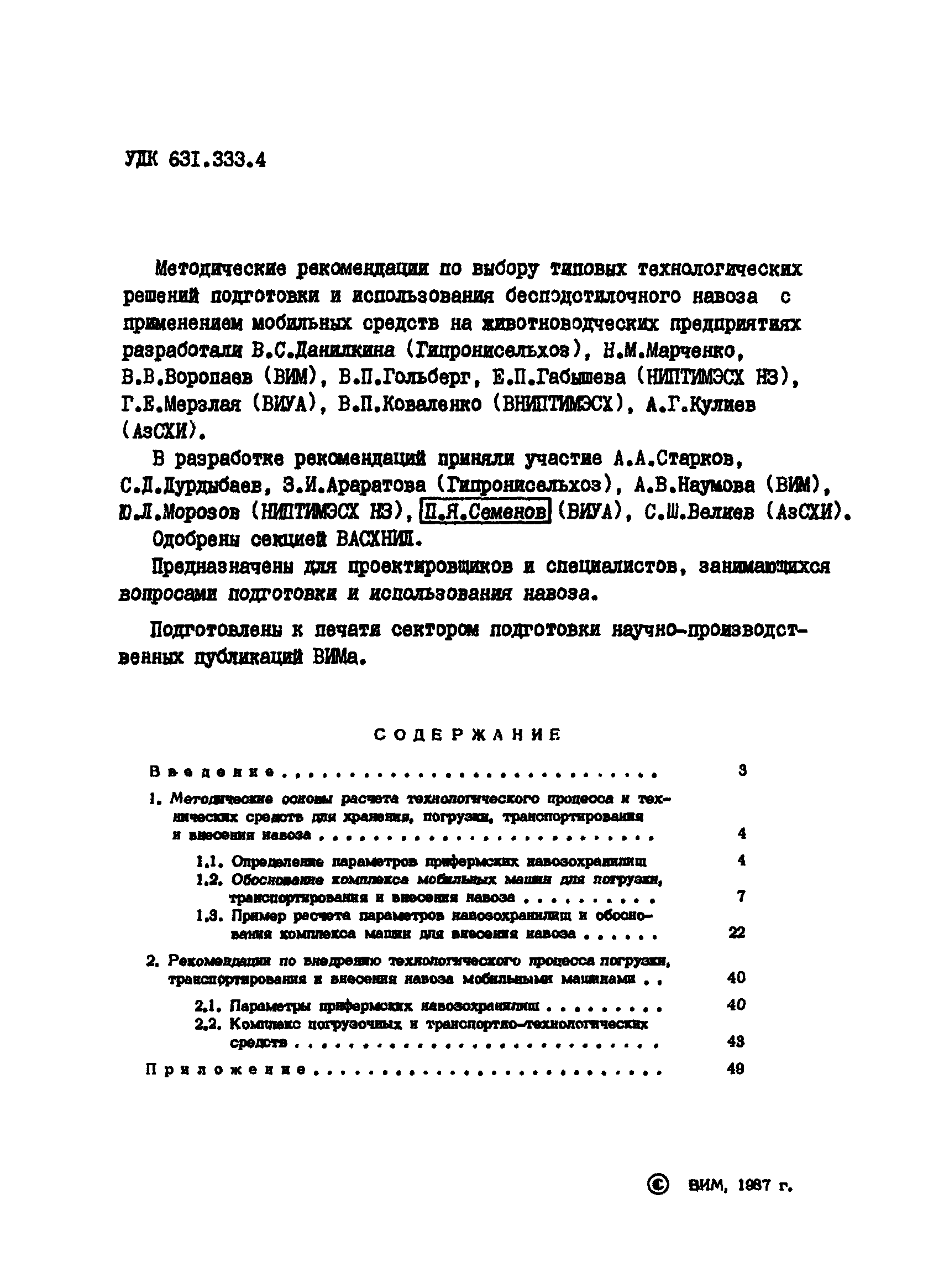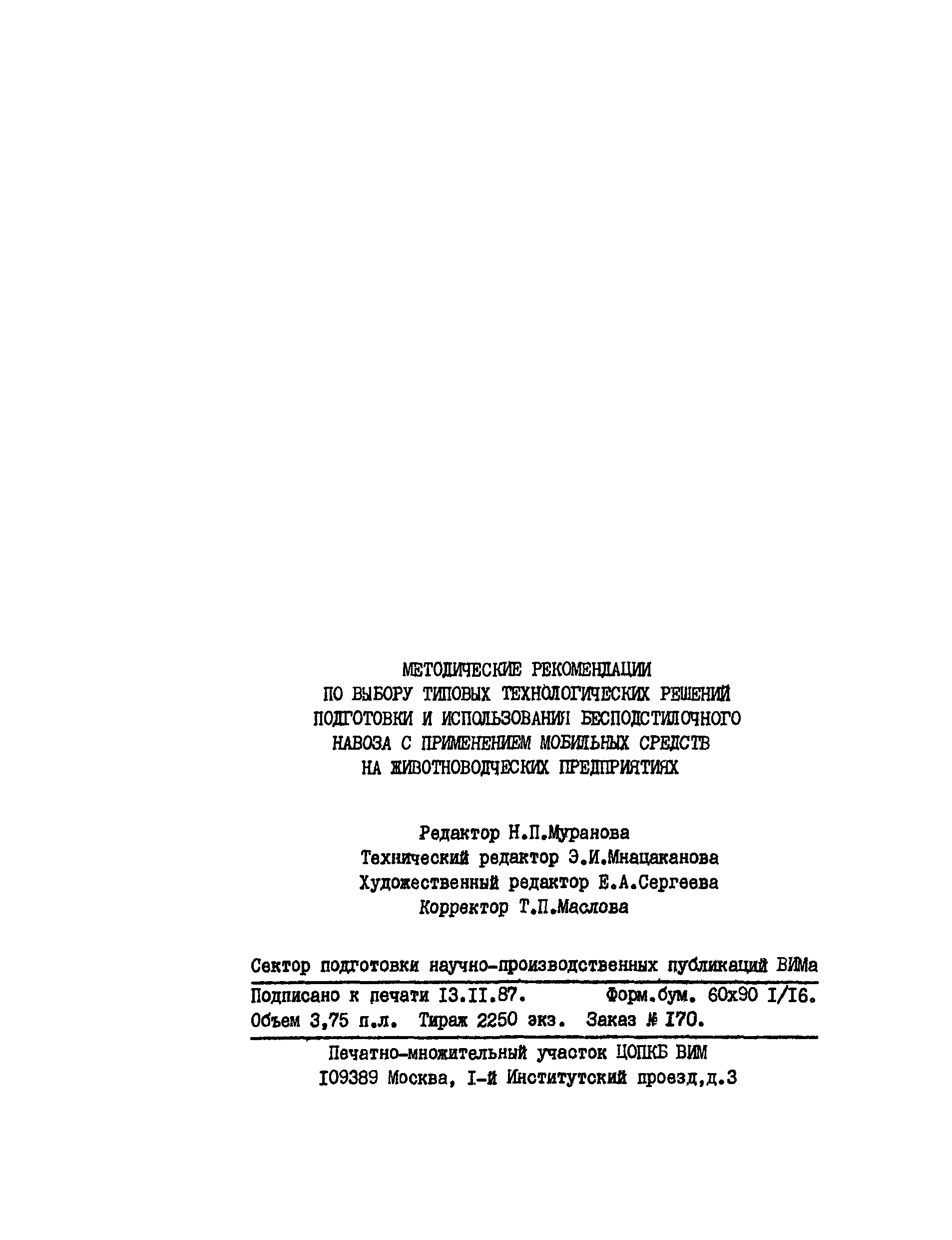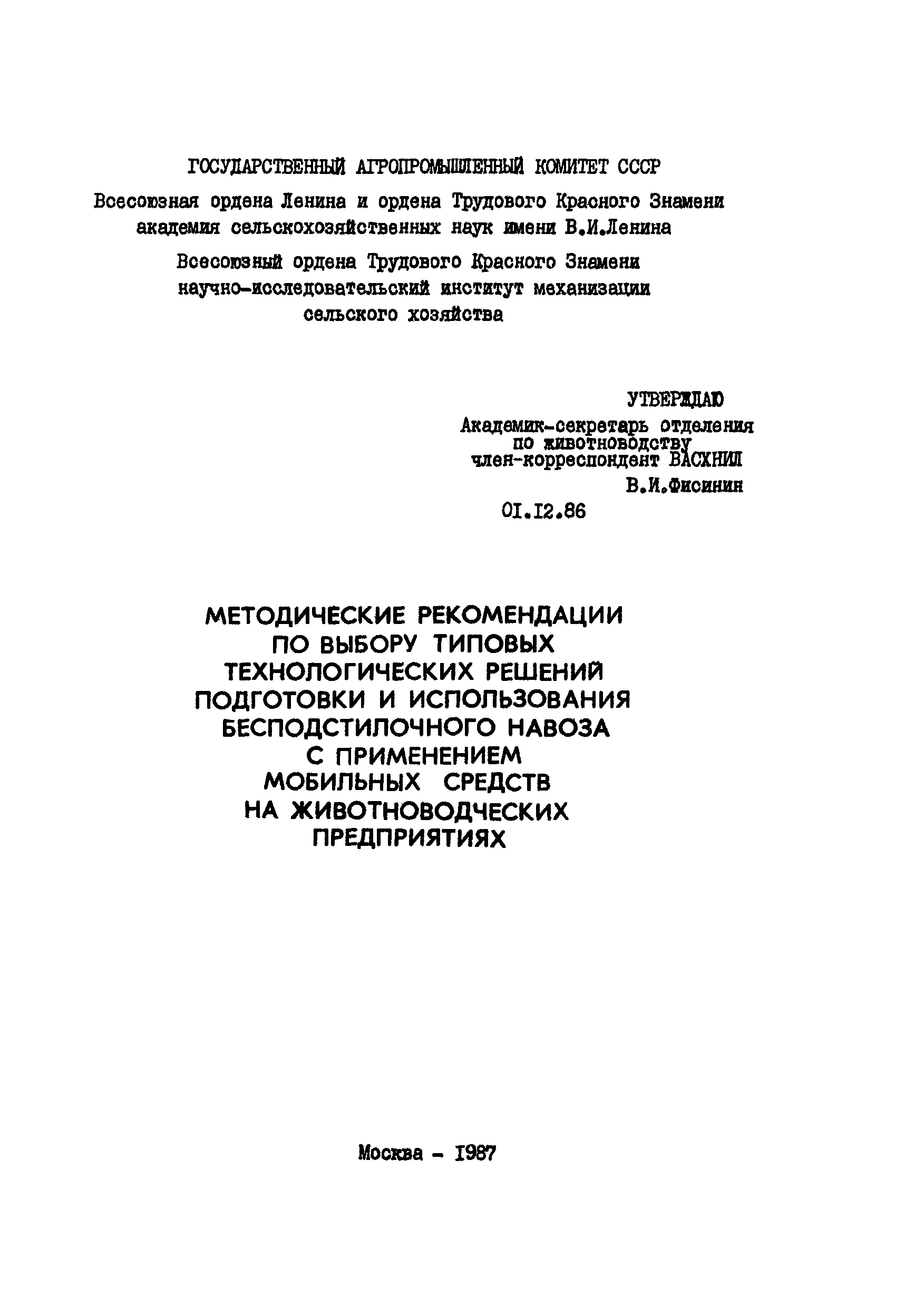| Название рус.: | Методические рекомендации по выбору типовых технологических решений подготовки и использования бесподстилочного навоза с применением мобильных средств на животноводческих предприятиях |