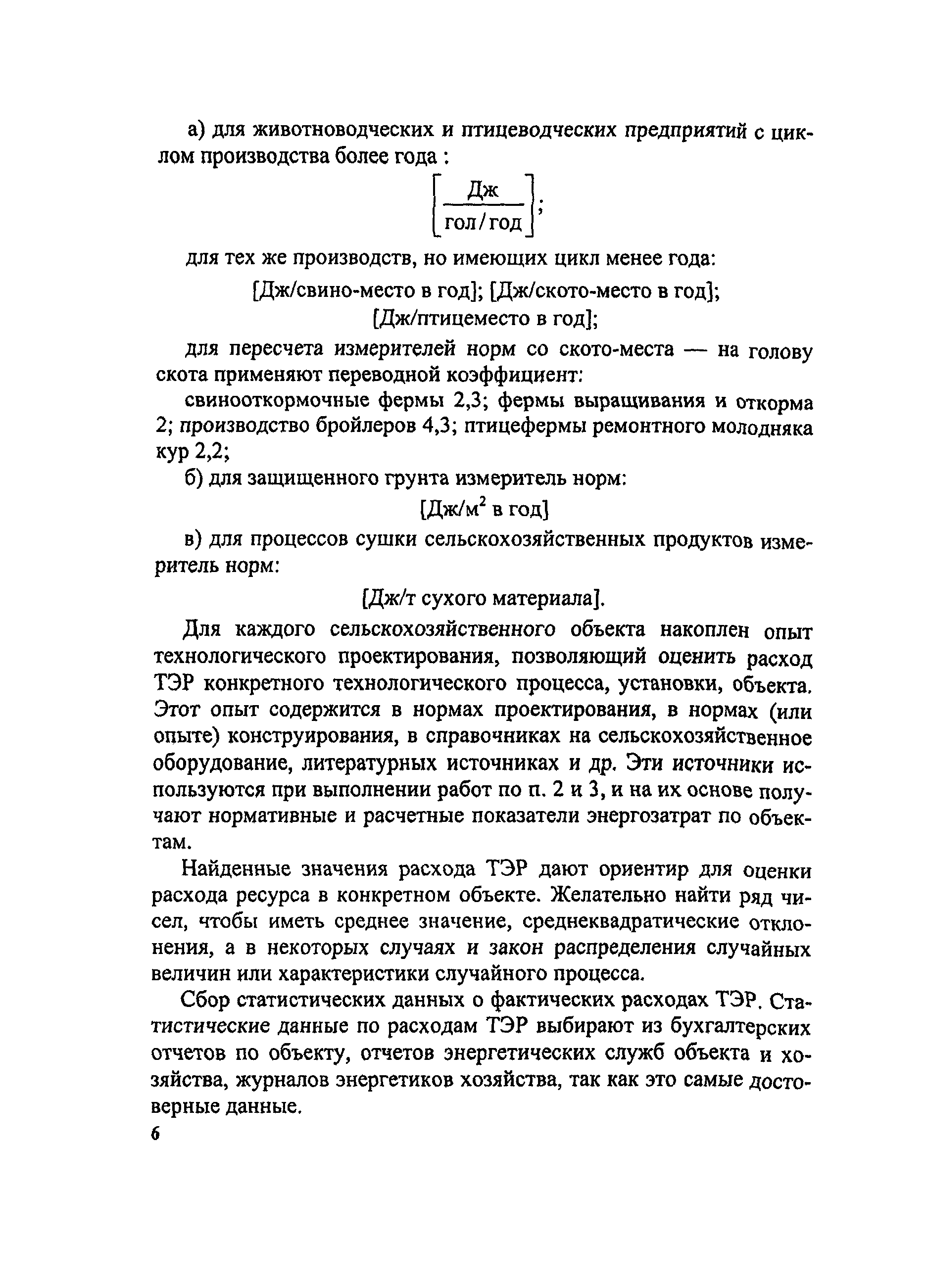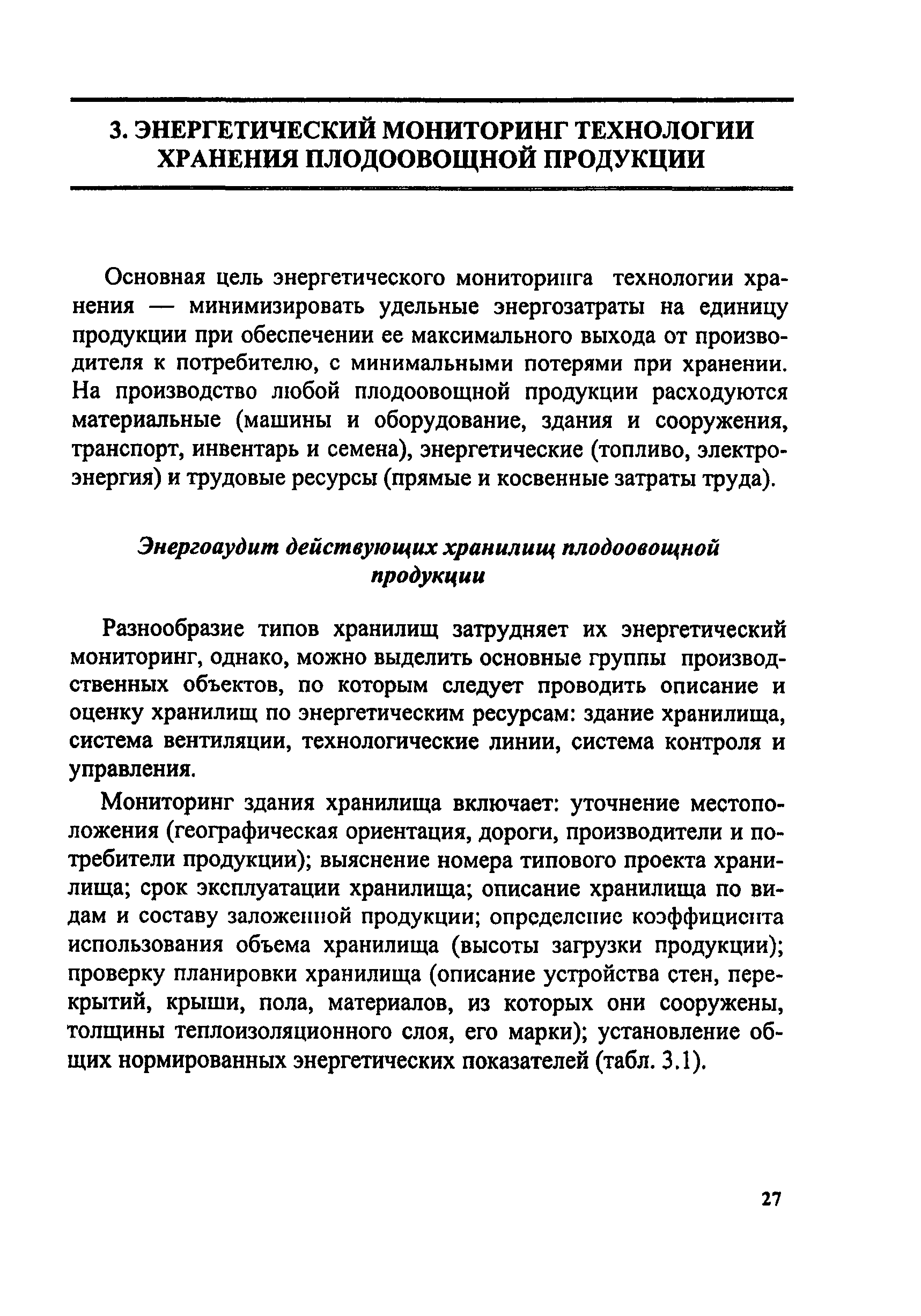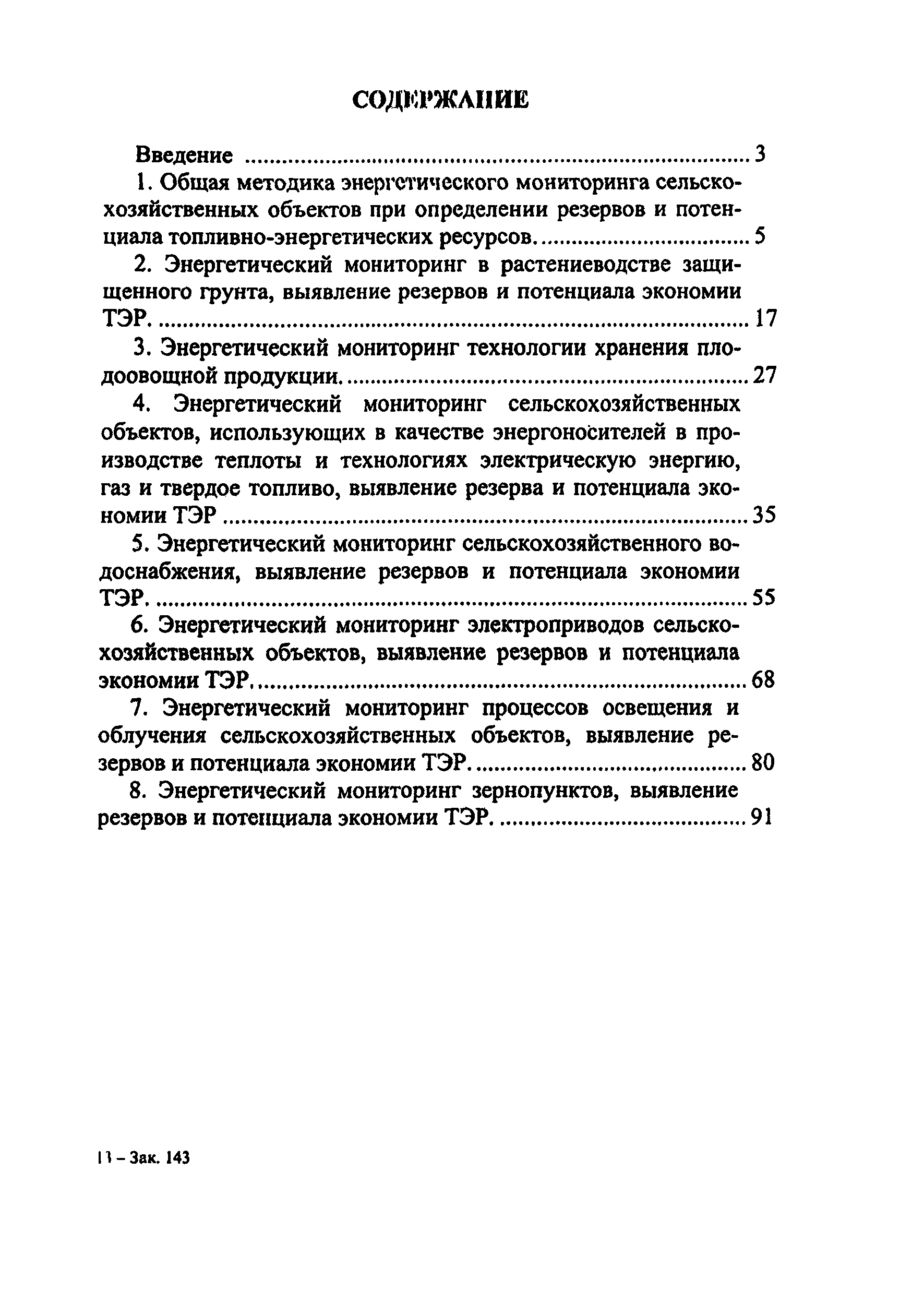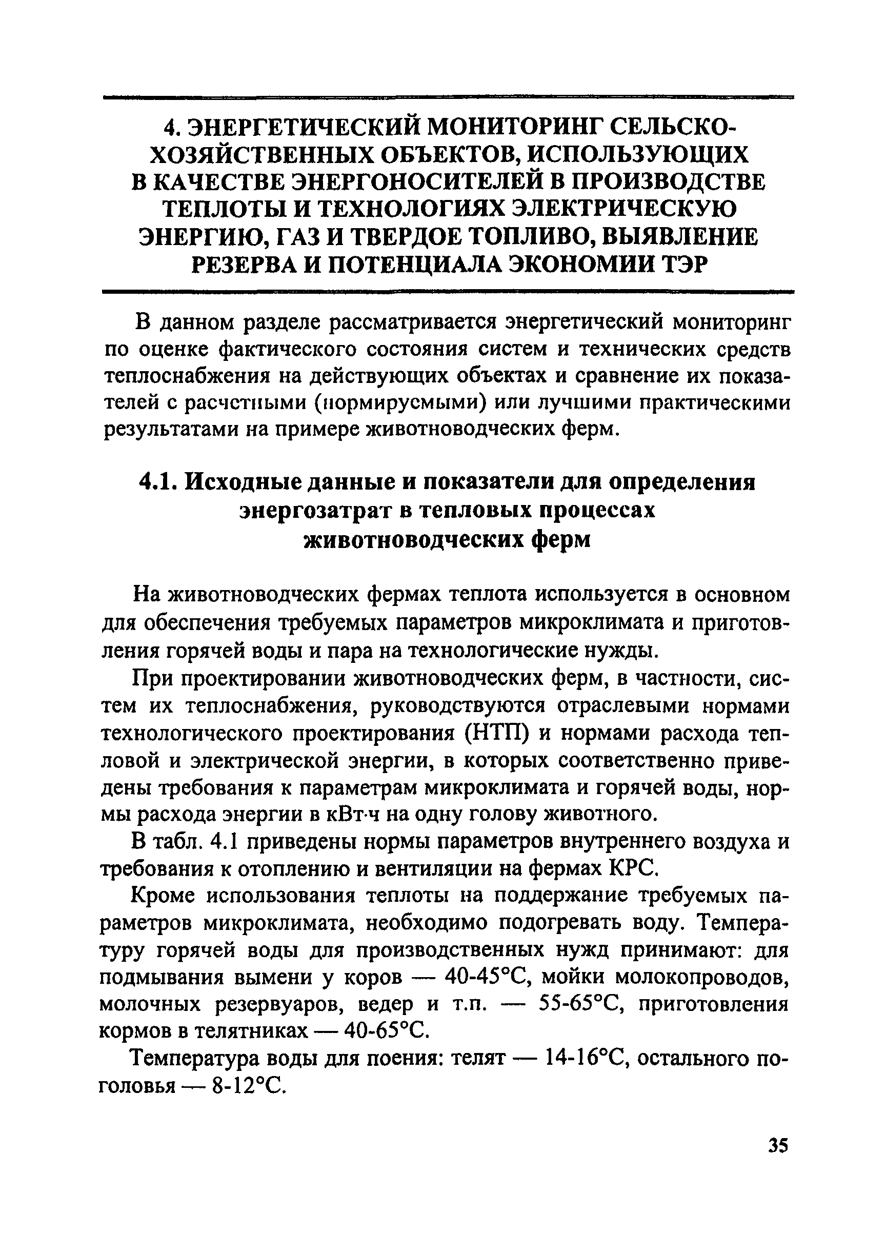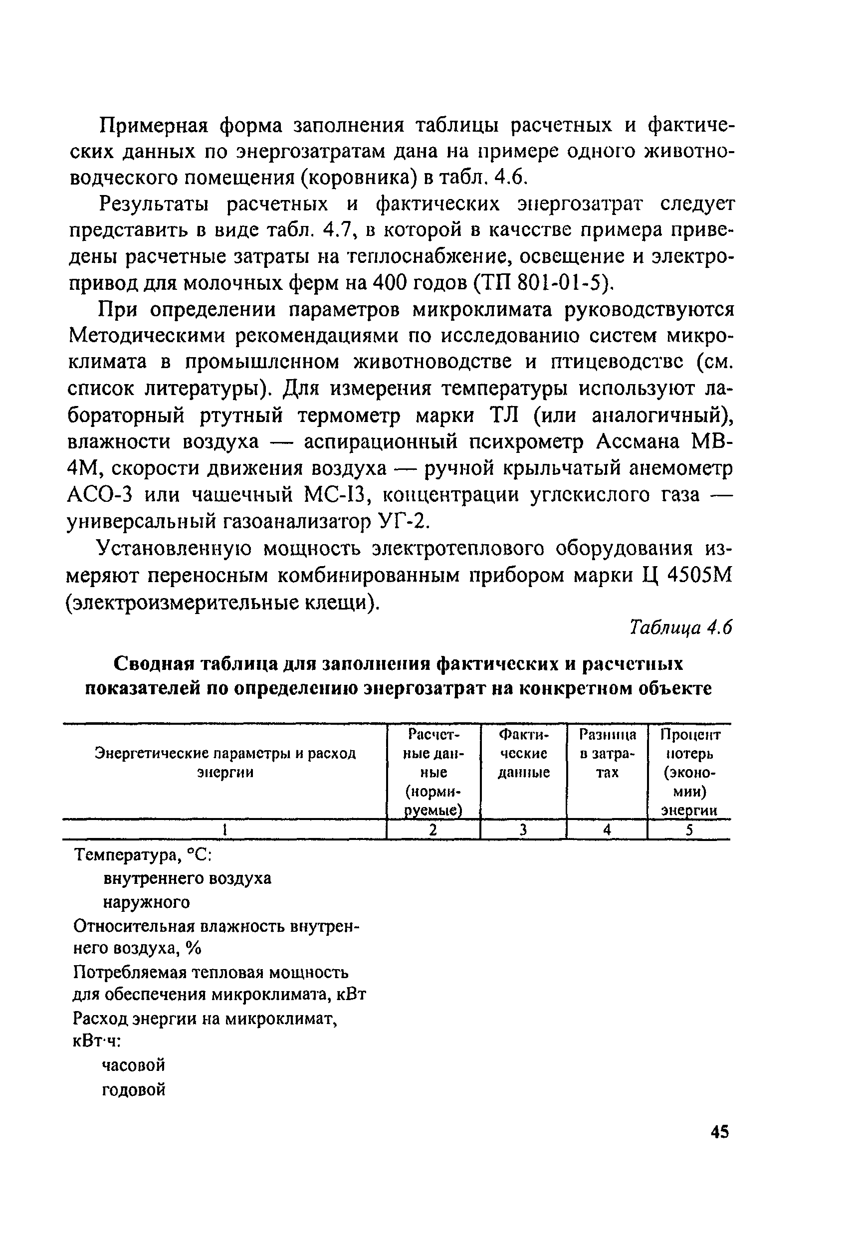 Методика энергетического мониторинга сельскохозяйственных объектов, выявление резервов и потенциала экономии топливно-энергетических ресурсов (ТЭР)| Статус: | действует | | Название рус.: | Методика энергетического мониторинга сельскохозяйственных объектов, выявление резервов и потенциала экономии топливно-энергетических ресурсов (ТЭР) | | Дата добавления в базу: | 01.09.2013 | | Дата актуализации: | 01.01.2021 | | Область применения: | Методика предназначена для применения специалистами энергетических служб хозяйств, районов и энергосистем для обследования энергетического хозяйства, анализа и расчета возможностей сокращения расходов энергоресурсов на сельскохозяйственных объектах. | | Оглавление: | Введение 1 Общая методика энергетического мониторинга сельскохозяйственных объектов при определении резервов и потенциала топливно-энергетических ресурсов 2 Энергетический мониторинг в растениеводстве защищенного грунта, выявление резервов и потенциала экономии ТЭР 3 Энергетический мониторинг технологии хранения плодоовощной продукции 4 Энергетический мониторинг сельскохозяйственных объектов, использующих в качестве энергоносителей в производстве теплоты и технологиях электрическую энергию, газ и твердое топливо, выявление резерва и потенциала экономии ТЭР 5 Энергетический мониторинг сельскохозяйственного водоснабжения, выявление резервов и потенциала экономии ТЭР 6 Энергетический мониторинг электроприводов сельскохозяйственных объектов, выявление резервов и потенциала экономии ТЭР 7 Энергетический мониторинг процессов освещения и облучения сельскохозяйственных объектов, выявление резервов и потенциала экономии ТЭР 8 Энергетический мониторинг зернопунктов, выявление резервов и потенциала экономии ТЭР | | Разработан: | ВИЭСХ