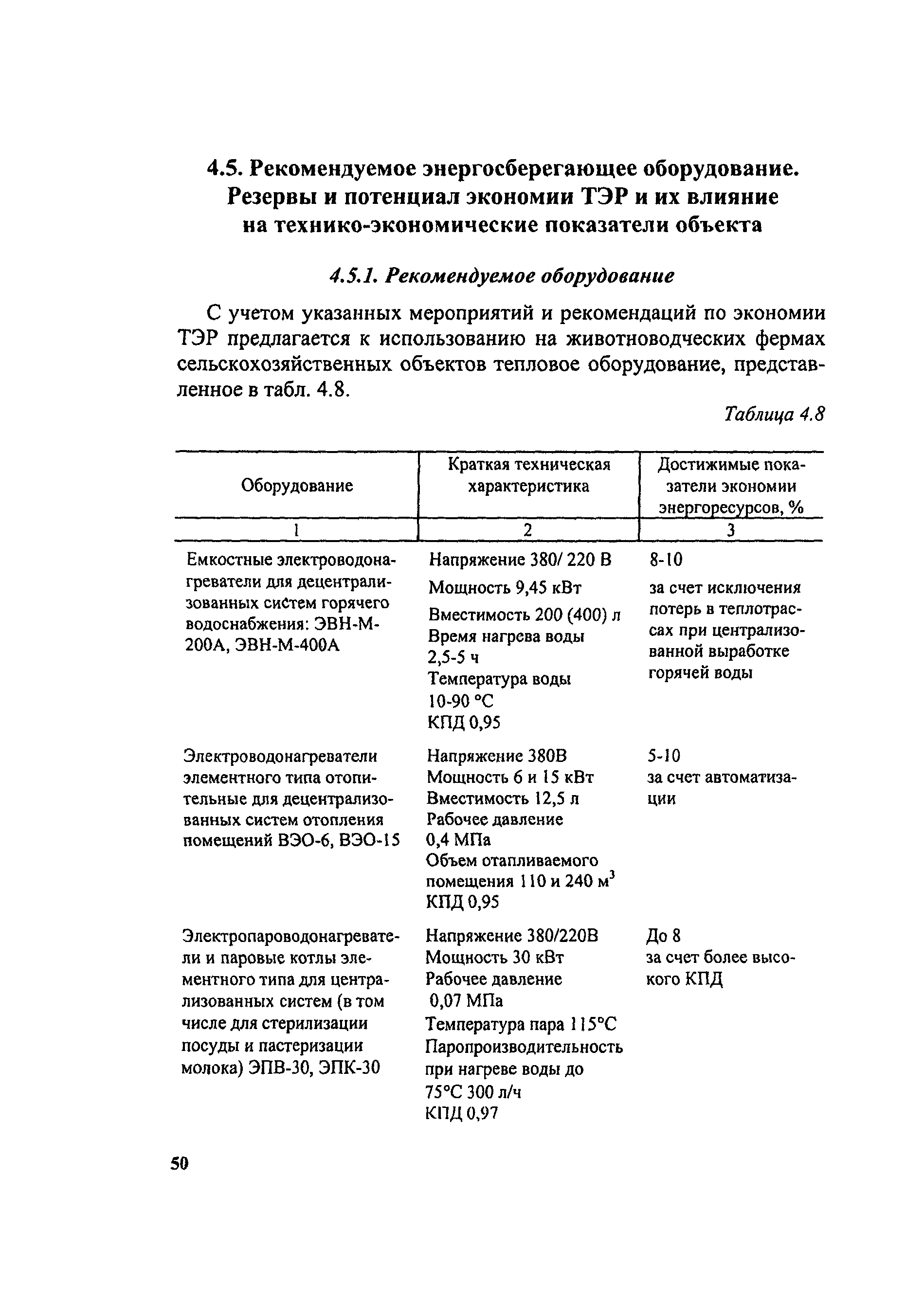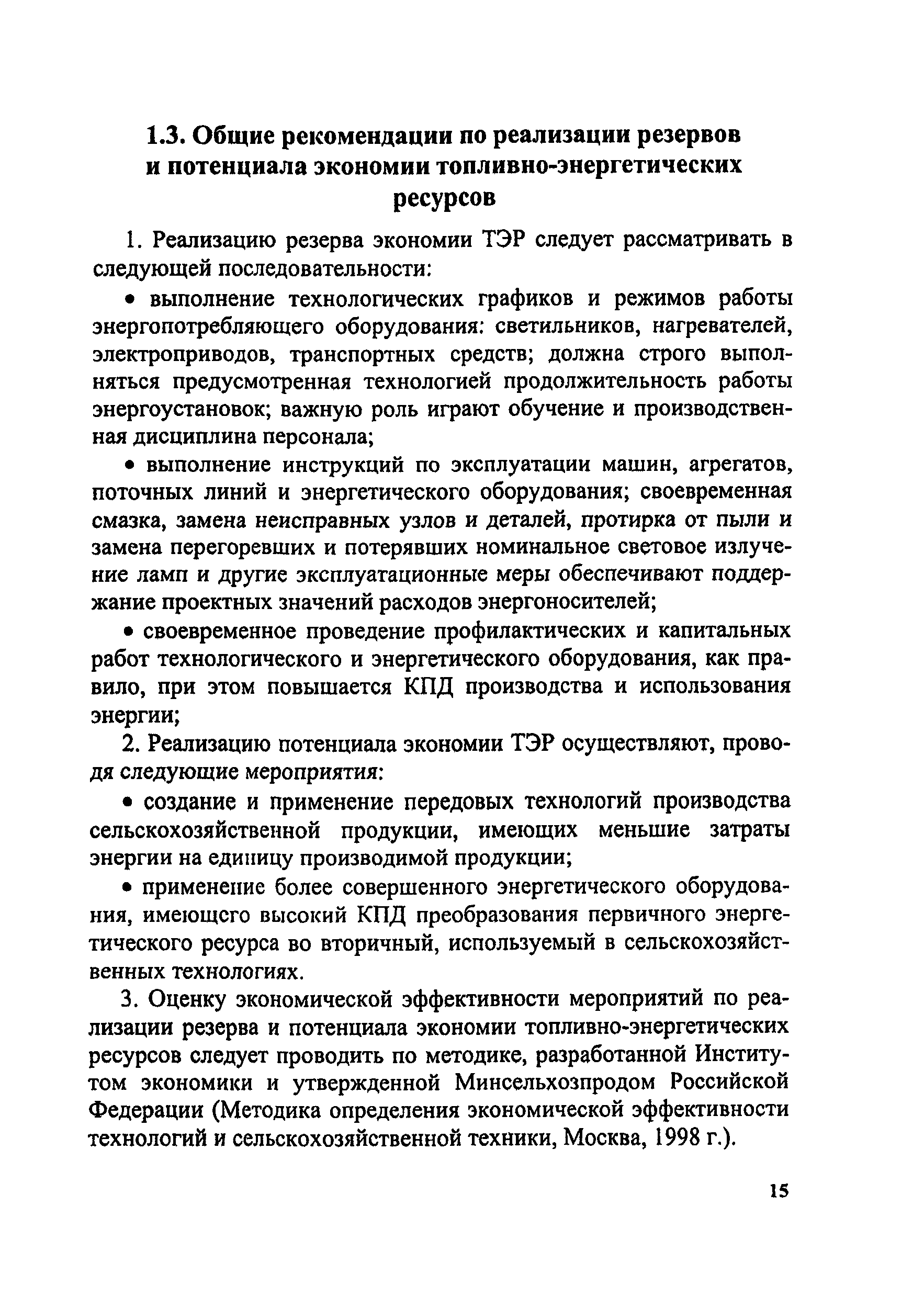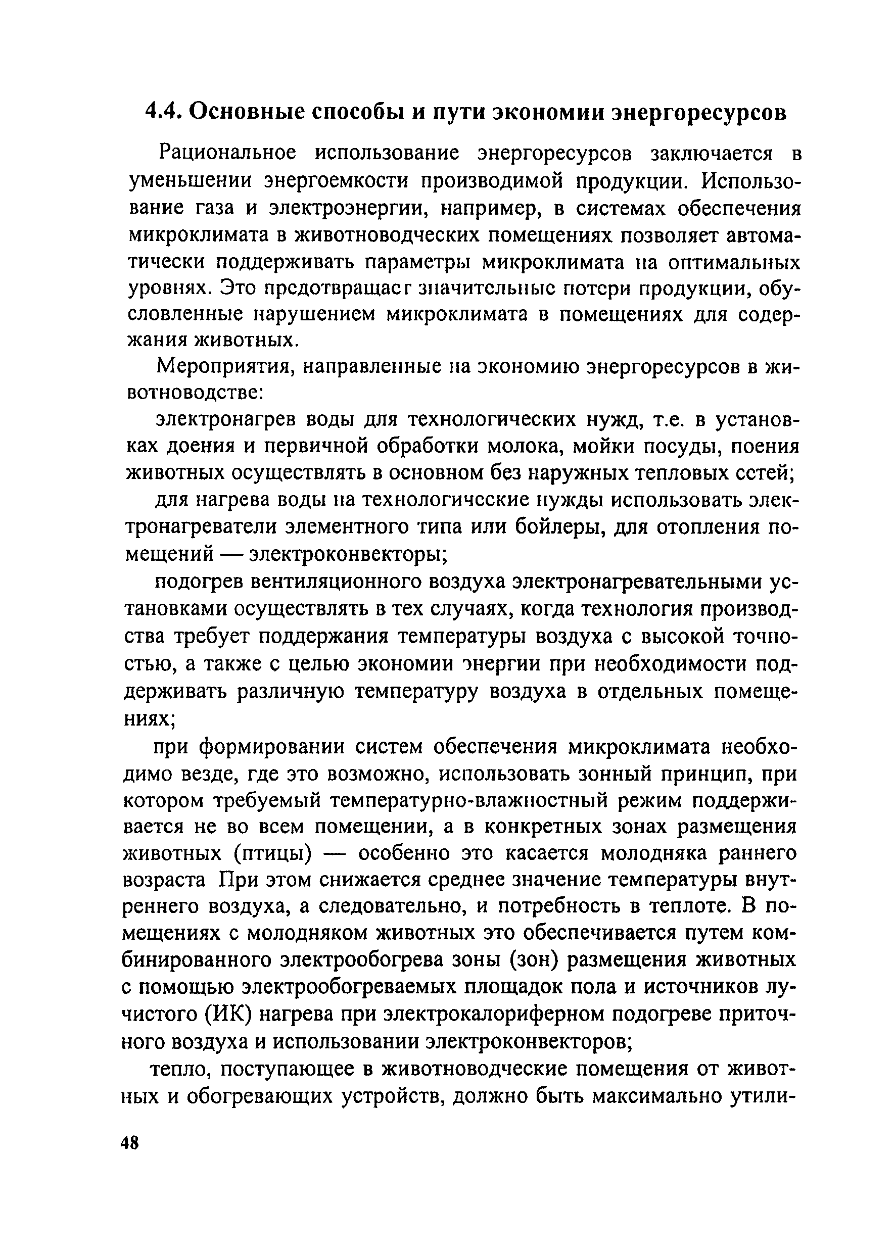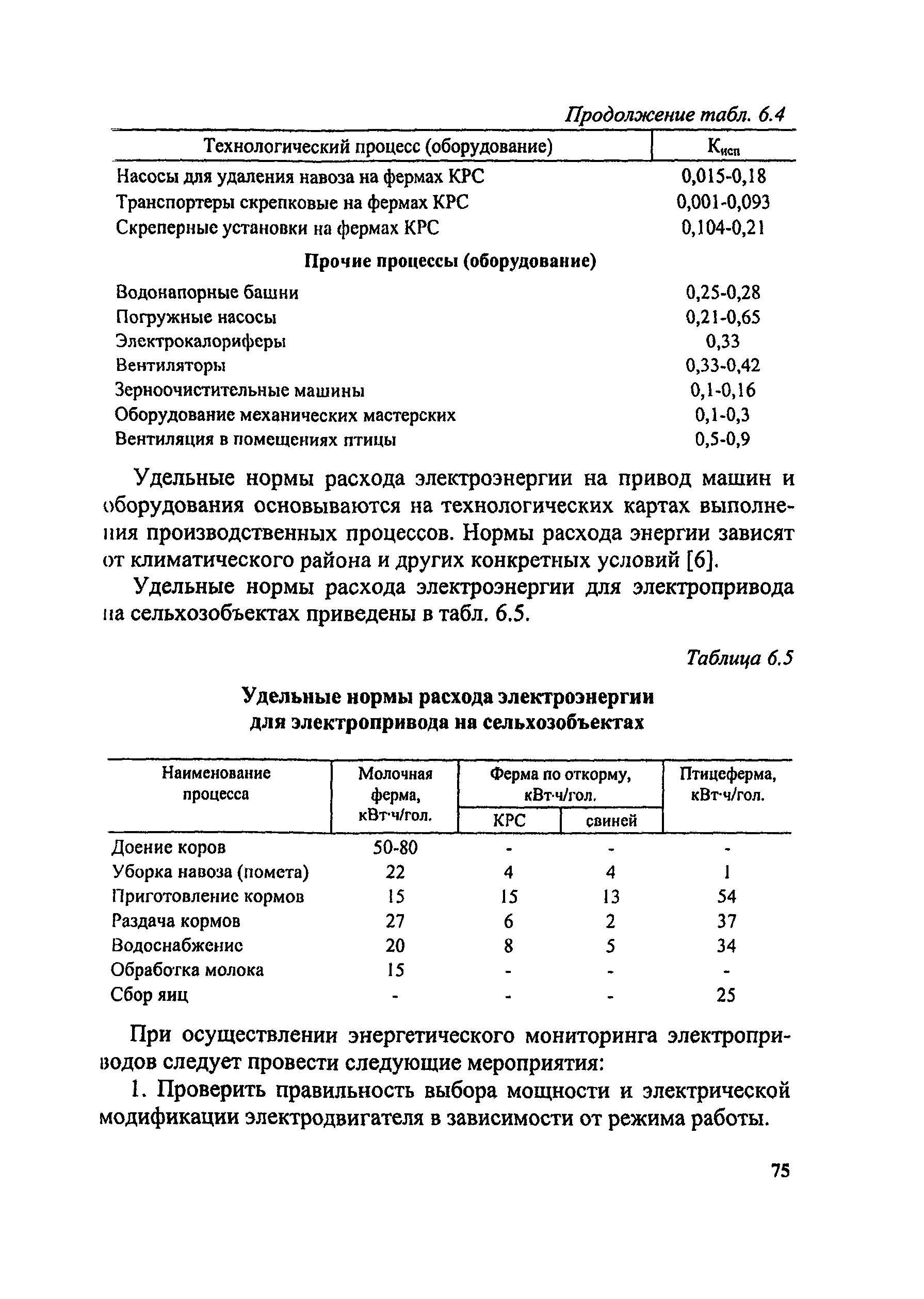 Методика энергетического мониторинга сельскохозяйственных объектов, выявление резервов и потенциала экономии топливно-энергетических ресурсов (ТЭР)| Статус: | действует | | Название рус.: | Методика энергетического мониторинга сельскохозяйственных объектов, выявление резервов и потенциала экономии топливно-энергетических ресурсов (ТЭР) | | Дата добавления в базу: | 01.09.2013 | | Дата актуализации: | 01.01.2021 | | Область применения: | Методика предназначена для применения специалистами энергетических служб хозяйств, районов и энергосистем для обследования энергетического хозяйства, анализа и расчета возможностей сокращения расходов энергоресурсов на сельскохозяйственных объектах. | | Оглавление: | Введение 1 Общая методика энергетического мониторинга сельскохозяйственных объектов при определении резервов и потенциала топливно-энергетических ресурсов 2 Энергетический мониторинг в растениеводстве защищенного грунта, выявление резервов и потенциала экономии ТЭР 3 Энергетический мониторинг технологии хранения плодоовощной продукции 4 Энергетический мониторинг сельскохозяйственных объектов, использующих в качестве энергоносителей в производстве теплоты и технологиях электрическую энергию, газ и твердое топливо, выявление резерва и потенциала экономии ТЭР 5 Энергетический мониторинг сельскохозяйственного водоснабжения, выявление резервов и потенциала экономии ТЭР 6 Энергетический мониторинг электроприводов сельскохозяйственных объектов, выявление резервов и потенциала экономии ТЭР 7 Энергетический мониторинг процессов освещения и облучения сельскохозяйственных объектов, выявление резервов и потенциала экономии ТЭР 8 Энергетический мониторинг зернопунктов, выявление резервов и потенциала экономии ТЭР | | Разработан: | ВИЭСХ