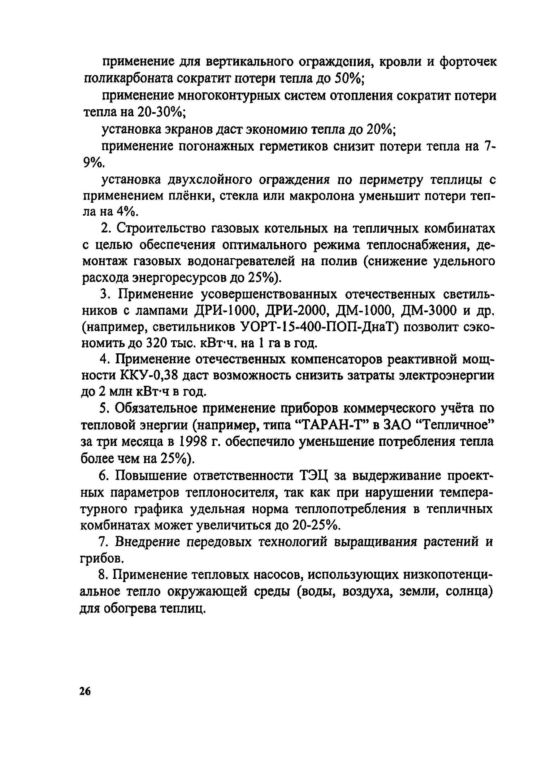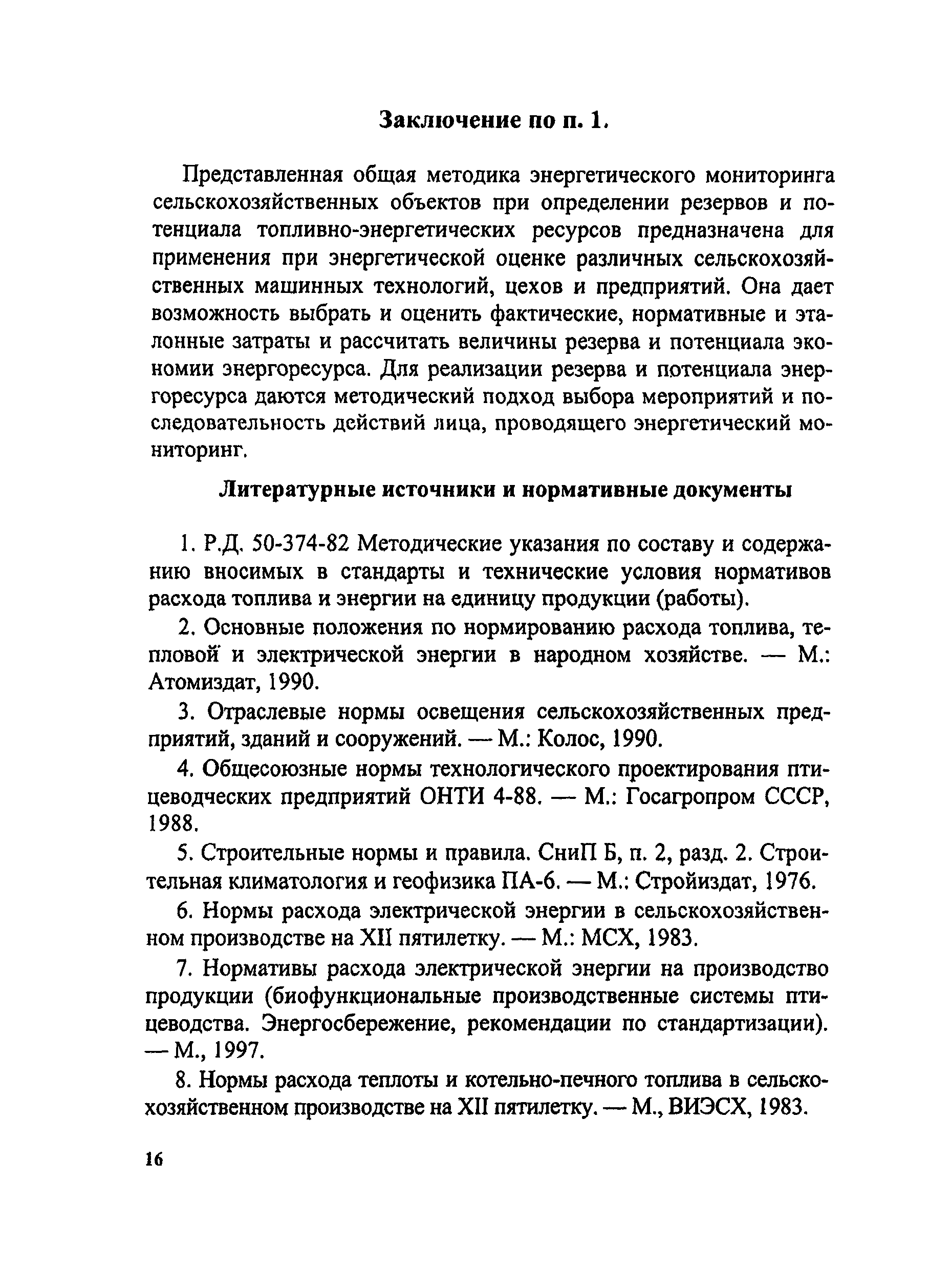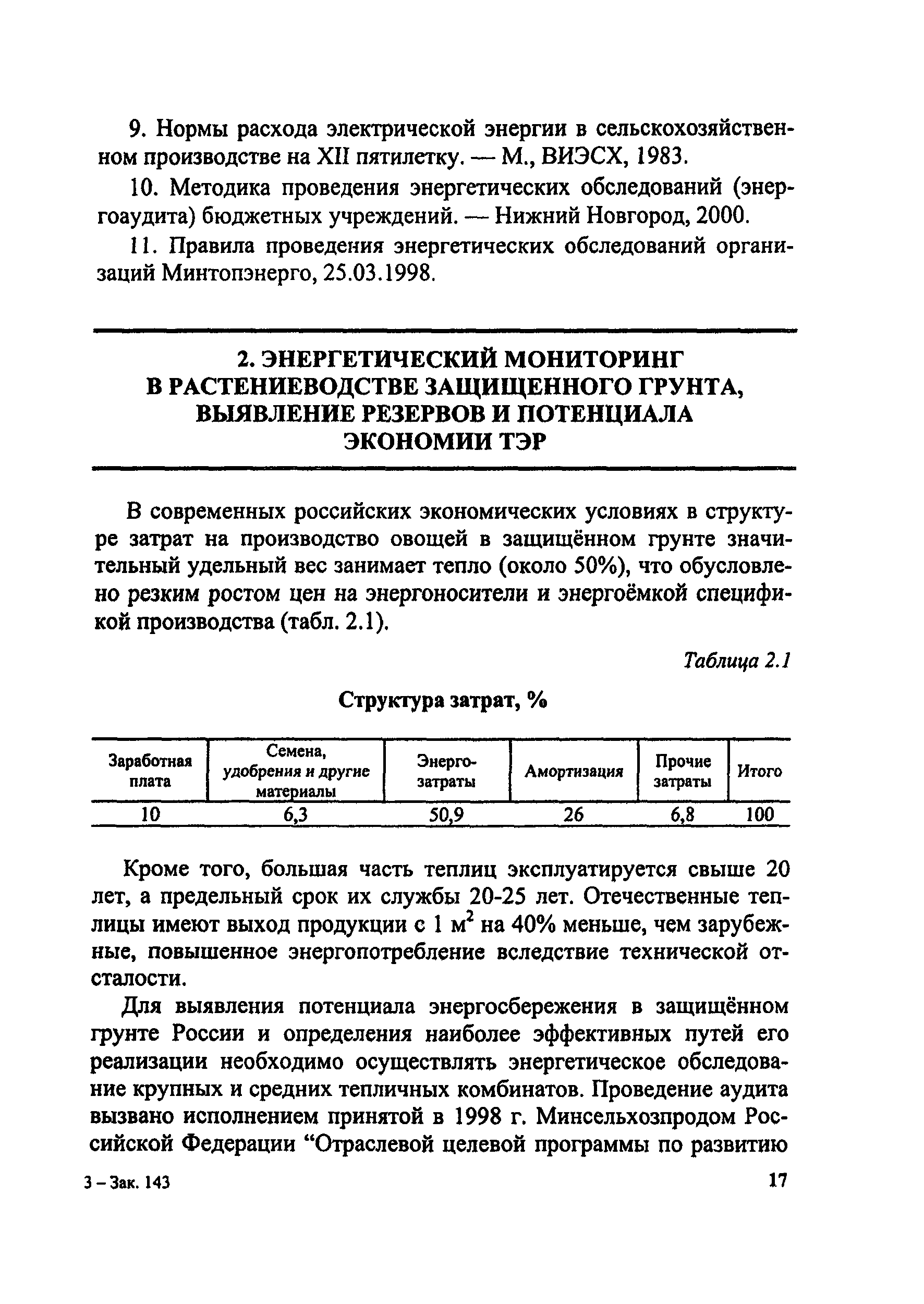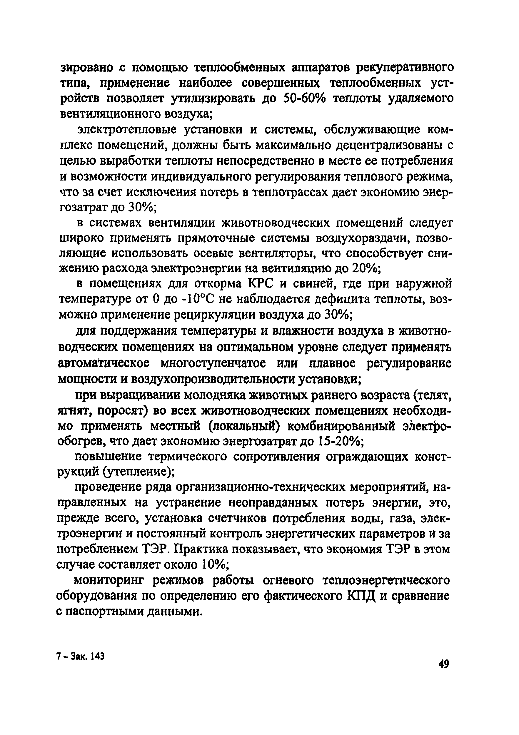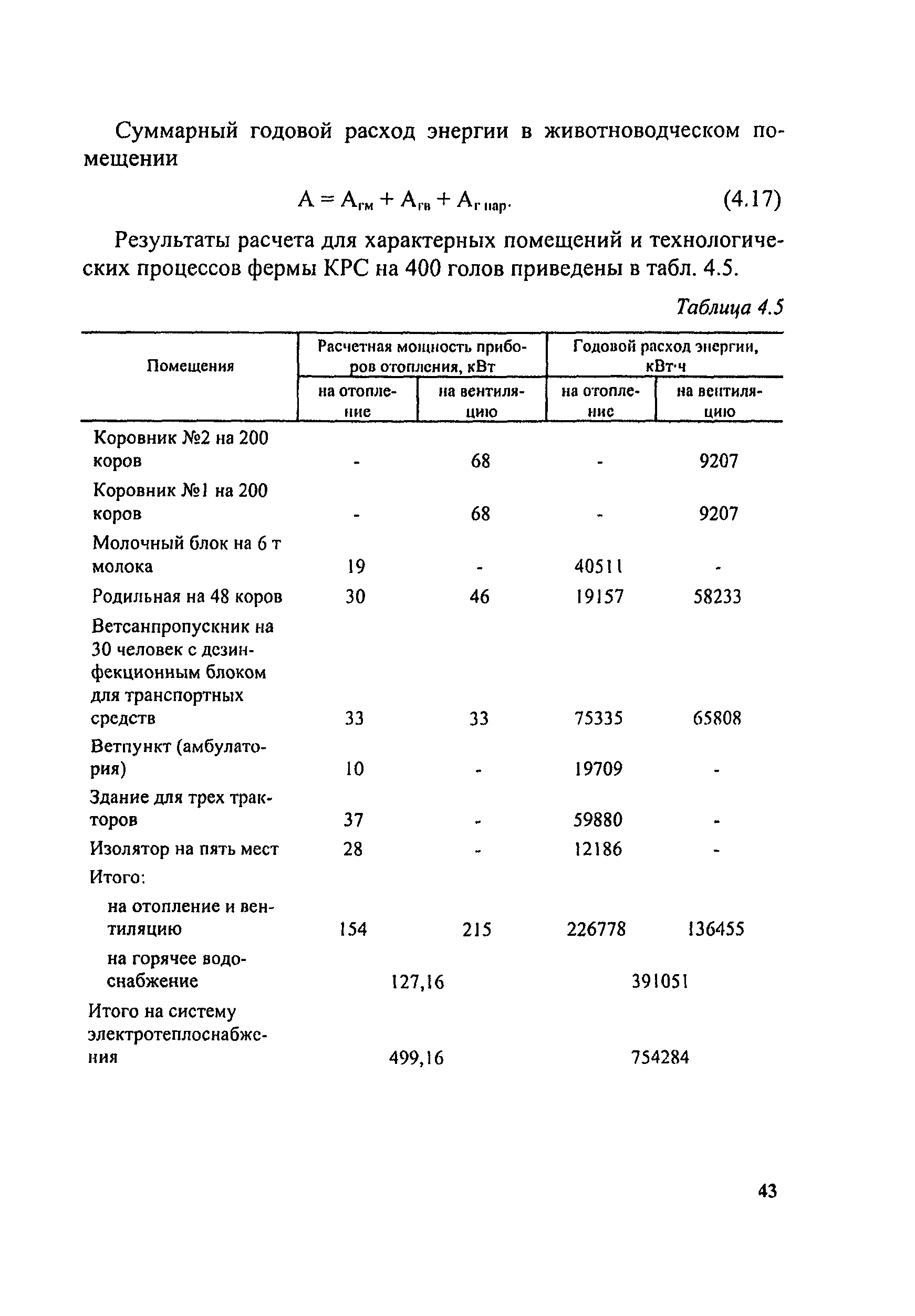 Методика энергетического мониторинга сельскохозяйственных объектов, выявление резервов и потенциала экономии топливно-энергетических ресурсов (ТЭР)| Статус: | действует | | Название рус.: | Методика энергетического мониторинга сельскохозяйственных объектов, выявление резервов и потенциала экономии топливно-энергетических ресурсов (ТЭР) | | Дата добавления в базу: | 01.09.2013 | | Дата актуализации: | 01.01.2021 | | Область применения: | Методика предназначена для применения специалистами энергетических служб хозяйств, районов и энергосистем для обследования энергетического хозяйства, анализа и расчета возможностей сокращения расходов энергоресурсов на сельскохозяйственных объектах. | | Оглавление: | Введение 1 Общая методика энергетического мониторинга сельскохозяйственных объектов при определении резервов и потенциала топливно-энергетических ресурсов 2 Энергетический мониторинг в растениеводстве защищенного грунта, выявление резервов и потенциала экономии ТЭР 3 Энергетический мониторинг технологии хранения плодоовощной продукции 4 Энергетический мониторинг сельскохозяйственных объектов, использующих в качестве энергоносителей в производстве теплоты и технологиях электрическую энергию, газ и твердое топливо, выявление резерва и потенциала экономии ТЭР 5 Энергетический мониторинг сельскохозяйственного водоснабжения, выявление резервов и потенциала экономии ТЭР 6 Энергетический мониторинг электроприводов сельскохозяйственных объектов, выявление резервов и потенциала экономии ТЭР 7 Энергетический мониторинг процессов освещения и облучения сельскохозяйственных объектов, выявление резервов и потенциала экономии ТЭР 8 Энергетический мониторинг зернопунктов, выявление резервов и потенциала экономии ТЭР | | Разработан: | ВИЭСХ