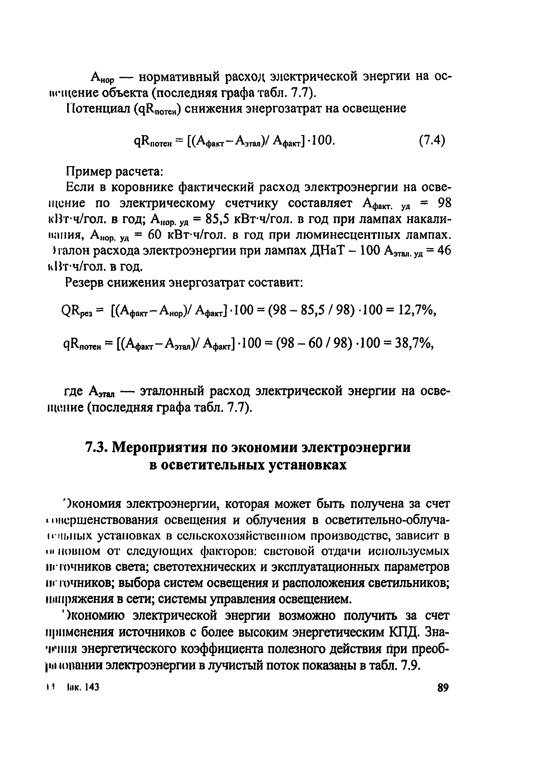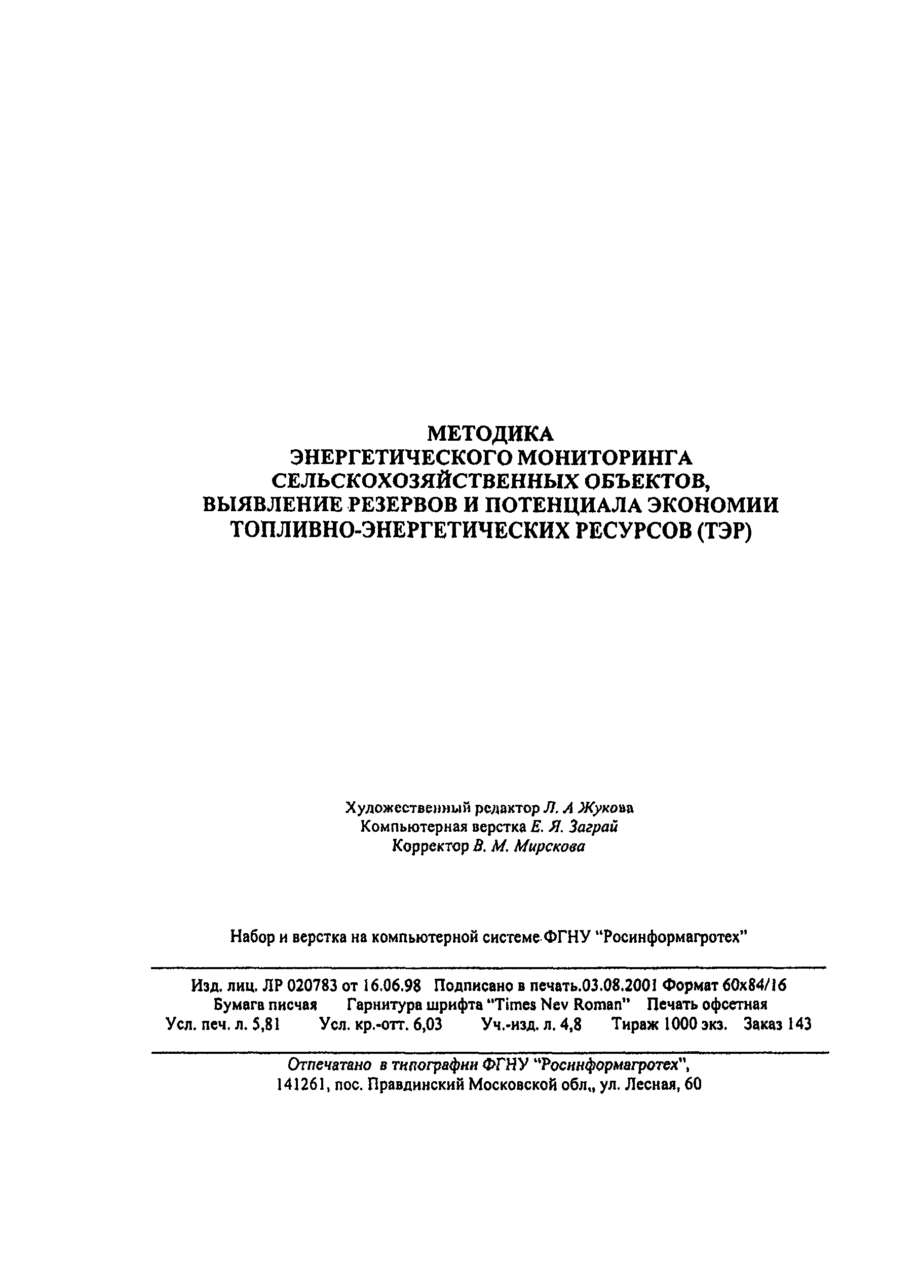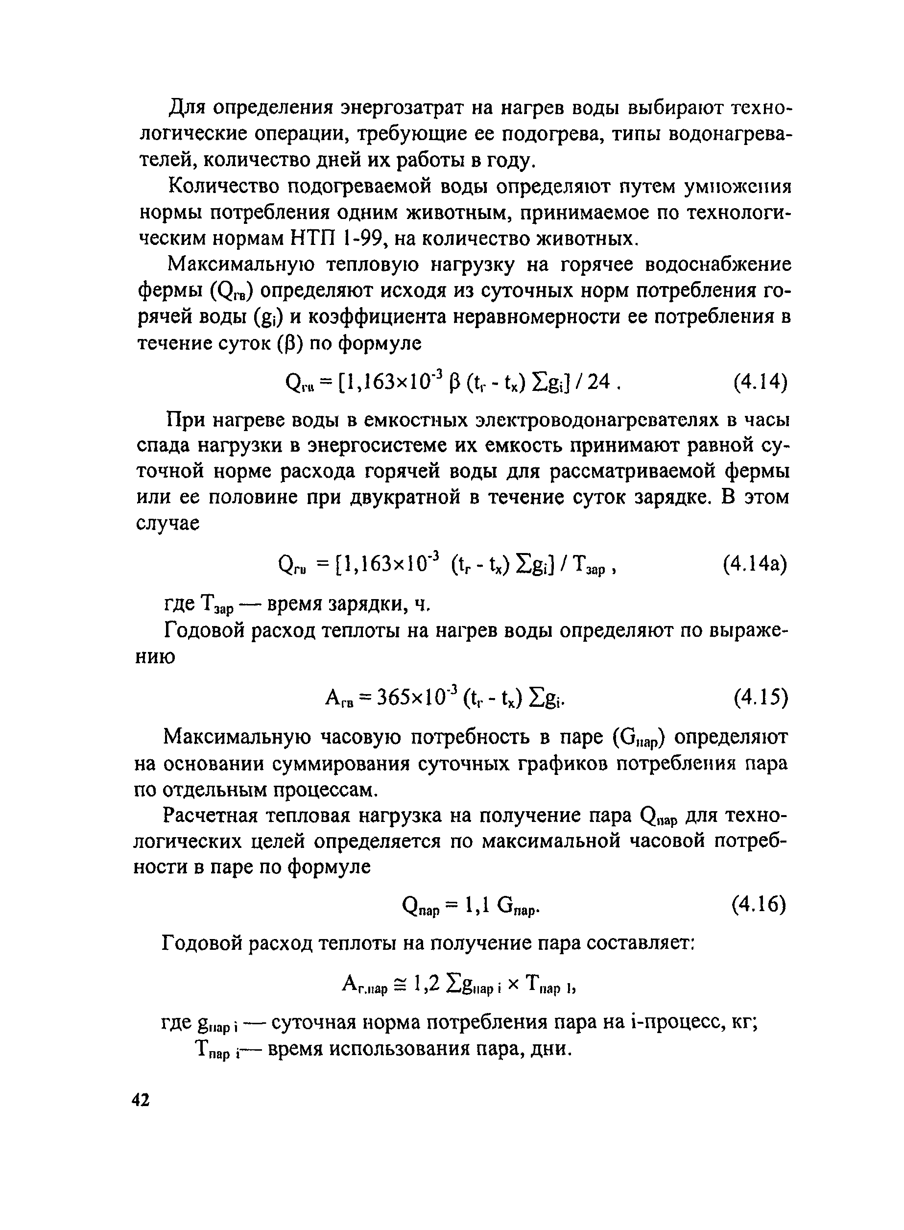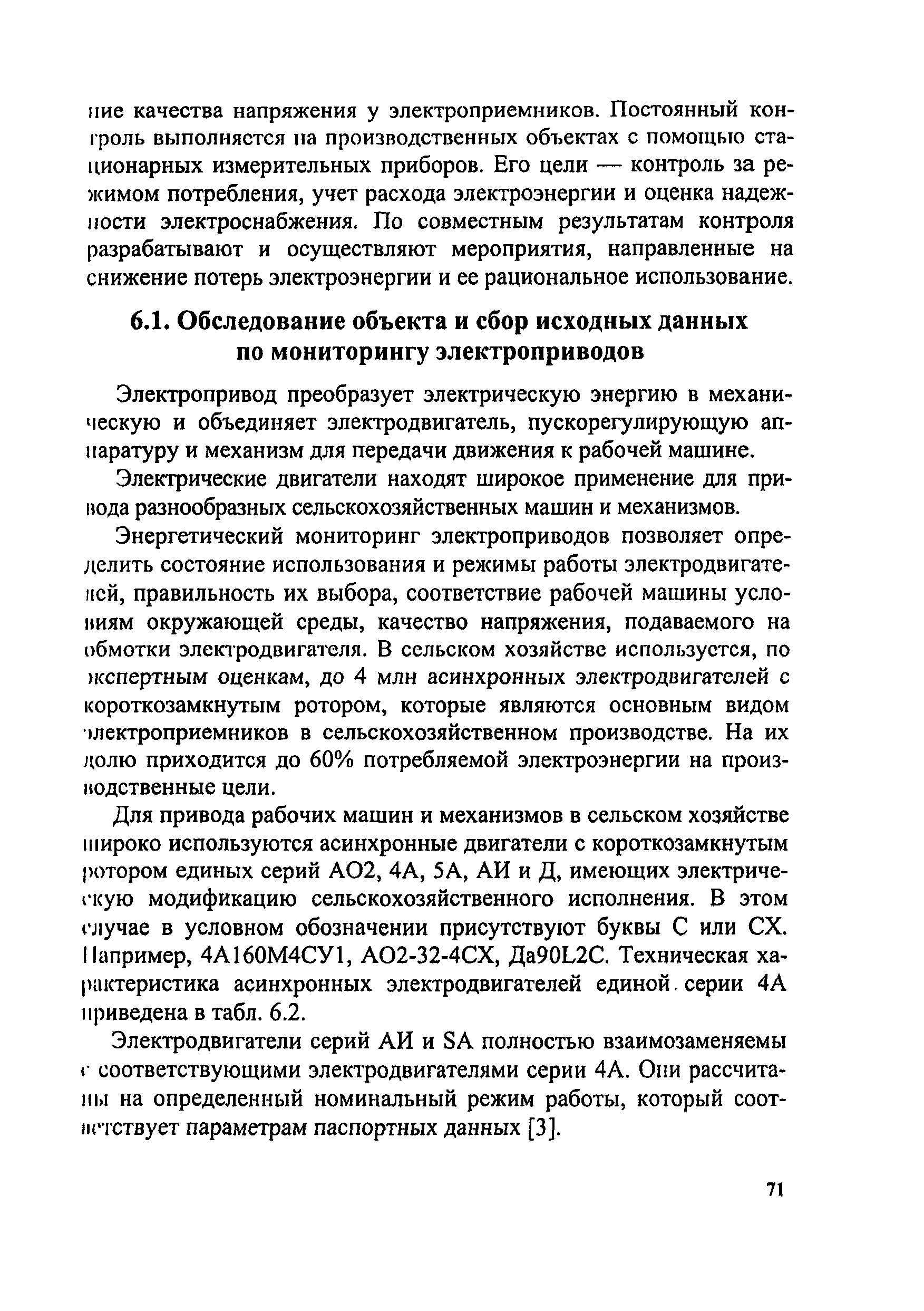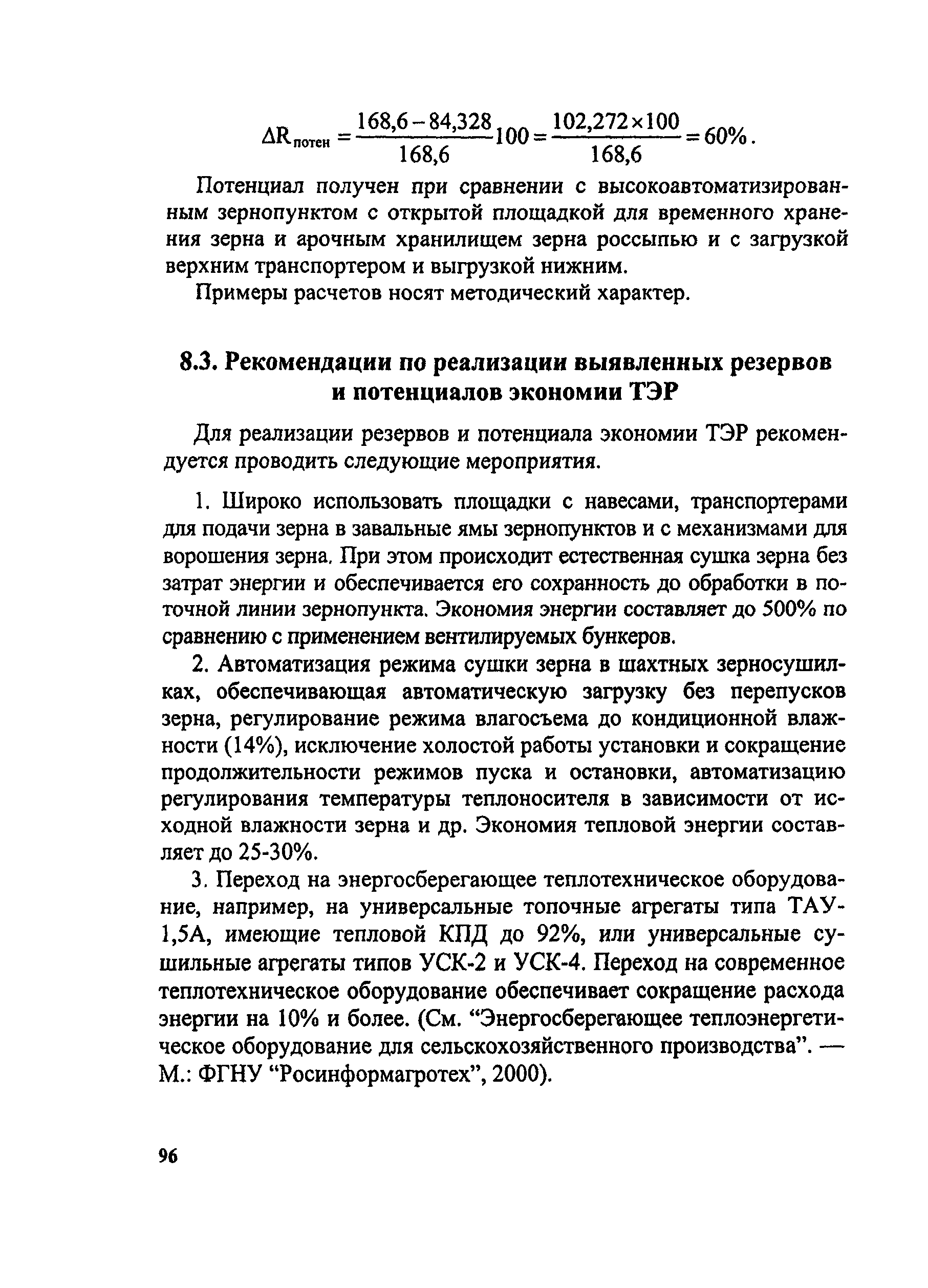 Методика энергетического мониторинга сельскохозяйственных объектов, выявление резервов и потенциала экономии топливно-энергетических ресурсов (ТЭР)| Статус: | действует | | Название рус.: | Методика энергетического мониторинга сельскохозяйственных объектов, выявление резервов и потенциала экономии топливно-энергетических ресурсов (ТЭР) | | Дата добавления в базу: | 01.09.2013 | | Дата актуализации: | 01.01.2021 | | Область применения: | Методика предназначена для применения специалистами энергетических служб хозяйств, районов и энергосистем для обследования энергетического хозяйства, анализа и расчета возможностей сокращения расходов энергоресурсов на сельскохозяйственных объектах. | | Оглавление: | Введение 1 Общая методика энергетического мониторинга сельскохозяйственных объектов при определении резервов и потенциала топливно-энергетических ресурсов 2 Энергетический мониторинг в растениеводстве защищенного грунта, выявление резервов и потенциала экономии ТЭР 3 Энергетический мониторинг технологии хранения плодоовощной продукции 4 Энергетический мониторинг сельскохозяйственных объектов, использующих в качестве энергоносителей в производстве теплоты и технологиях электрическую энергию, газ и твердое топливо, выявление резерва и потенциала экономии ТЭР 5 Энергетический мониторинг сельскохозяйственного водоснабжения, выявление резервов и потенциала экономии ТЭР 6 Энергетический мониторинг электроприводов сельскохозяйственных объектов, выявление резервов и потенциала экономии ТЭР 7 Энергетический мониторинг процессов освещения и облучения сельскохозяйственных объектов, выявление резервов и потенциала экономии ТЭР 8 Энергетический мониторинг зернопунктов, выявление резервов и потенциала экономии ТЭР | | Разработан: | ВИЭСХ
