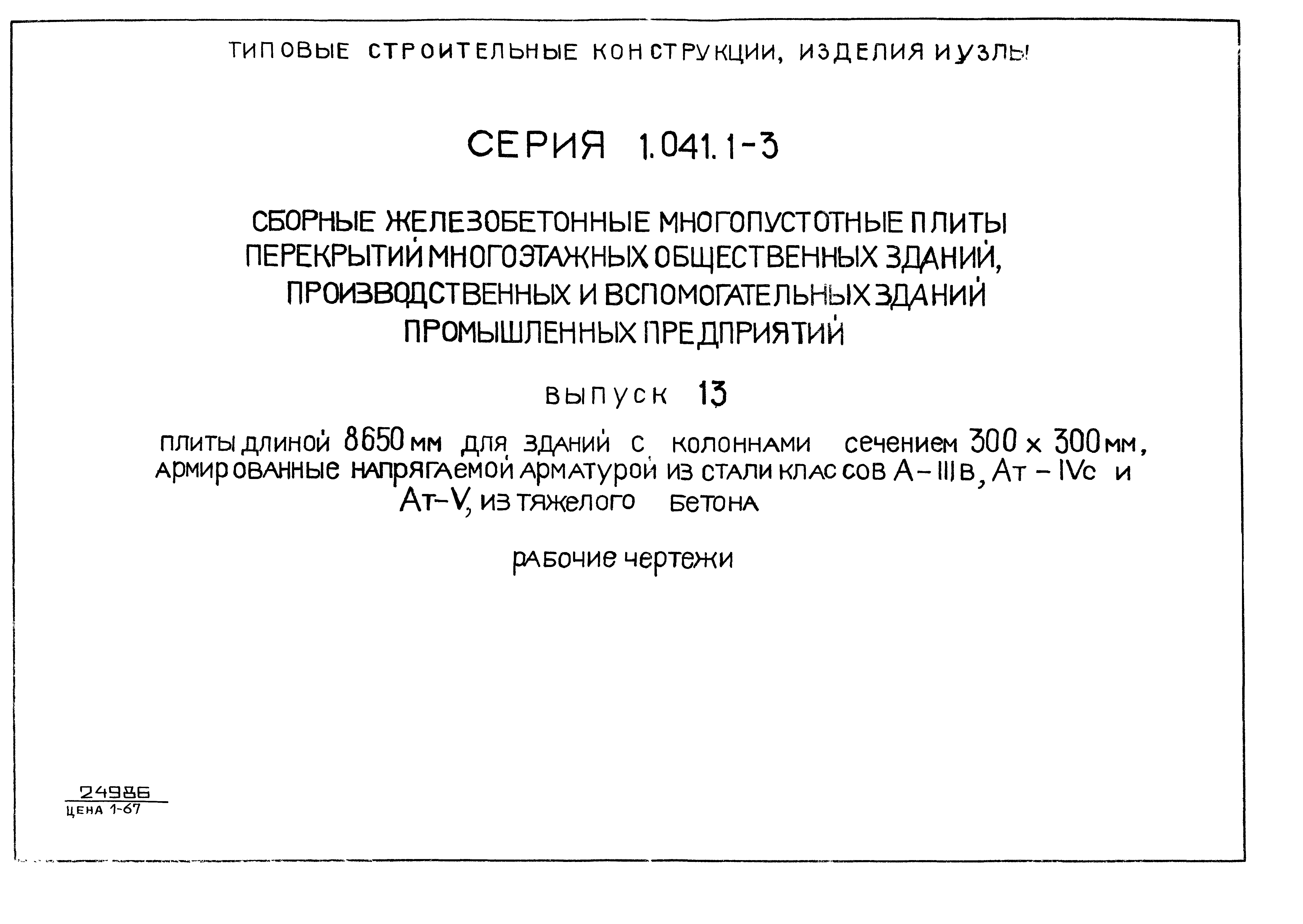 Скачать Серия 1.041.1-3 Выпуск 13. Плиты длиной 8650 мм для зданий с колоннами сечением 300х300 мм, армированные напрягаемой арматурой из стали классов А-IIIв, Ат-IVC и Ат-V, из тяжелого бетона. Рабочие чертежиДата актуализации: 01.01.2021