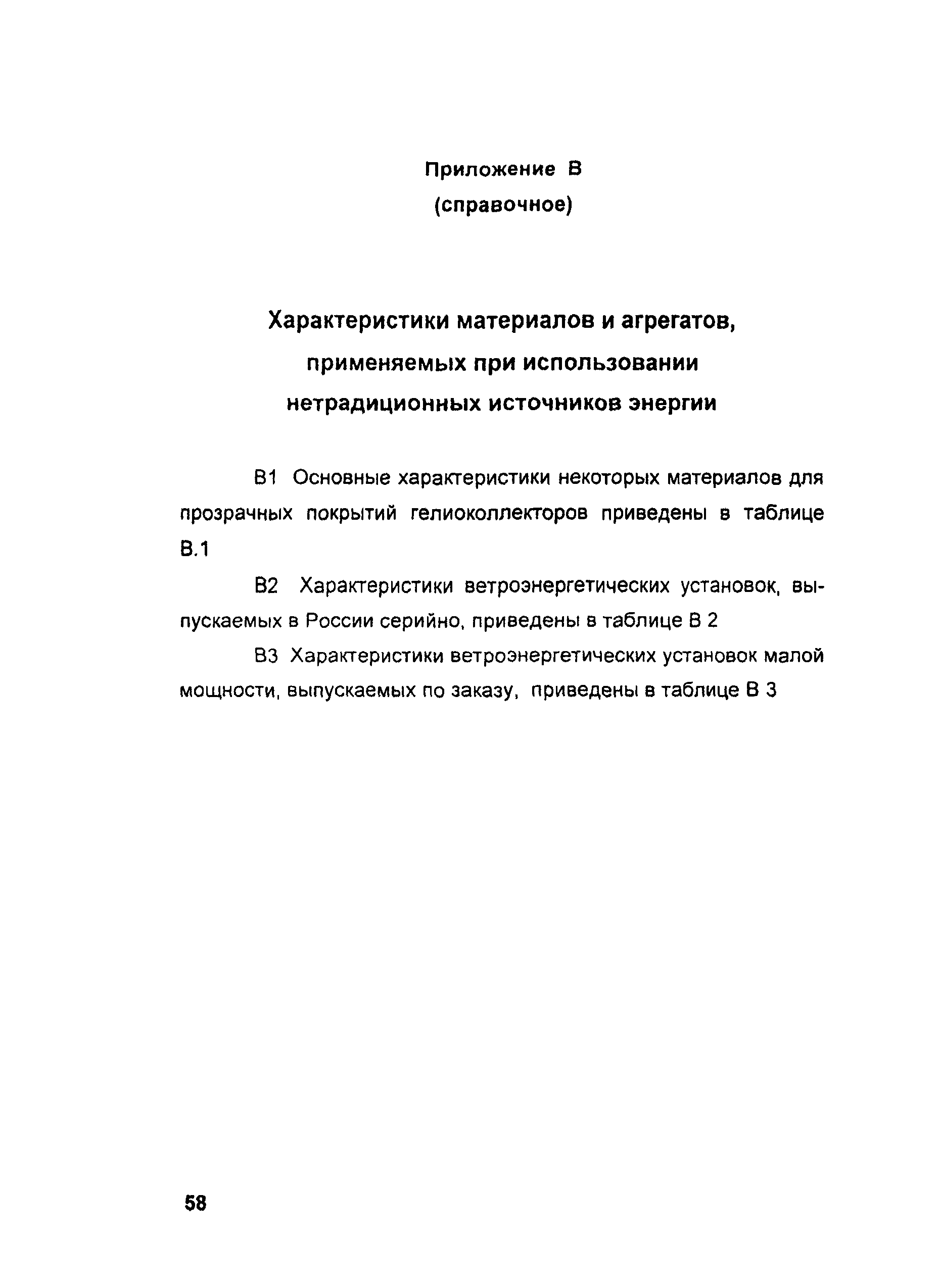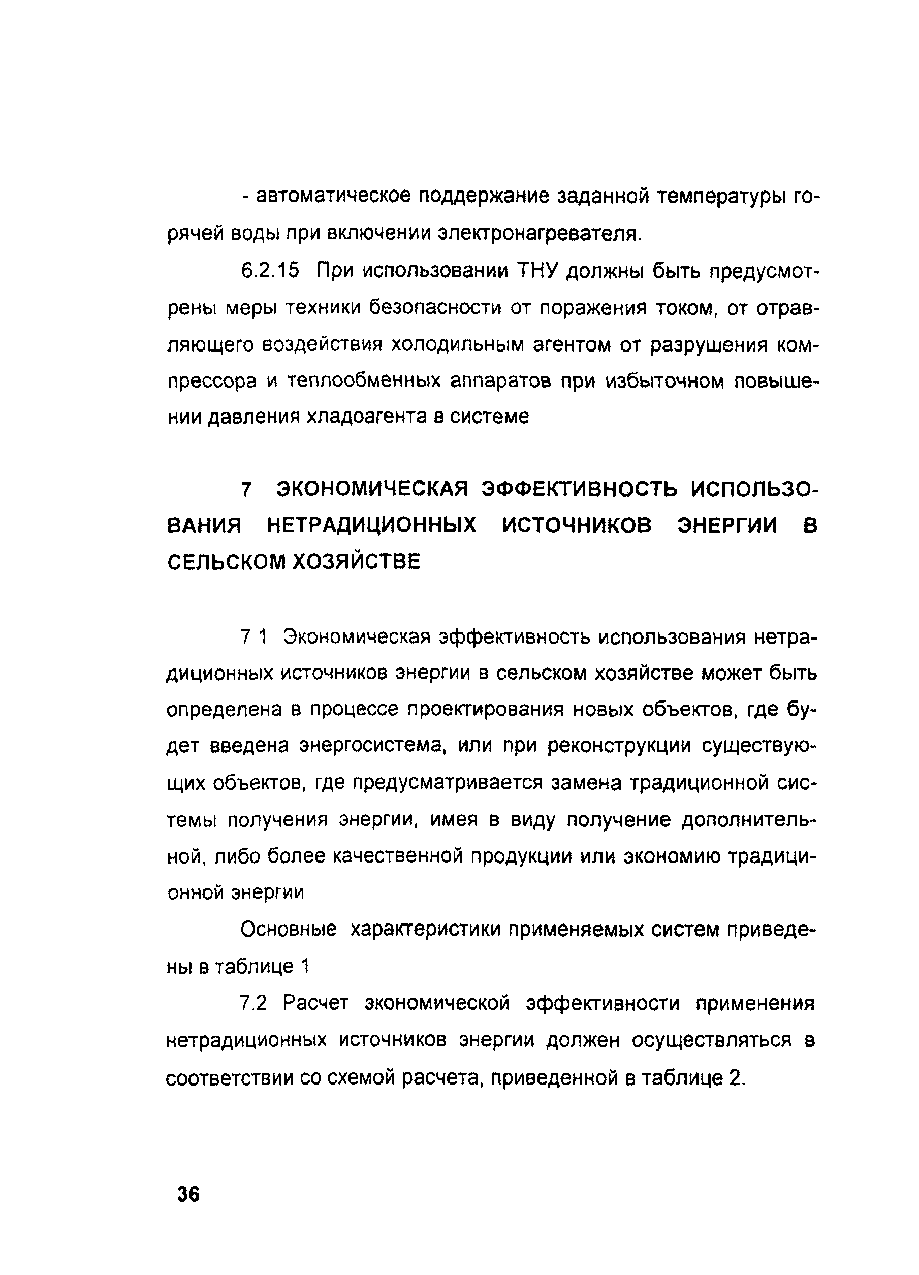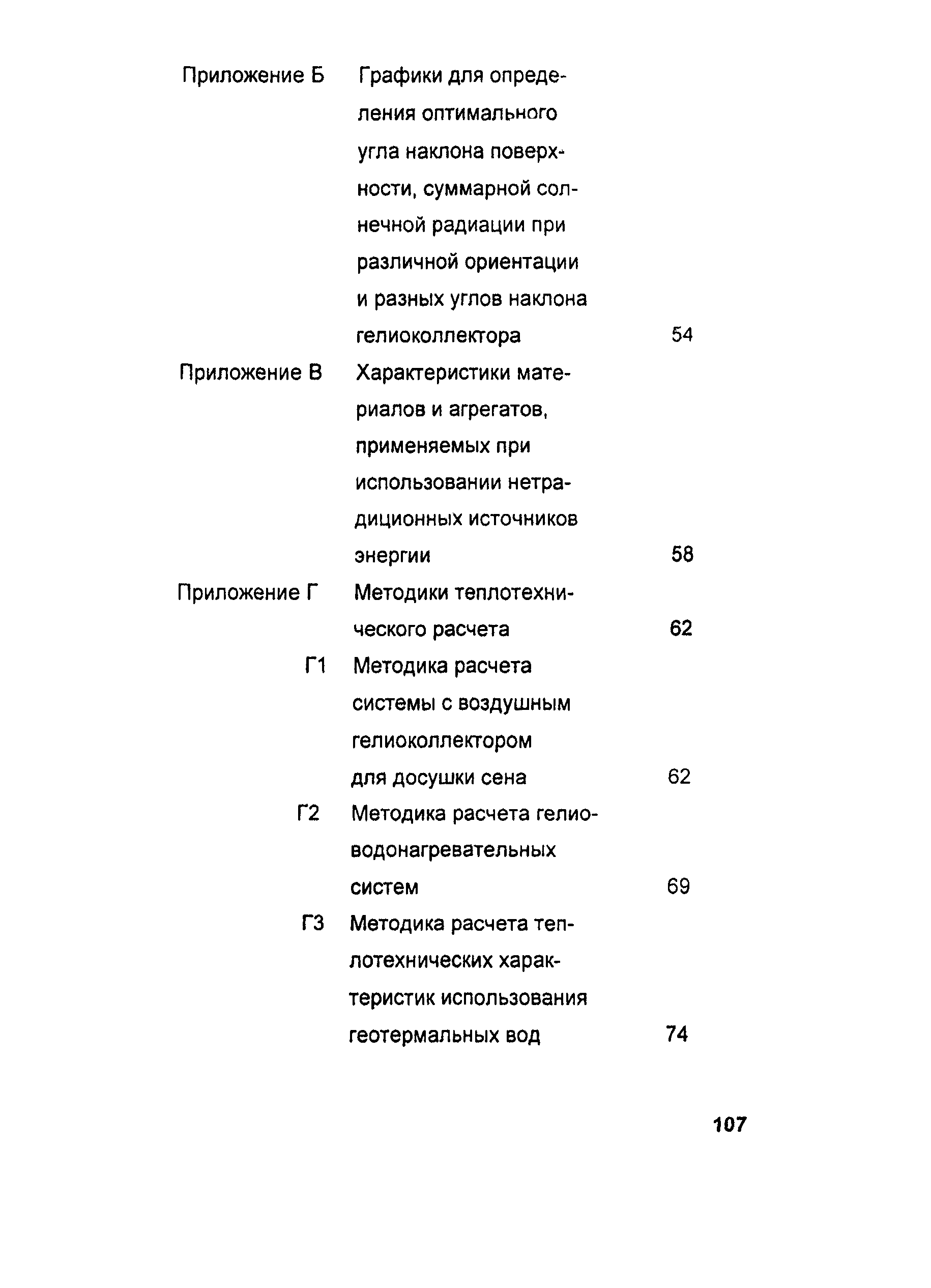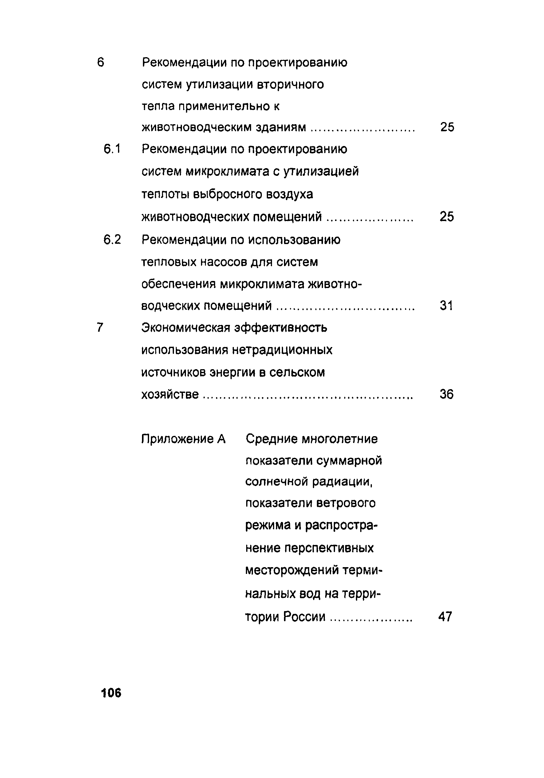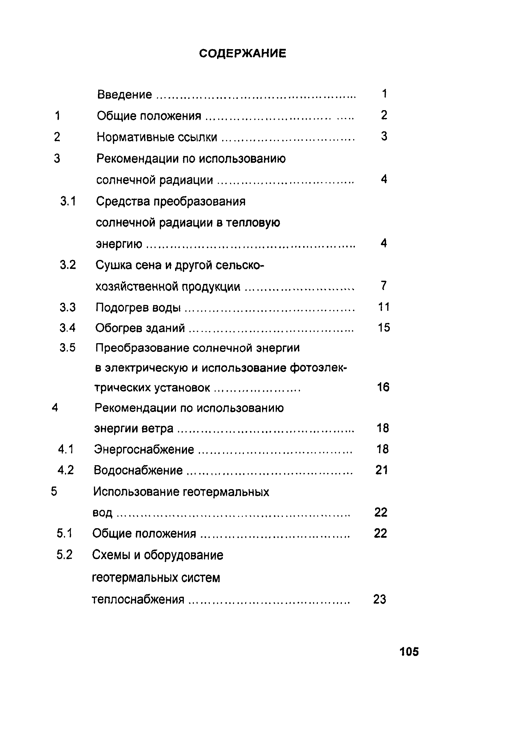 | Оглавление: | Введение 1 Общие положения 2 Нормативные ссылки 3 Рекомендации по использованию солнечной радиации 4 Рекомендации по использованию энергии ветра 5 Использование геотермальных вод 6 Рекомендации по проектированию систем утилизации вторичного тепла применительно к животноводческим зданиям 7 Экономическая эффективность использования нетрадиционных источников энергии в сельском хозяйстве Приложение А. Средние многолетние показатели суммарной солнечной радиации, показатели ветрового режима и распространение перспективных месторождений терминальных вод на территории России Приложение Б. Графики для определения оптимального угла наклона поверхности, суммарной солнечной радиации при различной ориентации и разных углов наклона гелиоколлектора Приложение В. Характеристики материалов и агрегатов, применяемых при использовании нетрадиционных источников энергии Приложение Г. Методики теплотехнического расчета Приложение Д. Технологические схемы использования нетрадиционных источников энергии Приложение Е. Форма расчета показателей экономической эффективности |