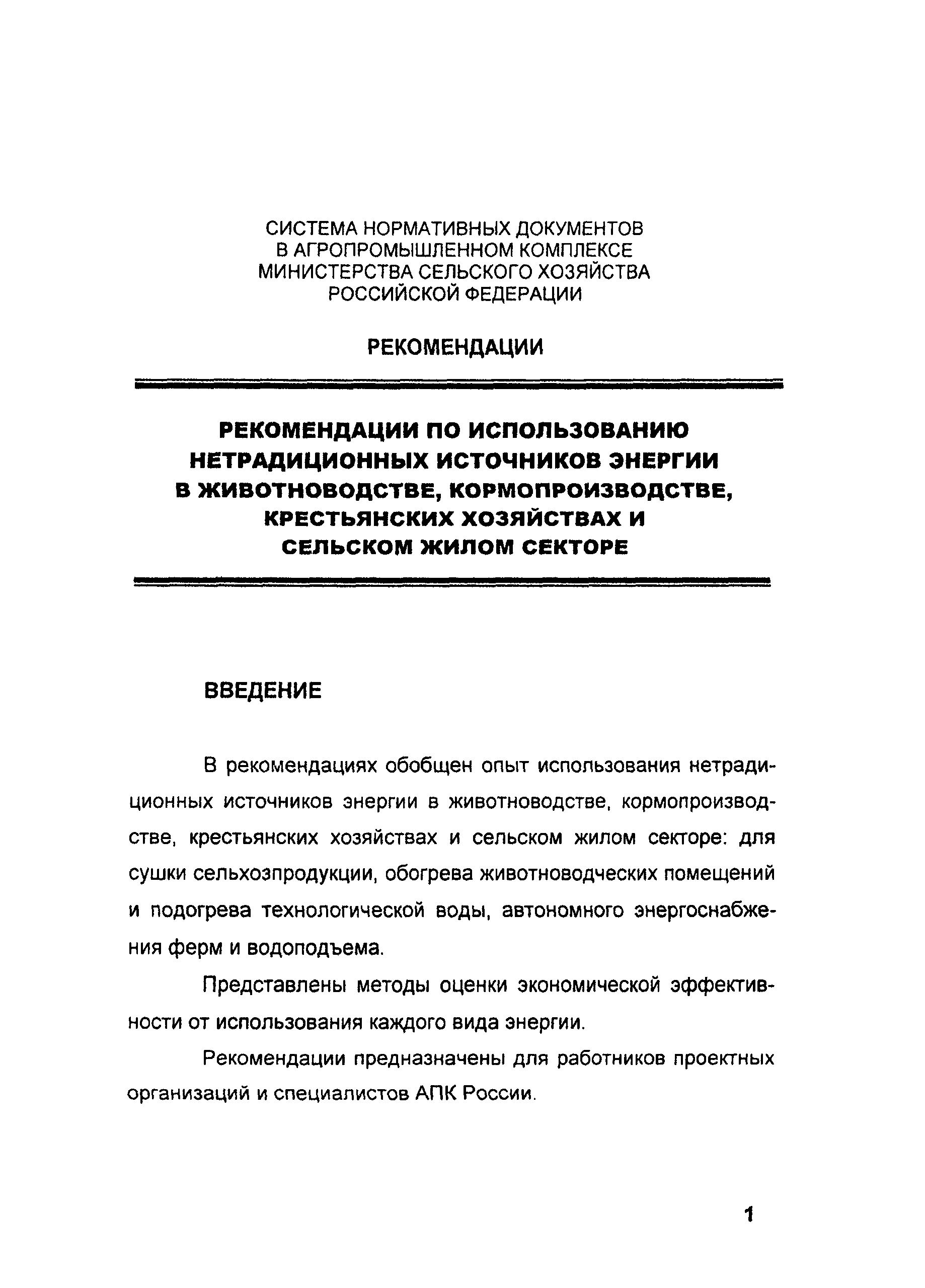 | Область применения: | Рекомендации предназначены для создания эффективных технических решений по применению нетрадиционных источников энергии в сельскохозяйственном производстве и сельском жилом фонде. |