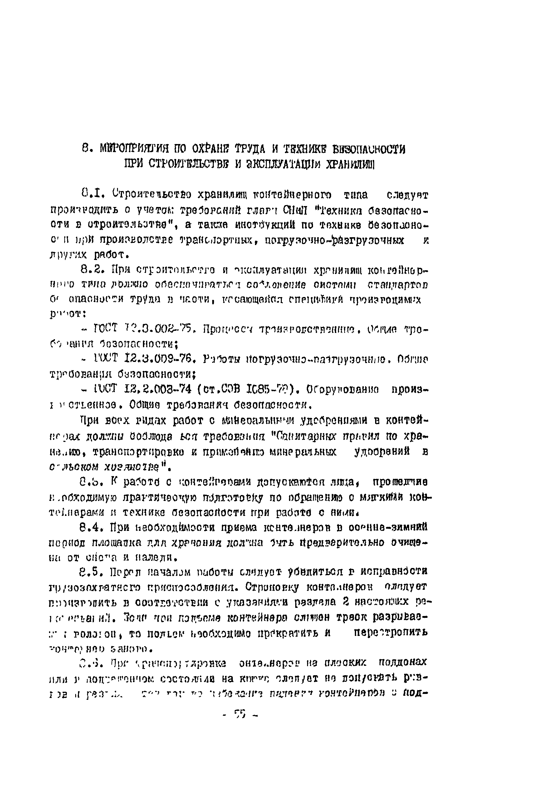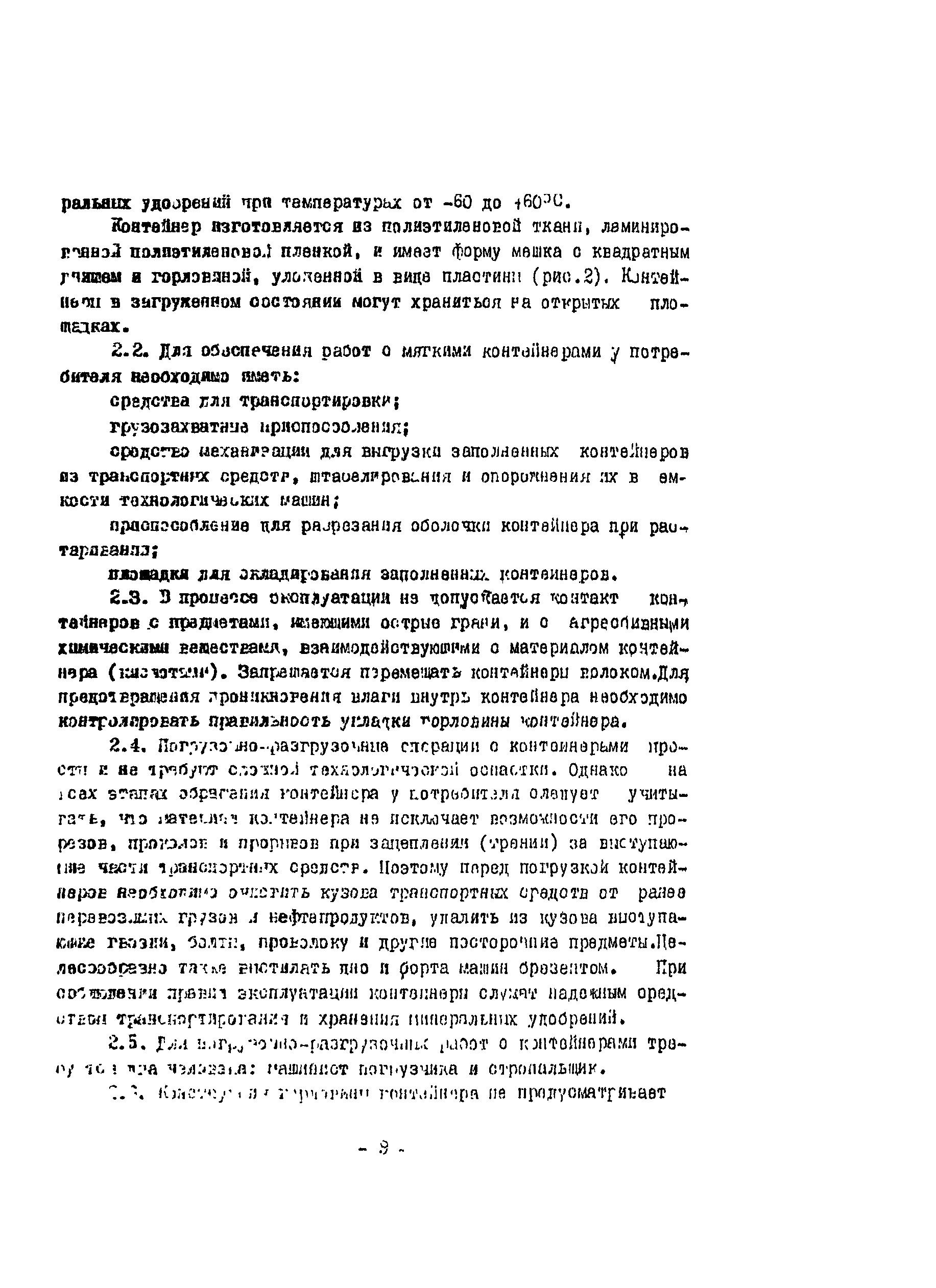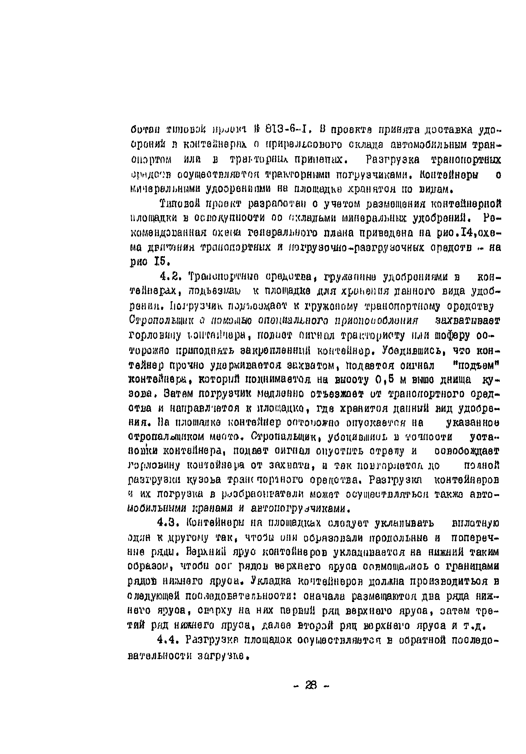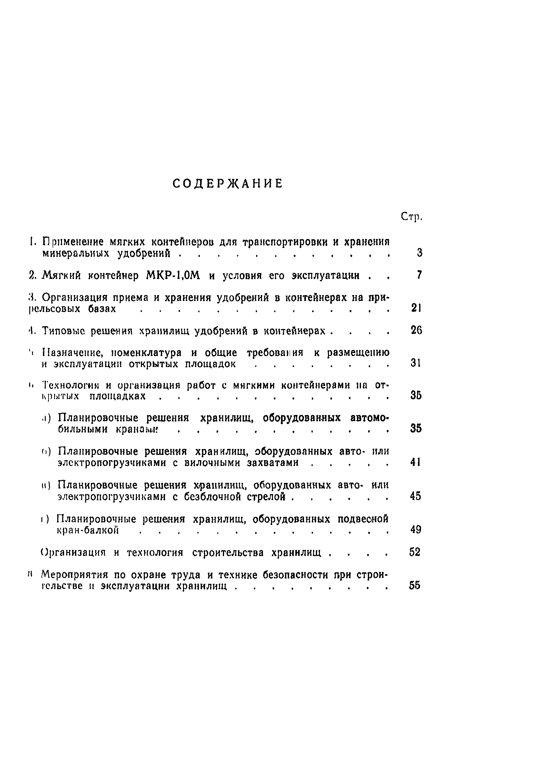 | Оглавление: | 1 Применение мягких контейнеров для транспортировки и хранения минеральных удобрений 2 Мягкий контейнер МКР-1,0М и условия его эксплуатации 3 Организация приема и хранения удобрений в контейнерах на прирельсовых базах 4 Типовые решения хранилищ удобрений в контейнерах 5 Назначение, номенклатура и общие требования к размещению и эксплуатации открытых площадок 6 Технология и организация работ с мягкими контейнерами на открытых площадках 7 Организация и технология строительства хранилищ 8 Мероприятия по охране труда и технике безопасности при строительстве и эксплуатации хранилищ |