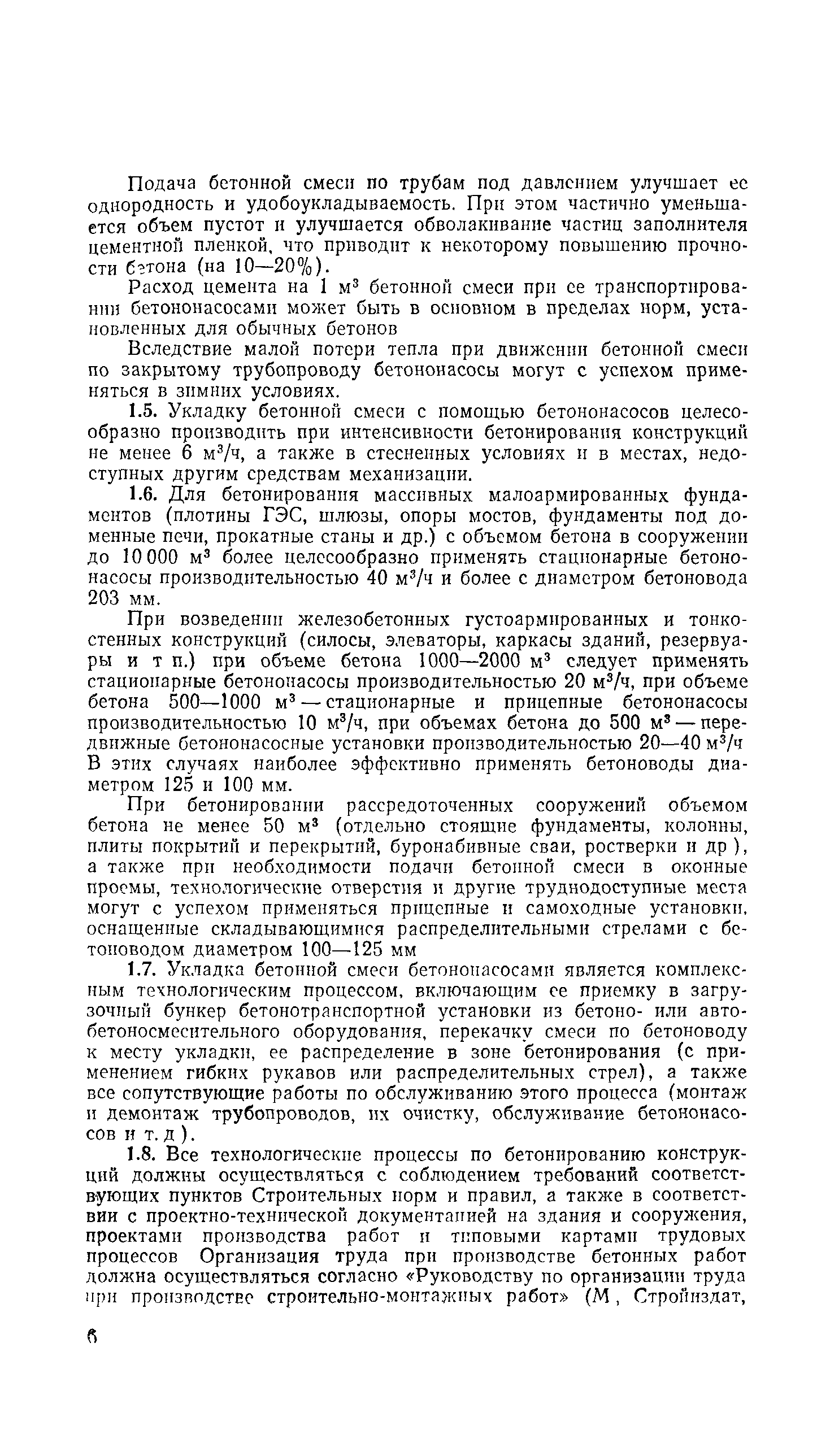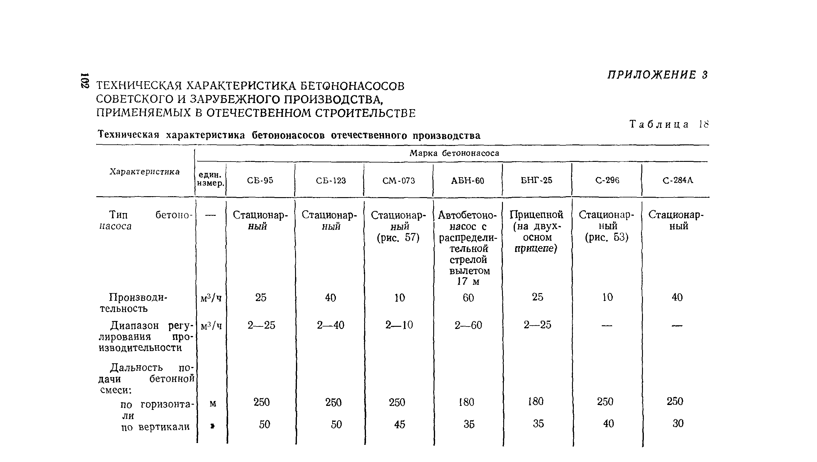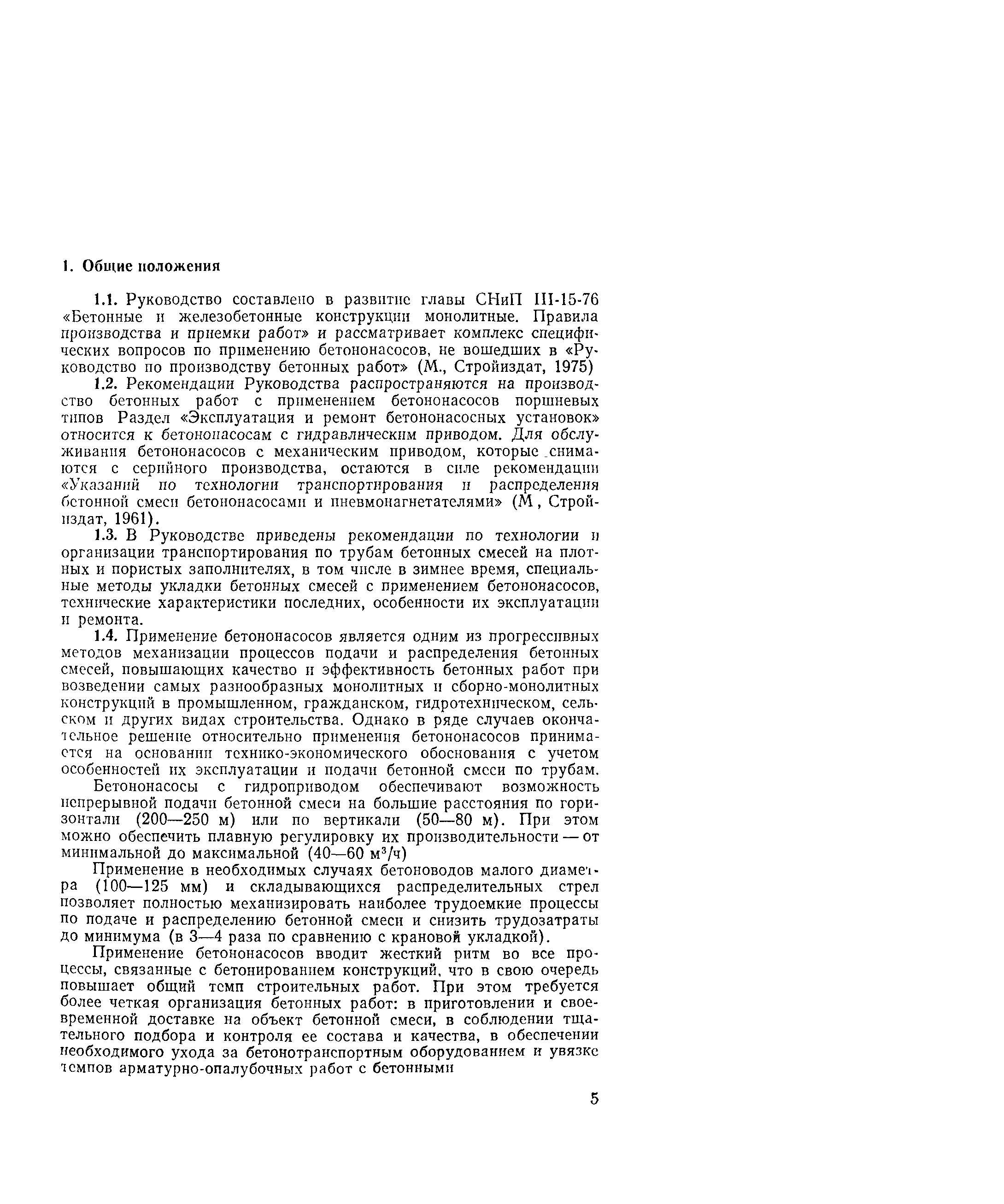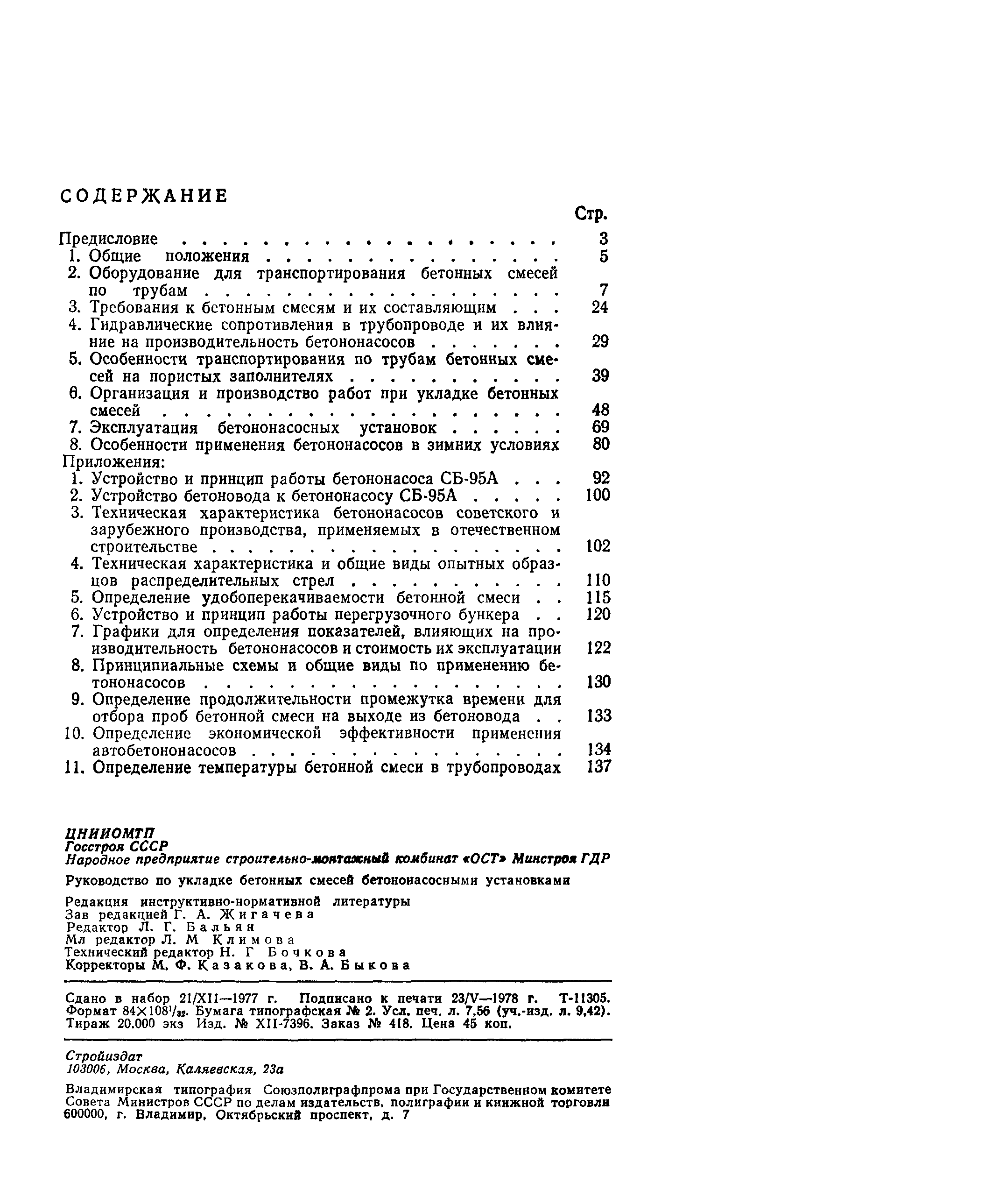 | Оглавление: | Предисловие 1 Общие положения 2 Оборудование для транспортирования бетонных смесей по трубам 3 Требования к бетонным смесям и их составляющим 4 Гидравлические сопротивления в трубопроводе и их влияние на производительность бетононасосов 5 Особенности транспортирования по трубам бетонных смесей на пористых заполнителях 6 Организация и производство работ при укладке бетонных смесей 7 Эксплуатация бетононасосных установок 8 Особенности применения бетононасосов в зимних условиях Приложения: 1 Устройство и принцип работы бетононасоса СБ-95А 2 Устройство бетоновода к бетононасосу СБ-95А 3 Техническая характеристика бетононасосов советского и зарубежного производства, применяемых в отечественном строительстве 4 Техническая характеристика и общие виды опытных образцов распределительных стрел 5 Определение удобоперекачиваемости бетонной смеси 6 Устройство и принцип работы перегрузочного бункера 7 Графики для определения показателей, влияющих на производительность бетононасосов и стоимость их эксплуатации 8 Принципиальные схемы и общие виды по применению бетононасосов 9 Определение продолжительности промежутка времени для отбора проб бетонной смеси на выходе из бетоновода 10 Определение экономической эффективности применения автобетононасосов 11 Определение температуры бетонной смеси в трубопроводах |