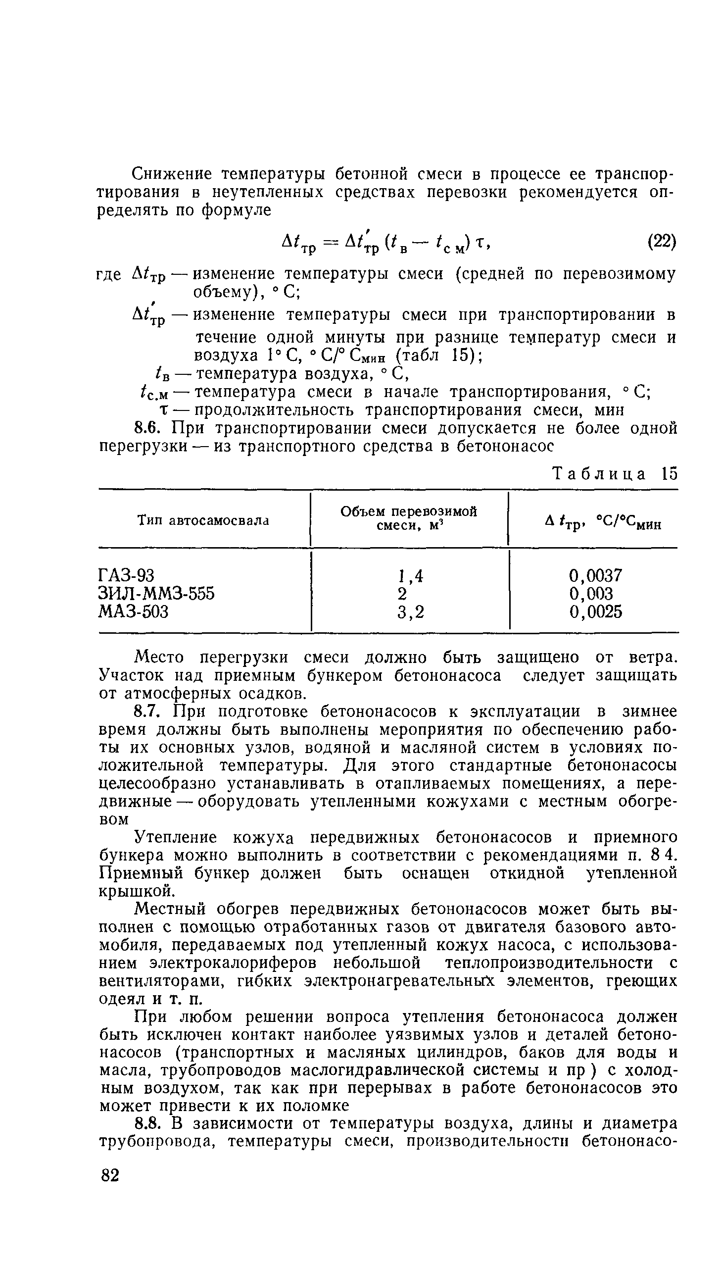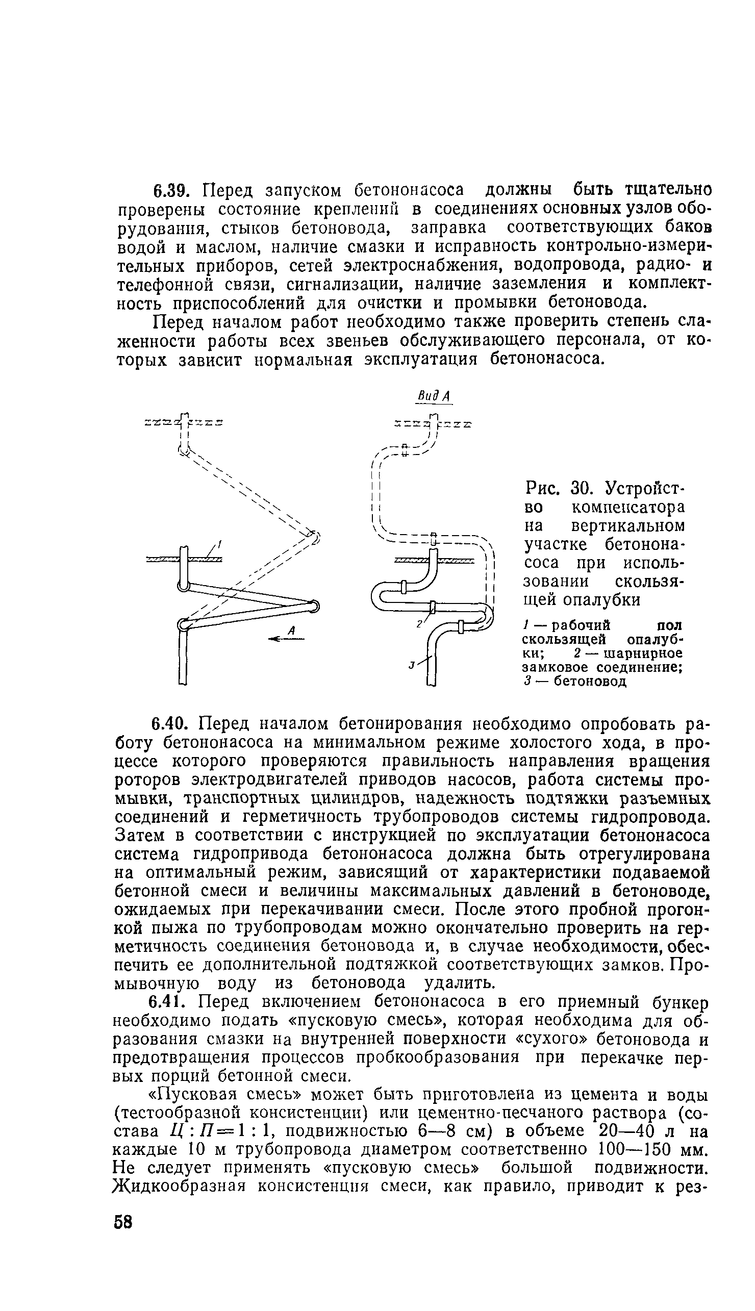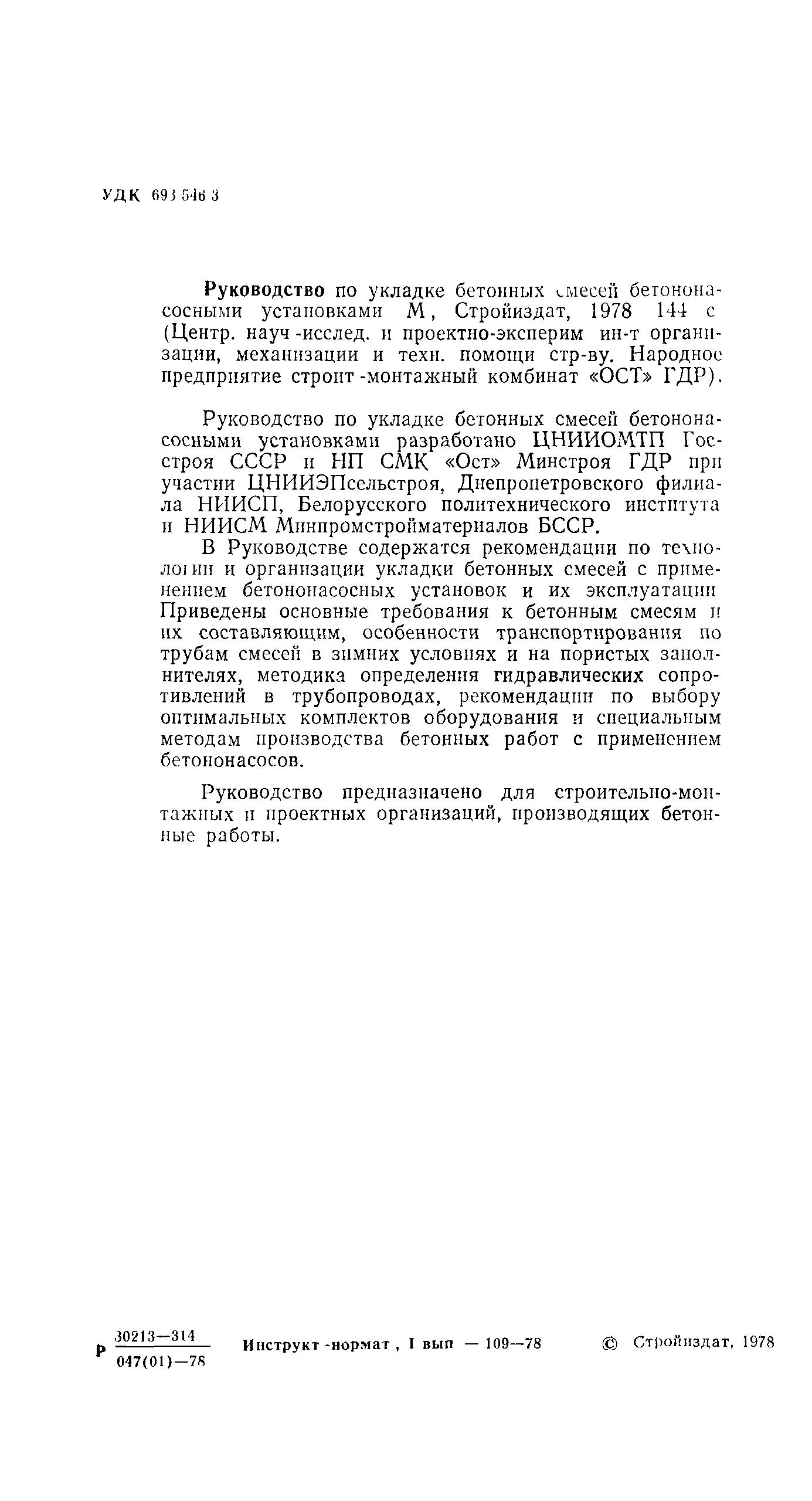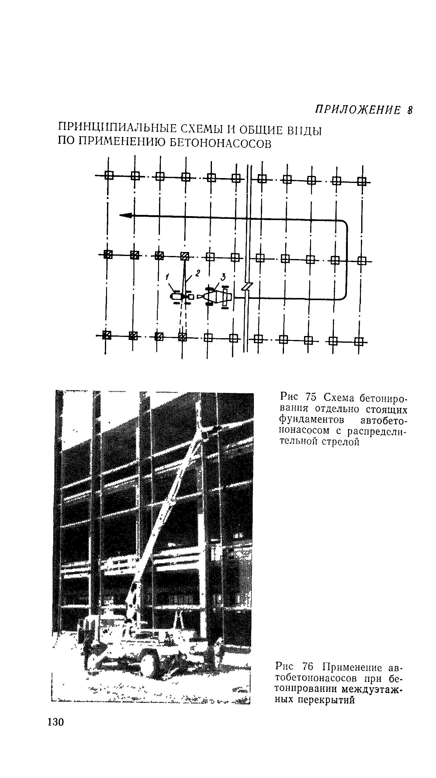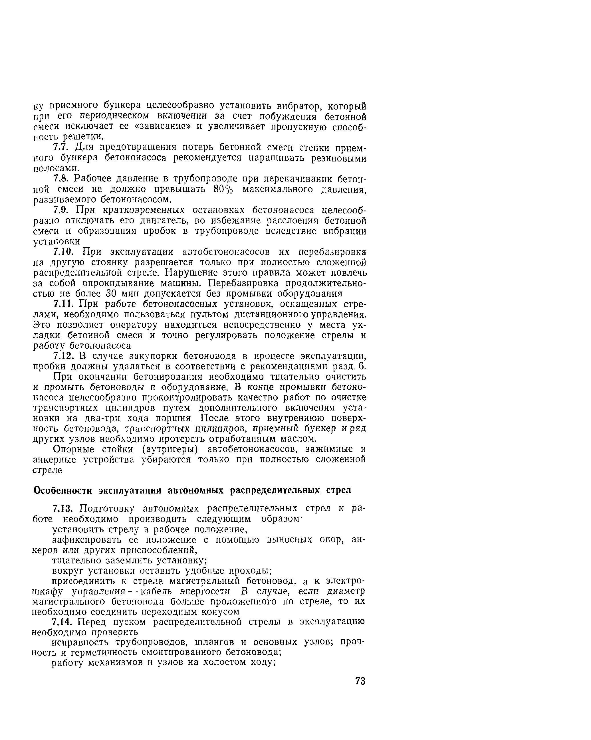 | Оглавление: | Предисловие 1 Общие положения 2 Оборудование для транспортирования бетонных смесей по трубам 3 Требования к бетонным смесям и их составляющим 4 Гидравлические сопротивления в трубопроводе и их влияние на производительность бетононасосов 5 Особенности транспортирования по трубам бетонных смесей на пористых заполнителях 6 Организация и производство работ при укладке бетонных смесей 7 Эксплуатация бетононасосных установок 8 Особенности применения бетононасосов в зимних условиях Приложения: 1 Устройство и принцип работы бетононасоса СБ-95А 2 Устройство бетоновода к бетононасосу СБ-95А 3 Техническая характеристика бетононасосов советского и зарубежного производства, применяемых в отечественном строительстве 4 Техническая характеристика и общие виды опытных образцов распределительных стрел 5 Определение удобоперекачиваемости бетонной смеси 6 Устройство и принцип работы перегрузочного бункера 7 Графики для определения показателей, влияющих на производительность бетононасосов и стоимость их эксплуатации 8 Принципиальные схемы и общие виды по применению бетононасосов 9 Определение продолжительности промежутка времени для отбора проб бетонной смеси на выходе из бетоновода 10 Определение экономической эффективности применения автобетононасосов 11 Определение температуры бетонной смеси в трубопроводах |