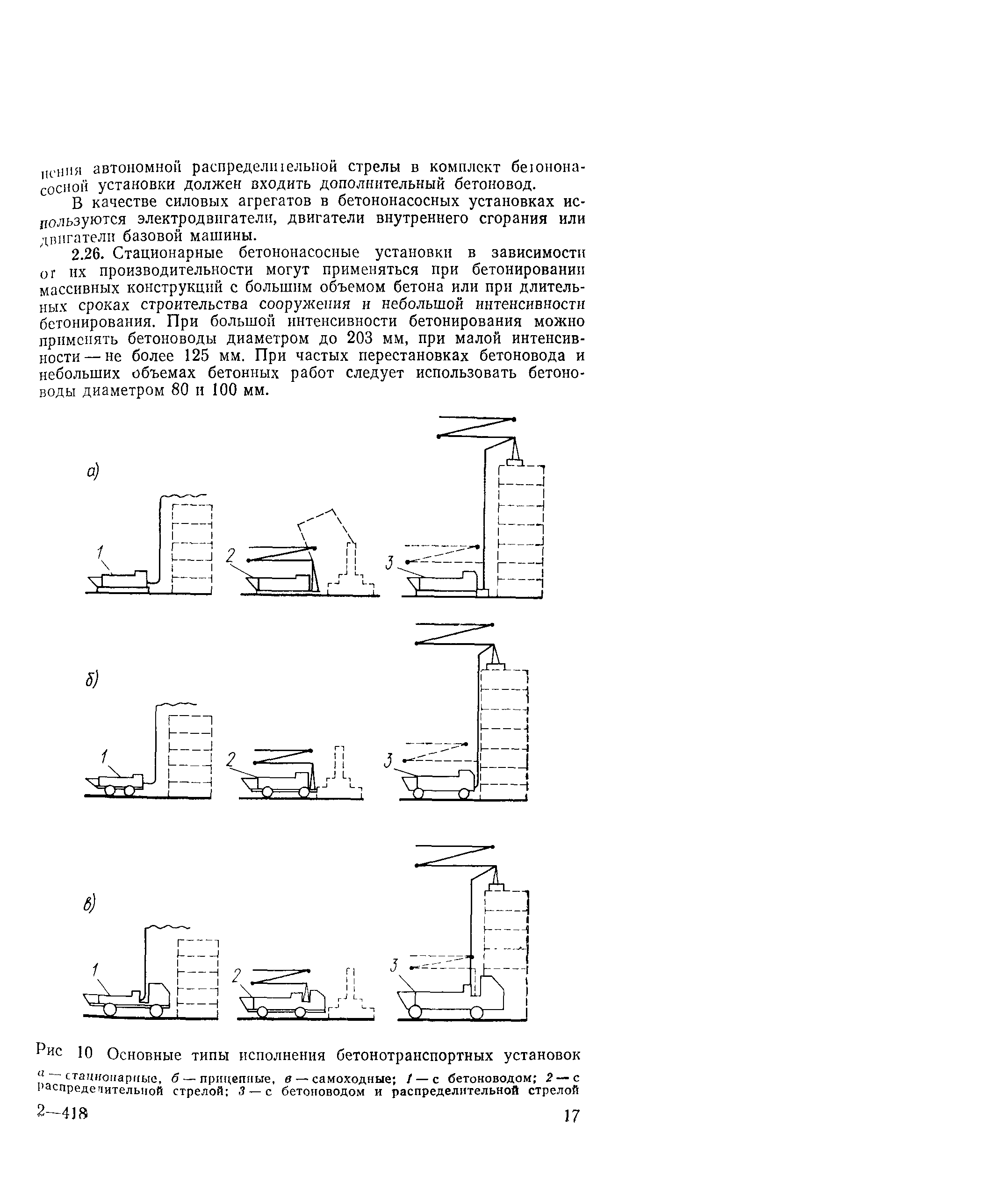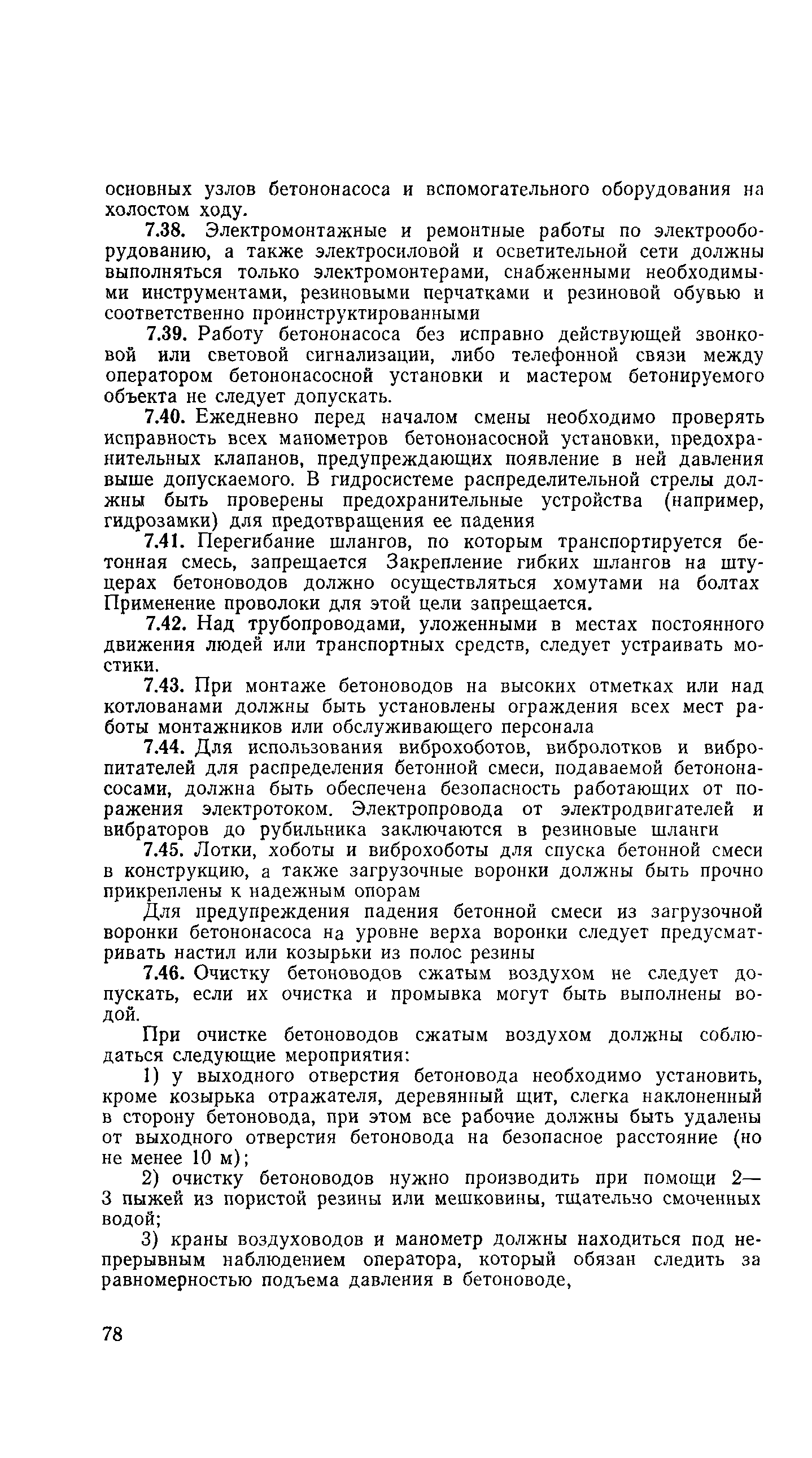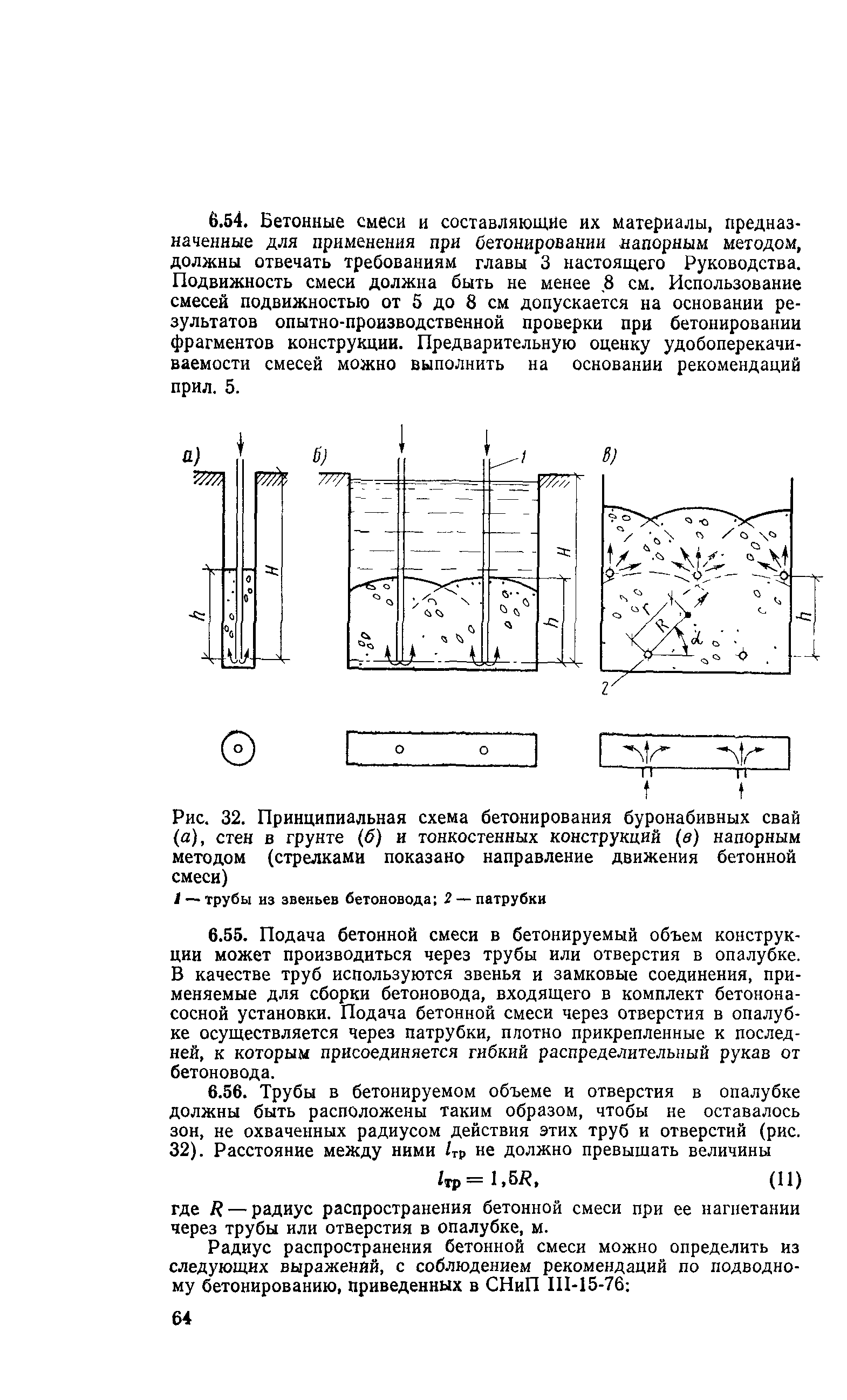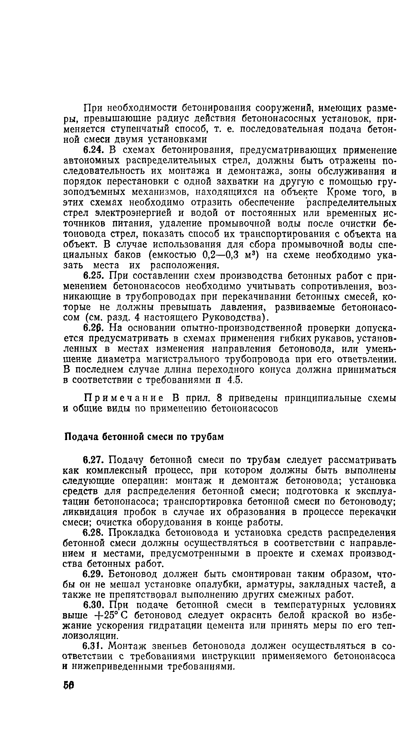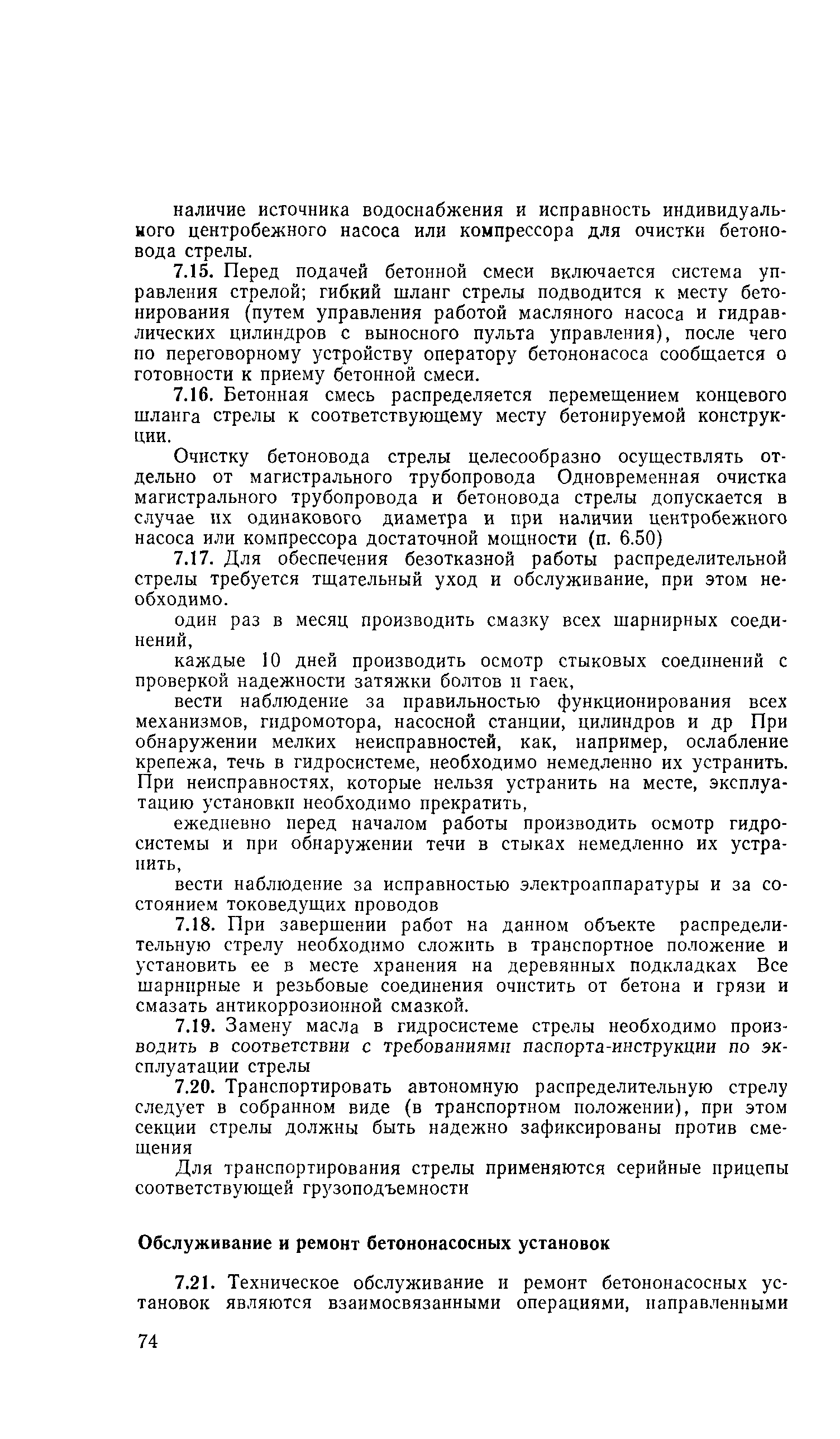 | Оглавление: | Предисловие 1 Общие положения 2 Оборудование для транспортирования бетонных смесей по трубам 3 Требования к бетонным смесям и их составляющим 4 Гидравлические сопротивления в трубопроводе и их влияние на производительность бетононасосов 5 Особенности транспортирования по трубам бетонных смесей на пористых заполнителях 6 Организация и производство работ при укладке бетонных смесей 7 Эксплуатация бетононасосных установок 8 Особенности применения бетононасосов в зимних условиях Приложения: 1 Устройство и принцип работы бетононасоса СБ-95А 2 Устройство бетоновода к бетононасосу СБ-95А 3 Техническая характеристика бетононасосов советского и зарубежного производства, применяемых в отечественном строительстве 4 Техническая характеристика и общие виды опытных образцов распределительных стрел 5 Определение удобоперекачиваемости бетонной смеси 6 Устройство и принцип работы перегрузочного бункера 7 Графики для определения показателей, влияющих на производительность бетононасосов и стоимость их эксплуатации 8 Принципиальные схемы и общие виды по применению бетононасосов 9 Определение продолжительности промежутка времени для отбора проб бетонной смеси на выходе из бетоновода 10 Определение экономической эффективности применения автобетононасосов 11 Определение температуры бетонной смеси в трубопроводах |