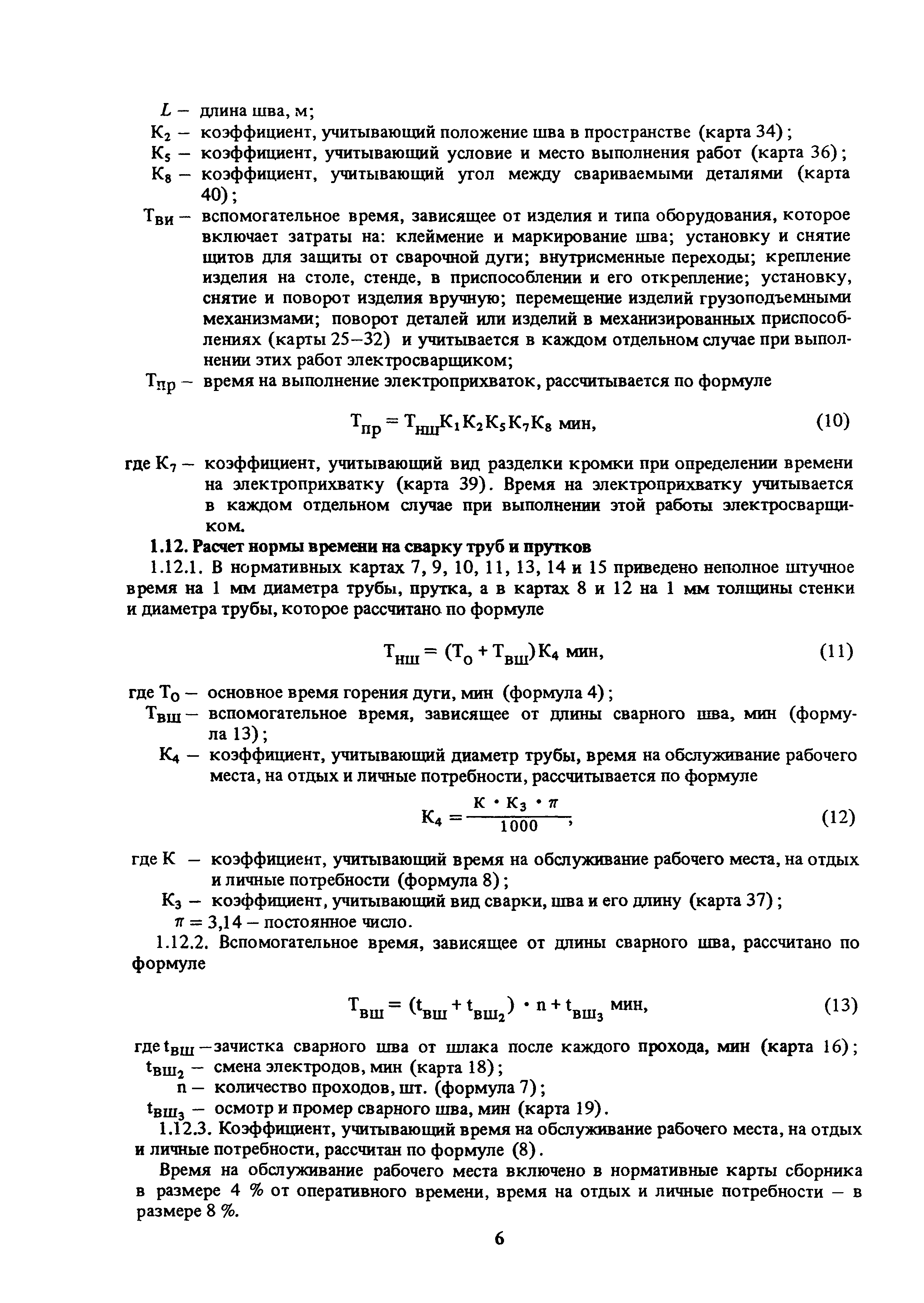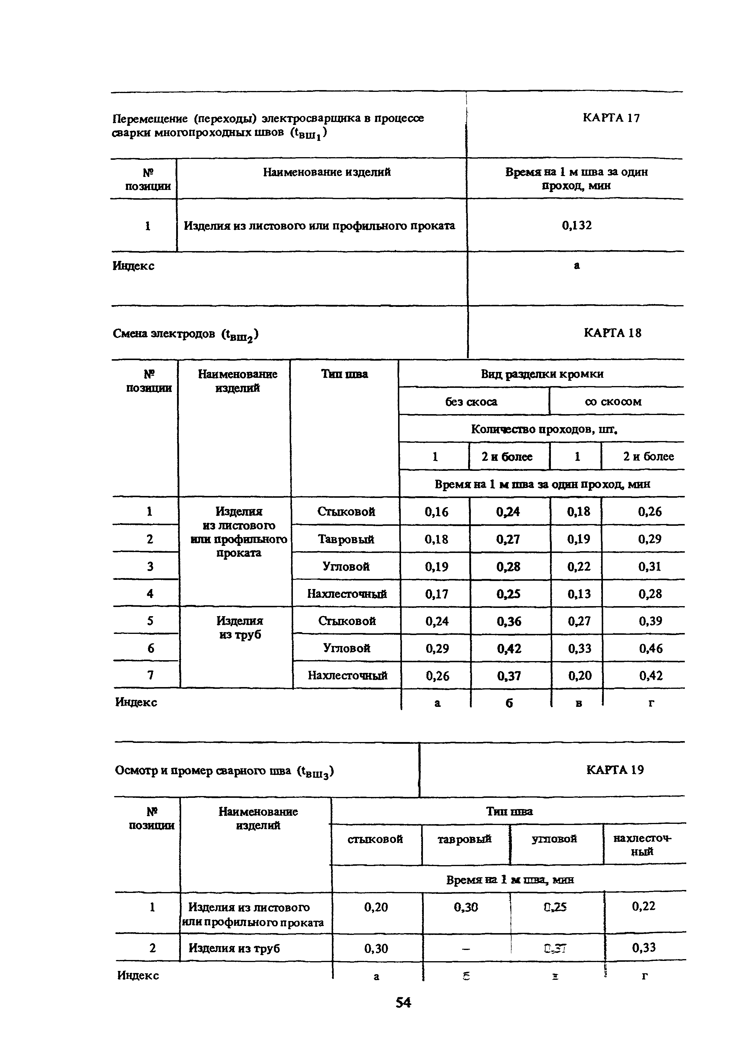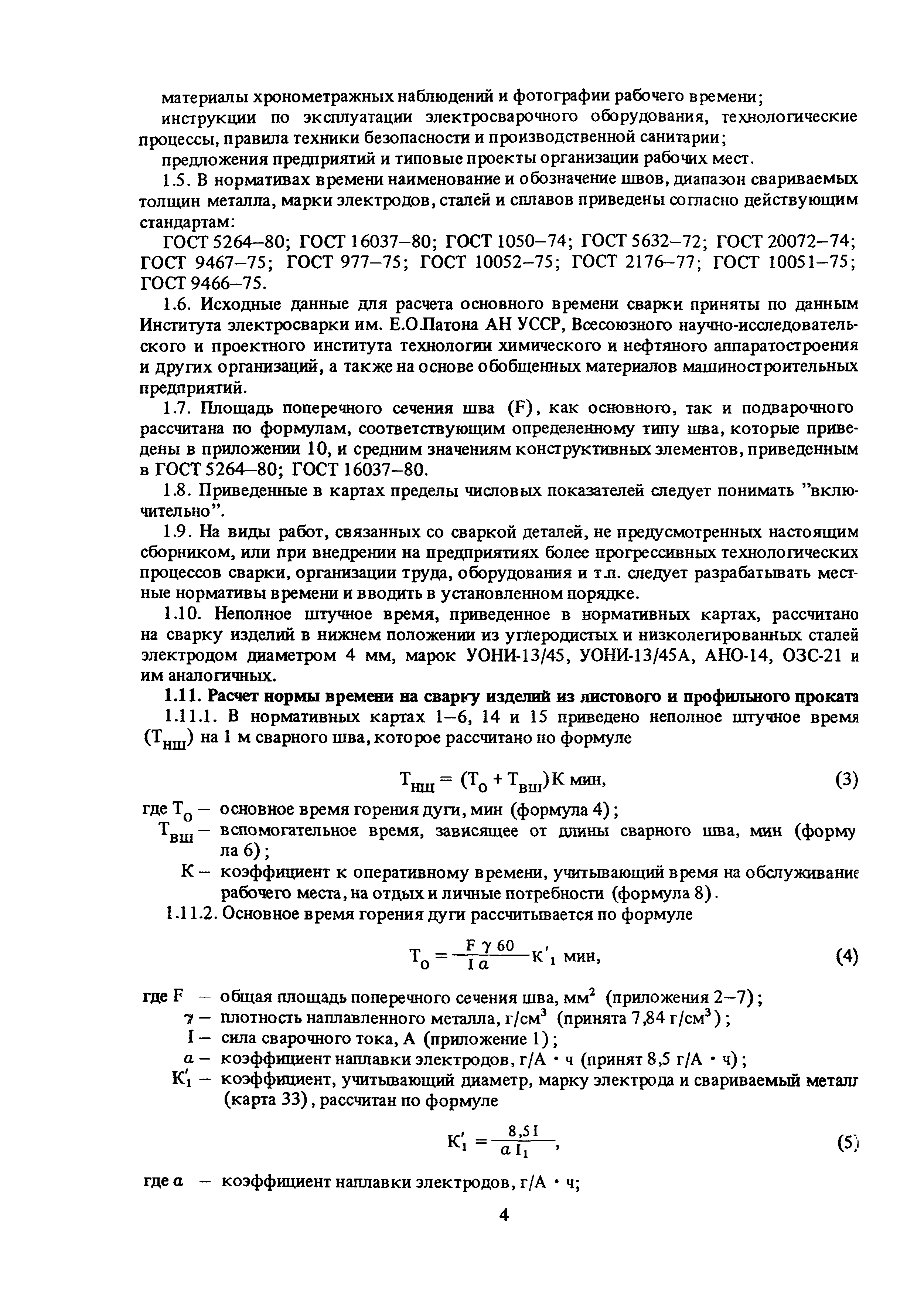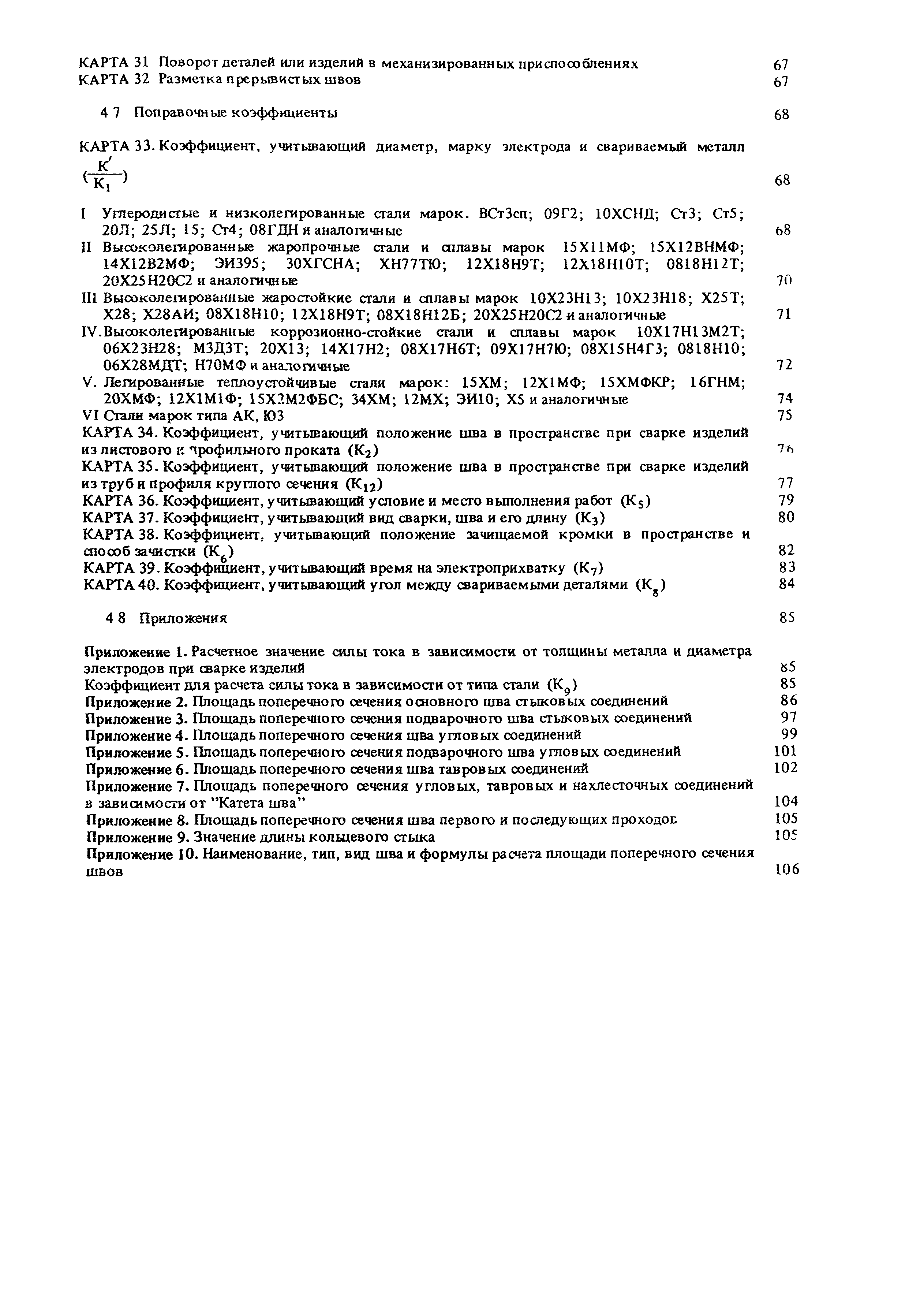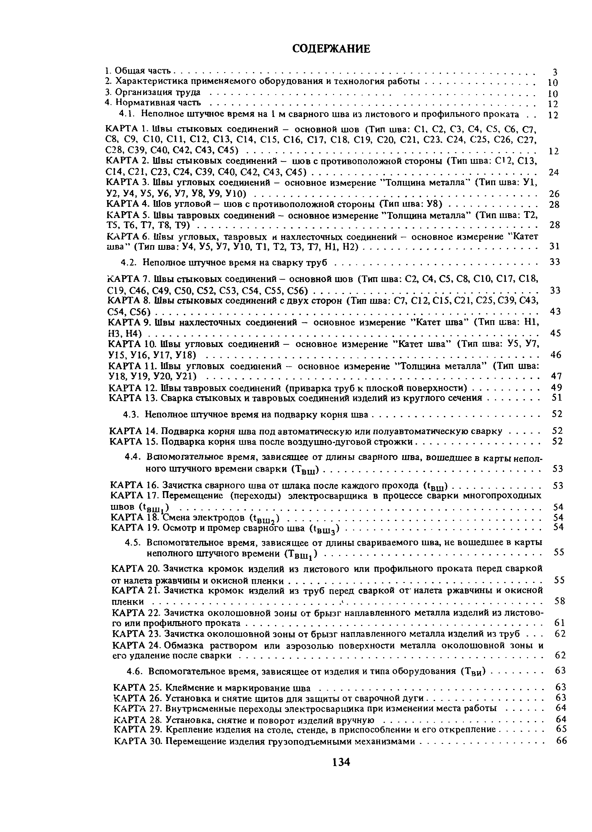 | Оглавление: | 1. Общая часть 2. Характеристика применяемого оборудования и технология работы 3. Организация труда 4. Нормативная часть 4.1. Неполное штучное время на 1 м сварного шва из листового и профильного проката 4.2. Неполное штучное время на сварку труб 4.3. Неполное штучное время на подварку корня шва 4.4. Вспомогательное время, зависящее от длины сварного шва, вошедшее в карты неполного штучного времени сварки (Твш) 4.5. Вспомогательное время, зависящее от длины свариваемого шва, не вошедшее в карты неполного штучного времени (Твш1) 4.6. Вспомогательное время, зависящее от изделия и типа обрудования (Тви) 4.7. Поправочные коэффициенты 4.8. Приложения Приложения 1. Расчетное значение силы тока в зависимости от толщины металла и диаметра электродов при сварке изделий Приложение 2. Площадь поперечного сечения основного шва стыковых соединений Приложение 3. Площадь поперечного сечения подварочного шва стыковых соединений Приложение 4. Площадь поперечного сечения шва угловых соединений Приложение 5. Площадь поперечного сечения подварочного шва угловых соединений Приложение 6. Площадь поперечного сечения шва тавровых соединений Приложение 7. Площадь поперечного сечения угловых, тавровых и нахлесточных соединений в зависимости от "Катета шва" Приложение 8. Площадь поперечного сечения шва первого и последующих проходов Приложение 9. Значение длины кольцевого стыка Приложение 10. Наименование, тип, вид шва и формулы расчета площади поперечного сечения швов |