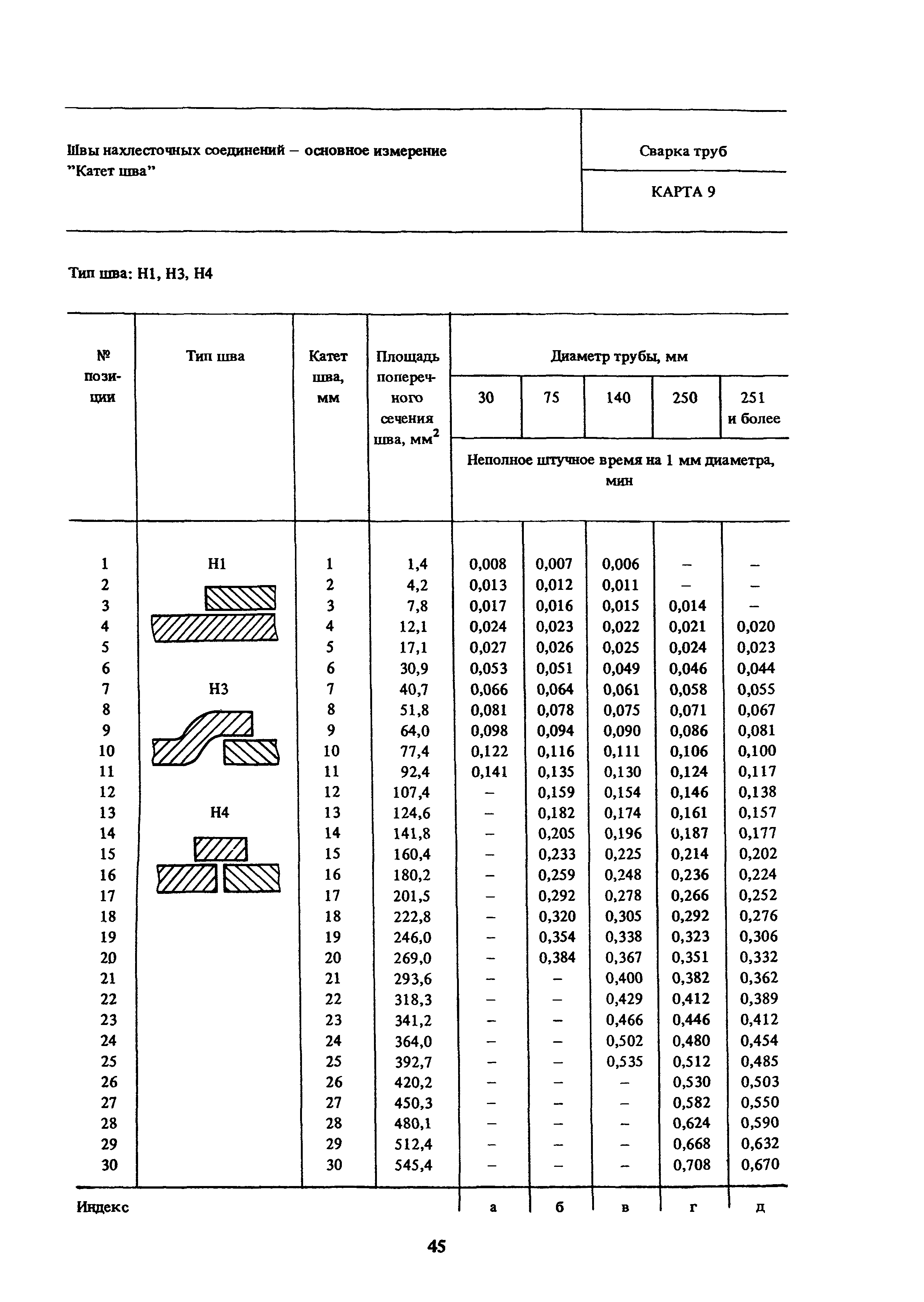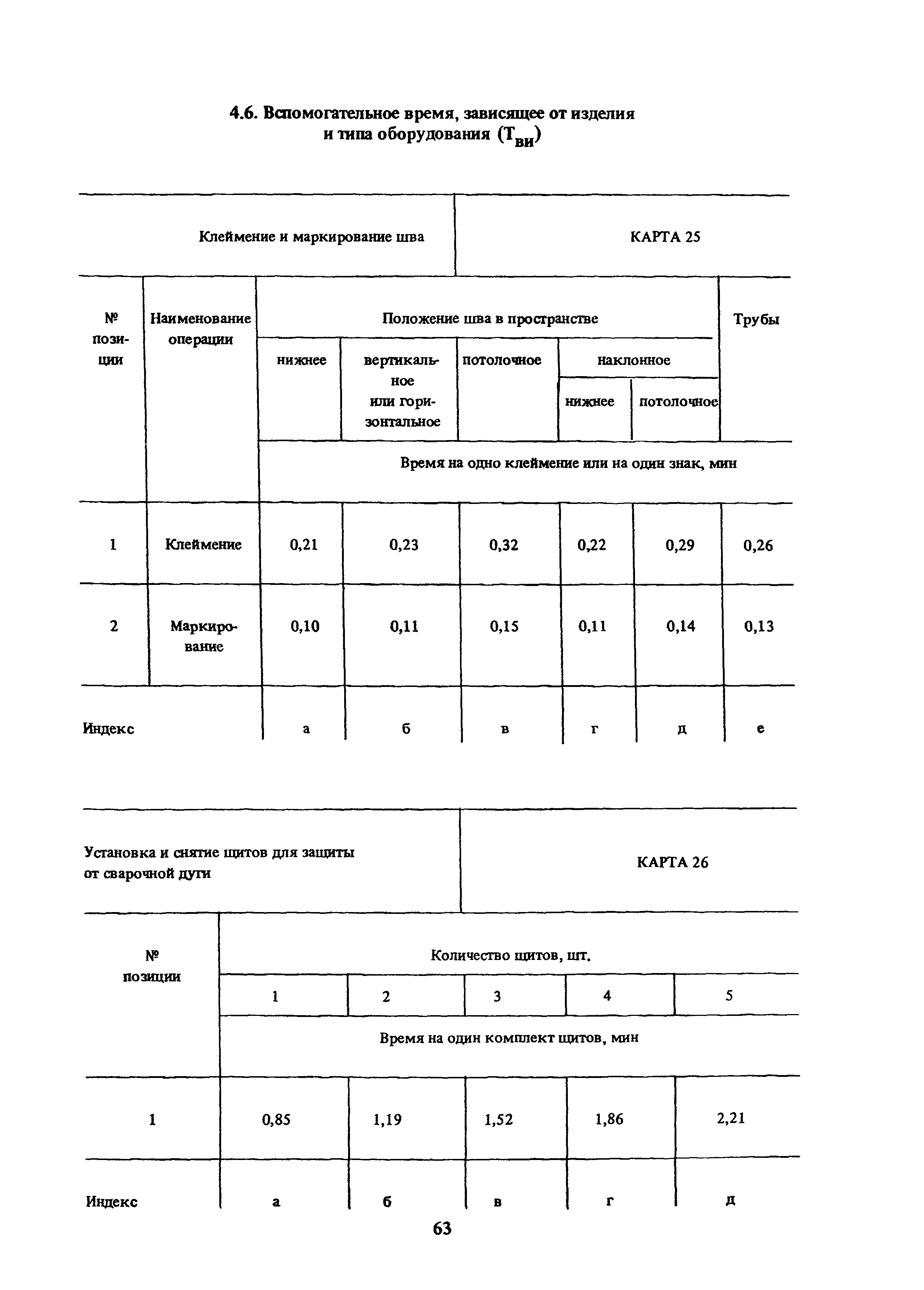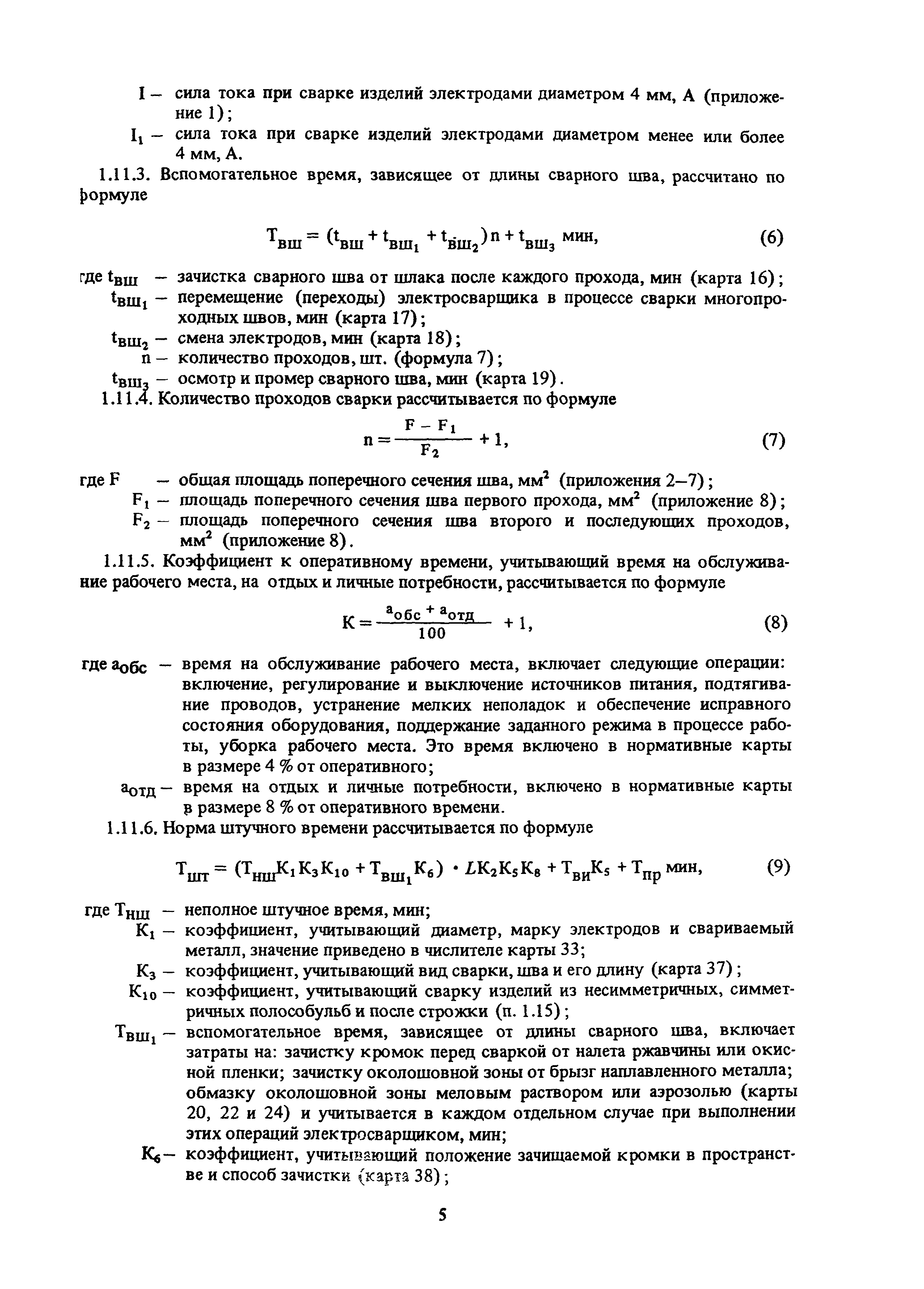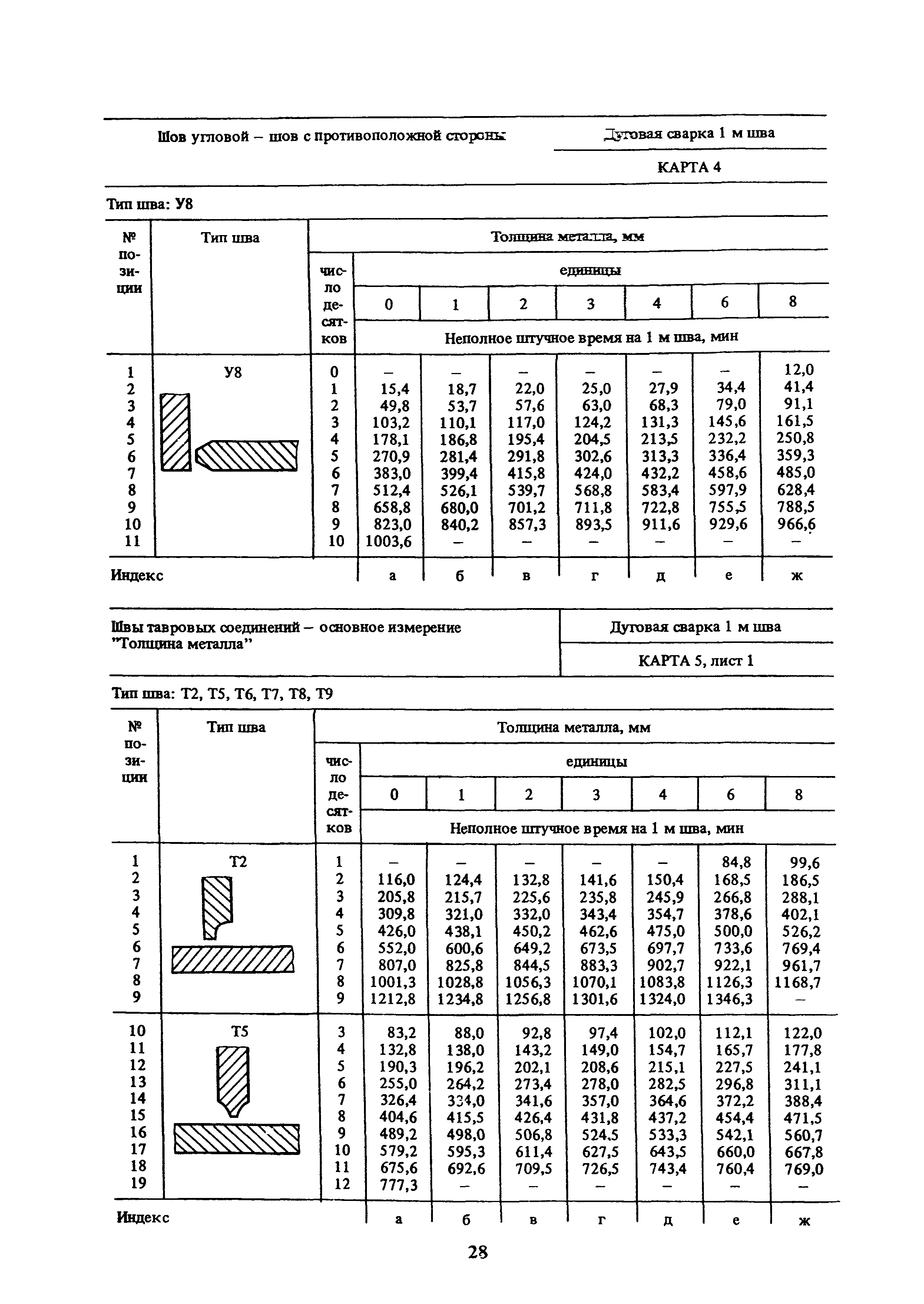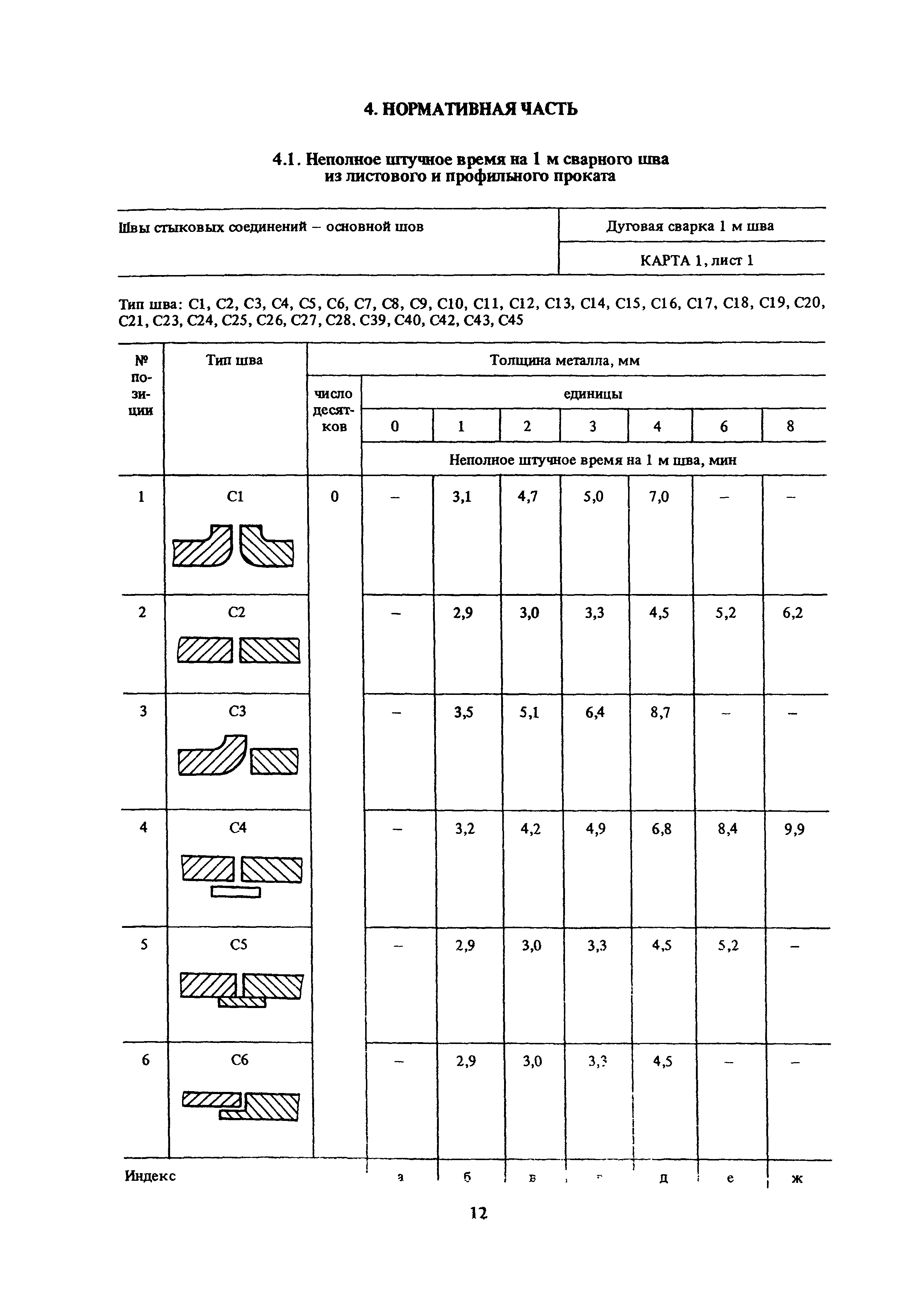 | Оглавление: | 1. Общая часть 2. Характеристика применяемого оборудования и технология работы 3. Организация труда 4. Нормативная часть 4.1. Неполное штучное время на 1 м сварного шва из листового и профильного проката 4.2. Неполное штучное время на сварку труб 4.3. Неполное штучное время на подварку корня шва 4.4. Вспомогательное время, зависящее от длины сварного шва, вошедшее в карты неполного штучного времени сварки (Твш) 4.5. Вспомогательное время, зависящее от длины свариваемого шва, не вошедшее в карты неполного штучного времени (Твш1) 4.6. Вспомогательное время, зависящее от изделия и типа обрудования (Тви) 4.7. Поправочные коэффициенты 4.8. Приложения Приложения 1. Расчетное значение силы тока в зависимости от толщины металла и диаметра электродов при сварке изделий Приложение 2. Площадь поперечного сечения основного шва стыковых соединений Приложение 3. Площадь поперечного сечения подварочного шва стыковых соединений Приложение 4. Площадь поперечного сечения шва угловых соединений Приложение 5. Площадь поперечного сечения подварочного шва угловых соединений Приложение 6. Площадь поперечного сечения шва тавровых соединений Приложение 7. Площадь поперечного сечения угловых, тавровых и нахлесточных соединений в зависимости от "Катета шва" Приложение 8. Площадь поперечного сечения шва первого и последующих проходов Приложение 9. Значение длины кольцевого стыка Приложение 10. Наименование, тип, вид шва и формулы расчета площади поперечного сечения швов |