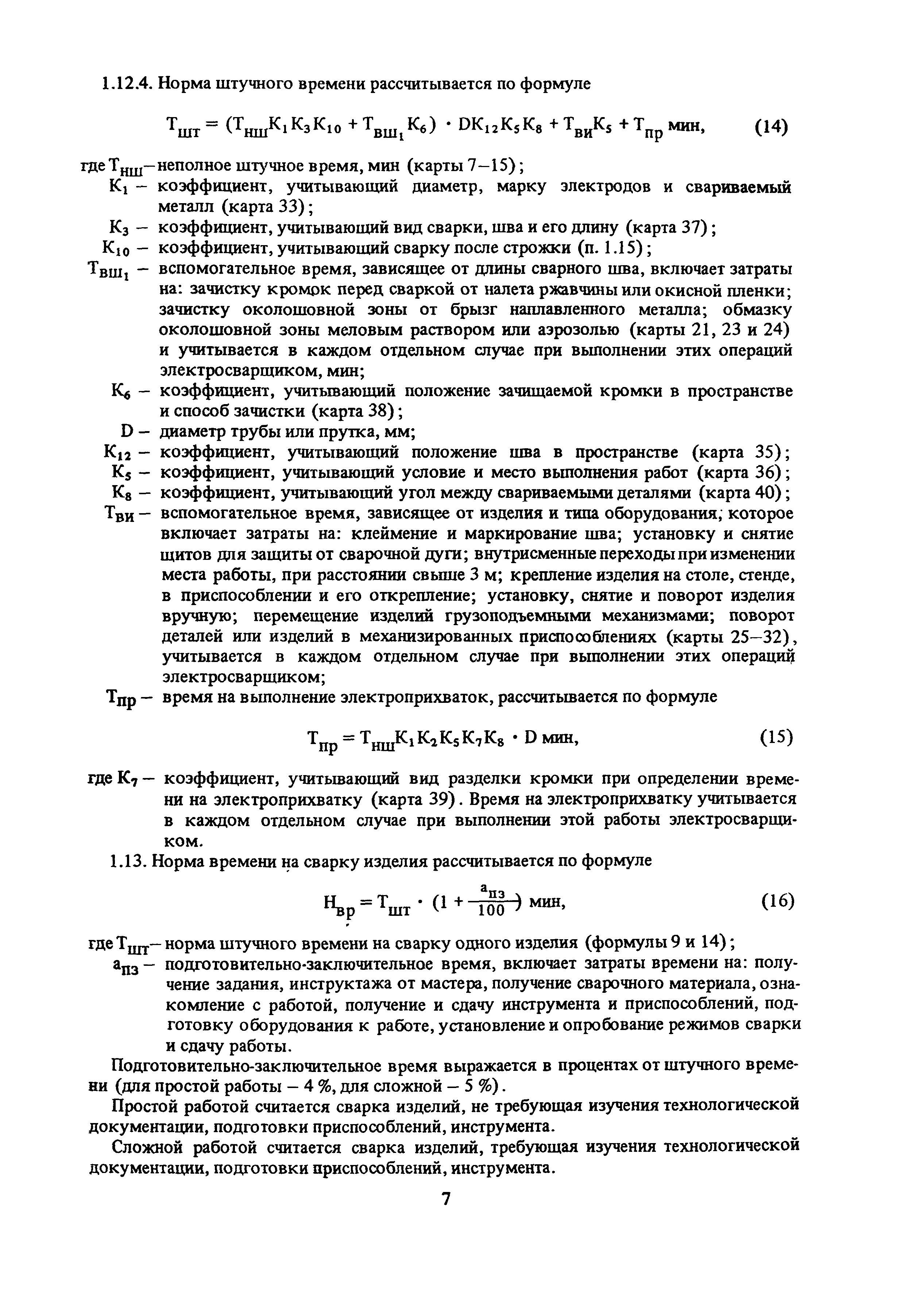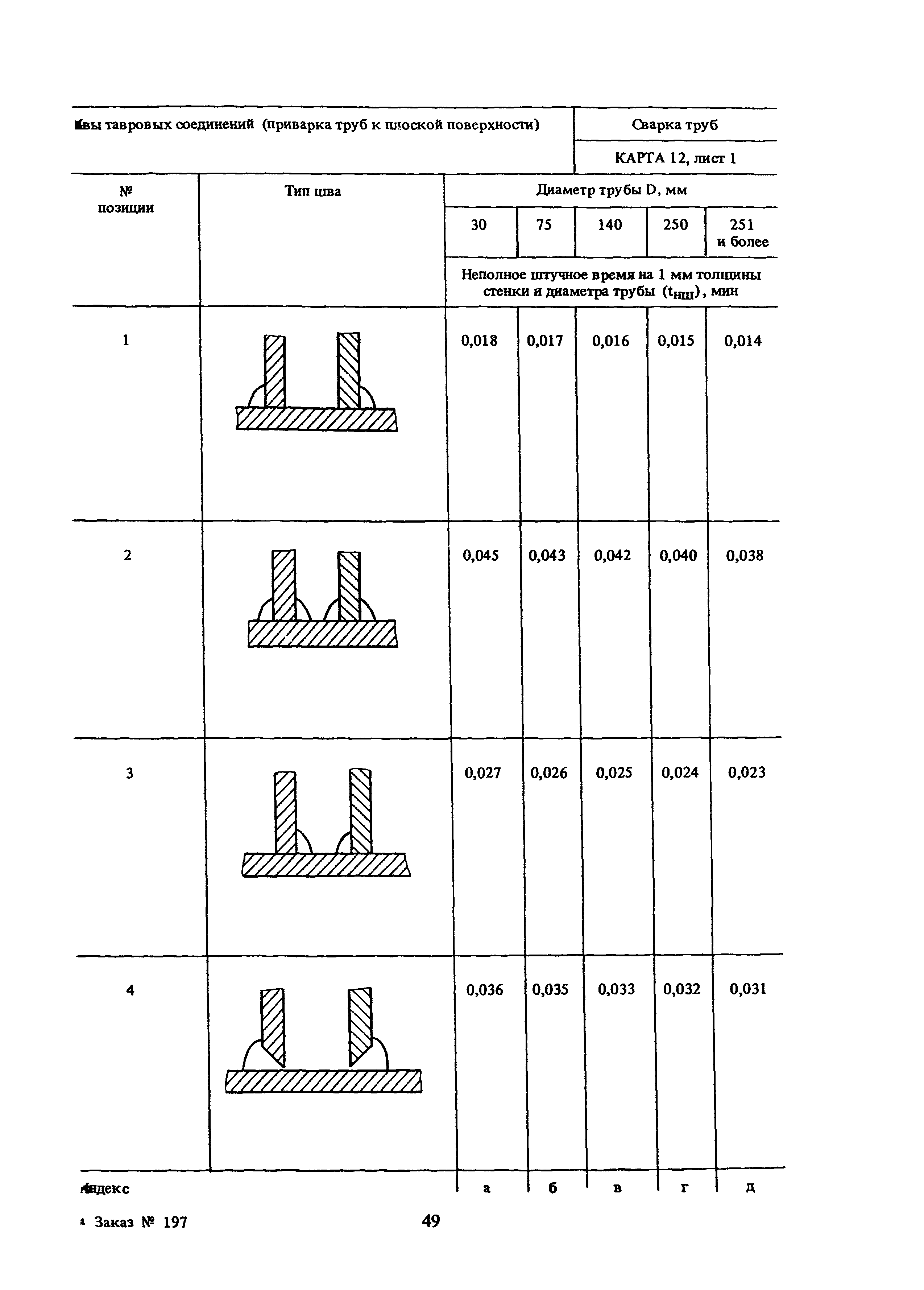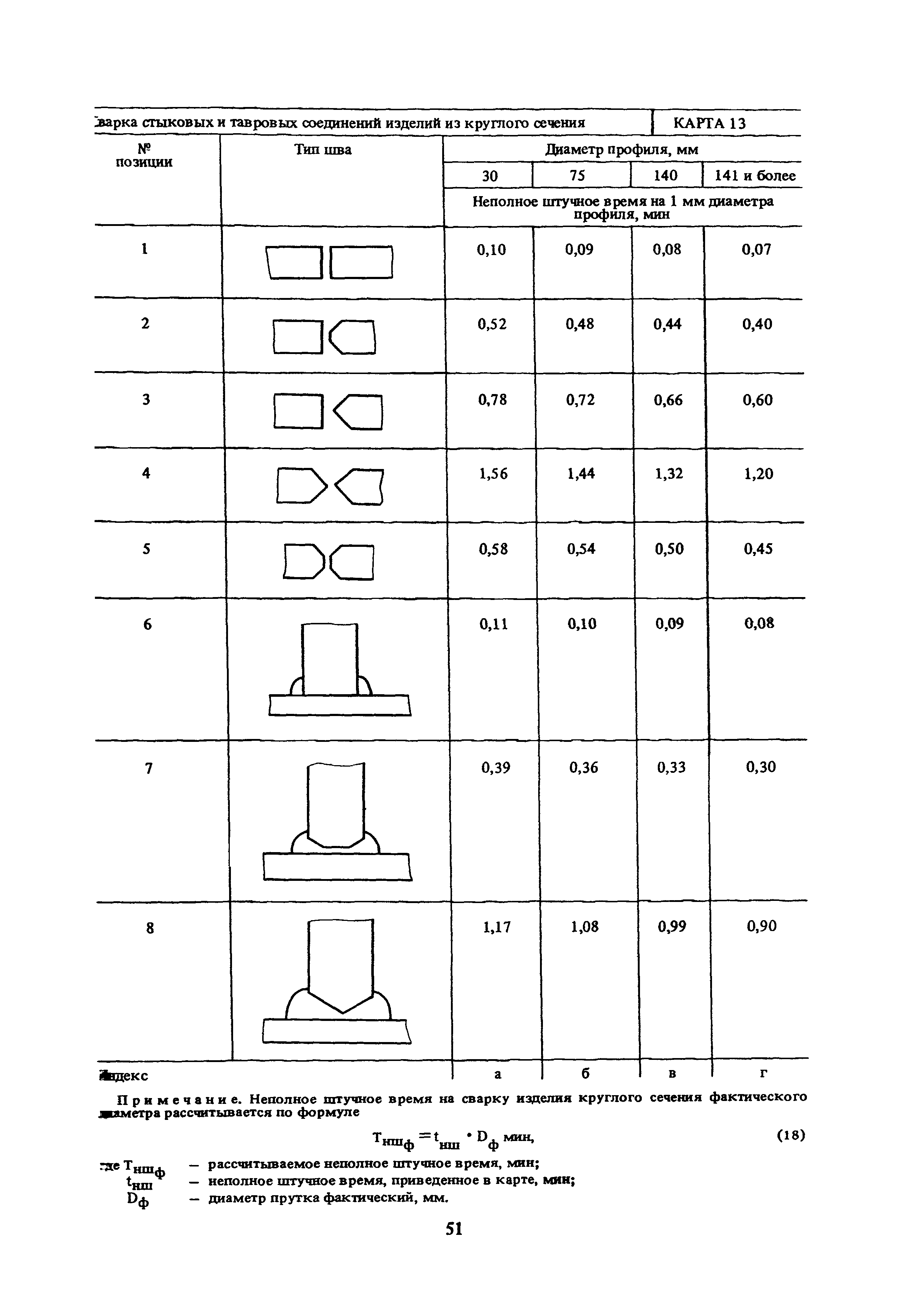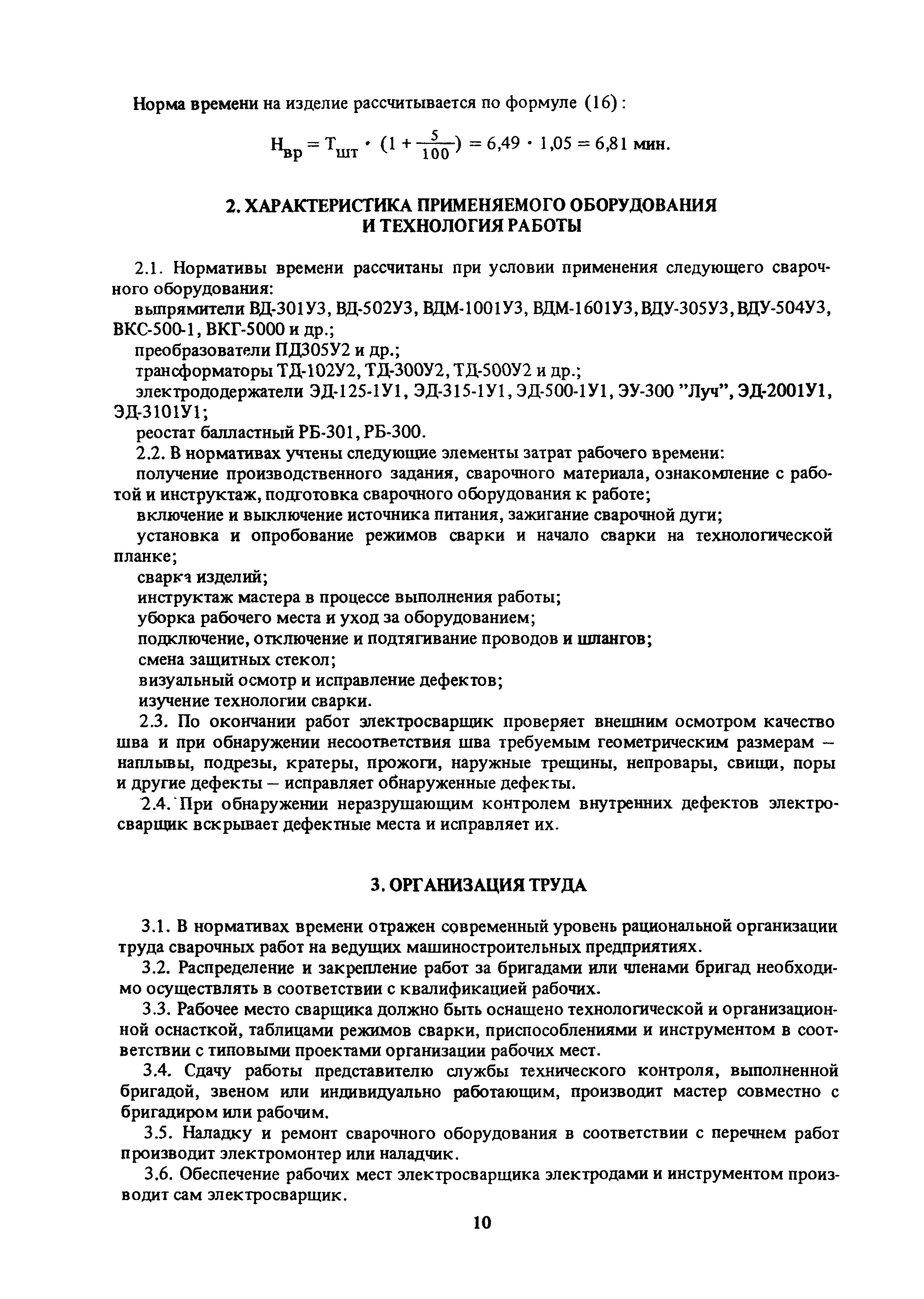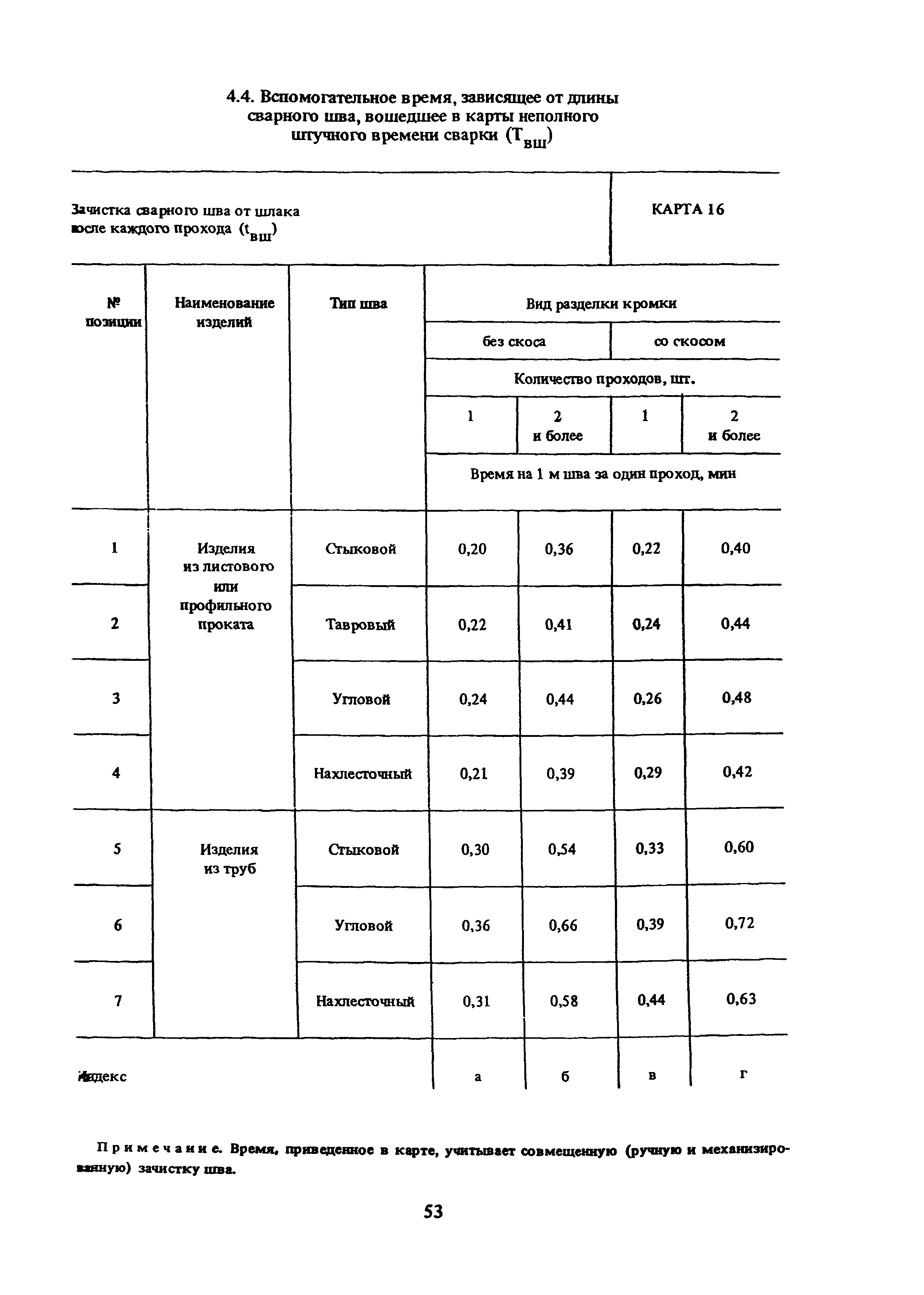 | Оглавление: | 1. Общая часть 2. Характеристика применяемого оборудования и технология работы 3. Организация труда 4. Нормативная часть 4.1. Неполное штучное время на 1 м сварного шва из листового и профильного проката 4.2. Неполное штучное время на сварку труб 4.3. Неполное штучное время на подварку корня шва 4.4. Вспомогательное время, зависящее от длины сварного шва, вошедшее в карты неполного штучного времени сварки (Твш) 4.5. Вспомогательное время, зависящее от длины свариваемого шва, не вошедшее в карты неполного штучного времени (Твш1) 4.6. Вспомогательное время, зависящее от изделия и типа обрудования (Тви) 4.7. Поправочные коэффициенты 4.8. Приложения Приложения 1. Расчетное значение силы тока в зависимости от толщины металла и диаметра электродов при сварке изделий Приложение 2. Площадь поперечного сечения основного шва стыковых соединений Приложение 3. Площадь поперечного сечения подварочного шва стыковых соединений Приложение 4. Площадь поперечного сечения шва угловых соединений Приложение 5. Площадь поперечного сечения подварочного шва угловых соединений Приложение 6. Площадь поперечного сечения шва тавровых соединений Приложение 7. Площадь поперечного сечения угловых, тавровых и нахлесточных соединений в зависимости от "Катета шва" Приложение 8. Площадь поперечного сечения шва первого и последующих проходов Приложение 9. Значение длины кольцевого стыка Приложение 10. Наименование, тип, вид шва и формулы расчета площади поперечного сечения швов |