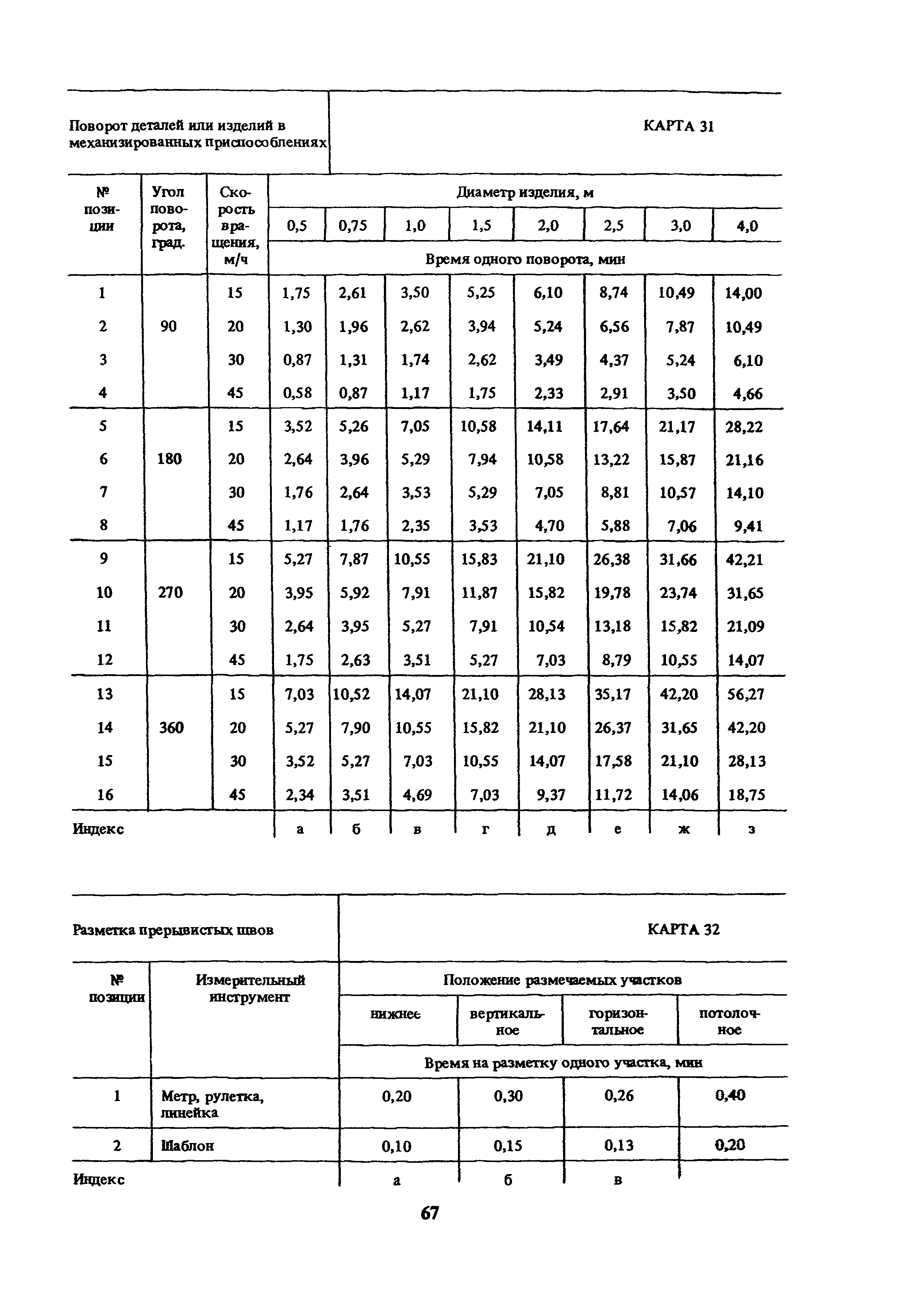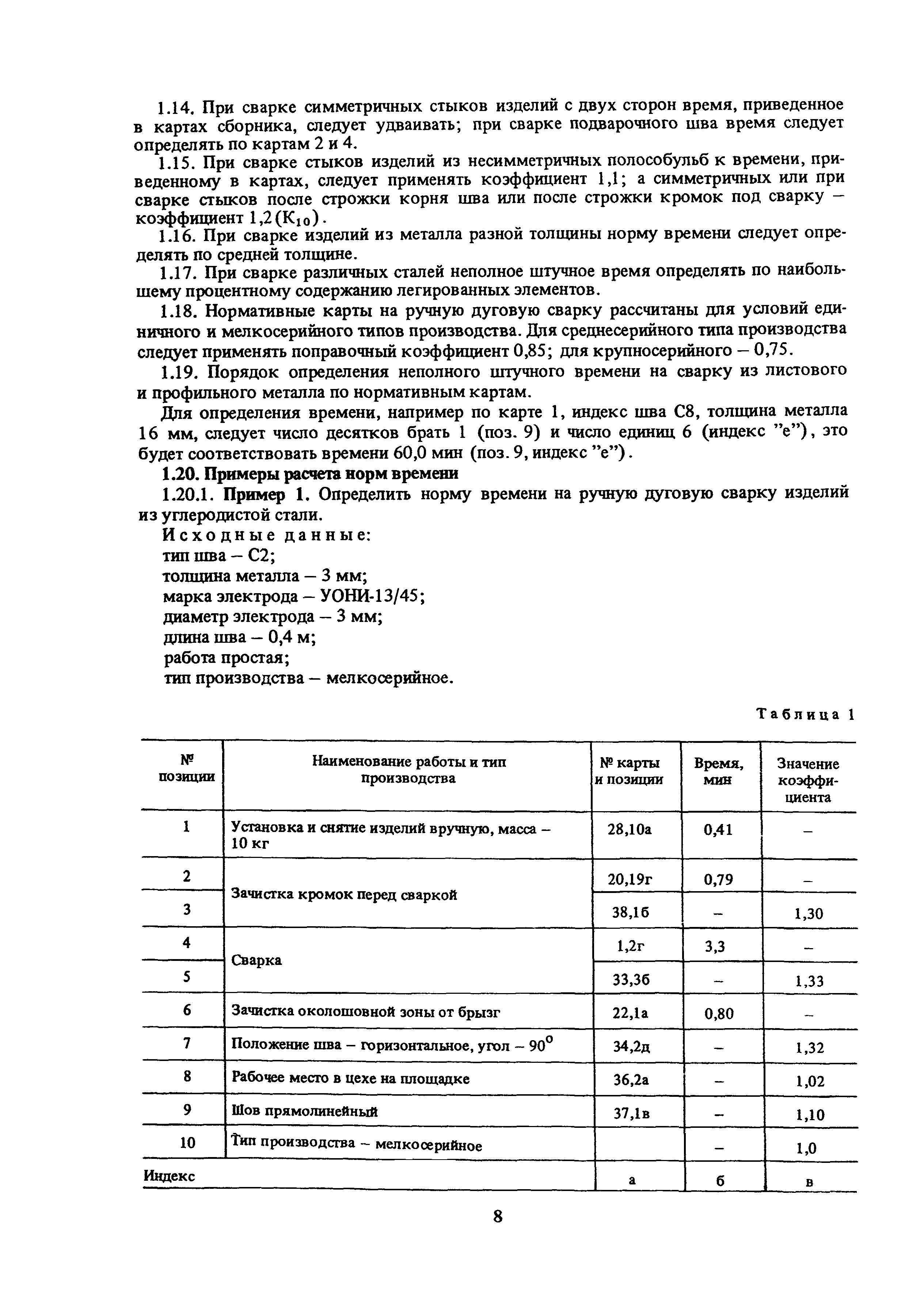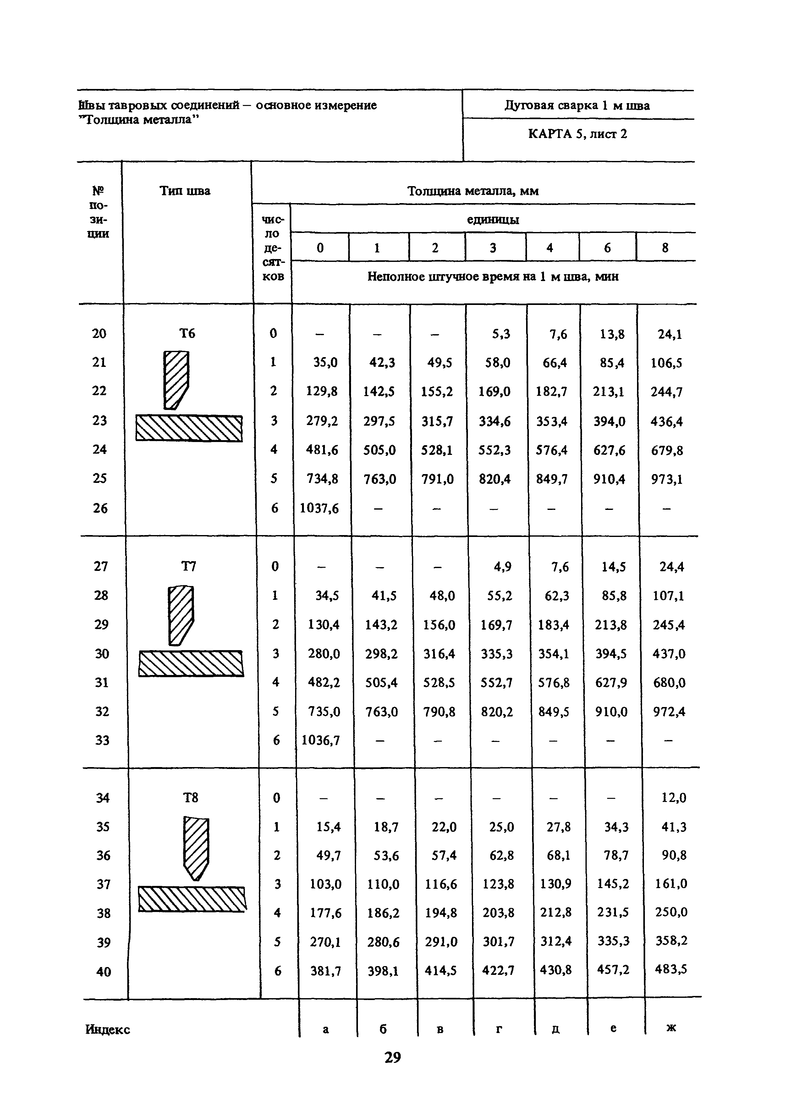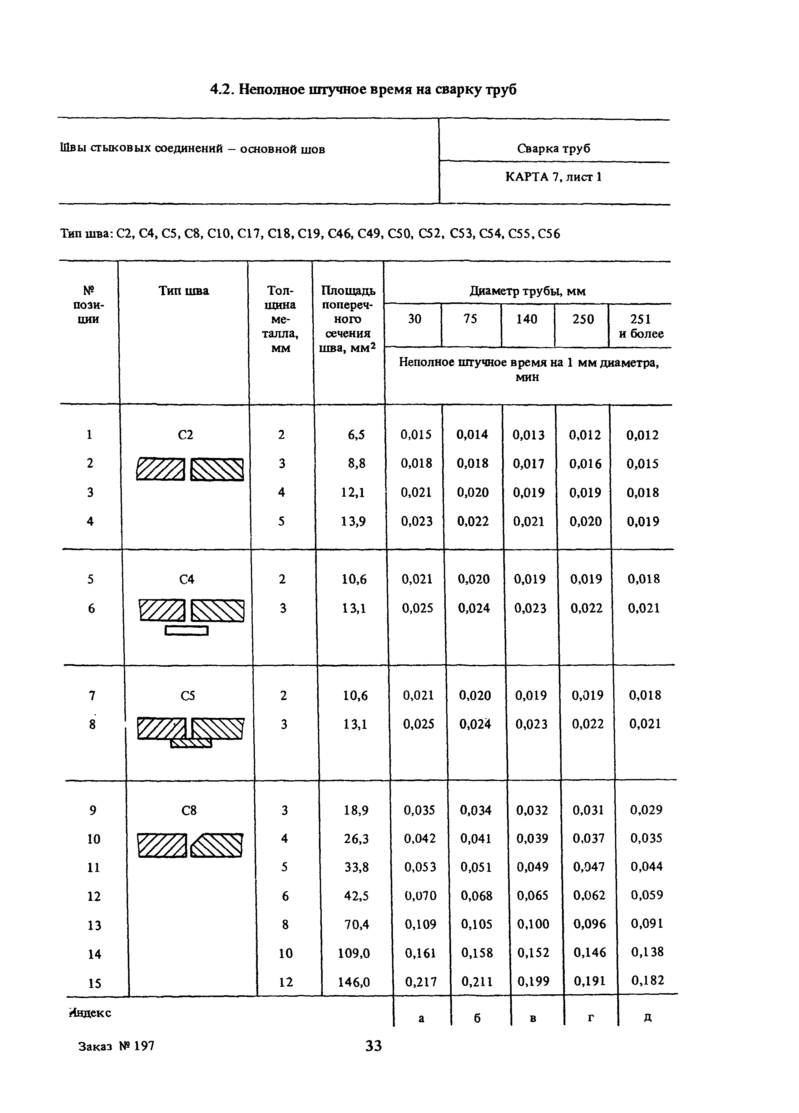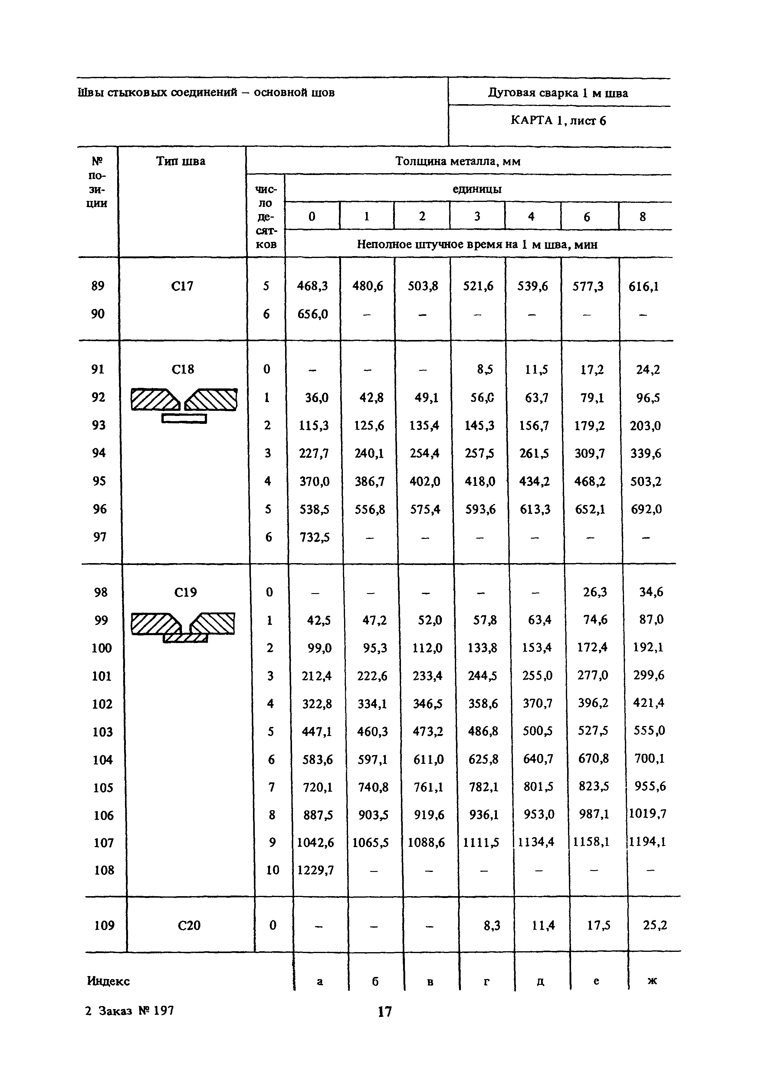 | Оглавление: | 1. Общая часть 2. Характеристика применяемого оборудования и технология работы 3. Организация труда 4. Нормативная часть 4.1. Неполное штучное время на 1 м сварного шва из листового и профильного проката 4.2. Неполное штучное время на сварку труб 4.3. Неполное штучное время на подварку корня шва 4.4. Вспомогательное время, зависящее от длины сварного шва, вошедшее в карты неполного штучного времени сварки (Твш) 4.5. Вспомогательное время, зависящее от длины свариваемого шва, не вошедшее в карты неполного штучного времени (Твш1) 4.6. Вспомогательное время, зависящее от изделия и типа обрудования (Тви) 4.7. Поправочные коэффициенты 4.8. Приложения Приложения 1. Расчетное значение силы тока в зависимости от толщины металла и диаметра электродов при сварке изделий Приложение 2. Площадь поперечного сечения основного шва стыковых соединений Приложение 3. Площадь поперечного сечения подварочного шва стыковых соединений Приложение 4. Площадь поперечного сечения шва угловых соединений Приложение 5. Площадь поперечного сечения подварочного шва угловых соединений Приложение 6. Площадь поперечного сечения шва тавровых соединений Приложение 7. Площадь поперечного сечения угловых, тавровых и нахлесточных соединений в зависимости от "Катета шва" Приложение 8. Площадь поперечного сечения шва первого и последующих проходов Приложение 9. Значение длины кольцевого стыка Приложение 10. Наименование, тип, вид шва и формулы расчета площади поперечного сечения швов |