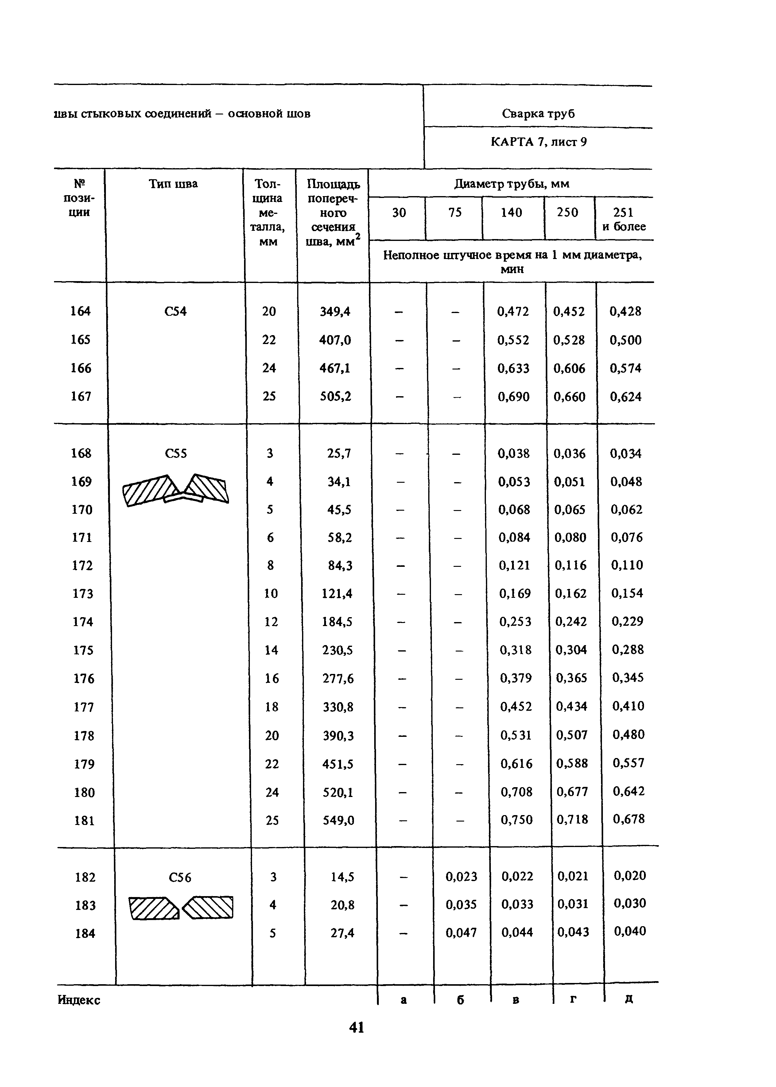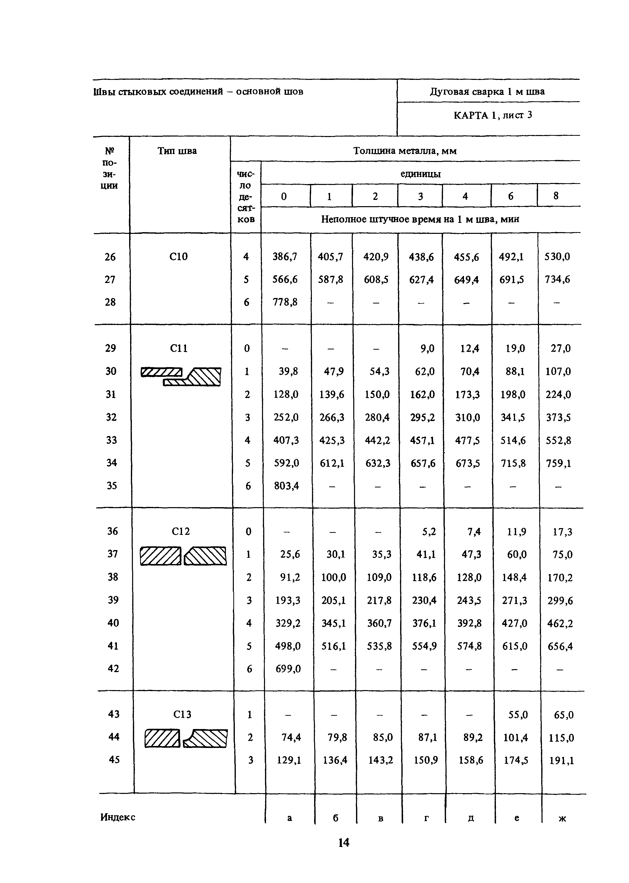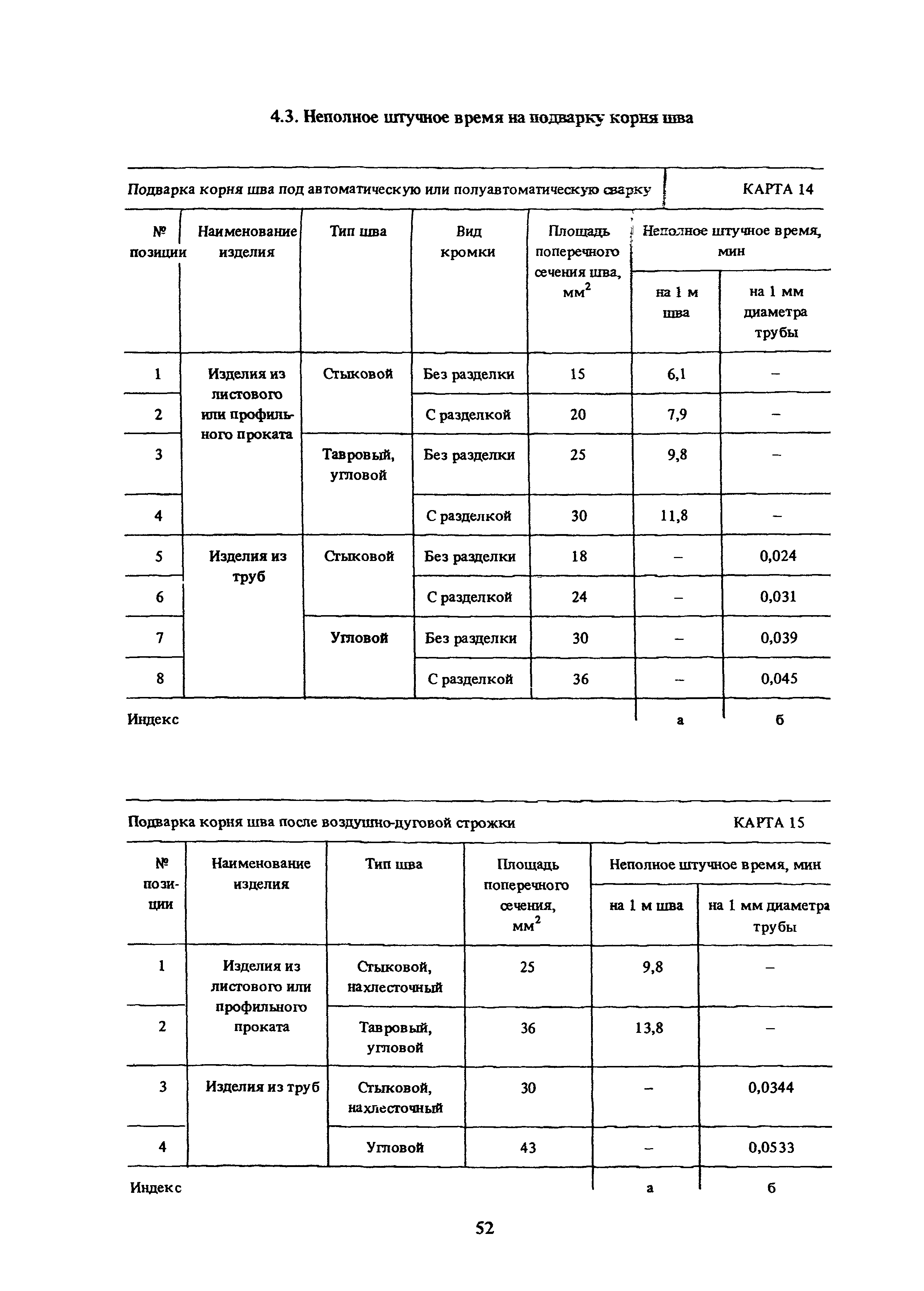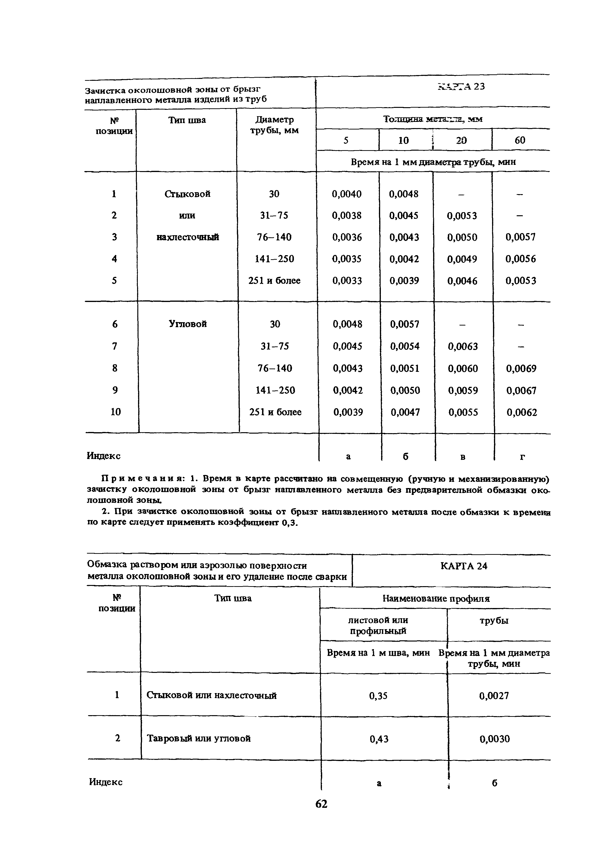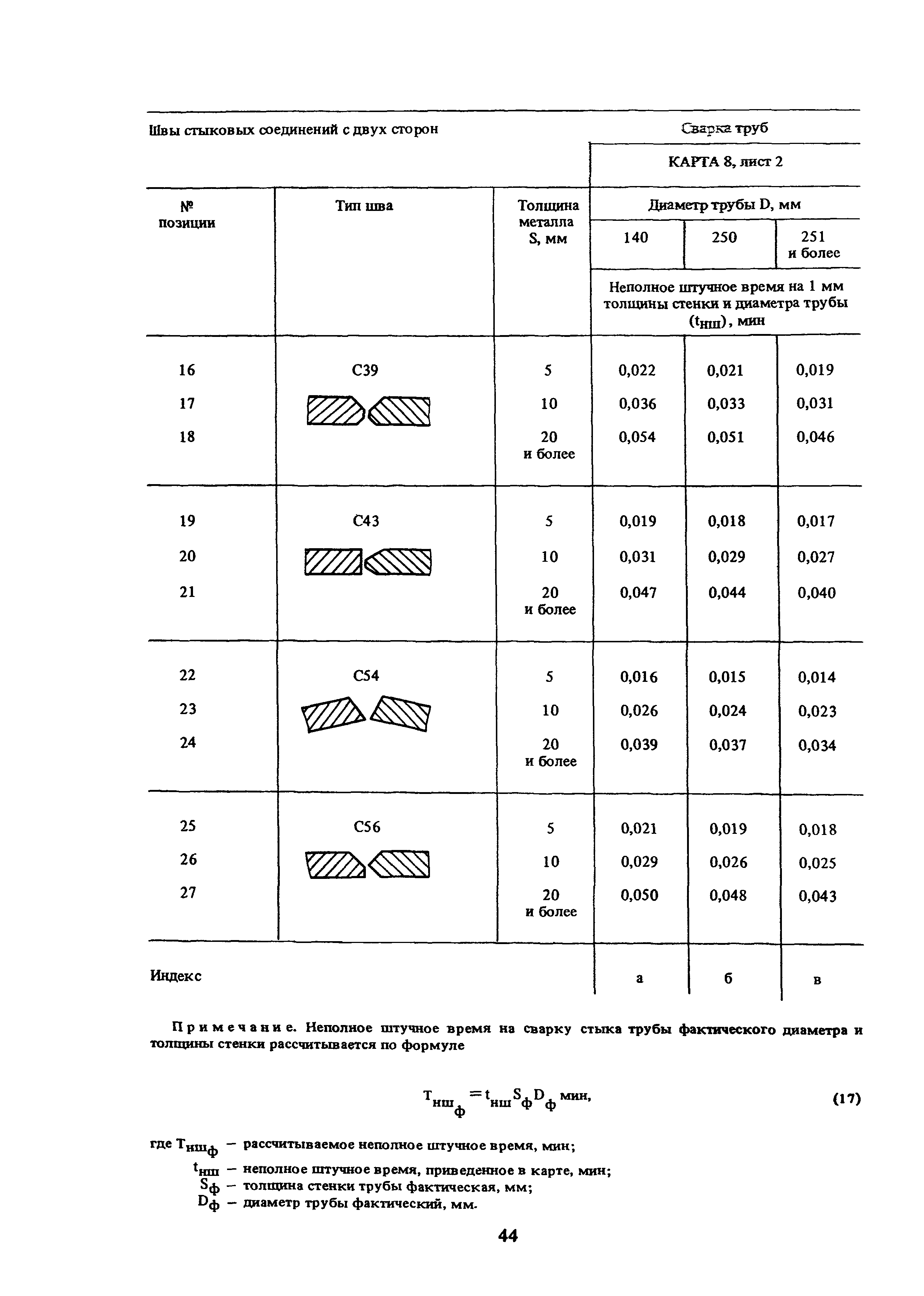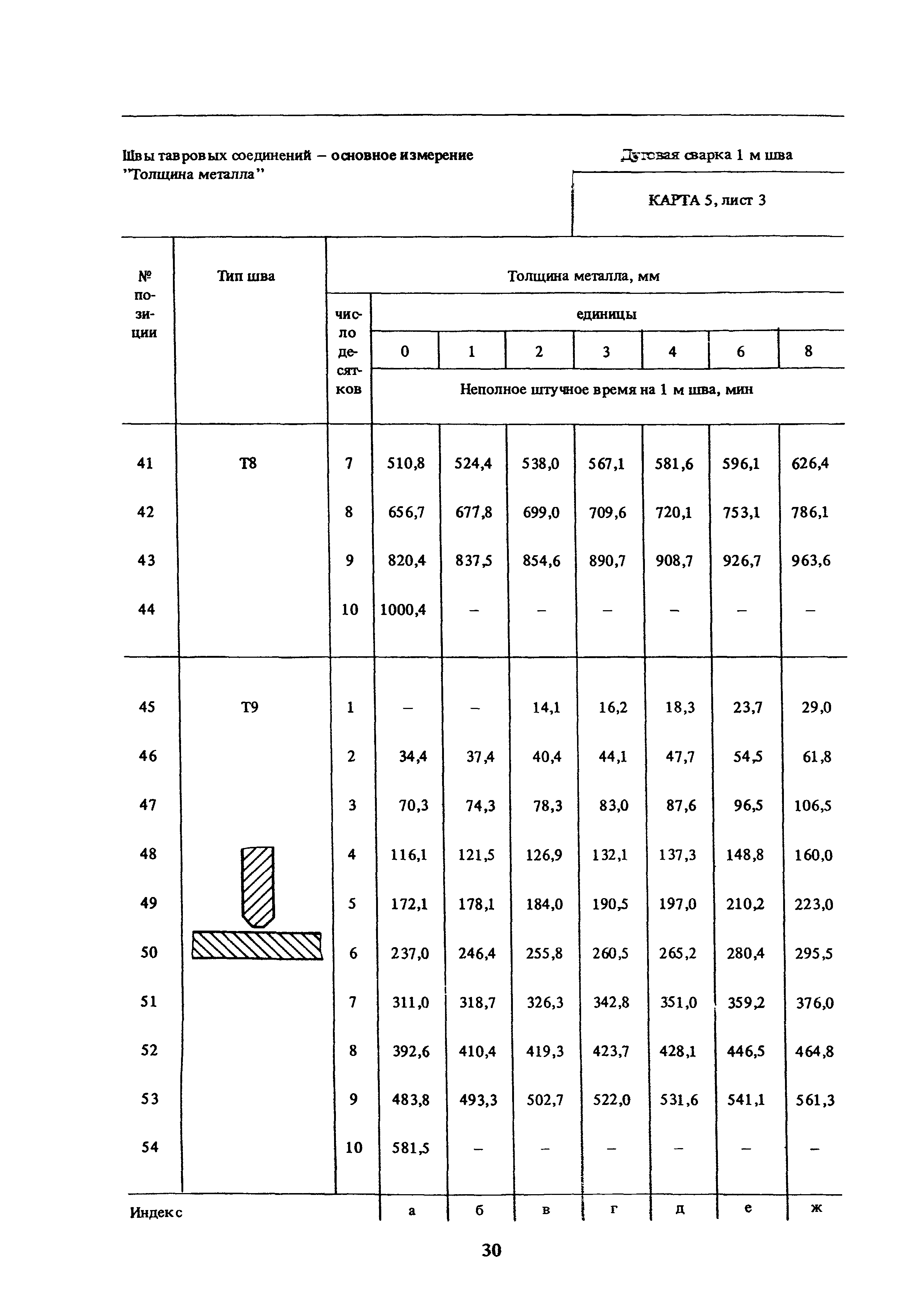 | Оглавление: | 1. Общая часть 2. Характеристика применяемого оборудования и технология работы 3. Организация труда 4. Нормативная часть 4.1. Неполное штучное время на 1 м сварного шва из листового и профильного проката 4.2. Неполное штучное время на сварку труб 4.3. Неполное штучное время на подварку корня шва 4.4. Вспомогательное время, зависящее от длины сварного шва, вошедшее в карты неполного штучного времени сварки (Твш) 4.5. Вспомогательное время, зависящее от длины свариваемого шва, не вошедшее в карты неполного штучного времени (Твш1) 4.6. Вспомогательное время, зависящее от изделия и типа обрудования (Тви) 4.7. Поправочные коэффициенты 4.8. Приложения Приложения 1. Расчетное значение силы тока в зависимости от толщины металла и диаметра электродов при сварке изделий Приложение 2. Площадь поперечного сечения основного шва стыковых соединений Приложение 3. Площадь поперечного сечения подварочного шва стыковых соединений Приложение 4. Площадь поперечного сечения шва угловых соединений Приложение 5. Площадь поперечного сечения подварочного шва угловых соединений Приложение 6. Площадь поперечного сечения шва тавровых соединений Приложение 7. Площадь поперечного сечения угловых, тавровых и нахлесточных соединений в зависимости от "Катета шва" Приложение 8. Площадь поперечного сечения шва первого и последующих проходов Приложение 9. Значение длины кольцевого стыка Приложение 10. Наименование, тип, вид шва и формулы расчета площади поперечного сечения швов |