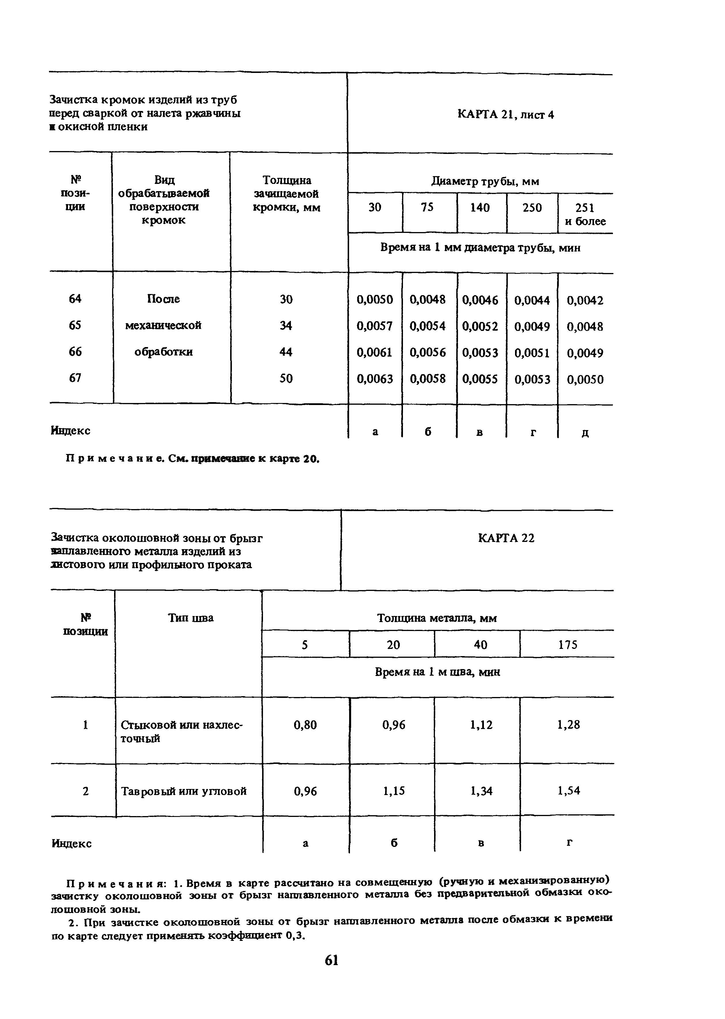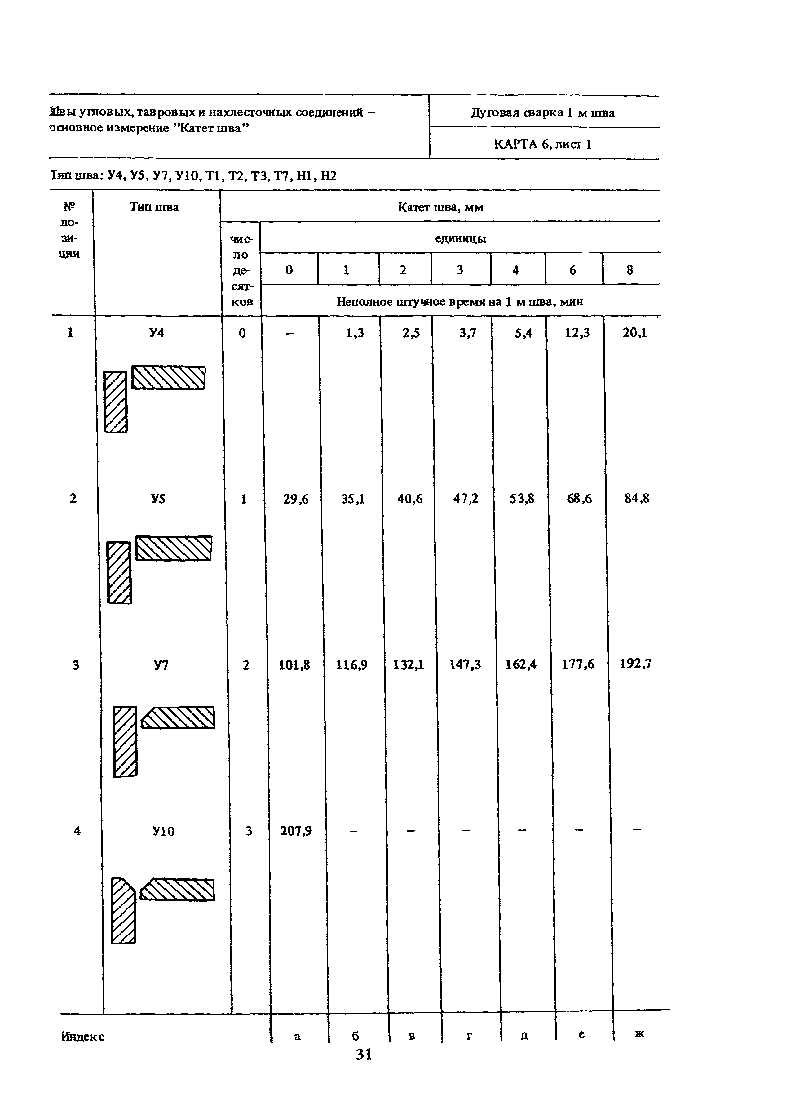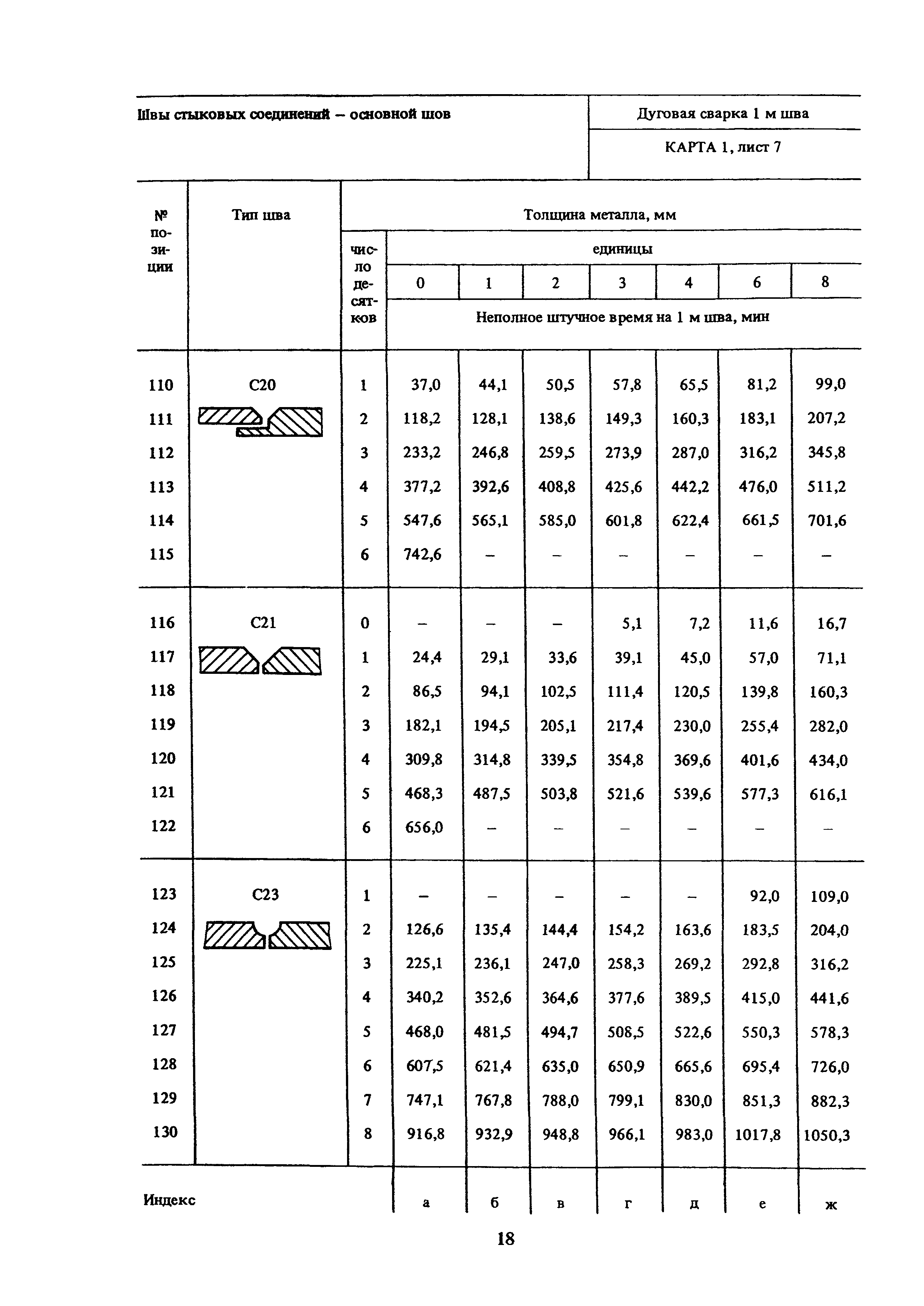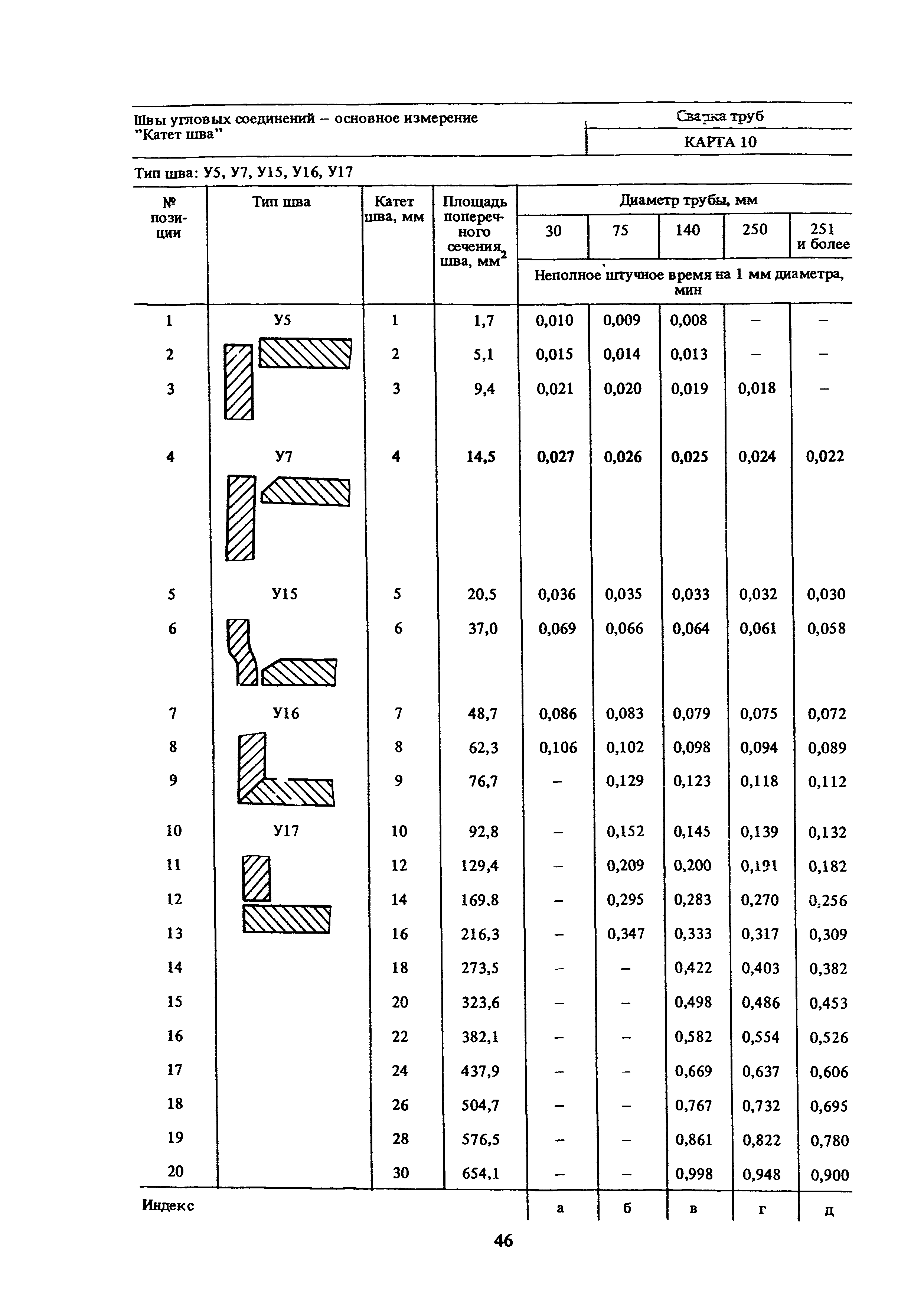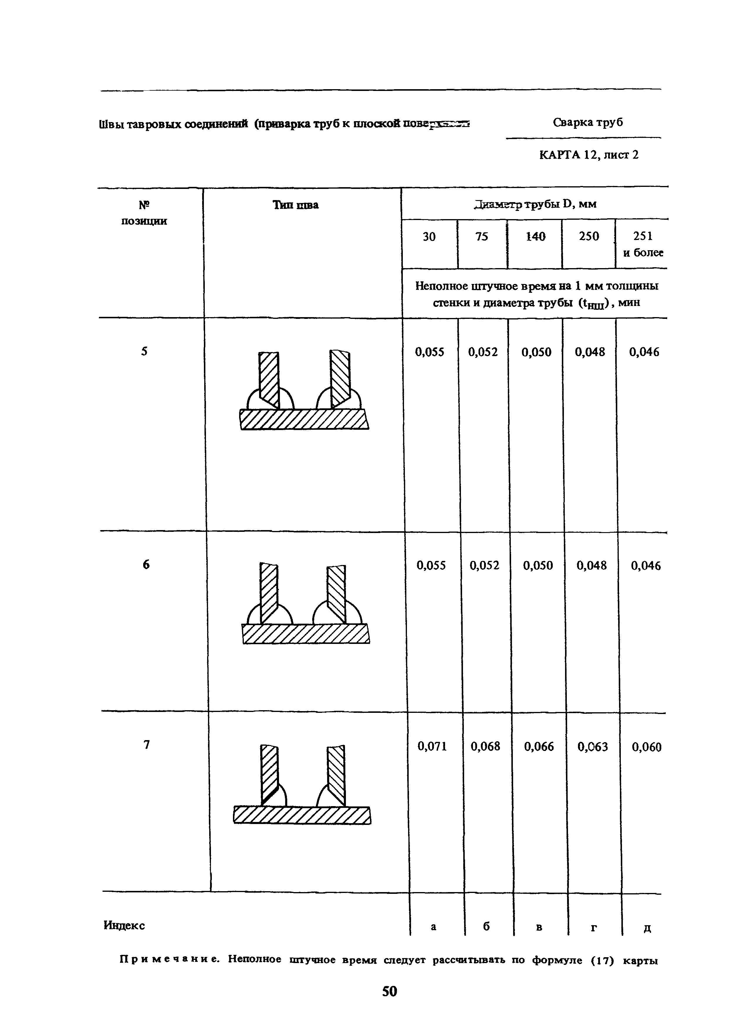 | Оглавление: | 1. Общая часть 2. Характеристика применяемого оборудования и технология работы 3. Организация труда 4. Нормативная часть 4.1. Неполное штучное время на 1 м сварного шва из листового и профильного проката 4.2. Неполное штучное время на сварку труб 4.3. Неполное штучное время на подварку корня шва 4.4. Вспомогательное время, зависящее от длины сварного шва, вошедшее в карты неполного штучного времени сварки (Твш) 4.5. Вспомогательное время, зависящее от длины свариваемого шва, не вошедшее в карты неполного штучного времени (Твш1) 4.6. Вспомогательное время, зависящее от изделия и типа обрудования (Тви) 4.7. Поправочные коэффициенты 4.8. Приложения Приложения 1. Расчетное значение силы тока в зависимости от толщины металла и диаметра электродов при сварке изделий Приложение 2. Площадь поперечного сечения основного шва стыковых соединений Приложение 3. Площадь поперечного сечения подварочного шва стыковых соединений Приложение 4. Площадь поперечного сечения шва угловых соединений Приложение 5. Площадь поперечного сечения подварочного шва угловых соединений Приложение 6. Площадь поперечного сечения шва тавровых соединений Приложение 7. Площадь поперечного сечения угловых, тавровых и нахлесточных соединений в зависимости от "Катета шва" Приложение 8. Площадь поперечного сечения шва первого и последующих проходов Приложение 9. Значение длины кольцевого стыка Приложение 10. Наименование, тип, вид шва и формулы расчета площади поперечного сечения швов |