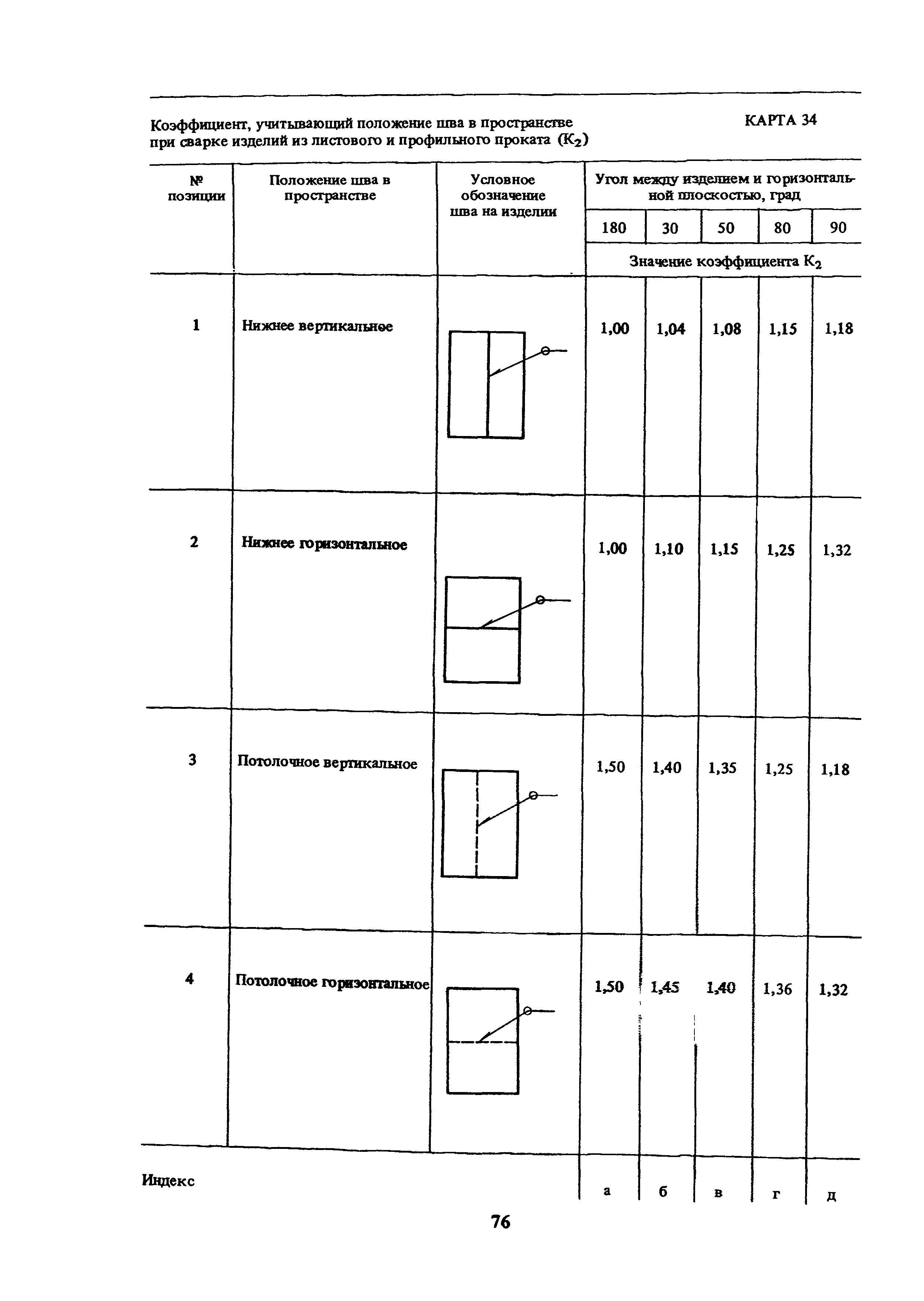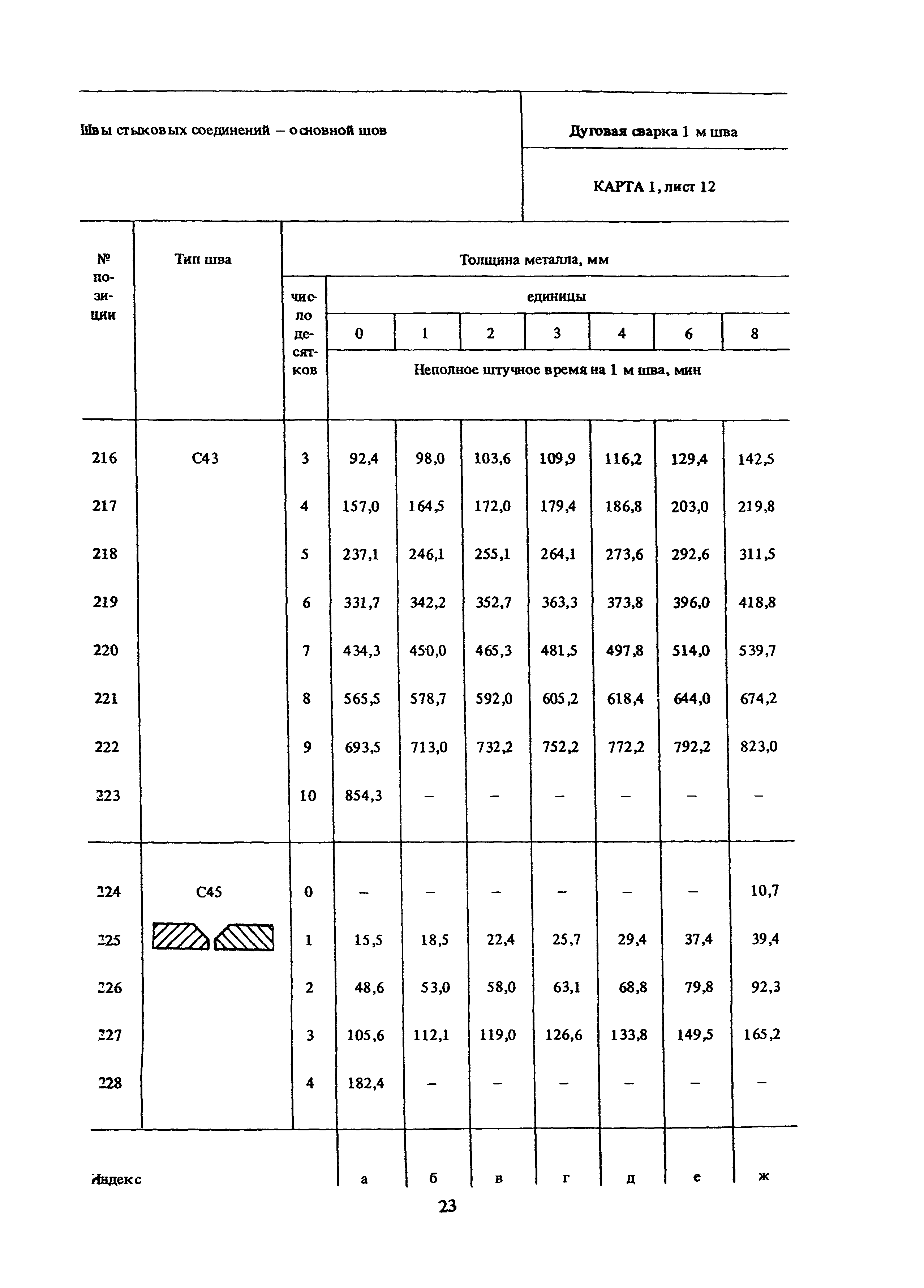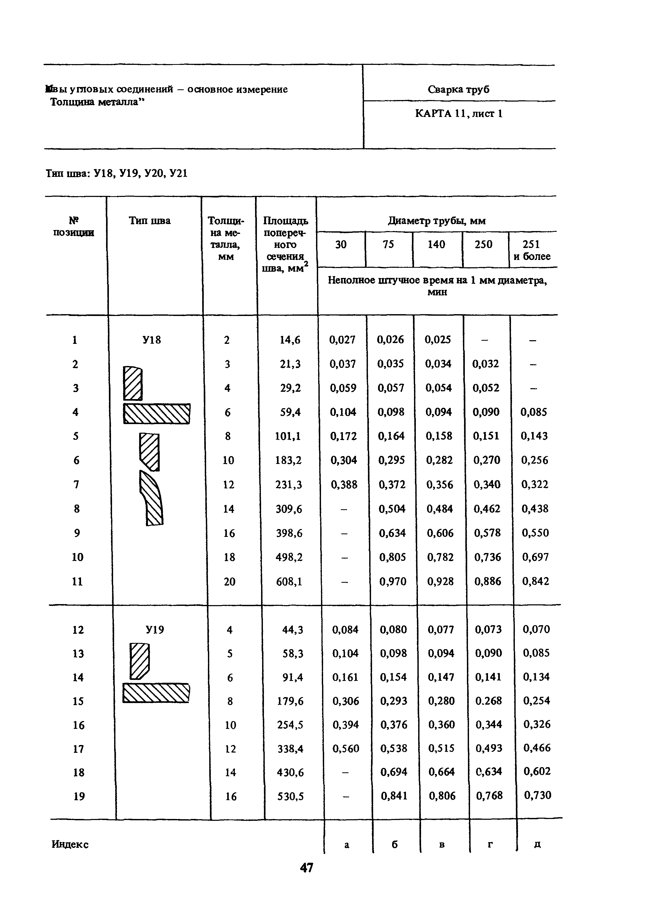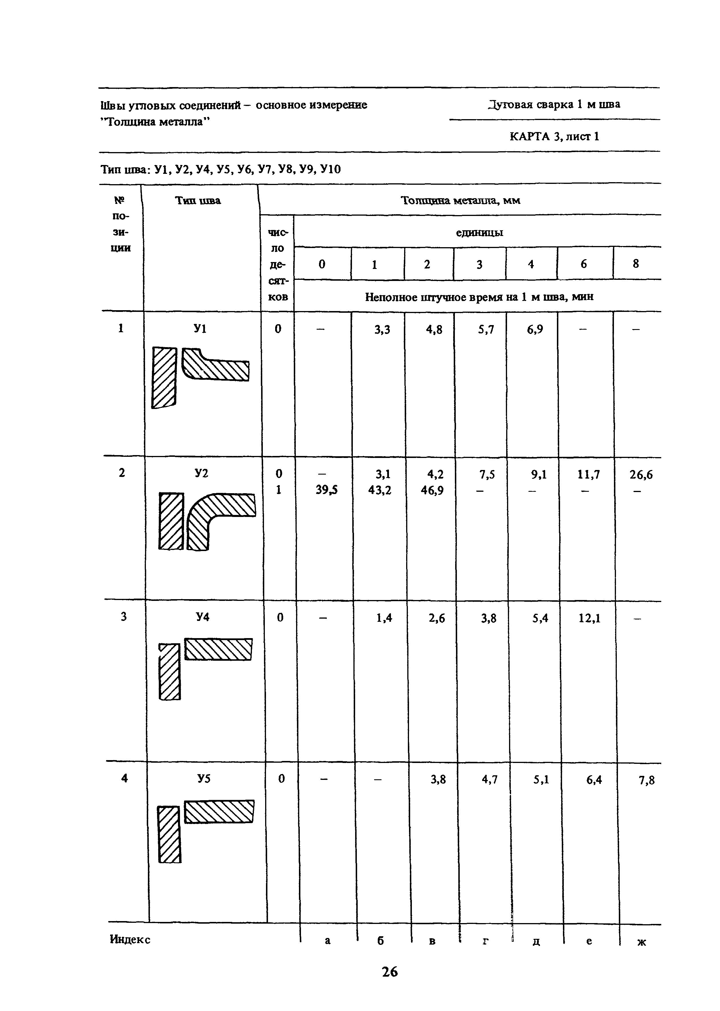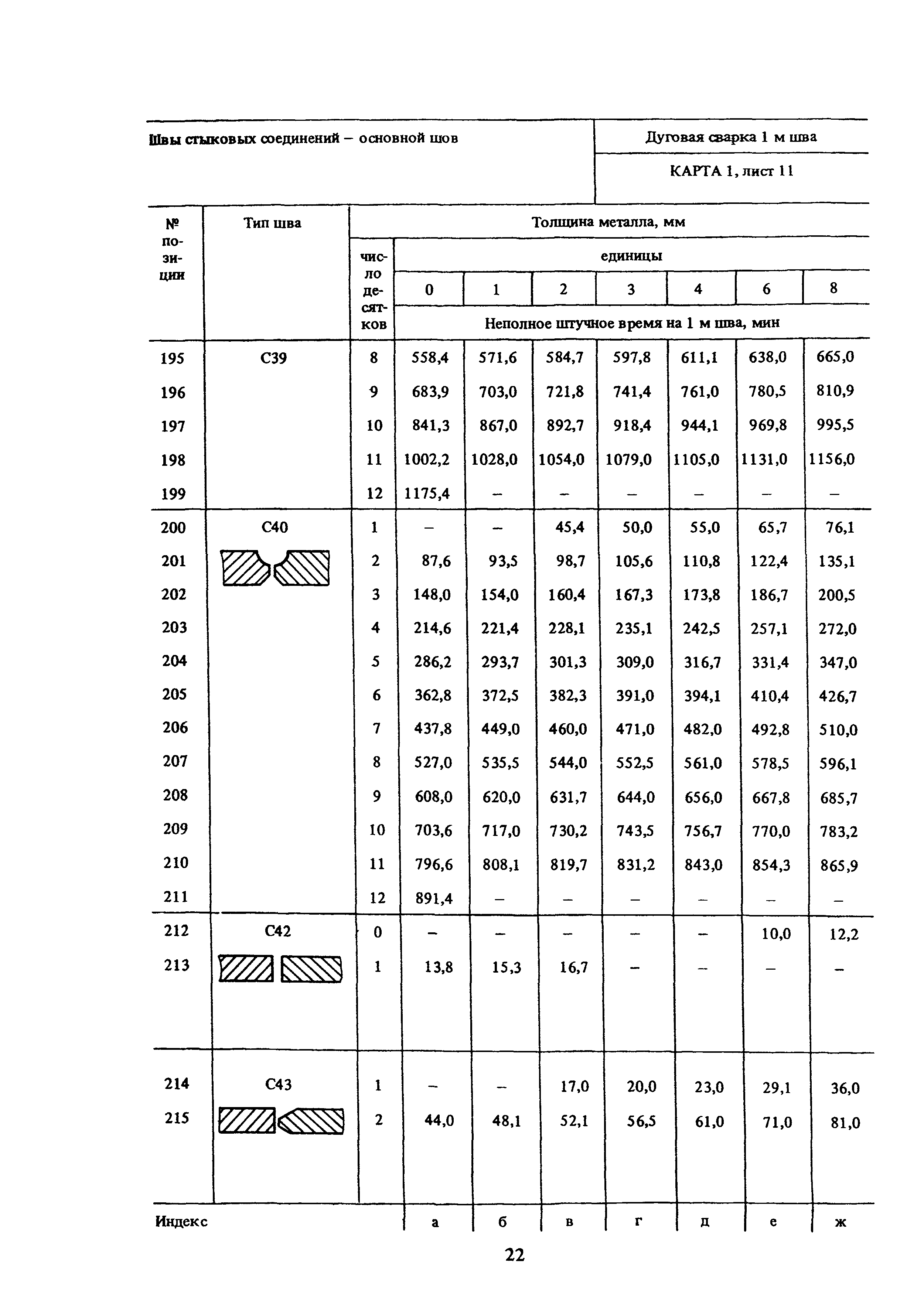 | Оглавление: | 1. Общая часть 2. Характеристика применяемого оборудования и технология работы 3. Организация труда 4. Нормативная часть 4.1. Неполное штучное время на 1 м сварного шва из листового и профильного проката 4.2. Неполное штучное время на сварку труб 4.3. Неполное штучное время на подварку корня шва 4.4. Вспомогательное время, зависящее от длины сварного шва, вошедшее в карты неполного штучного времени сварки (Твш) 4.5. Вспомогательное время, зависящее от длины свариваемого шва, не вошедшее в карты неполного штучного времени (Твш1) 4.6. Вспомогательное время, зависящее от изделия и типа обрудования (Тви) 4.7. Поправочные коэффициенты 4.8. Приложения Приложения 1. Расчетное значение силы тока в зависимости от толщины металла и диаметра электродов при сварке изделий Приложение 2. Площадь поперечного сечения основного шва стыковых соединений Приложение 3. Площадь поперечного сечения подварочного шва стыковых соединений Приложение 4. Площадь поперечного сечения шва угловых соединений Приложение 5. Площадь поперечного сечения подварочного шва угловых соединений Приложение 6. Площадь поперечного сечения шва тавровых соединений Приложение 7. Площадь поперечного сечения угловых, тавровых и нахлесточных соединений в зависимости от "Катета шва" Приложение 8. Площадь поперечного сечения шва первого и последующих проходов Приложение 9. Значение длины кольцевого стыка Приложение 10. Наименование, тип, вид шва и формулы расчета площади поперечного сечения швов |
