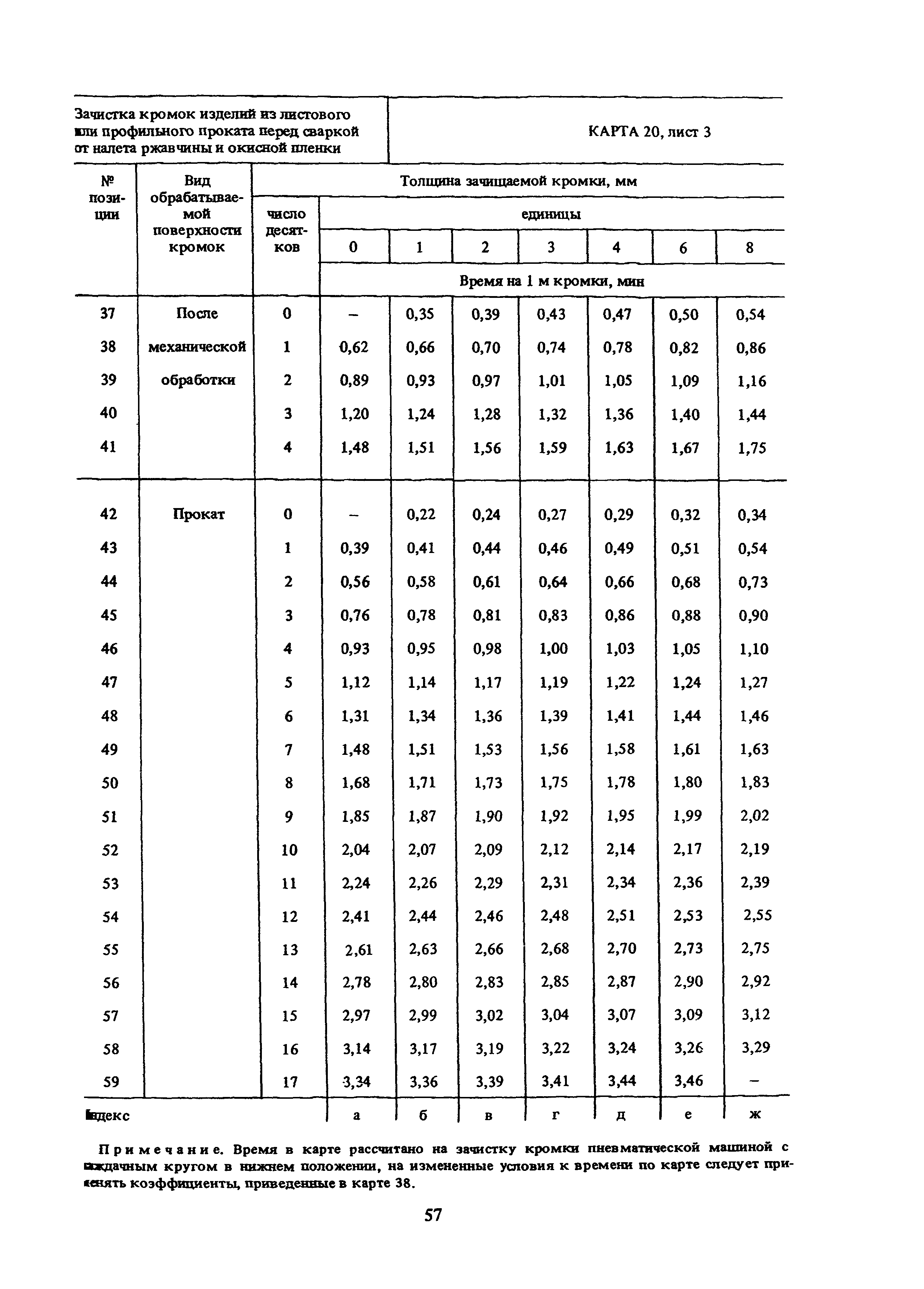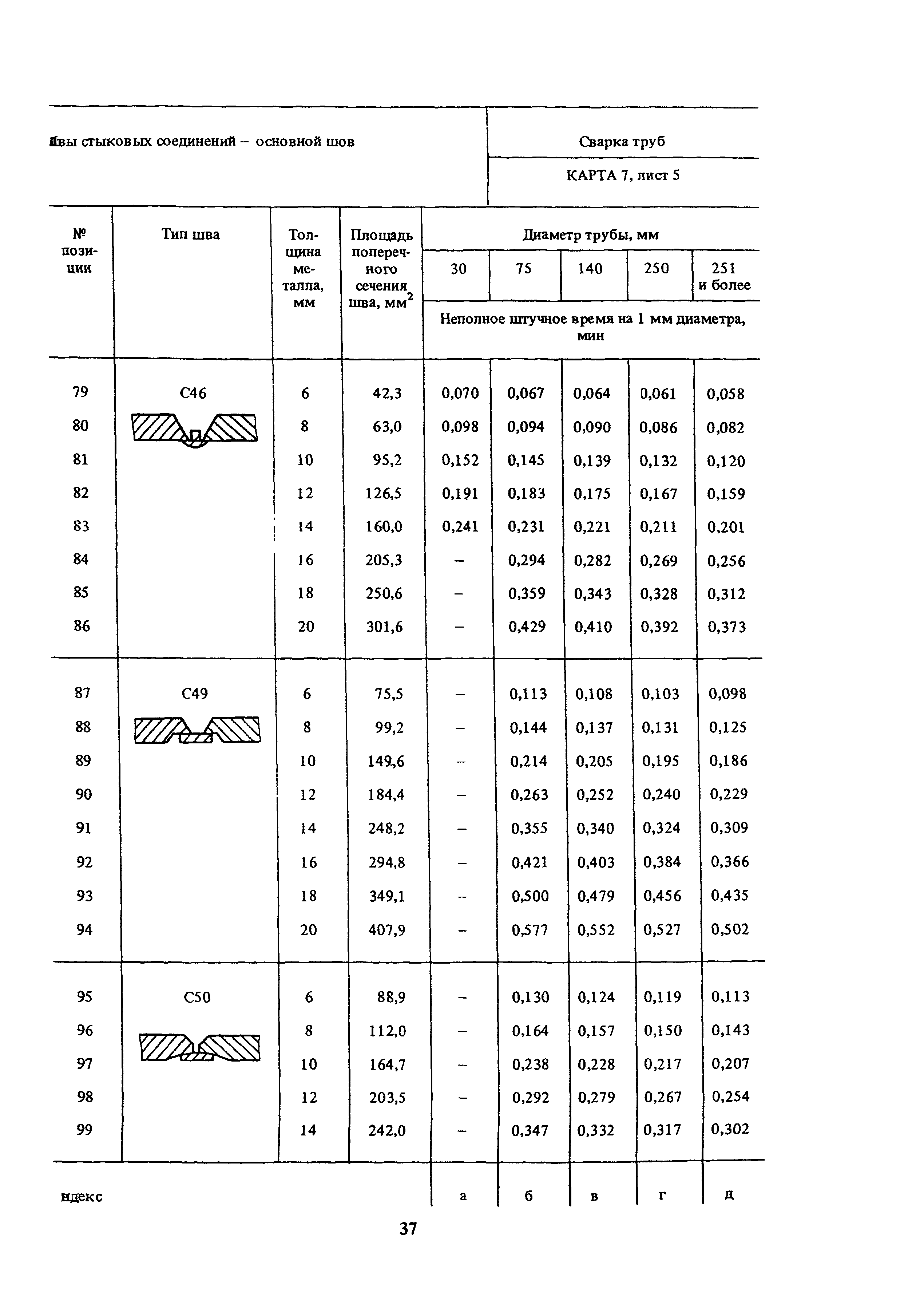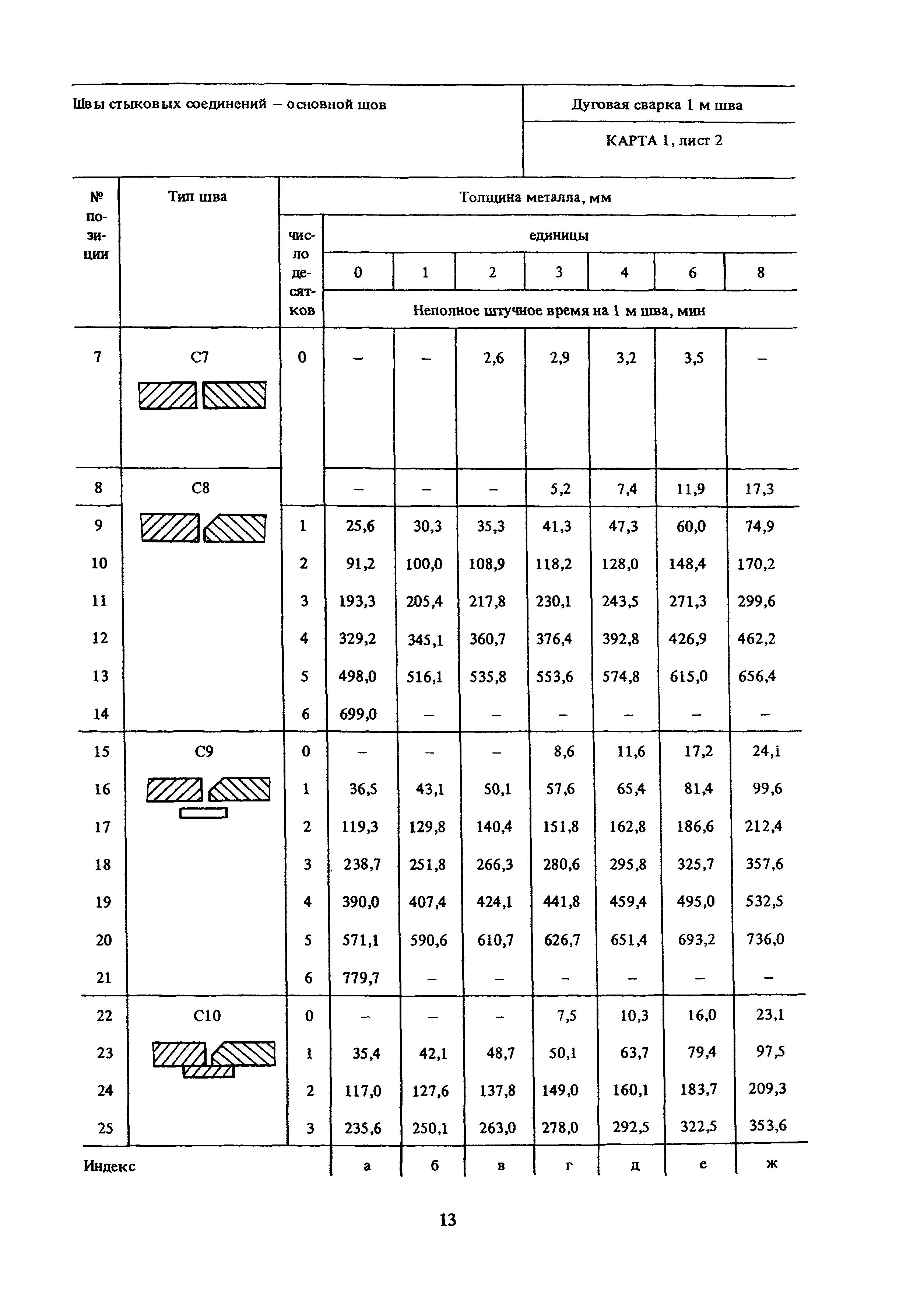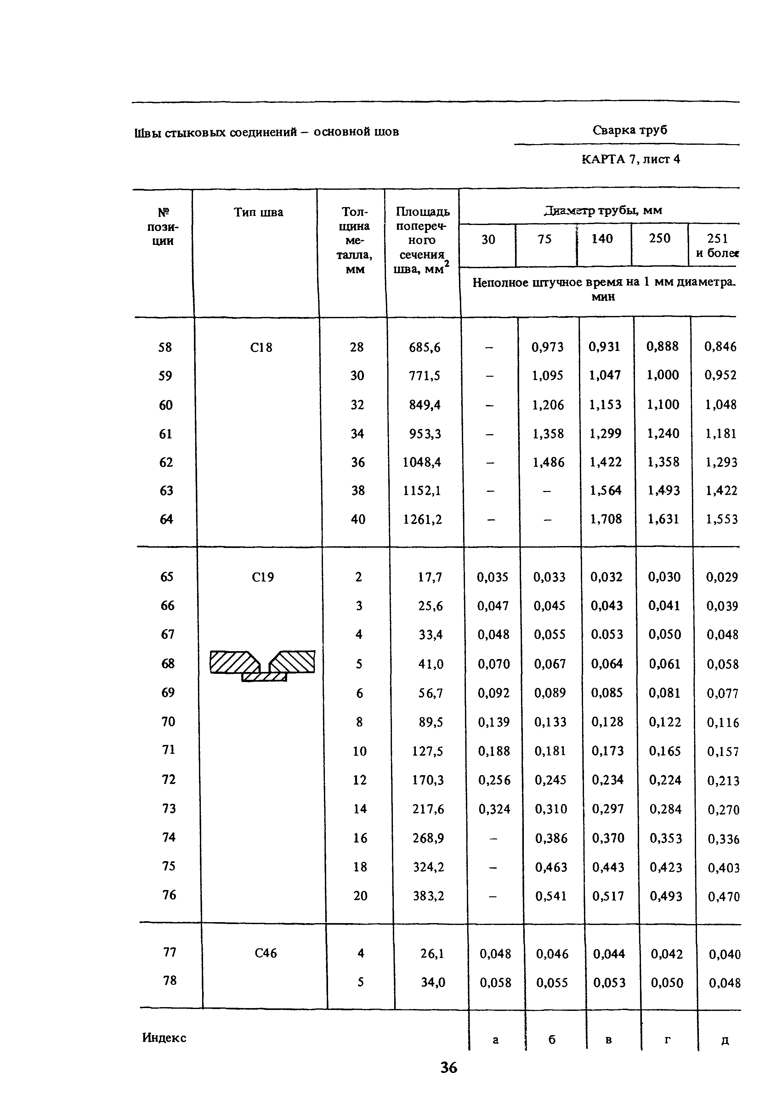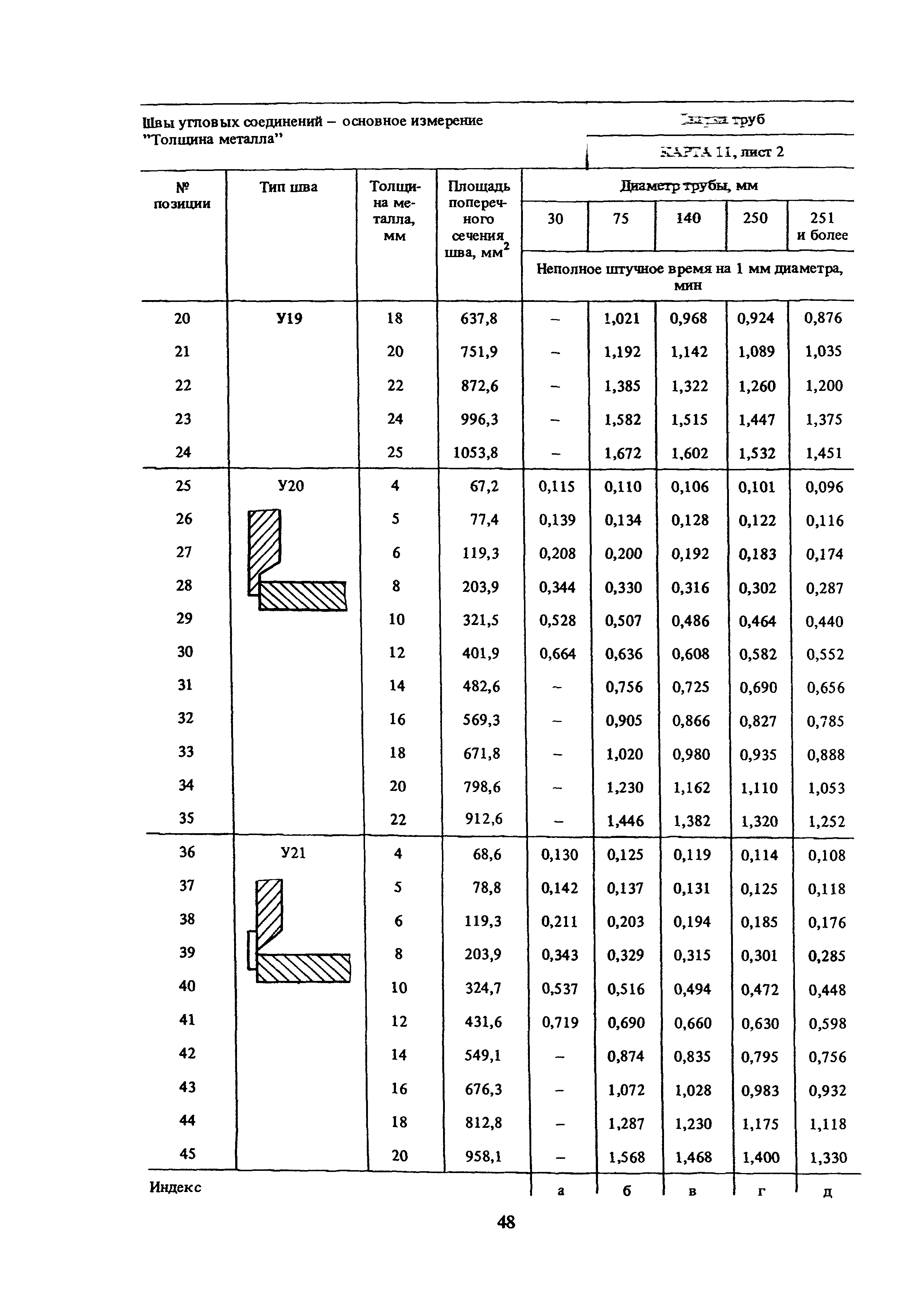| Оглавление: | 1. Общая часть 2. Характеристика применяемого оборудования и технология работы 3. Организация труда 4. Нормативная часть 4.1. Неполное штучное время на 1 м сварного шва из листового и профильного проката 4.2. Неполное штучное время на сварку труб 4.3. Неполное штучное время на подварку корня шва 4.4. Вспомогательное время, зависящее от длины сварного шва, вошедшее в карты неполного штучного времени сварки (Твш) 4.5. Вспомогательное время, зависящее от длины свариваемого шва, не вошедшее в карты неполного штучного времени (Твш1) 4.6. Вспомогательное время, зависящее от изделия и типа обрудования (Тви) 4.7. Поправочные коэффициенты 4.8. Приложения Приложения 1. Расчетное значение силы тока в зависимости от толщины металла и диаметра электродов при сварке изделий Приложение 2. Площадь поперечного сечения основного шва стыковых соединений Приложение 3. Площадь поперечного сечения подварочного шва стыковых соединений Приложение 4. Площадь поперечного сечения шва угловых соединений Приложение 5. Площадь поперечного сечения подварочного шва угловых соединений Приложение 6. Площадь поперечного сечения шва тавровых соединений Приложение 7. Площадь поперечного сечения угловых, тавровых и нахлесточных соединений в зависимости от "Катета шва" Приложение 8. Площадь поперечного сечения шва первого и последующих проходов Приложение 9. Значение длины кольцевого стыка Приложение 10. Наименование, тип, вид шва и формулы расчета площади поперечного сечения швов |