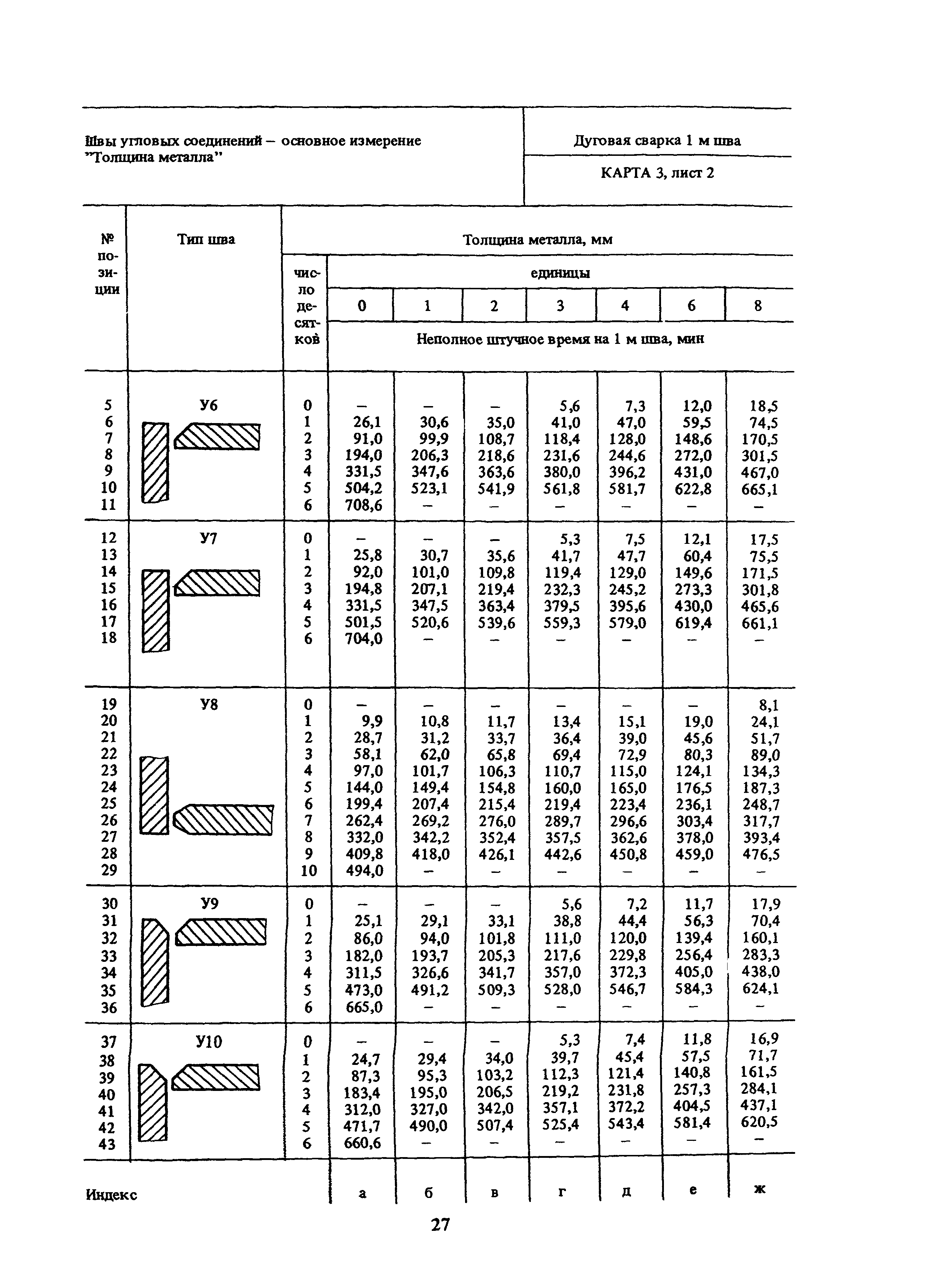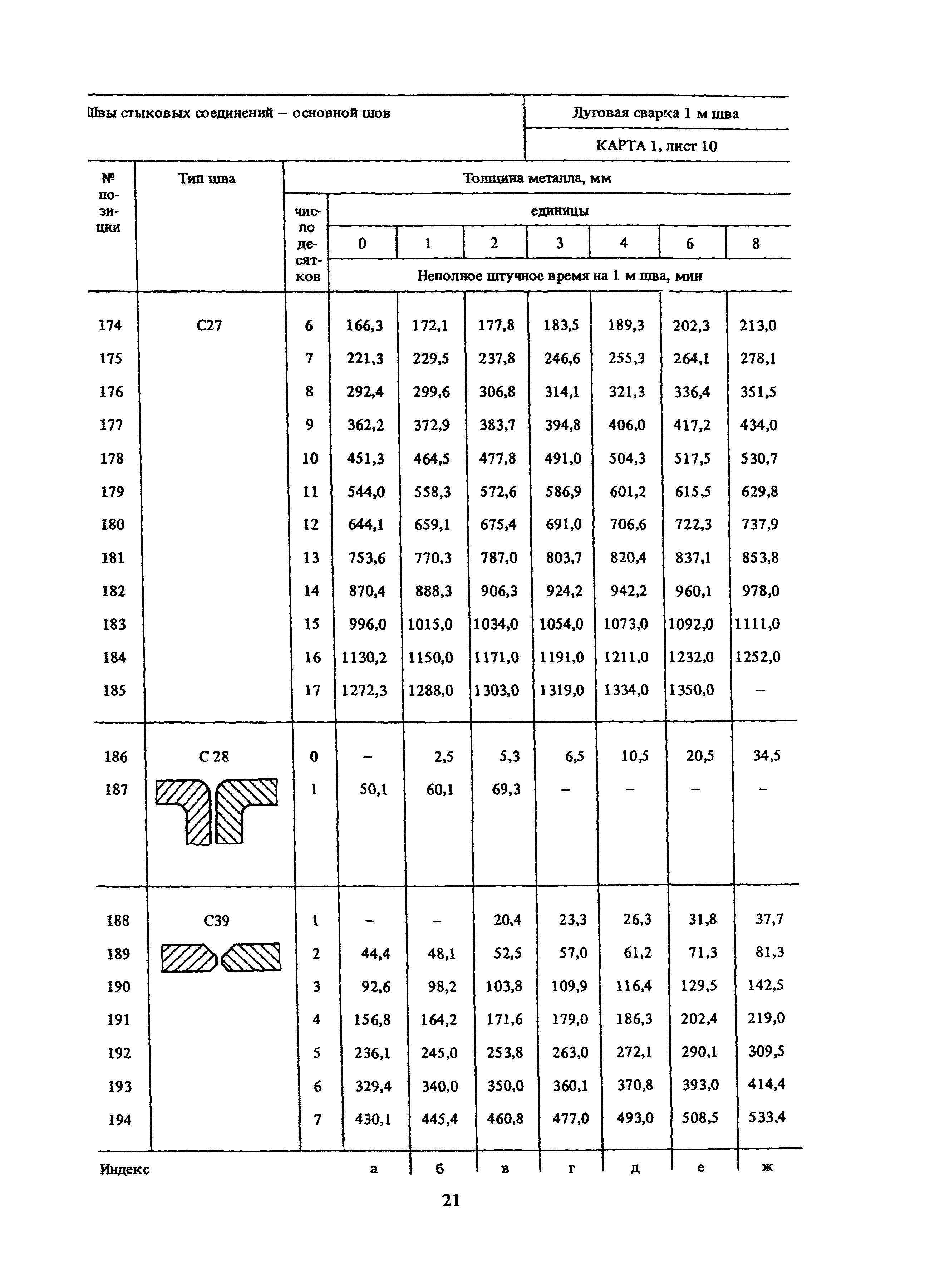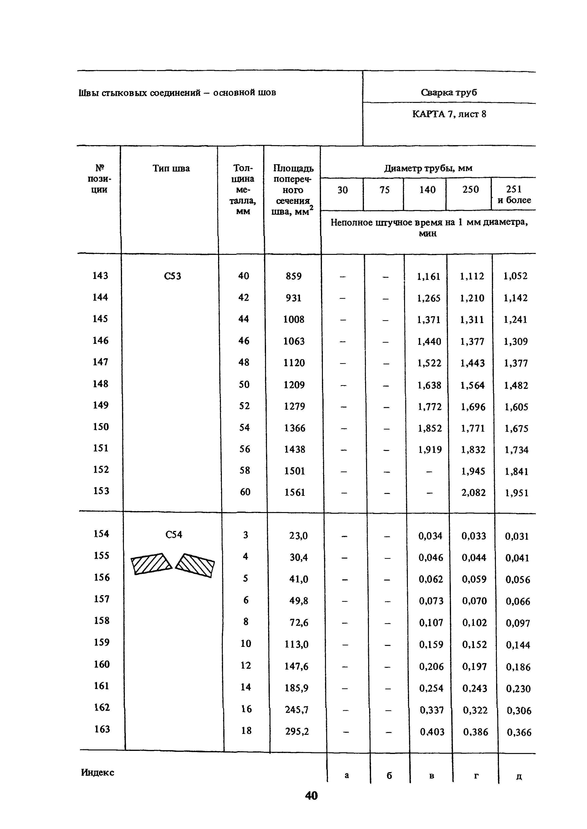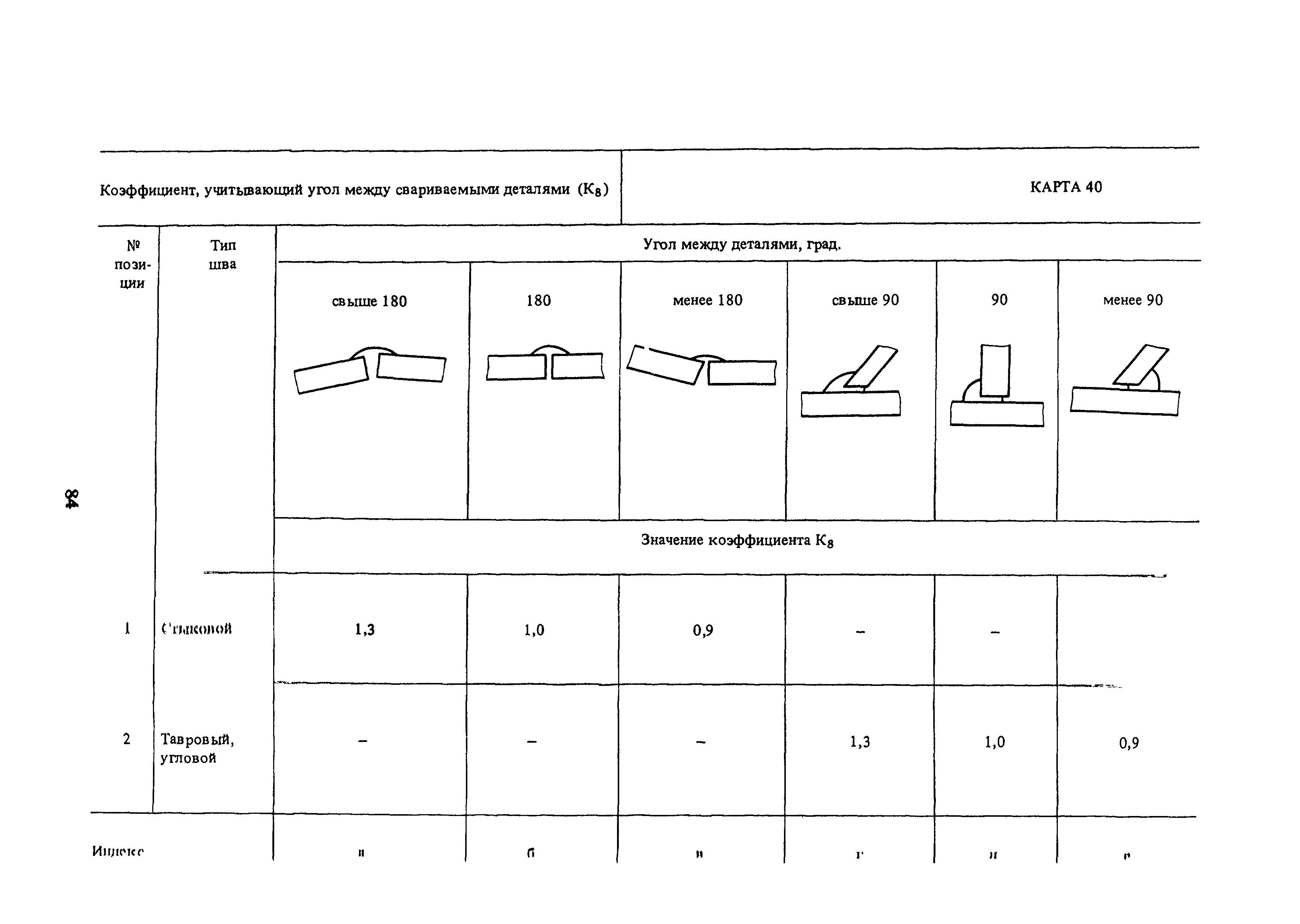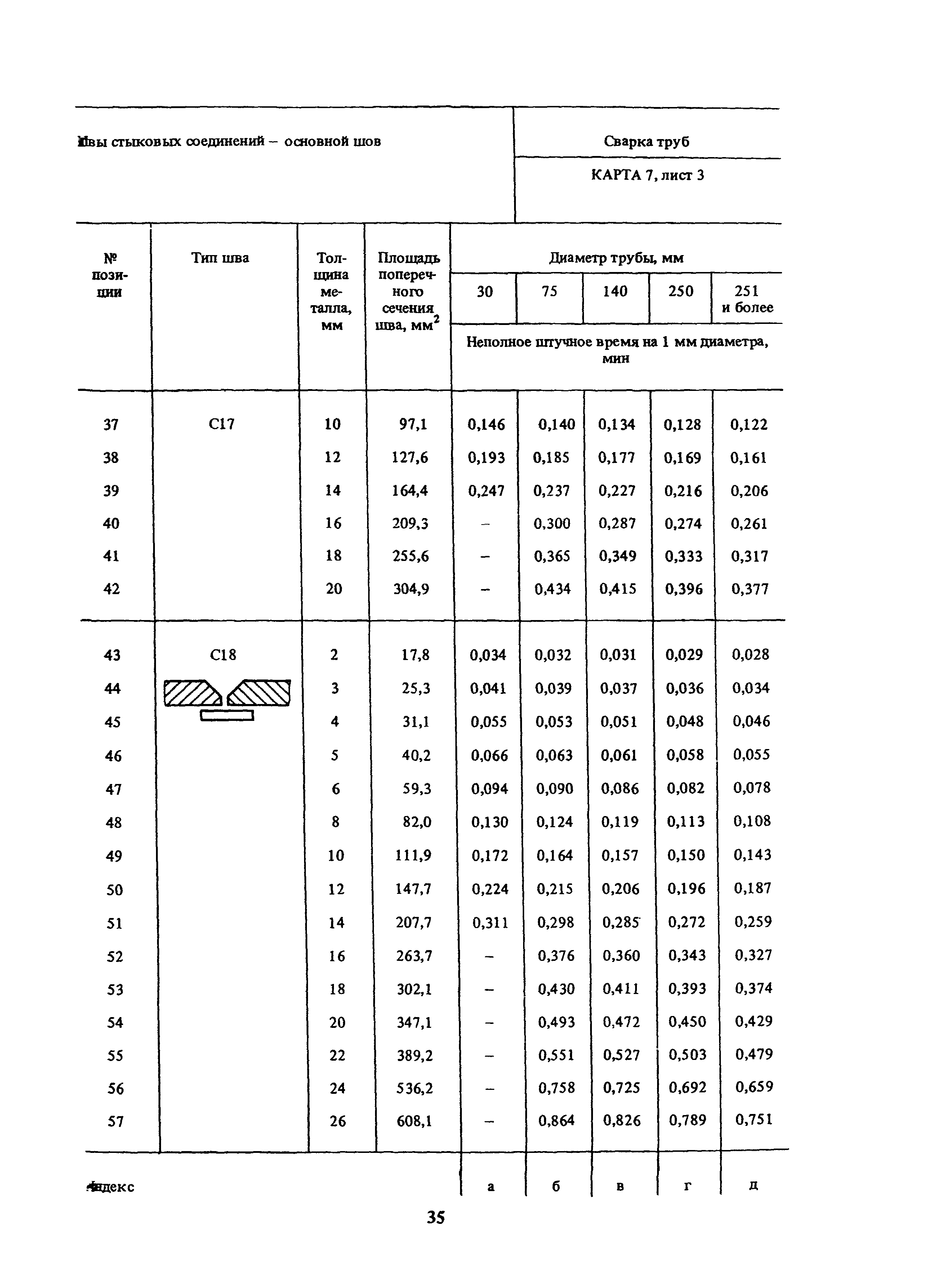 | Оглавление: | 1. Общая часть 2. Характеристика применяемого оборудования и технология работы 3. Организация труда 4. Нормативная часть 4.1. Неполное штучное время на 1 м сварного шва из листового и профильного проката 4.2. Неполное штучное время на сварку труб 4.3. Неполное штучное время на подварку корня шва 4.4. Вспомогательное время, зависящее от длины сварного шва, вошедшее в карты неполного штучного времени сварки (Твш) 4.5. Вспомогательное время, зависящее от длины свариваемого шва, не вошедшее в карты неполного штучного времени (Твш1) 4.6. Вспомогательное время, зависящее от изделия и типа обрудования (Тви) 4.7. Поправочные коэффициенты 4.8. Приложения Приложения 1. Расчетное значение силы тока в зависимости от толщины металла и диаметра электродов при сварке изделий Приложение 2. Площадь поперечного сечения основного шва стыковых соединений Приложение 3. Площадь поперечного сечения подварочного шва стыковых соединений Приложение 4. Площадь поперечного сечения шва угловых соединений Приложение 5. Площадь поперечного сечения подварочного шва угловых соединений Приложение 6. Площадь поперечного сечения шва тавровых соединений Приложение 7. Площадь поперечного сечения угловых, тавровых и нахлесточных соединений в зависимости от "Катета шва" Приложение 8. Площадь поперечного сечения шва первого и последующих проходов Приложение 9. Значение длины кольцевого стыка Приложение 10. Наименование, тип, вид шва и формулы расчета площади поперечного сечения швов |