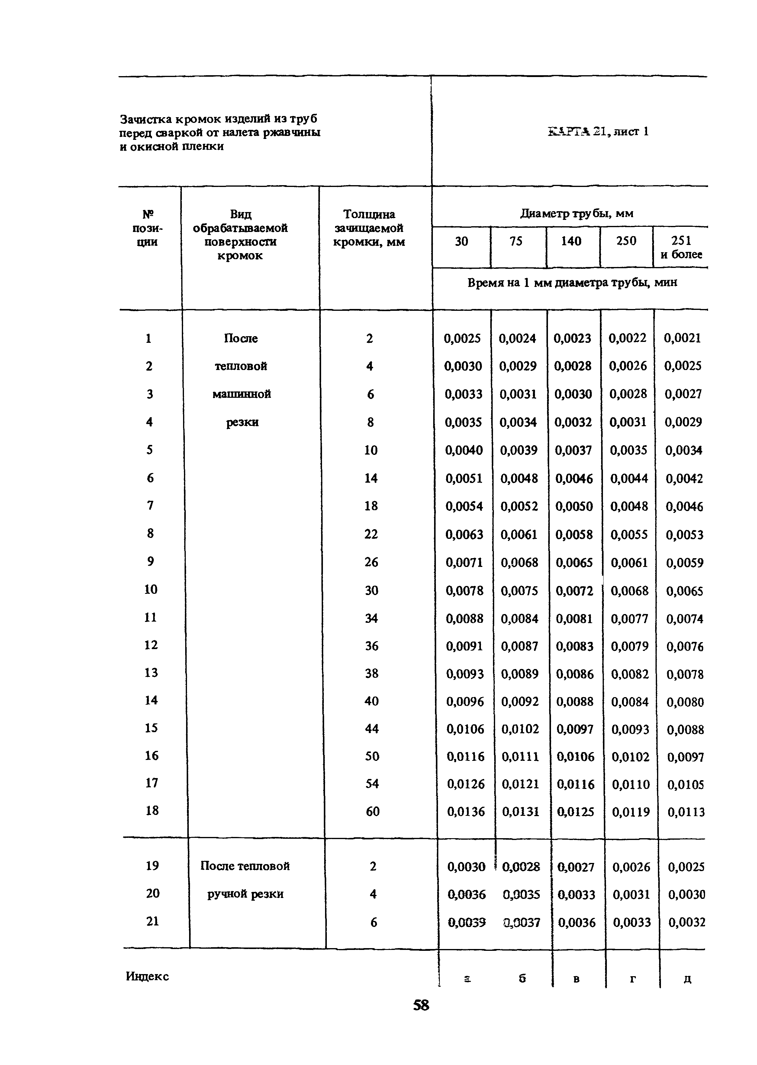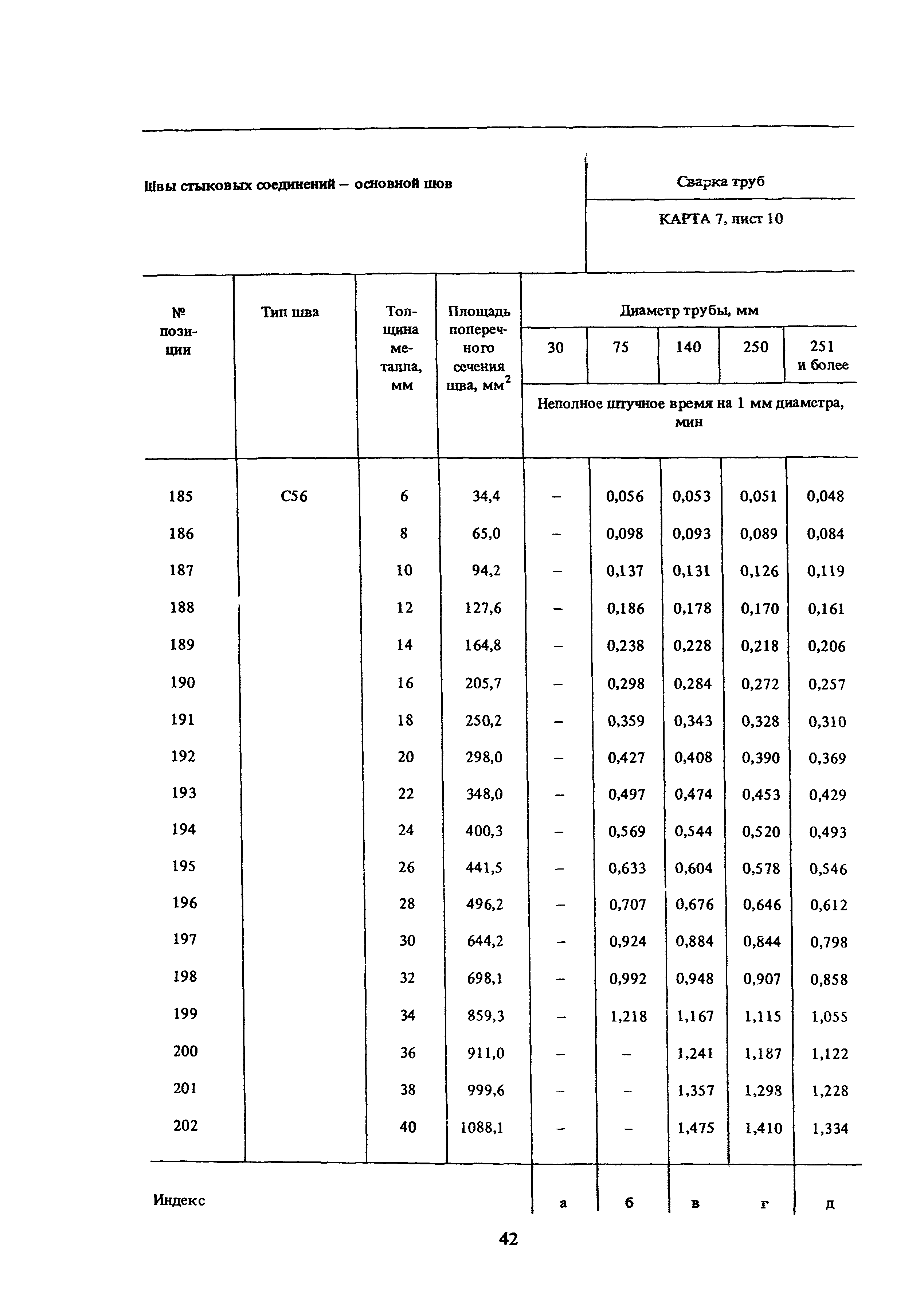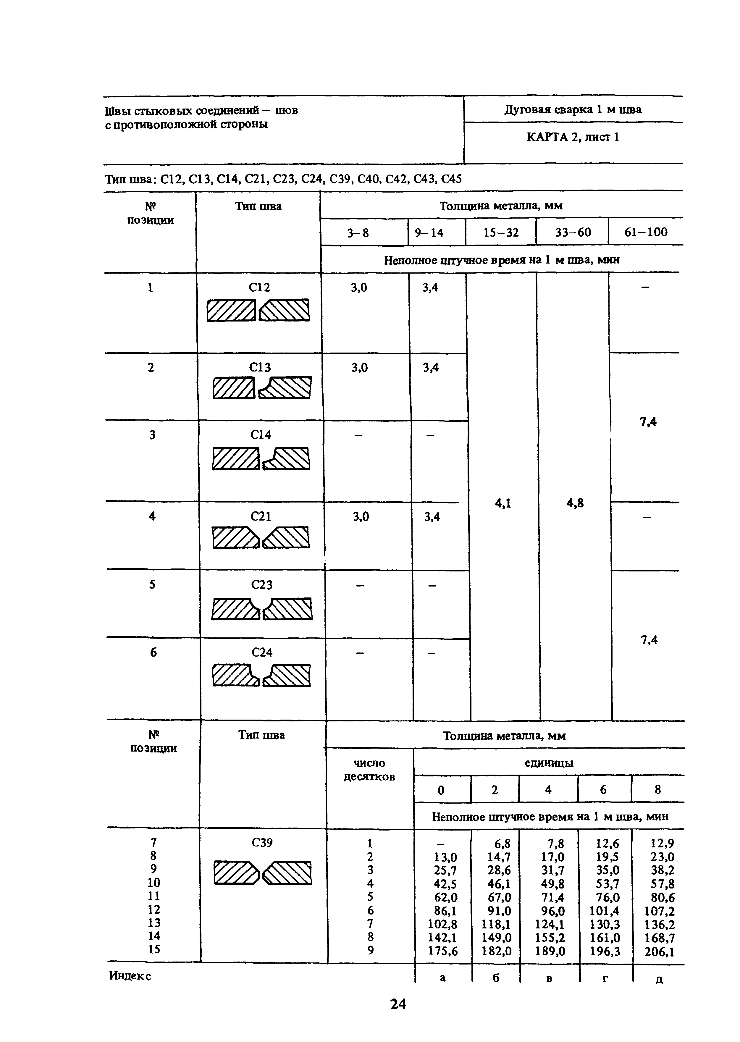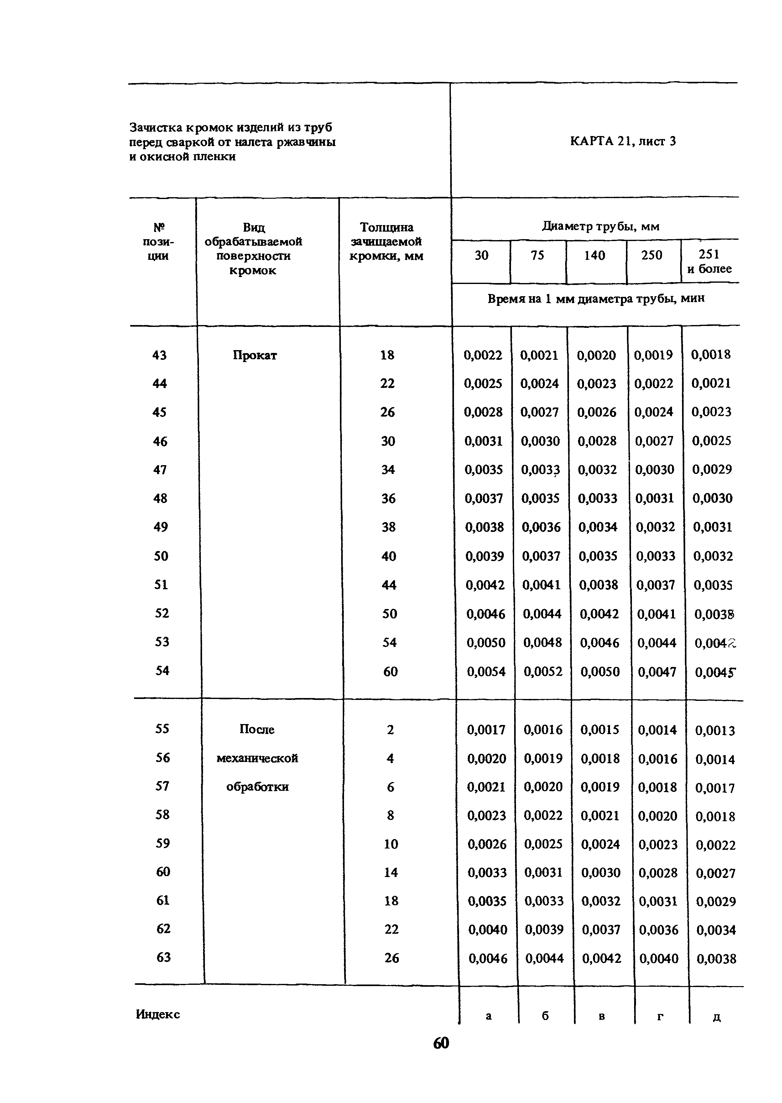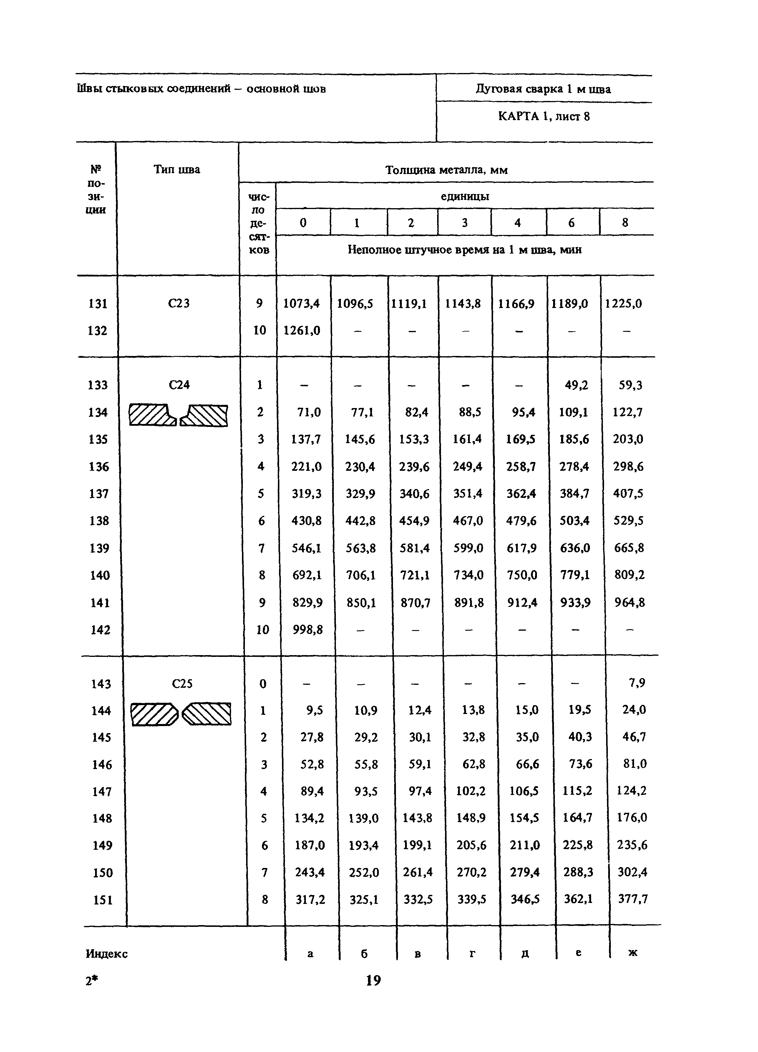 | Оглавление: | 1. Общая часть 2. Характеристика применяемого оборудования и технология работы 3. Организация труда 4. Нормативная часть 4.1. Неполное штучное время на 1 м сварного шва из листового и профильного проката 4.2. Неполное штучное время на сварку труб 4.3. Неполное штучное время на подварку корня шва 4.4. Вспомогательное время, зависящее от длины сварного шва, вошедшее в карты неполного штучного времени сварки (Твш) 4.5. Вспомогательное время, зависящее от длины свариваемого шва, не вошедшее в карты неполного штучного времени (Твш1) 4.6. Вспомогательное время, зависящее от изделия и типа обрудования (Тви) 4.7. Поправочные коэффициенты 4.8. Приложения Приложения 1. Расчетное значение силы тока в зависимости от толщины металла и диаметра электродов при сварке изделий Приложение 2. Площадь поперечного сечения основного шва стыковых соединений Приложение 3. Площадь поперечного сечения подварочного шва стыковых соединений Приложение 4. Площадь поперечного сечения шва угловых соединений Приложение 5. Площадь поперечного сечения подварочного шва угловых соединений Приложение 6. Площадь поперечного сечения шва тавровых соединений Приложение 7. Площадь поперечного сечения угловых, тавровых и нахлесточных соединений в зависимости от "Катета шва" Приложение 8. Площадь поперечного сечения шва первого и последующих проходов Приложение 9. Значение длины кольцевого стыка Приложение 10. Наименование, тип, вид шва и формулы расчета площади поперечного сечения швов |