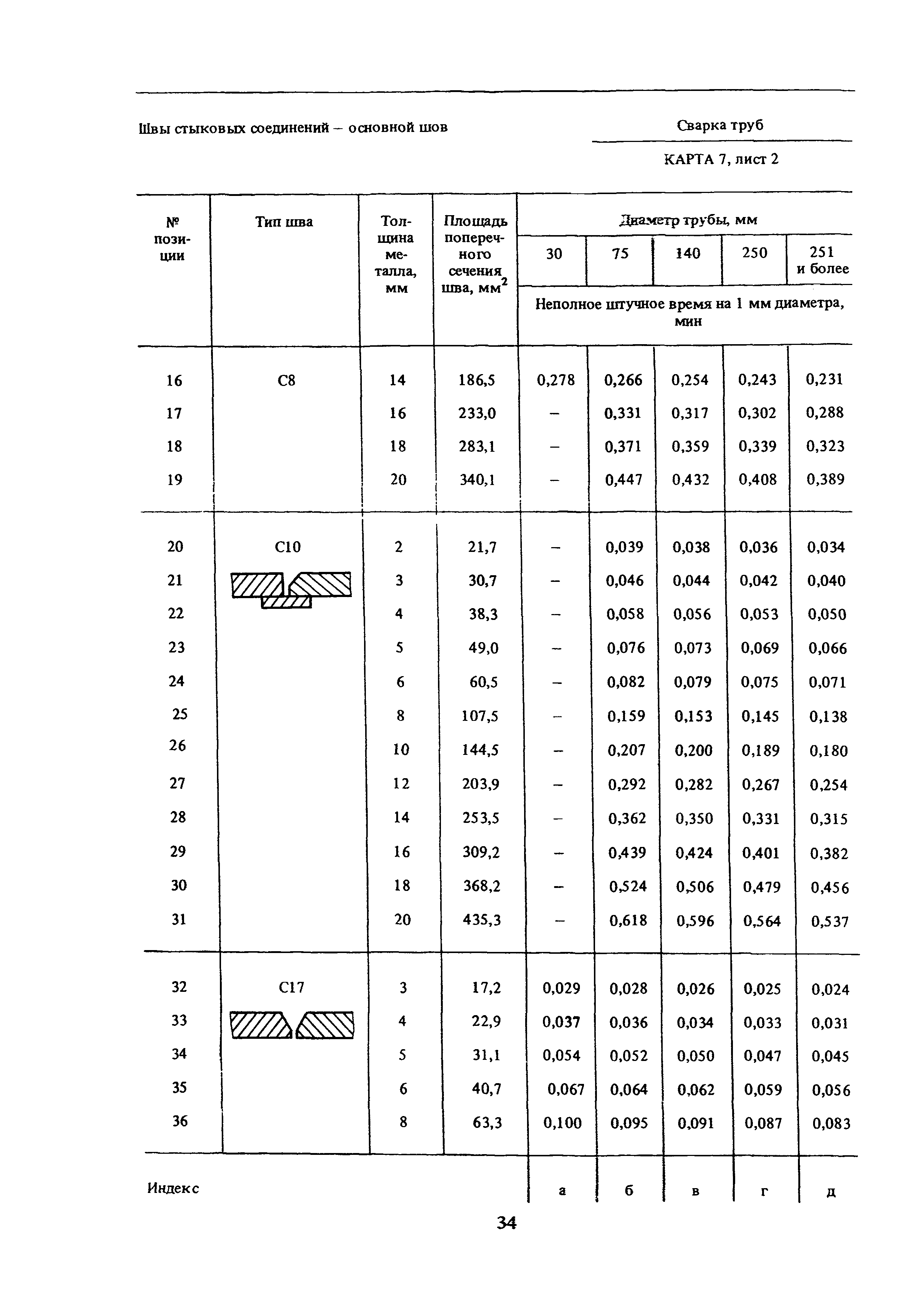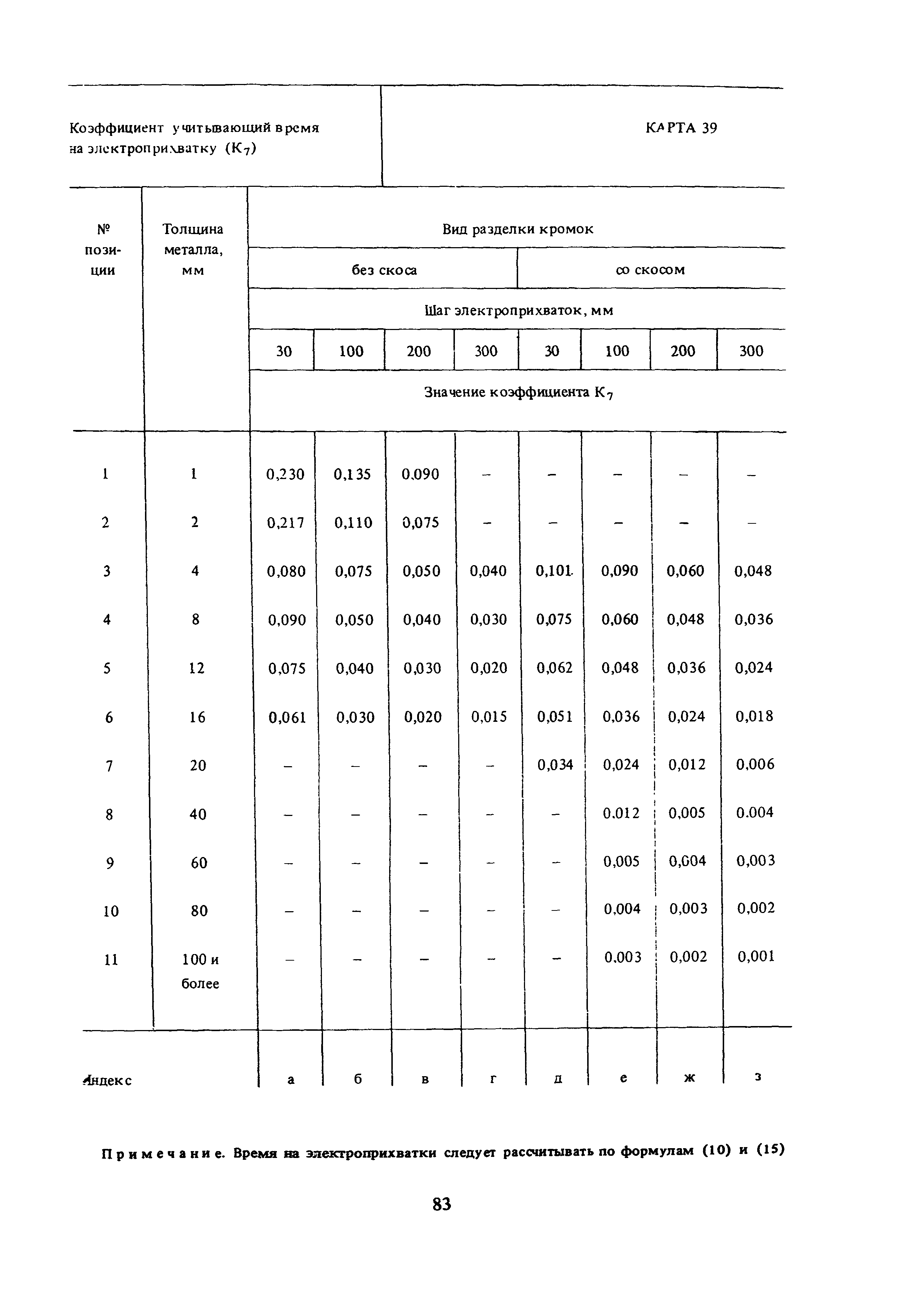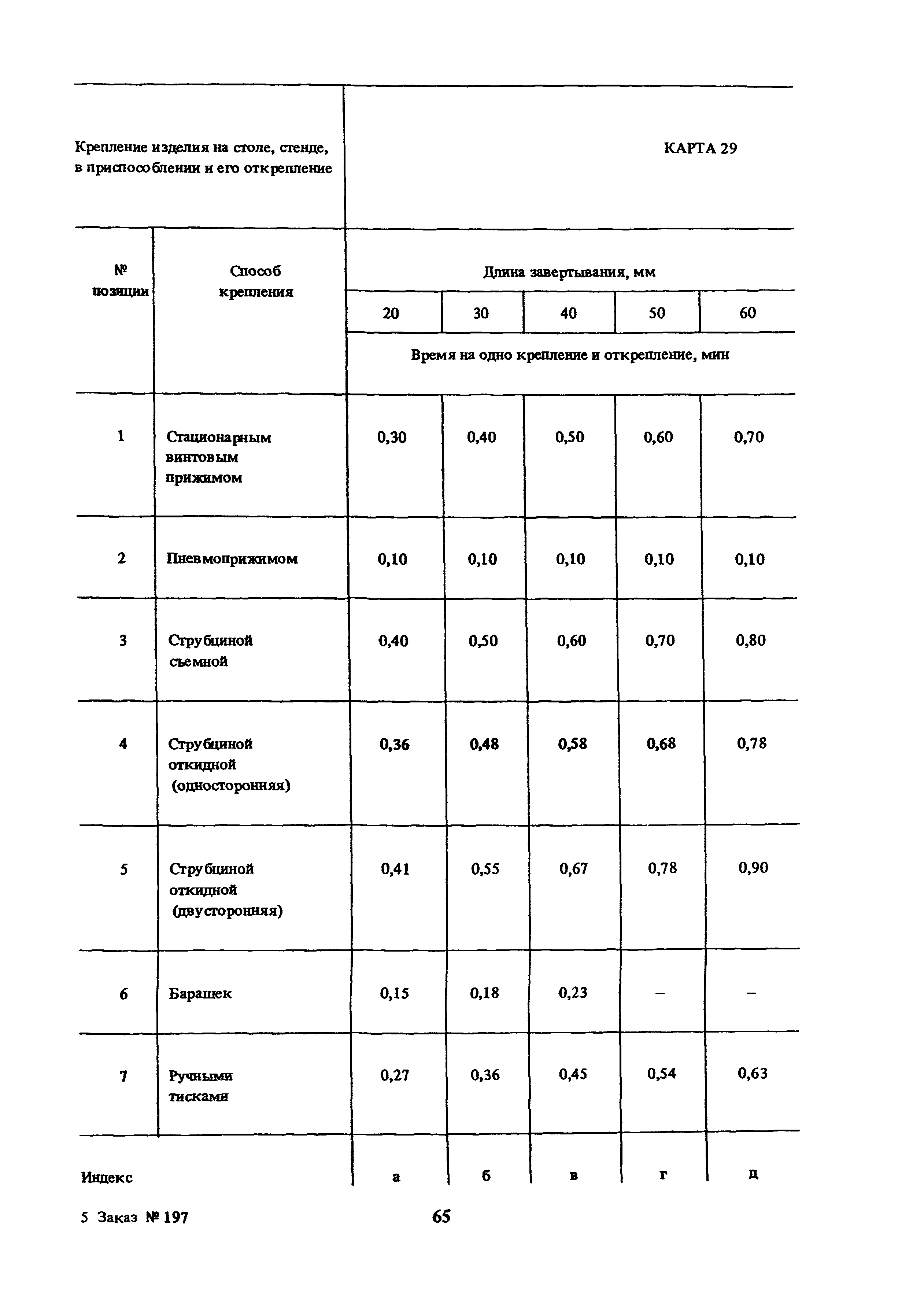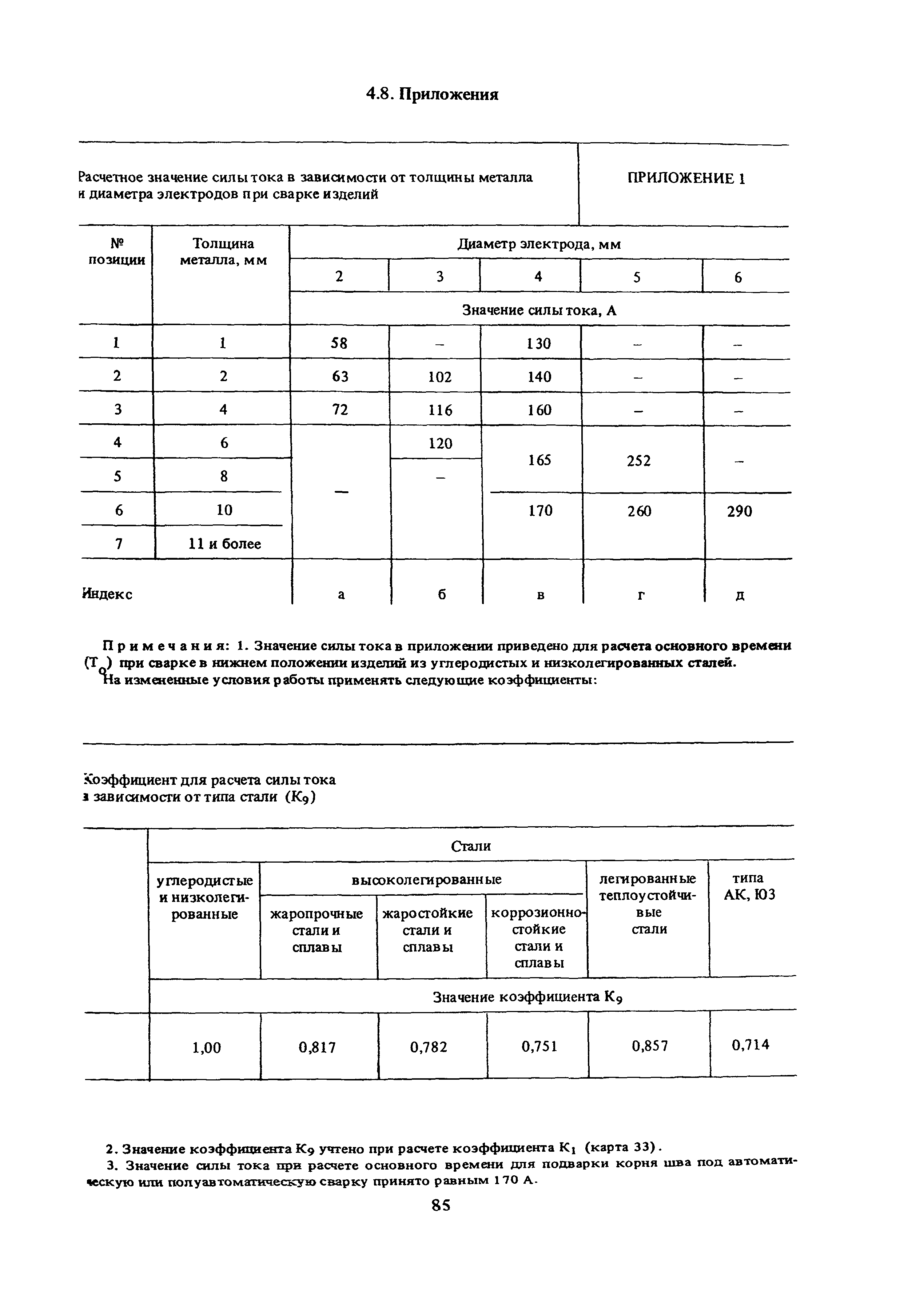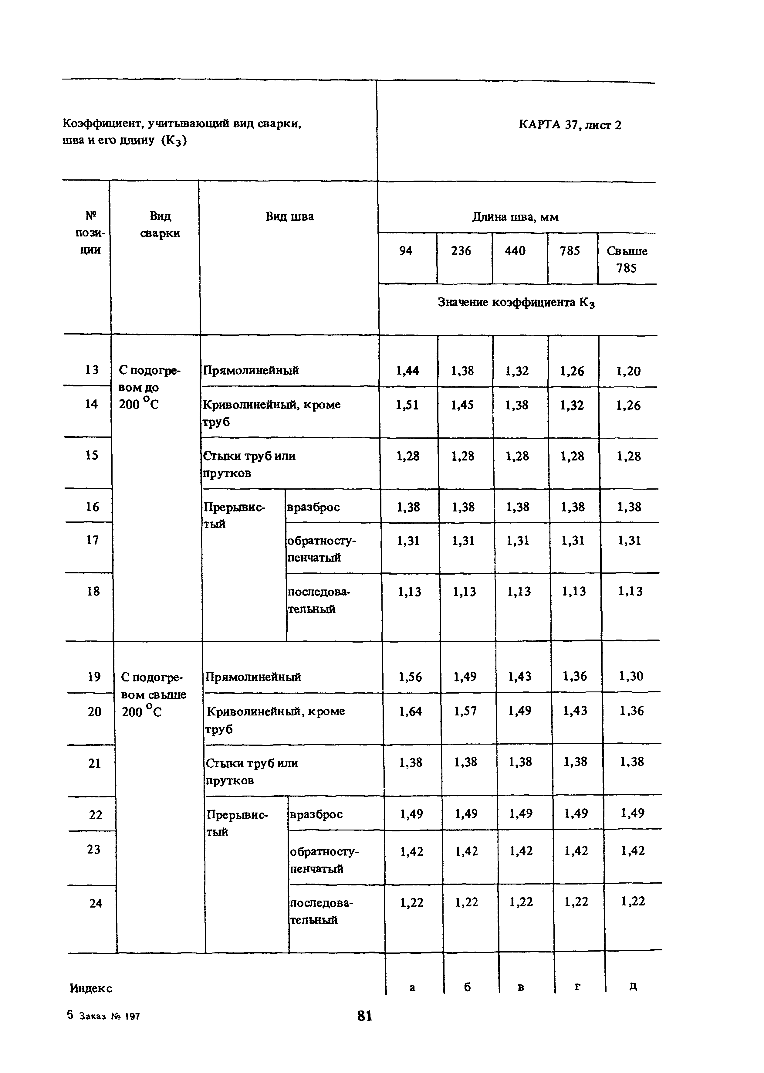 | Оглавление: | 1. Общая часть 2. Характеристика применяемого оборудования и технология работы 3. Организация труда 4. Нормативная часть 4.1. Неполное штучное время на 1 м сварного шва из листового и профильного проката 4.2. Неполное штучное время на сварку труб 4.3. Неполное штучное время на подварку корня шва 4.4. Вспомогательное время, зависящее от длины сварного шва, вошедшее в карты неполного штучного времени сварки (Твш) 4.5. Вспомогательное время, зависящее от длины свариваемого шва, не вошедшее в карты неполного штучного времени (Твш1) 4.6. Вспомогательное время, зависящее от изделия и типа обрудования (Тви) 4.7. Поправочные коэффициенты 4.8. Приложения Приложения 1. Расчетное значение силы тока в зависимости от толщины металла и диаметра электродов при сварке изделий Приложение 2. Площадь поперечного сечения основного шва стыковых соединений Приложение 3. Площадь поперечного сечения подварочного шва стыковых соединений Приложение 4. Площадь поперечного сечения шва угловых соединений Приложение 5. Площадь поперечного сечения подварочного шва угловых соединений Приложение 6. Площадь поперечного сечения шва тавровых соединений Приложение 7. Площадь поперечного сечения угловых, тавровых и нахлесточных соединений в зависимости от "Катета шва" Приложение 8. Площадь поперечного сечения шва первого и последующих проходов Приложение 9. Значение длины кольцевого стыка Приложение 10. Наименование, тип, вид шва и формулы расчета площади поперечного сечения швов |