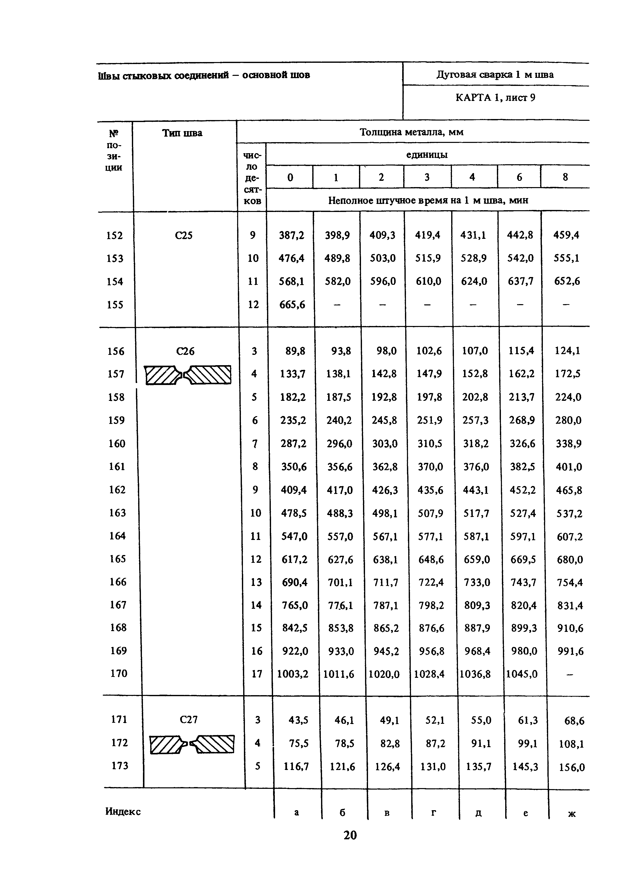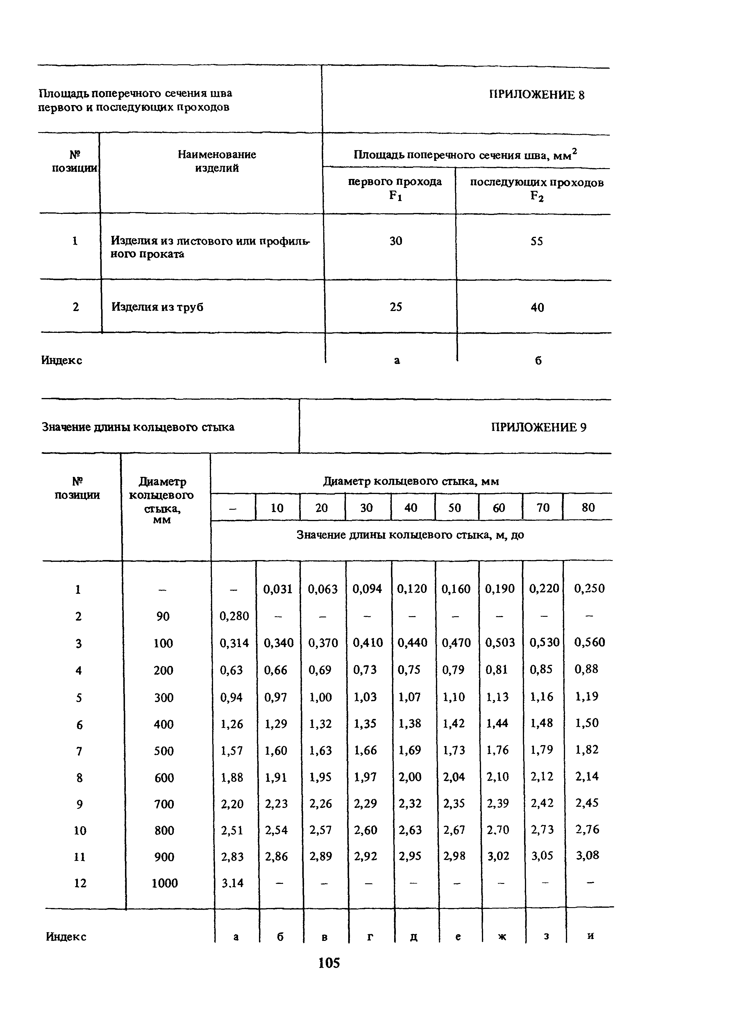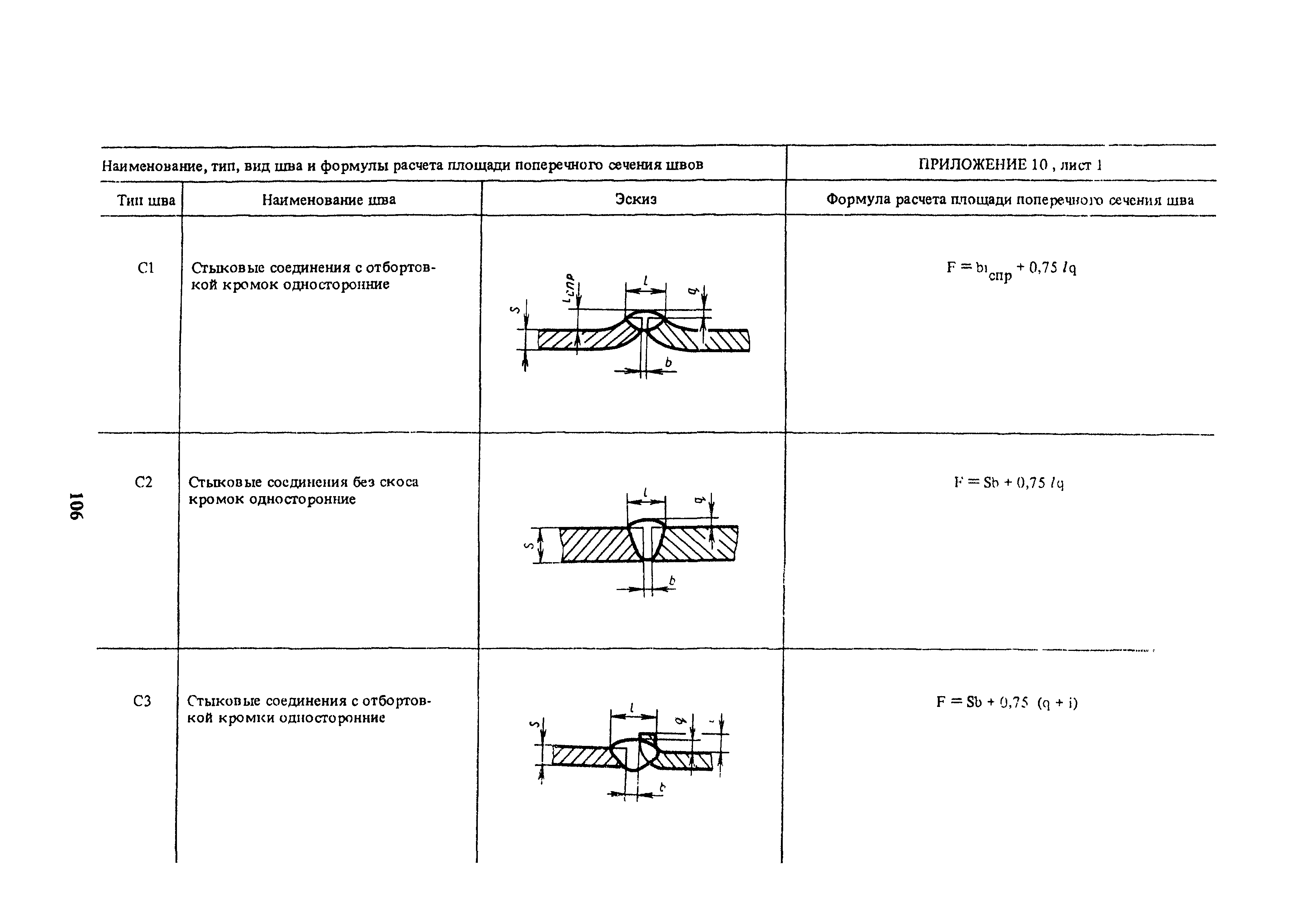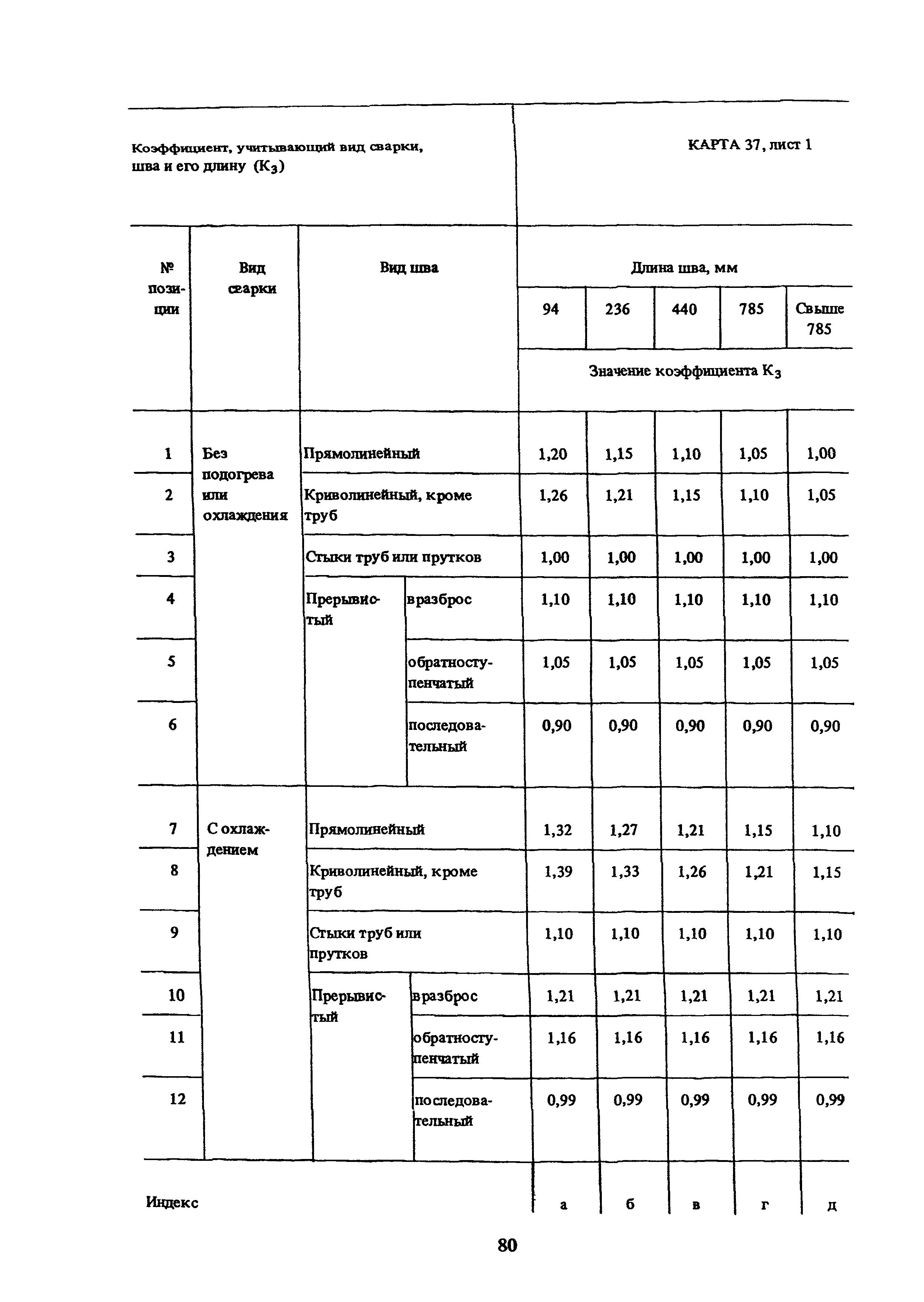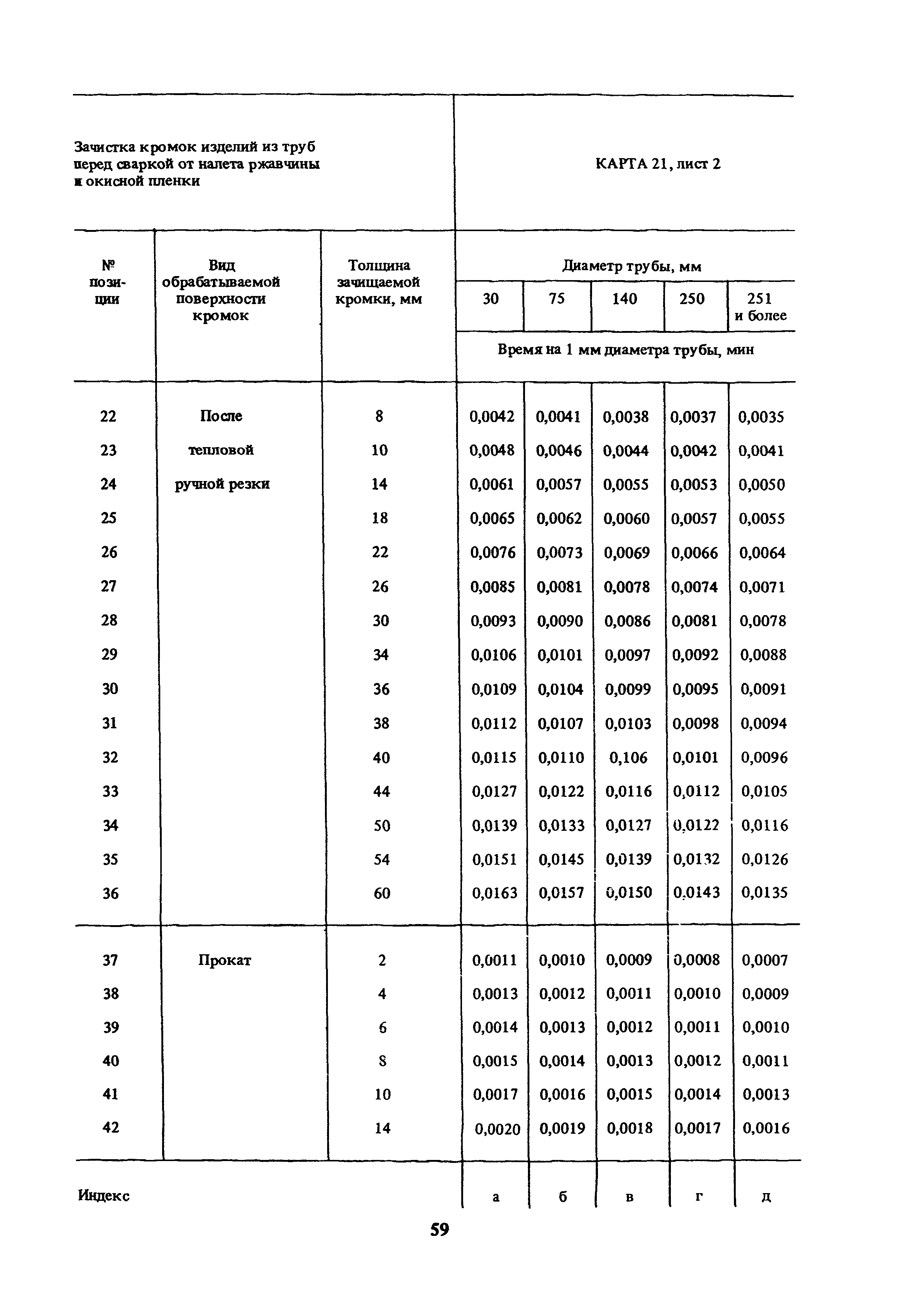 | Оглавление: | 1. Общая часть 2. Характеристика применяемого оборудования и технология работы 3. Организация труда 4. Нормативная часть 4.1. Неполное штучное время на 1 м сварного шва из листового и профильного проката 4.2. Неполное штучное время на сварку труб 4.3. Неполное штучное время на подварку корня шва 4.4. Вспомогательное время, зависящее от длины сварного шва, вошедшее в карты неполного штучного времени сварки (Твш) 4.5. Вспомогательное время, зависящее от длины свариваемого шва, не вошедшее в карты неполного штучного времени (Твш1) 4.6. Вспомогательное время, зависящее от изделия и типа обрудования (Тви) 4.7. Поправочные коэффициенты 4.8. Приложения Приложения 1. Расчетное значение силы тока в зависимости от толщины металла и диаметра электродов при сварке изделий Приложение 2. Площадь поперечного сечения основного шва стыковых соединений Приложение 3. Площадь поперечного сечения подварочного шва стыковых соединений Приложение 4. Площадь поперечного сечения шва угловых соединений Приложение 5. Площадь поперечного сечения подварочного шва угловых соединений Приложение 6. Площадь поперечного сечения шва тавровых соединений Приложение 7. Площадь поперечного сечения угловых, тавровых и нахлесточных соединений в зависимости от "Катета шва" Приложение 8. Площадь поперечного сечения шва первого и последующих проходов Приложение 9. Значение длины кольцевого стыка Приложение 10. Наименование, тип, вид шва и формулы расчета площади поперечного сечения швов |