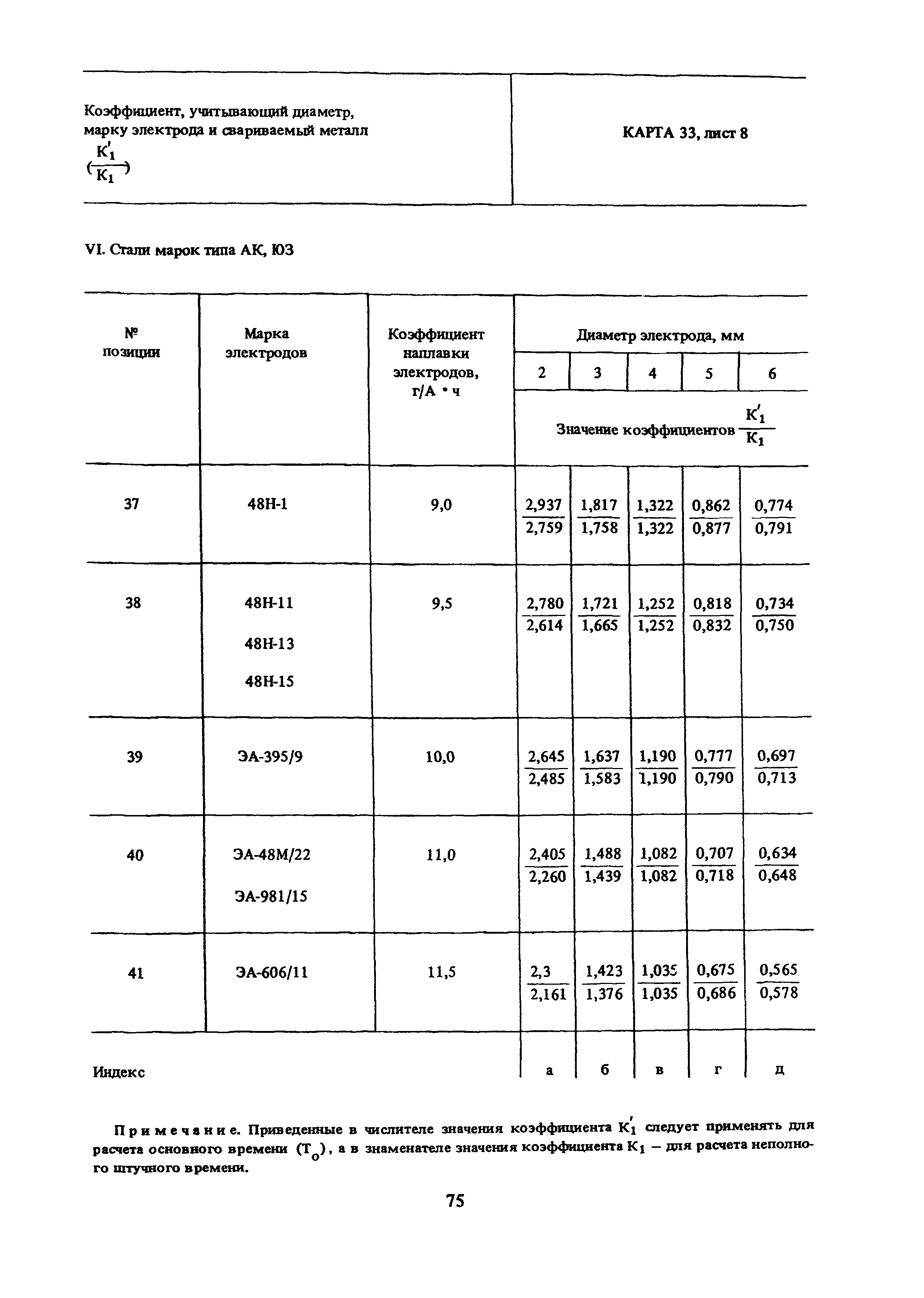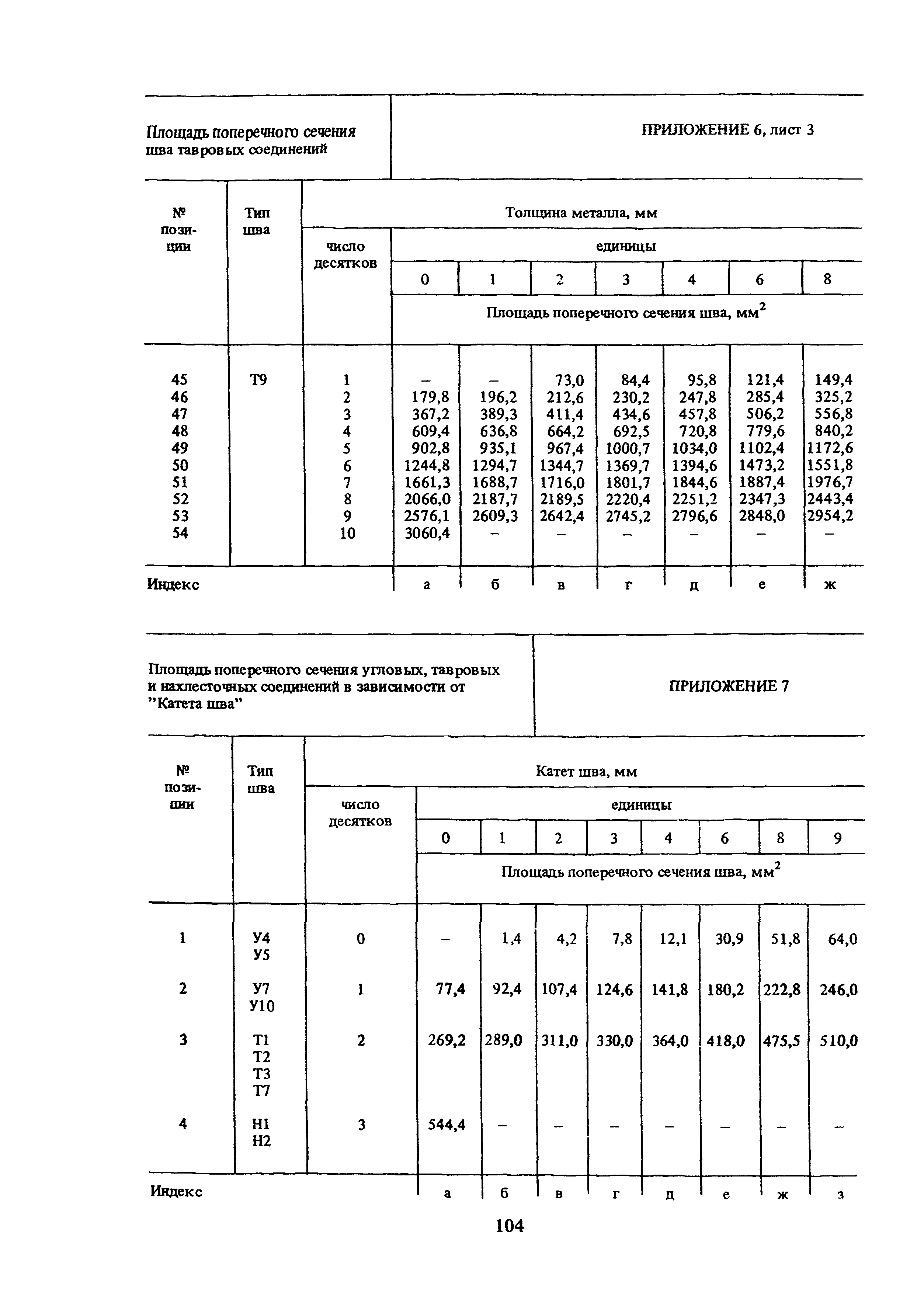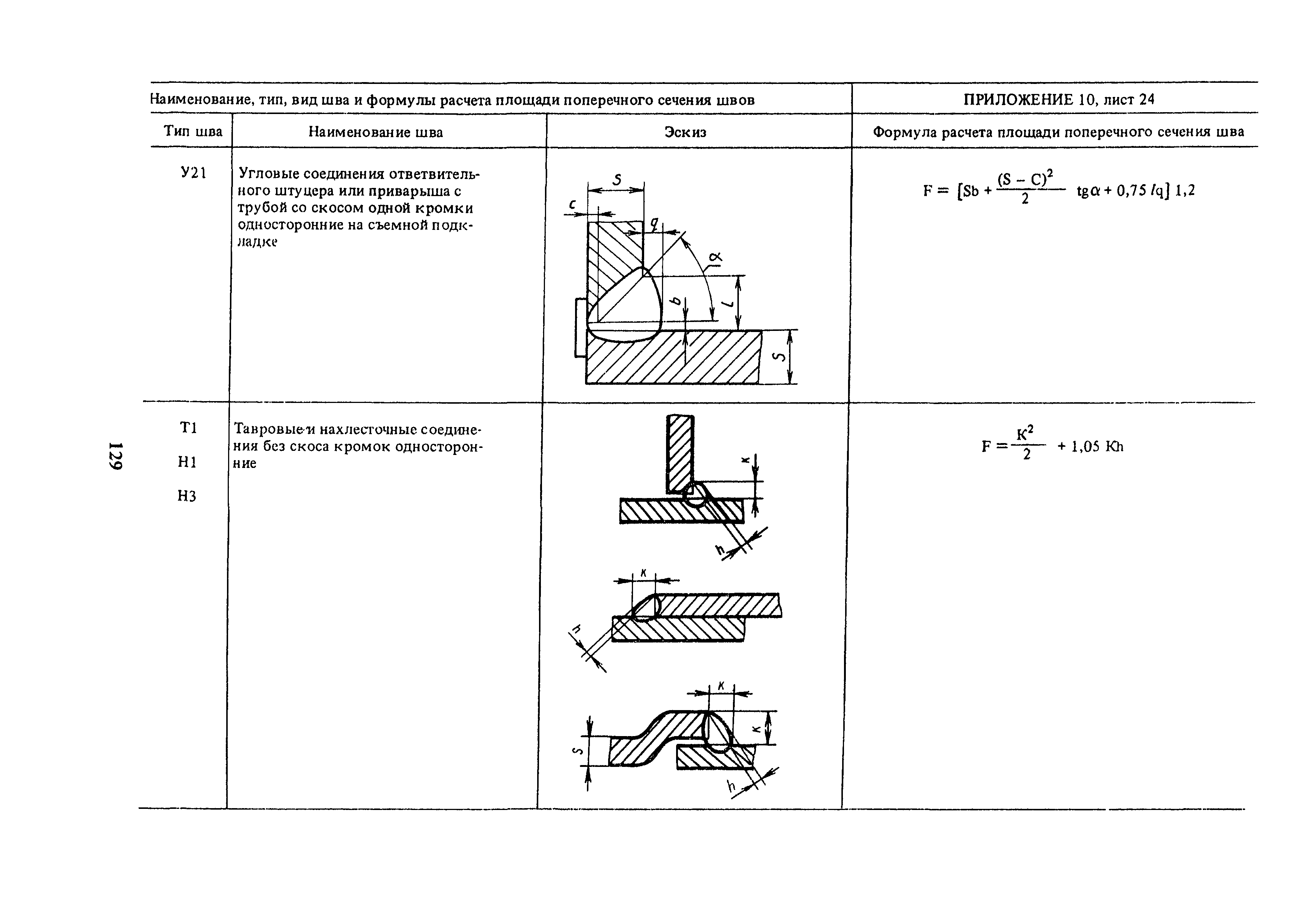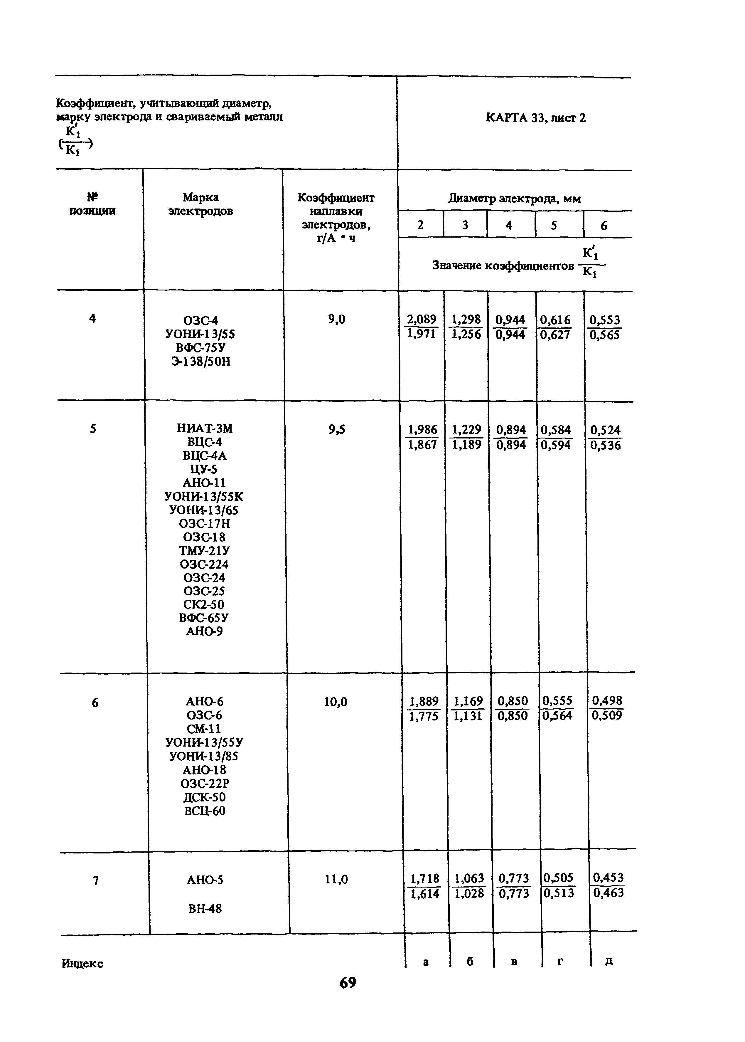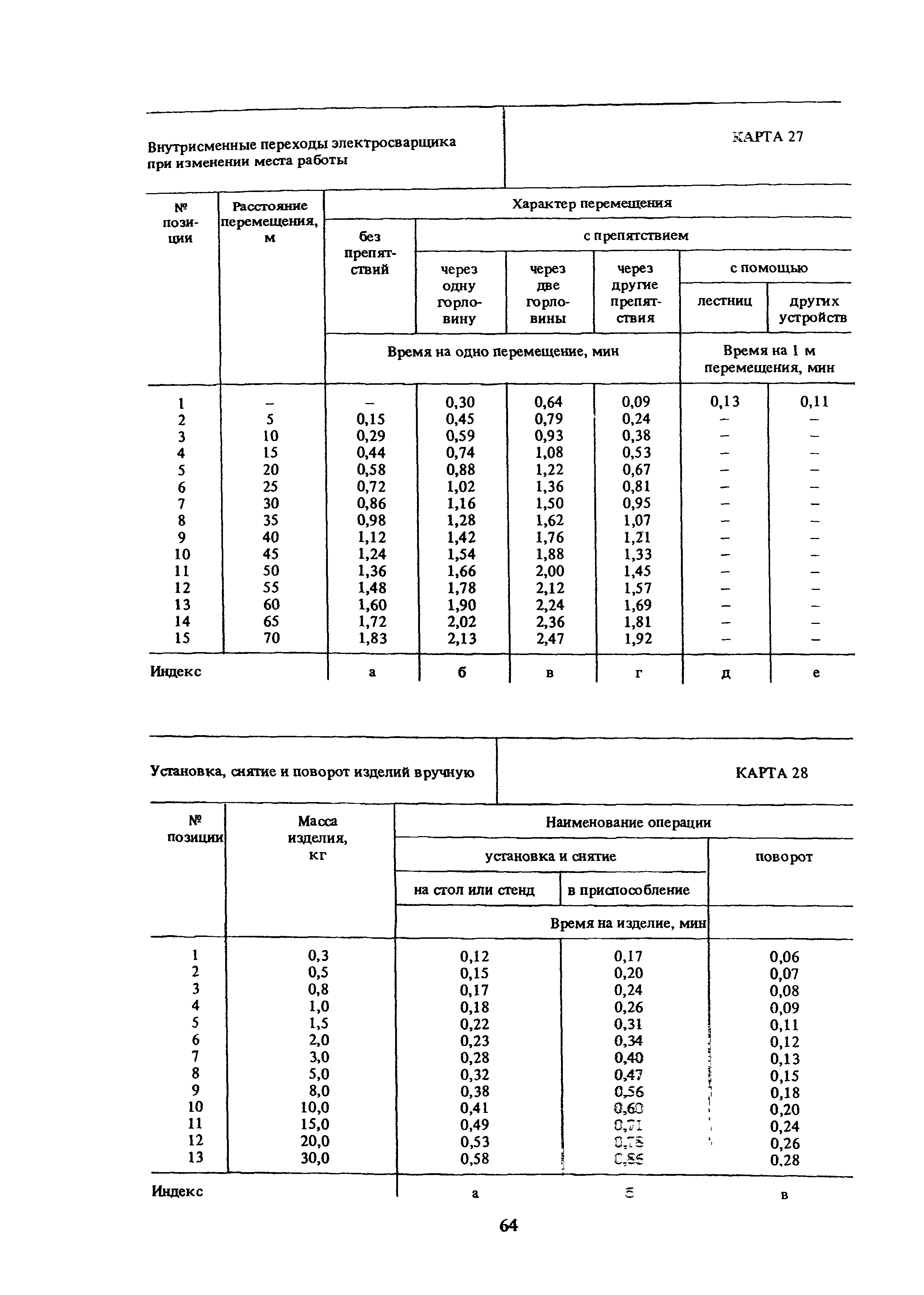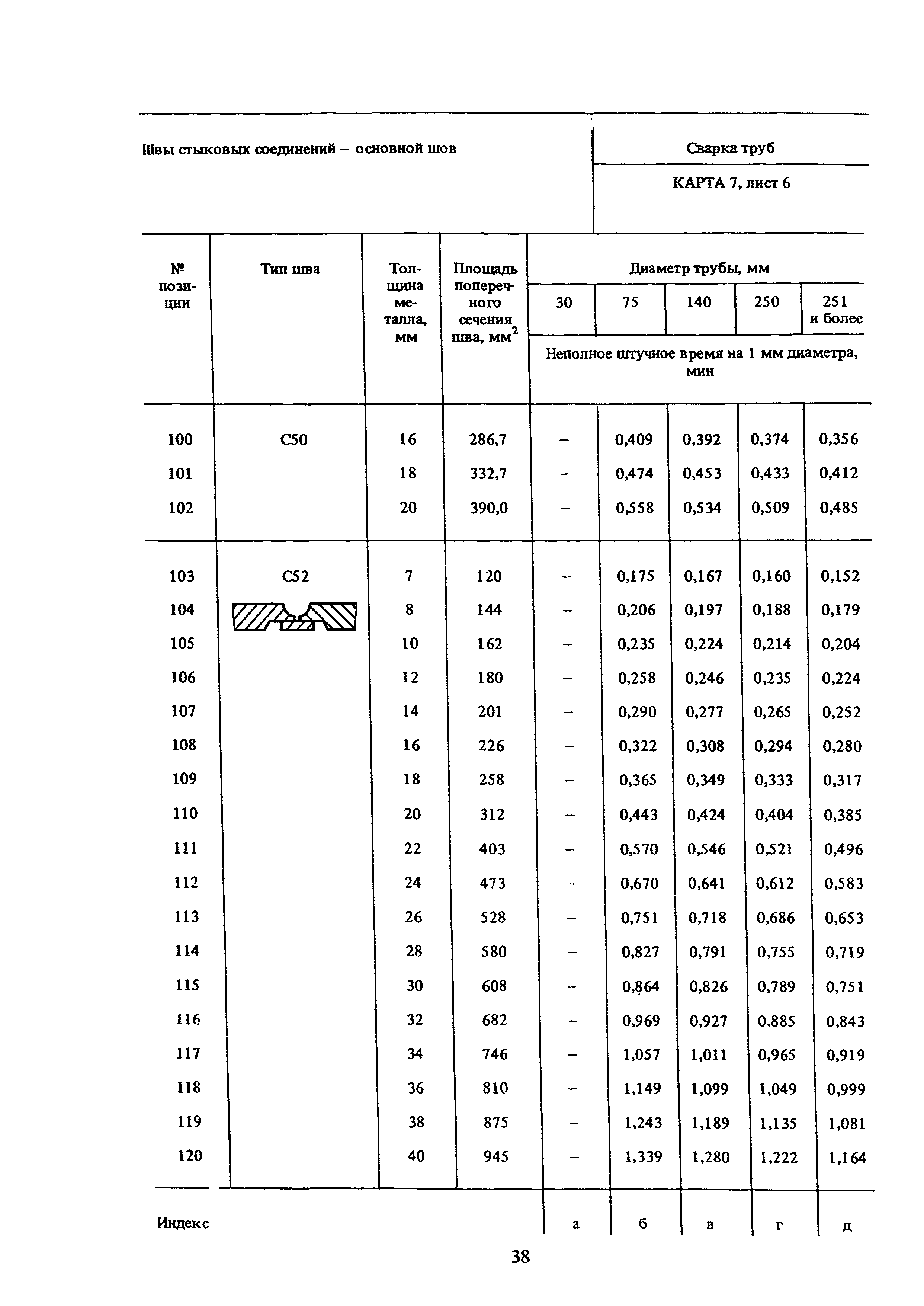 | Оглавление: | 1. Общая часть 2. Характеристика применяемого оборудования и технология работы 3. Организация труда 4. Нормативная часть 4.1. Неполное штучное время на 1 м сварного шва из листового и профильного проката 4.2. Неполное штучное время на сварку труб 4.3. Неполное штучное время на подварку корня шва 4.4. Вспомогательное время, зависящее от длины сварного шва, вошедшее в карты неполного штучного времени сварки (Твш) 4.5. Вспомогательное время, зависящее от длины свариваемого шва, не вошедшее в карты неполного штучного времени (Твш1) 4.6. Вспомогательное время, зависящее от изделия и типа обрудования (Тви) 4.7. Поправочные коэффициенты 4.8. Приложения Приложения 1. Расчетное значение силы тока в зависимости от толщины металла и диаметра электродов при сварке изделий Приложение 2. Площадь поперечного сечения основного шва стыковых соединений Приложение 3. Площадь поперечного сечения подварочного шва стыковых соединений Приложение 4. Площадь поперечного сечения шва угловых соединений Приложение 5. Площадь поперечного сечения подварочного шва угловых соединений Приложение 6. Площадь поперечного сечения шва тавровых соединений Приложение 7. Площадь поперечного сечения угловых, тавровых и нахлесточных соединений в зависимости от "Катета шва" Приложение 8. Площадь поперечного сечения шва первого и последующих проходов Приложение 9. Значение длины кольцевого стыка Приложение 10. Наименование, тип, вид шва и формулы расчета площади поперечного сечения швов |