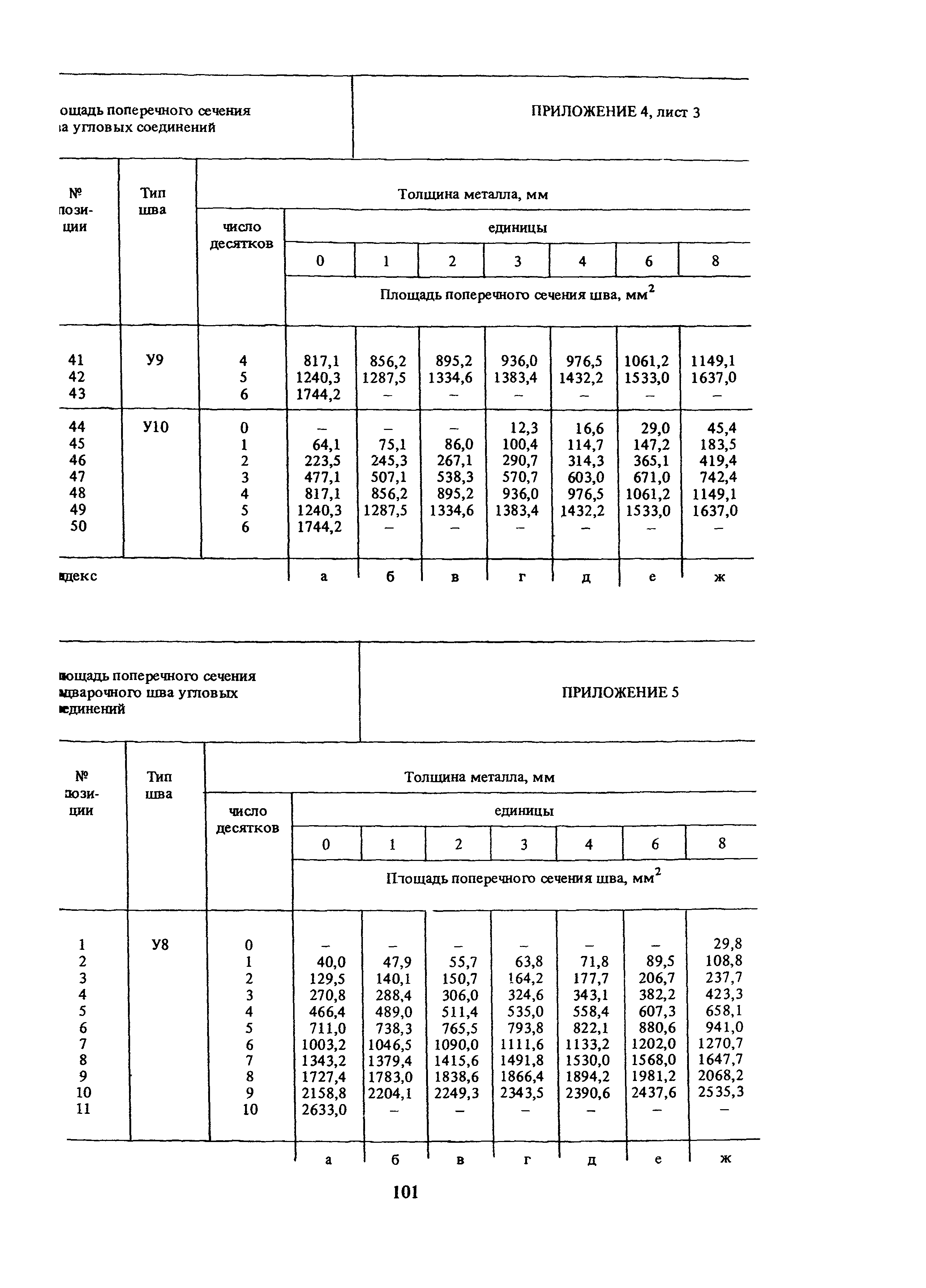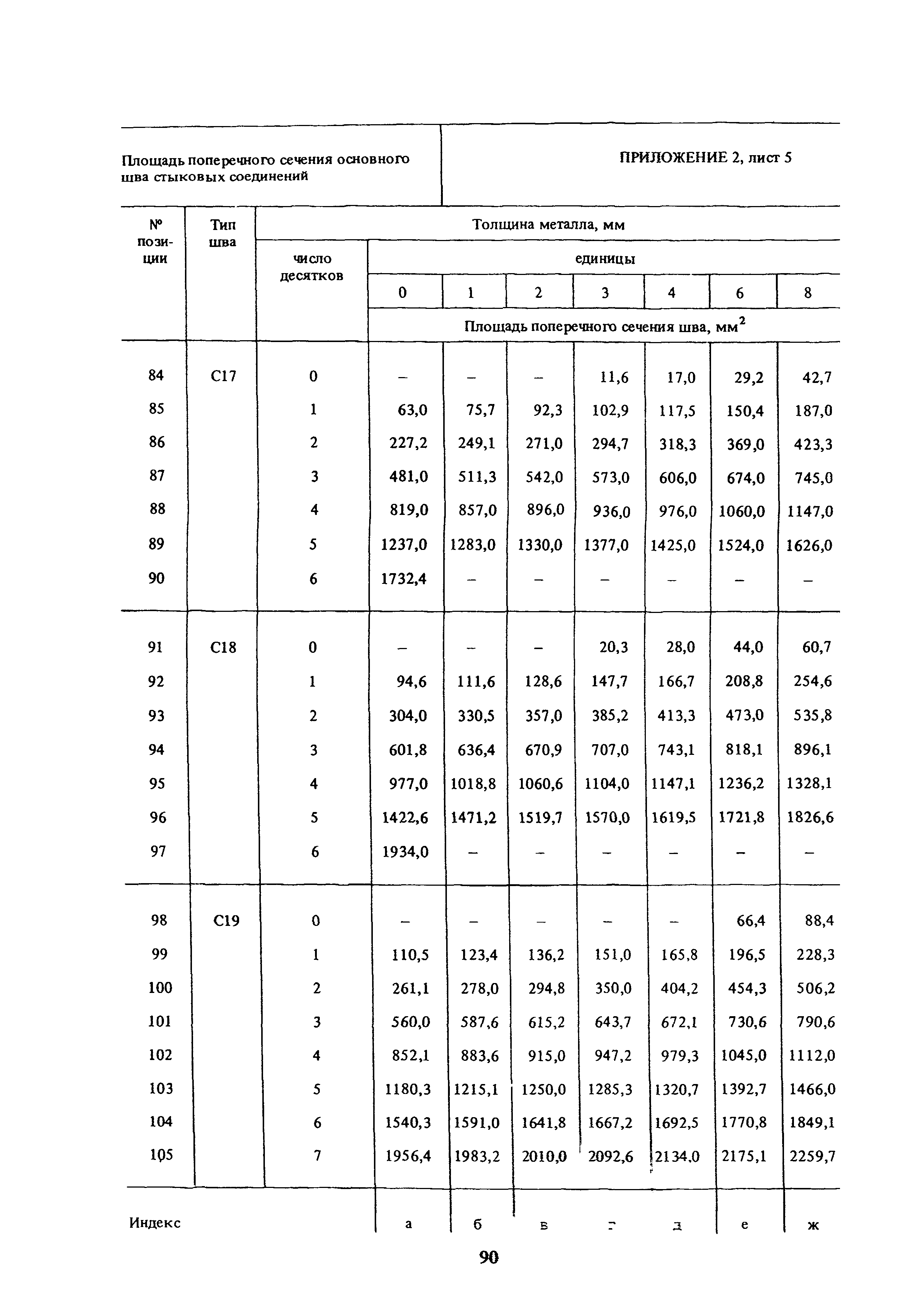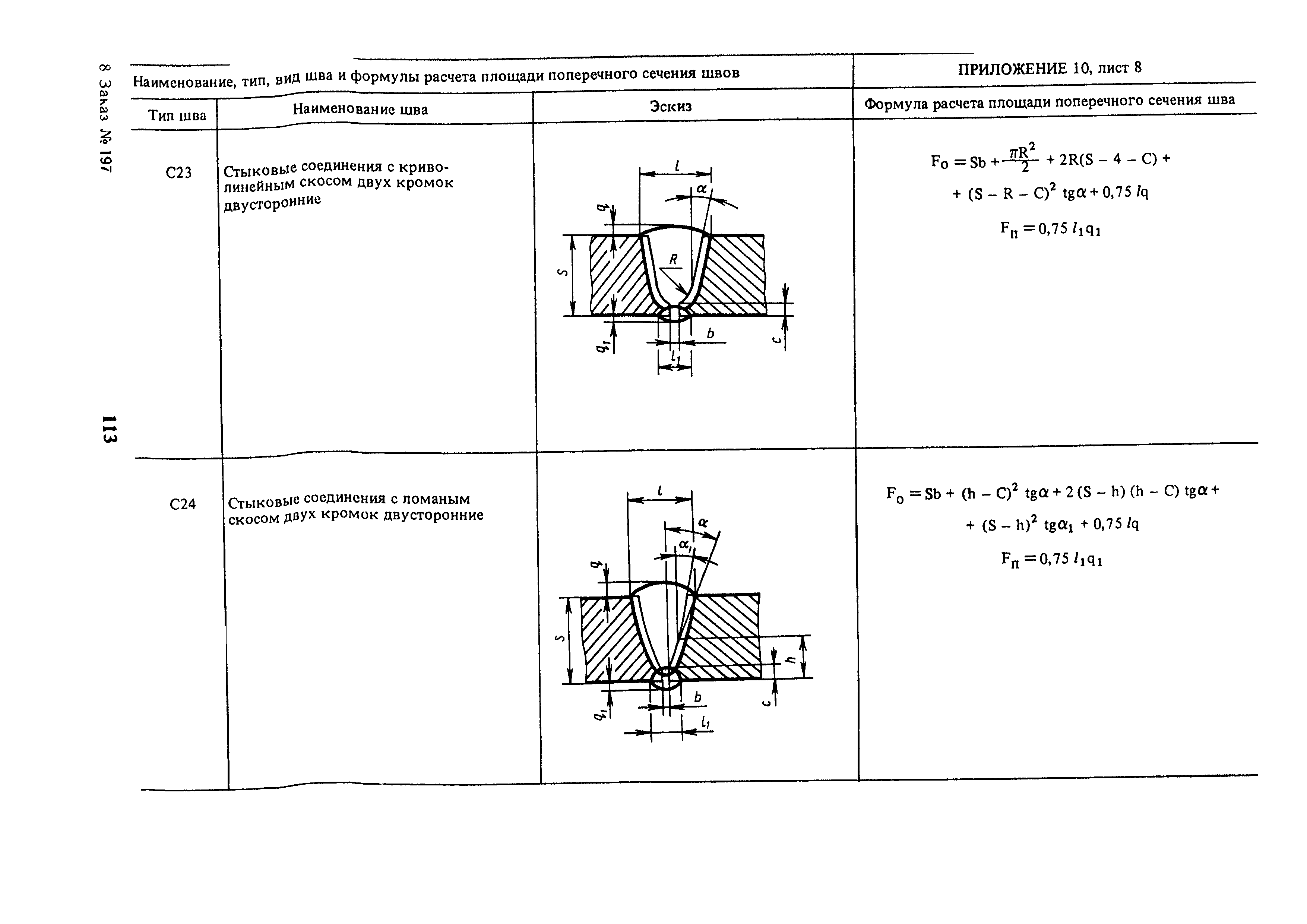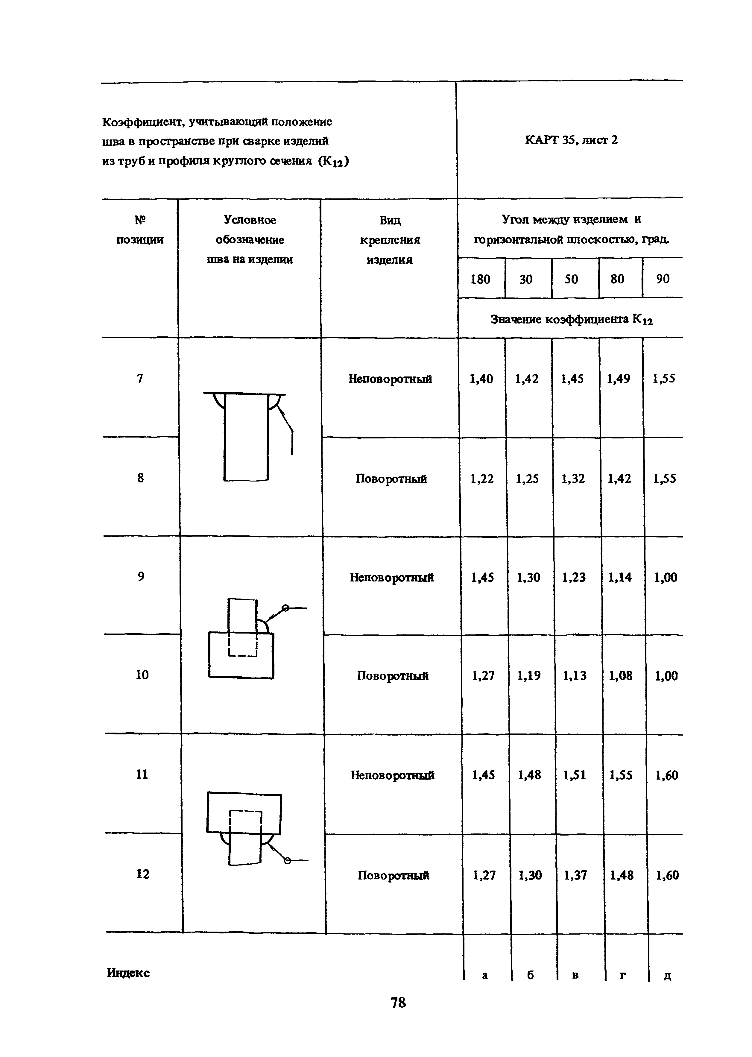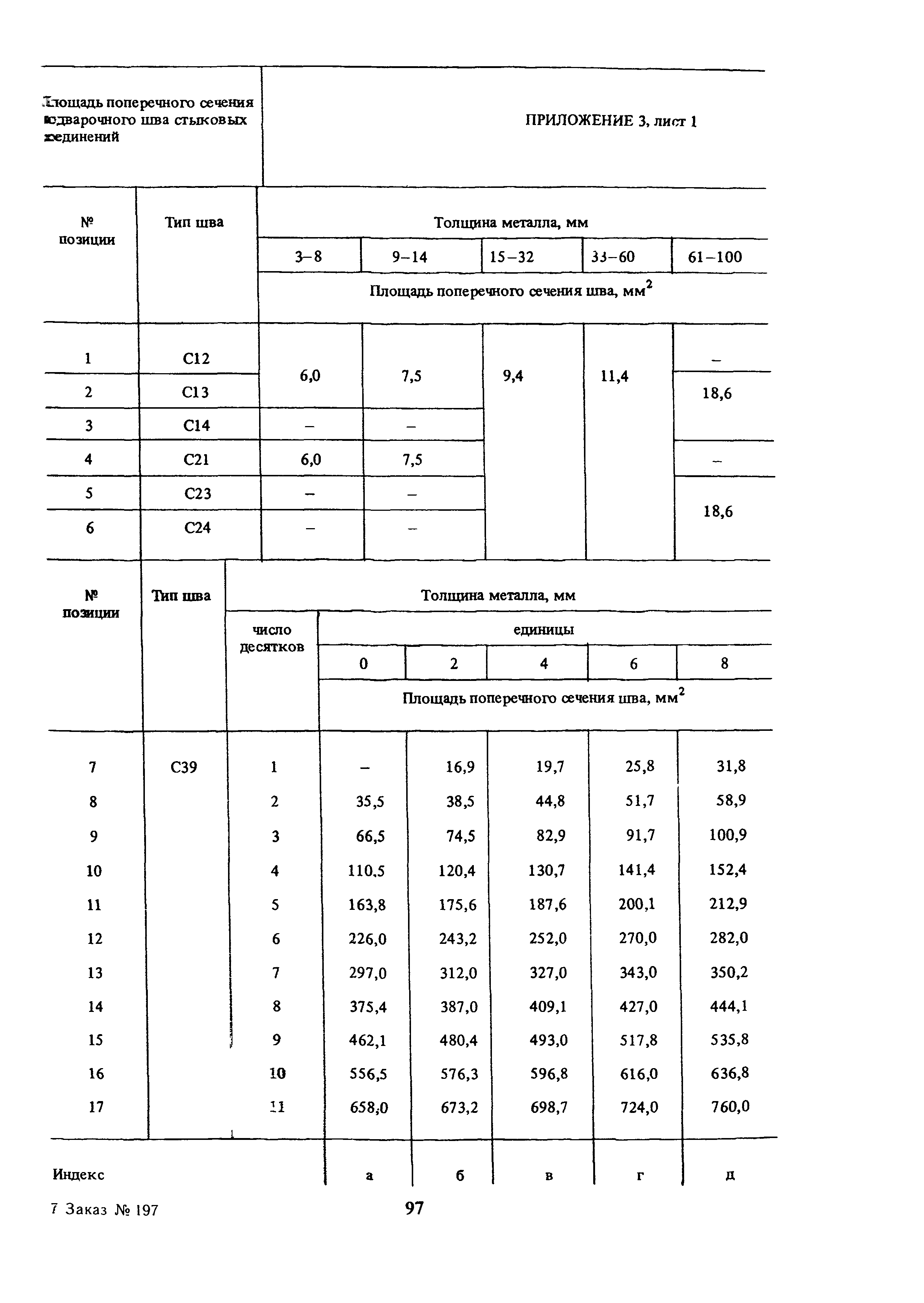 | Оглавление: | 1. Общая часть 2. Характеристика применяемого оборудования и технология работы 3. Организация труда 4. Нормативная часть 4.1. Неполное штучное время на 1 м сварного шва из листового и профильного проката 4.2. Неполное штучное время на сварку труб 4.3. Неполное штучное время на подварку корня шва 4.4. Вспомогательное время, зависящее от длины сварного шва, вошедшее в карты неполного штучного времени сварки (Твш) 4.5. Вспомогательное время, зависящее от длины свариваемого шва, не вошедшее в карты неполного штучного времени (Твш1) 4.6. Вспомогательное время, зависящее от изделия и типа обрудования (Тви) 4.7. Поправочные коэффициенты 4.8. Приложения Приложения 1. Расчетное значение силы тока в зависимости от толщины металла и диаметра электродов при сварке изделий Приложение 2. Площадь поперечного сечения основного шва стыковых соединений Приложение 3. Площадь поперечного сечения подварочного шва стыковых соединений Приложение 4. Площадь поперечного сечения шва угловых соединений Приложение 5. Площадь поперечного сечения подварочного шва угловых соединений Приложение 6. Площадь поперечного сечения шва тавровых соединений Приложение 7. Площадь поперечного сечения угловых, тавровых и нахлесточных соединений в зависимости от "Катета шва" Приложение 8. Площадь поперечного сечения шва первого и последующих проходов Приложение 9. Значение длины кольцевого стыка Приложение 10. Наименование, тип, вид шва и формулы расчета площади поперечного сечения швов |
