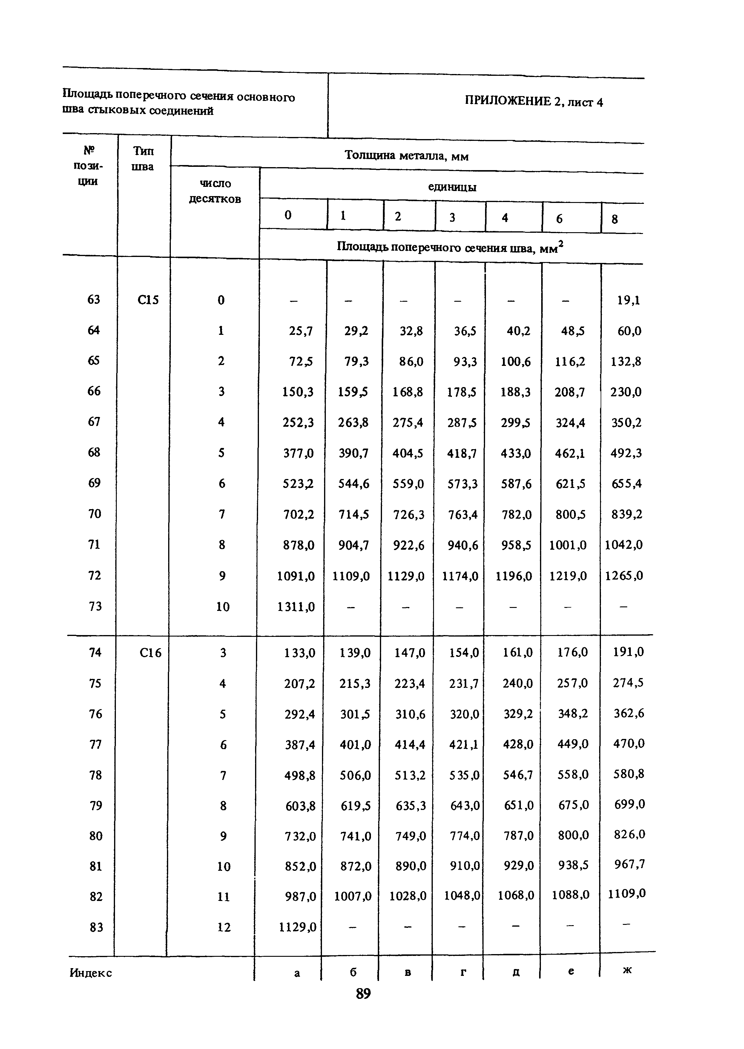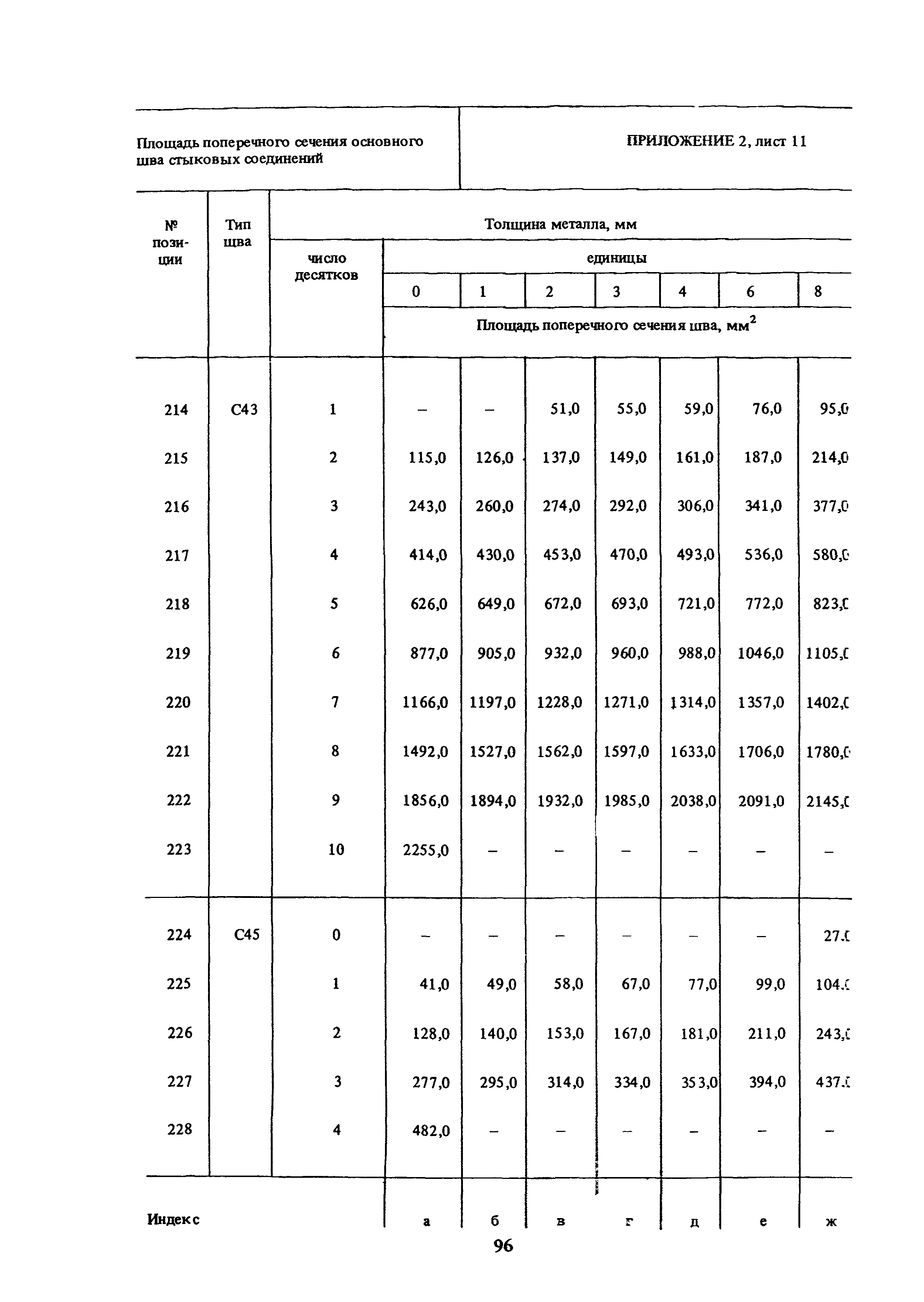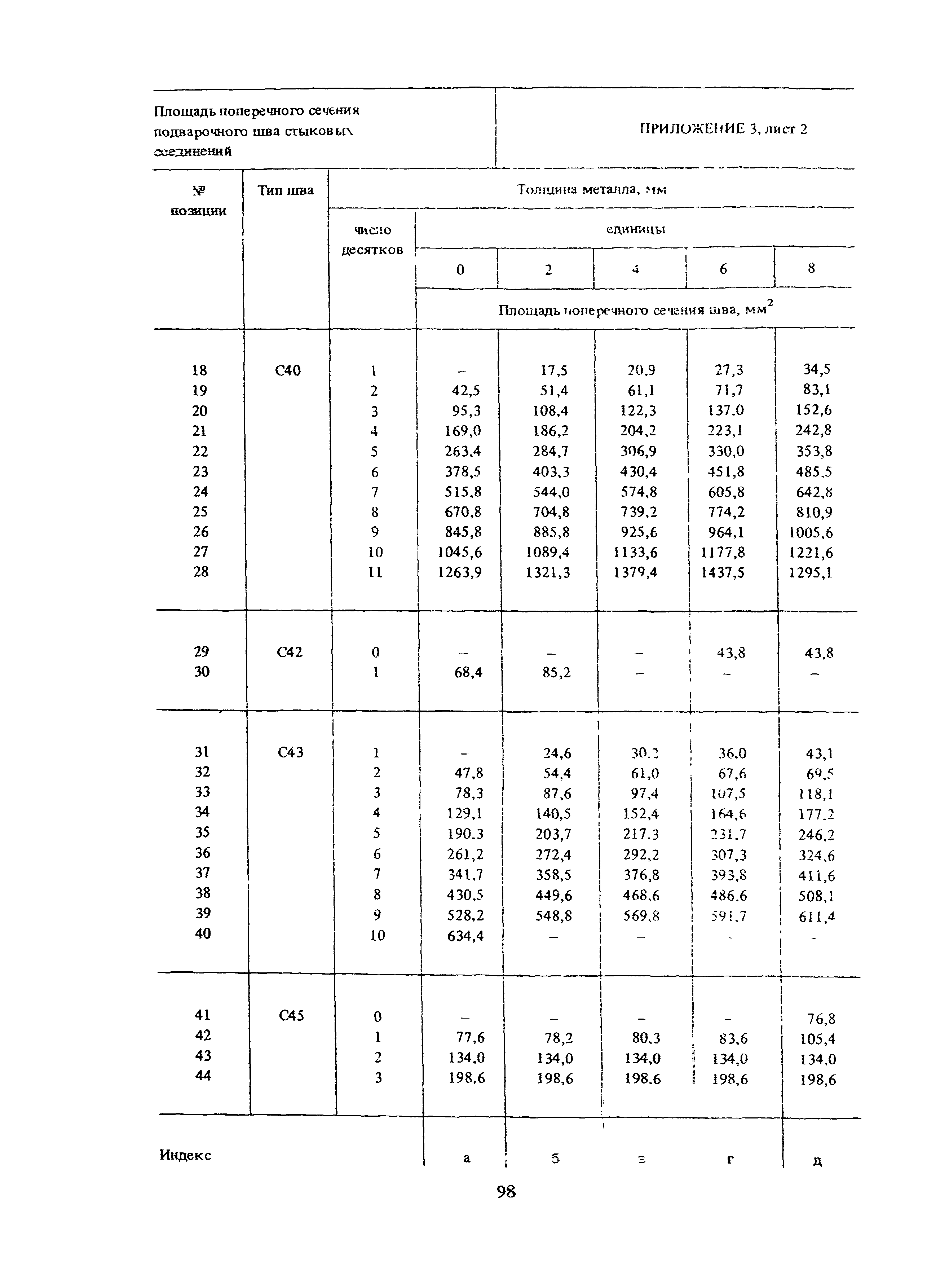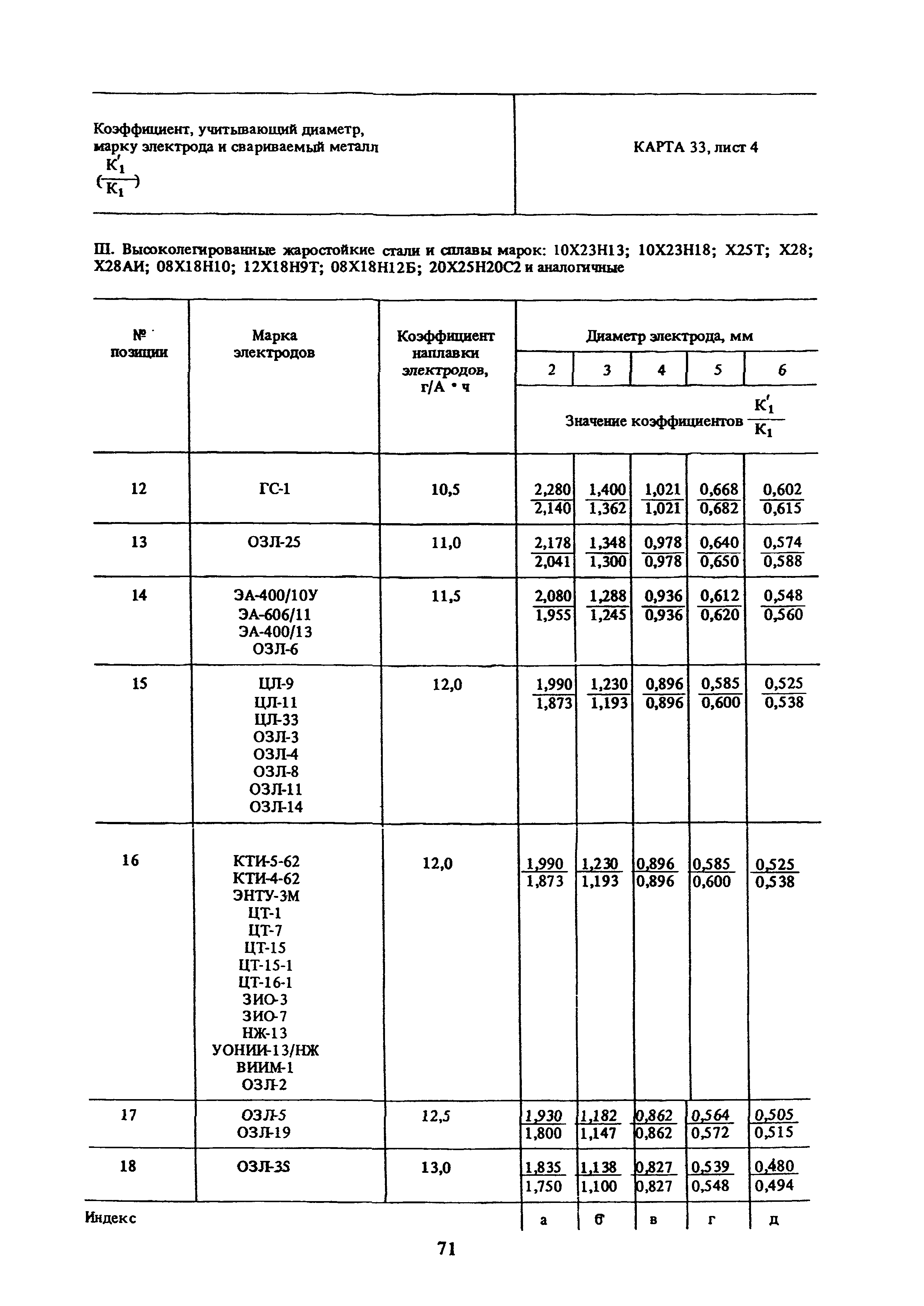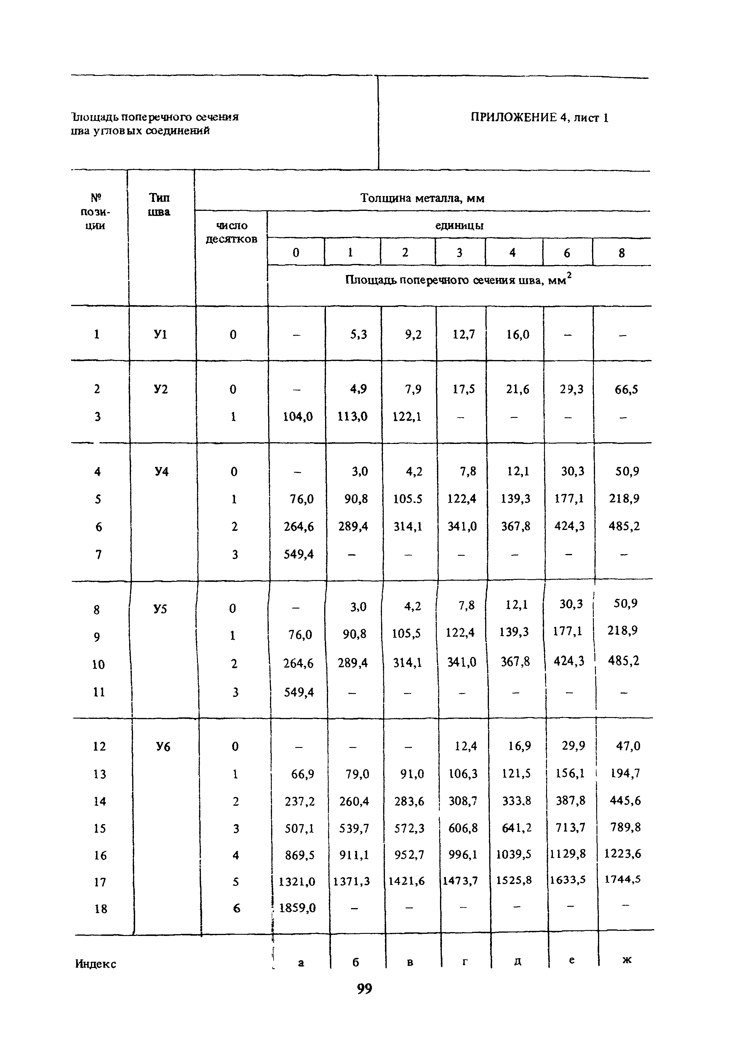 | Оглавление: | 1. Общая часть 2. Характеристика применяемого оборудования и технология работы 3. Организация труда 4. Нормативная часть 4.1. Неполное штучное время на 1 м сварного шва из листового и профильного проката 4.2. Неполное штучное время на сварку труб 4.3. Неполное штучное время на подварку корня шва 4.4. Вспомогательное время, зависящее от длины сварного шва, вошедшее в карты неполного штучного времени сварки (Твш) 4.5. Вспомогательное время, зависящее от длины свариваемого шва, не вошедшее в карты неполного штучного времени (Твш1) 4.6. Вспомогательное время, зависящее от изделия и типа обрудования (Тви) 4.7. Поправочные коэффициенты 4.8. Приложения Приложения 1. Расчетное значение силы тока в зависимости от толщины металла и диаметра электродов при сварке изделий Приложение 2. Площадь поперечного сечения основного шва стыковых соединений Приложение 3. Площадь поперечного сечения подварочного шва стыковых соединений Приложение 4. Площадь поперечного сечения шва угловых соединений Приложение 5. Площадь поперечного сечения подварочного шва угловых соединений Приложение 6. Площадь поперечного сечения шва тавровых соединений Приложение 7. Площадь поперечного сечения угловых, тавровых и нахлесточных соединений в зависимости от "Катета шва" Приложение 8. Площадь поперечного сечения шва первого и последующих проходов Приложение 9. Значение длины кольцевого стыка Приложение 10. Наименование, тип, вид шва и формулы расчета площади поперечного сечения швов |