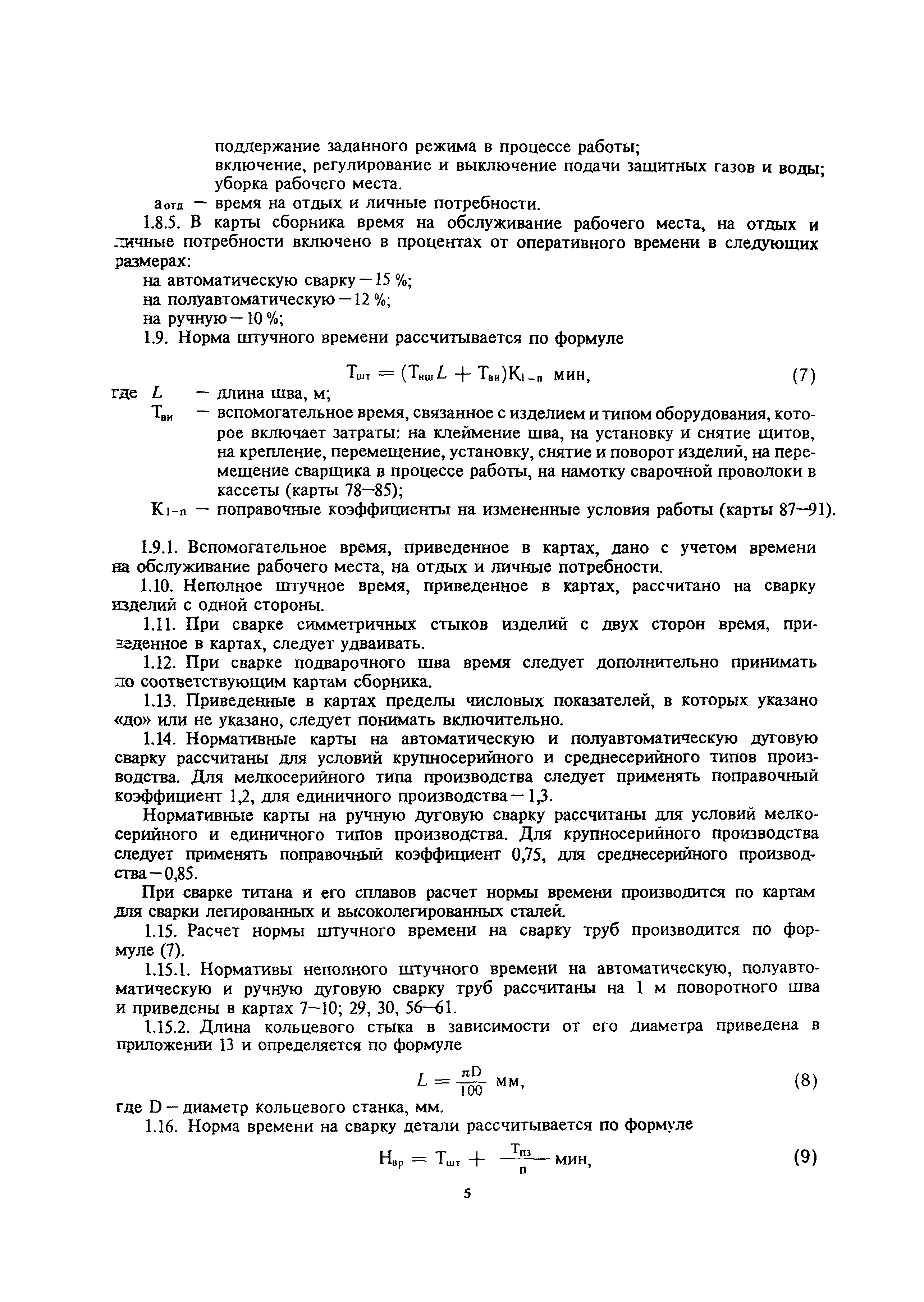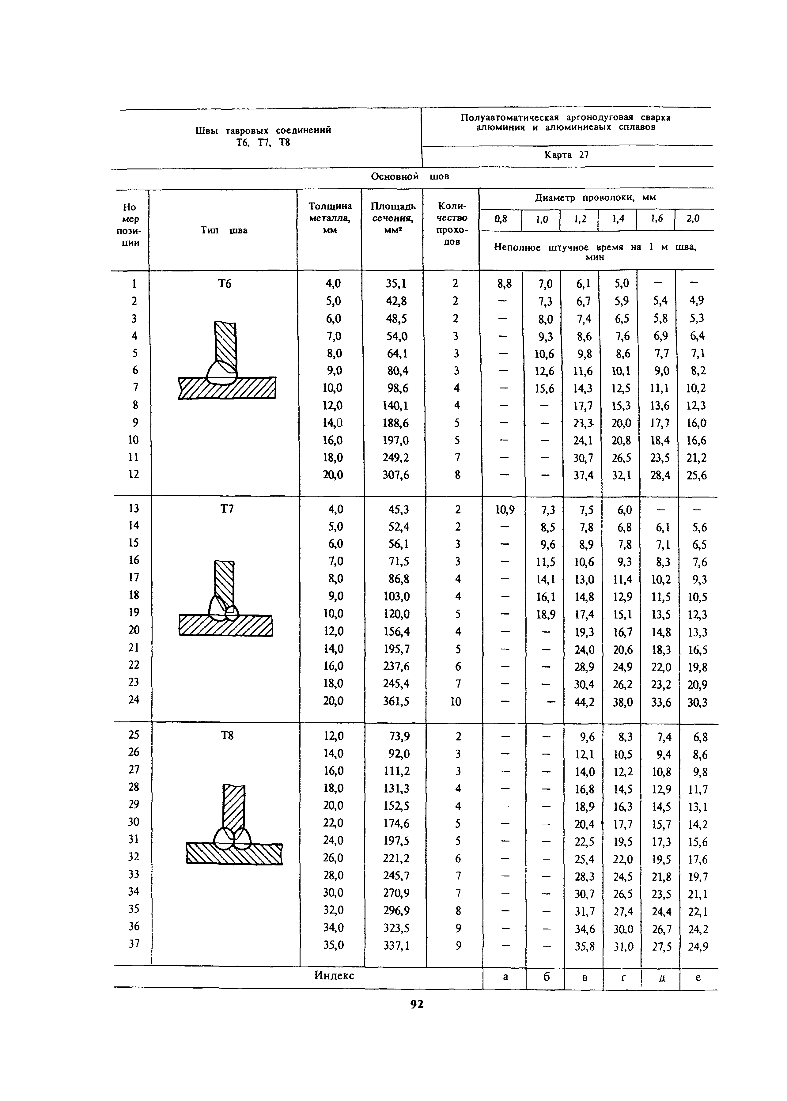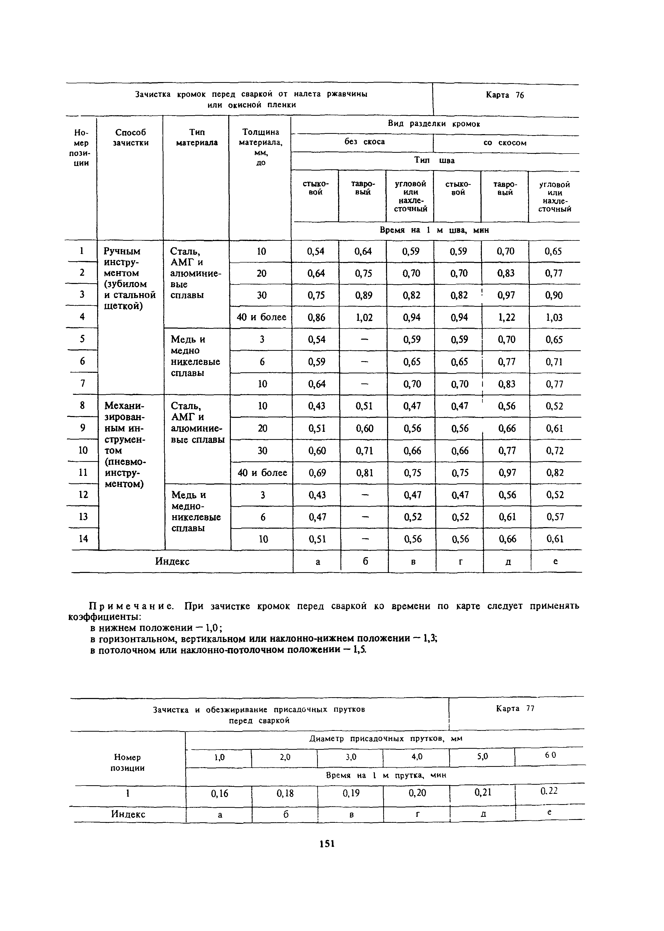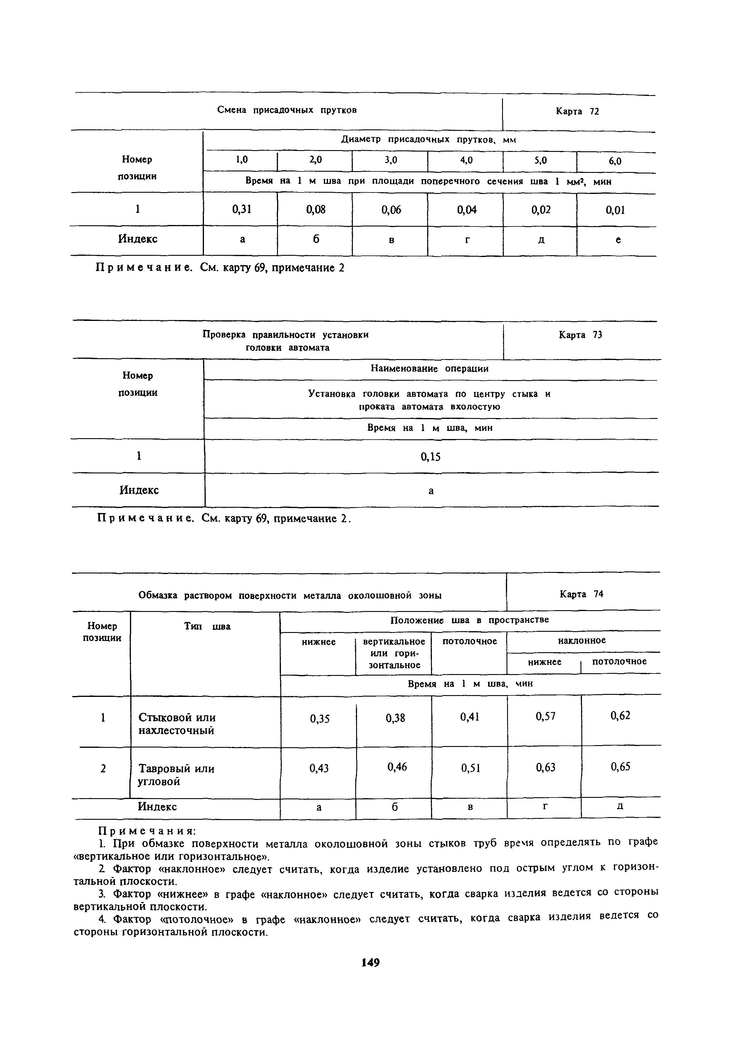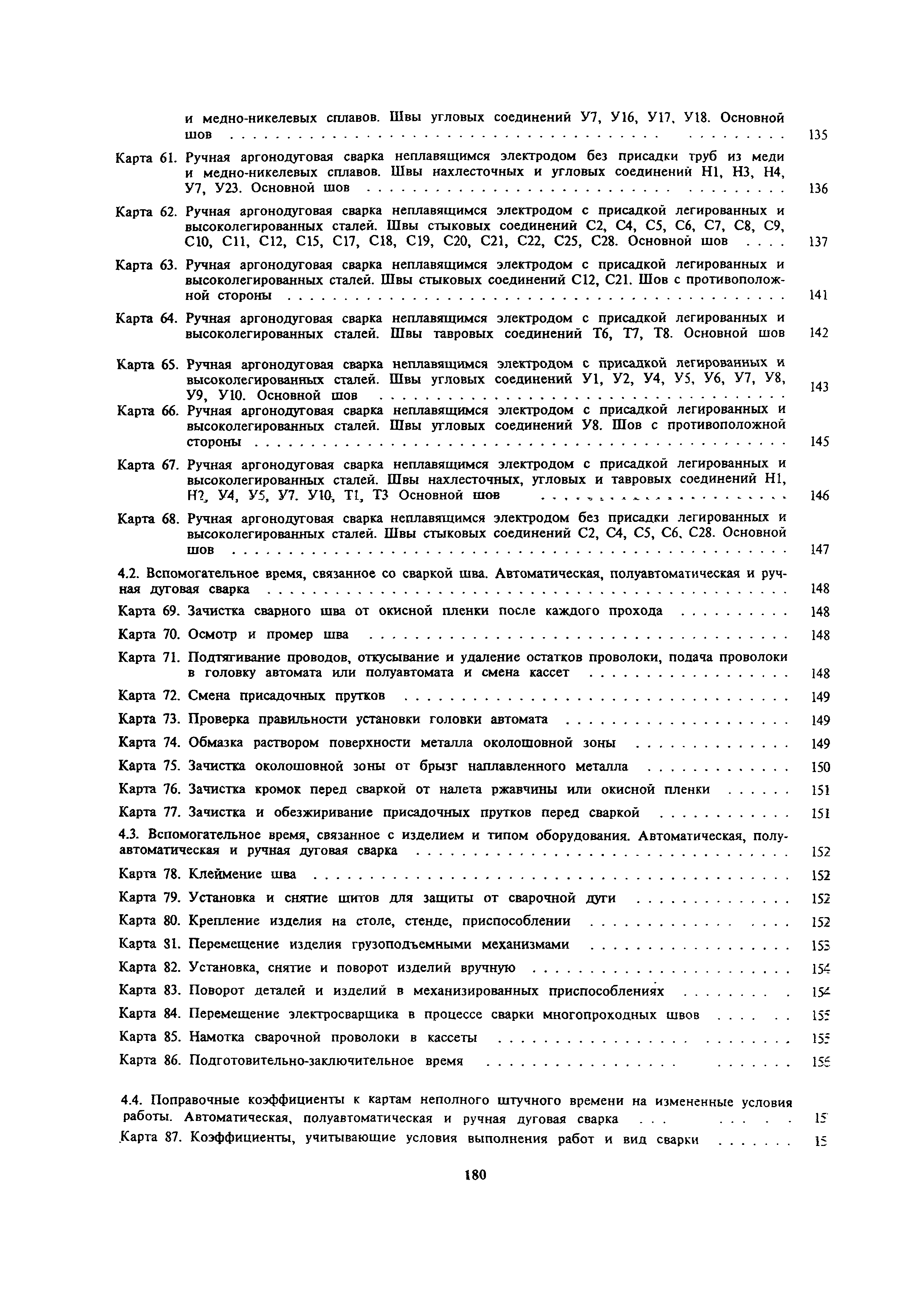 | Оглавление: | 1. Общая часть 2. Наименование оборудования и технология работы 3. Организация труда 4. Нормативная часть 4.1. Неполное штучное время на дуговую сварку 4.2. Вспомогательное время, связанное со сваркой шва. Автоматическая, полуавтоматическая и ручная дуговая сварка 4.3. Вспомогательное время, связанное с изделием и типом оборудования. Автоматическая, полуавтоматическая и ручная дуговая сварка 4.4. Поправочные коэффициенты к картам неполного штучного времени на измененные условия работы. Автоматическая, полуавтоматическая и ручная дуговая сварка 4.5. Приложения Приложения 1. Площадь поперечного сечения шва для расчета количества проходов сварки Приложение 2. Значение коэффициента наплавки металла Приложение 3. Значение коэффициента плотности наплавленного металла Приложение 4. Расчетное значение силы тока в зависимости от толщины металла и диаметра сварочной проволоки для полуавтоматической сварки стыков труб из меди и медно-никелевых сплавов Приложение 6. Расчетное значение скорости сварки в зависимости от диаметра сварочной проволоки и катета шва для автоматической дуговой сварки алюминия и алюминиевых сплавов плавящимся электродом Приложение 7. Расчетное значение скорости сварки в зависимости от диаметра сварочной проволоки и толщины металла при автоматической сварке Приложение 8. Расчетное значение скорости сварки в зависимости от диаметра присадочной проволоки и катета шва при автоматической аргонодуговой сварке алюминия и алюминиевых сплавов неплавящимся электродом Приложение 9. Расчетное значение скорости сварки в зависимости от диаметра присадочной проволоки и толщины металла при автоматической дуговой сварке алюминиевых сплавов неплавящимся электродом Приложение 10. Расчетное значение силы тока в зависимости от диаметра присадочной проволоки и толщины металла при ручной аргонодуговой сварке алюминия и алюминиевых сплавов неплавящимся электродом Приложение 11. Расчетное значение силы тока в зависимости от диаметра присадочной проволоки и толщины металла при ручной аргонодуговой сварке меди и медно-никелевых сплавов неплавящимся электродом Приложение 12. Расчетное значение силы тока в зависимости от диаметра присадочной проволоки и толщины металла при ручной аргонодуговой сварке легированных и высоколегированных сталей плавящимся электродом Приложение 13. Значение длины кольцевого стыка в зависимости от его диаметра Приложение 14. Наименование, индекс, вид шва и формулы расчета площади поперечного сечения швов |