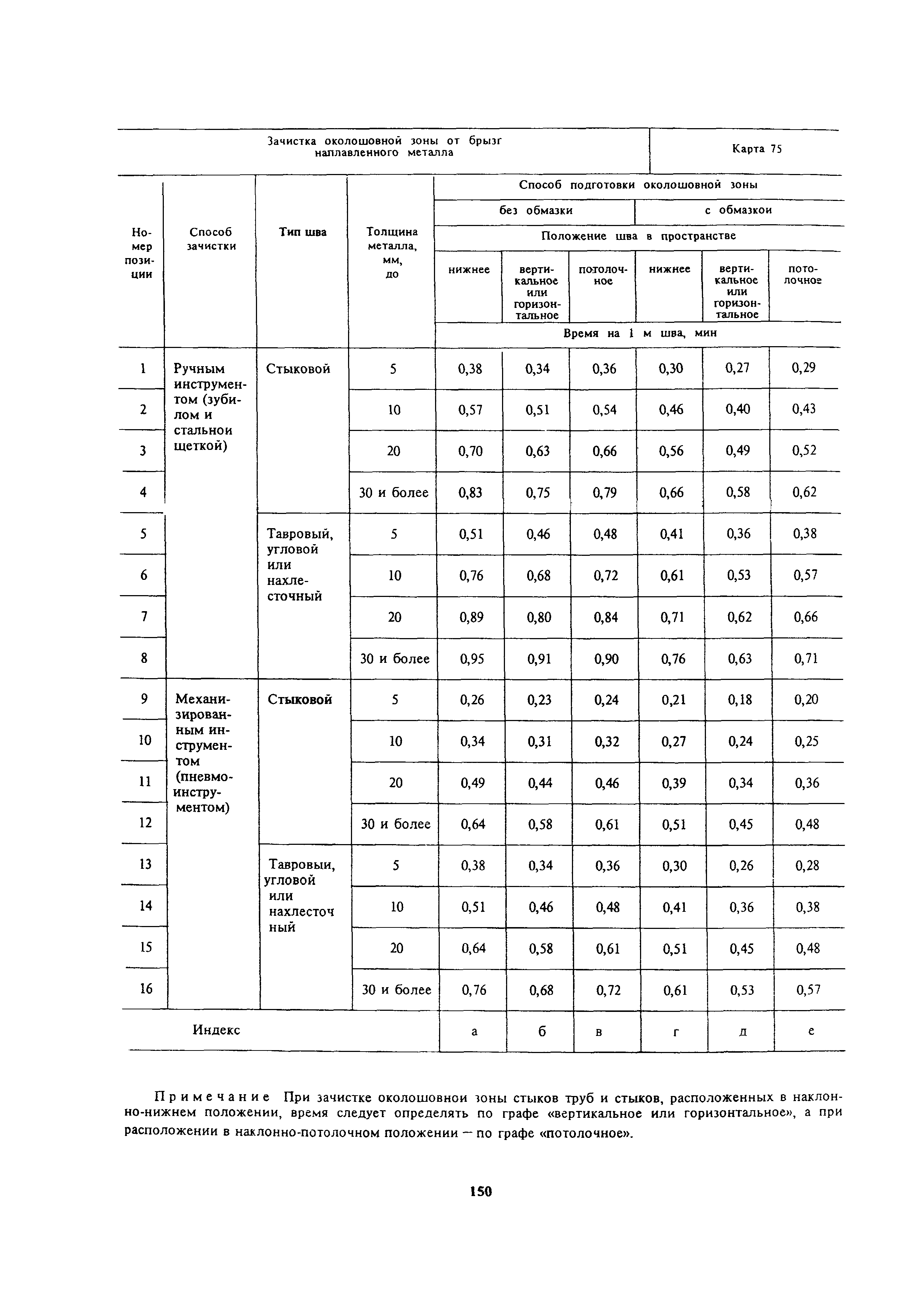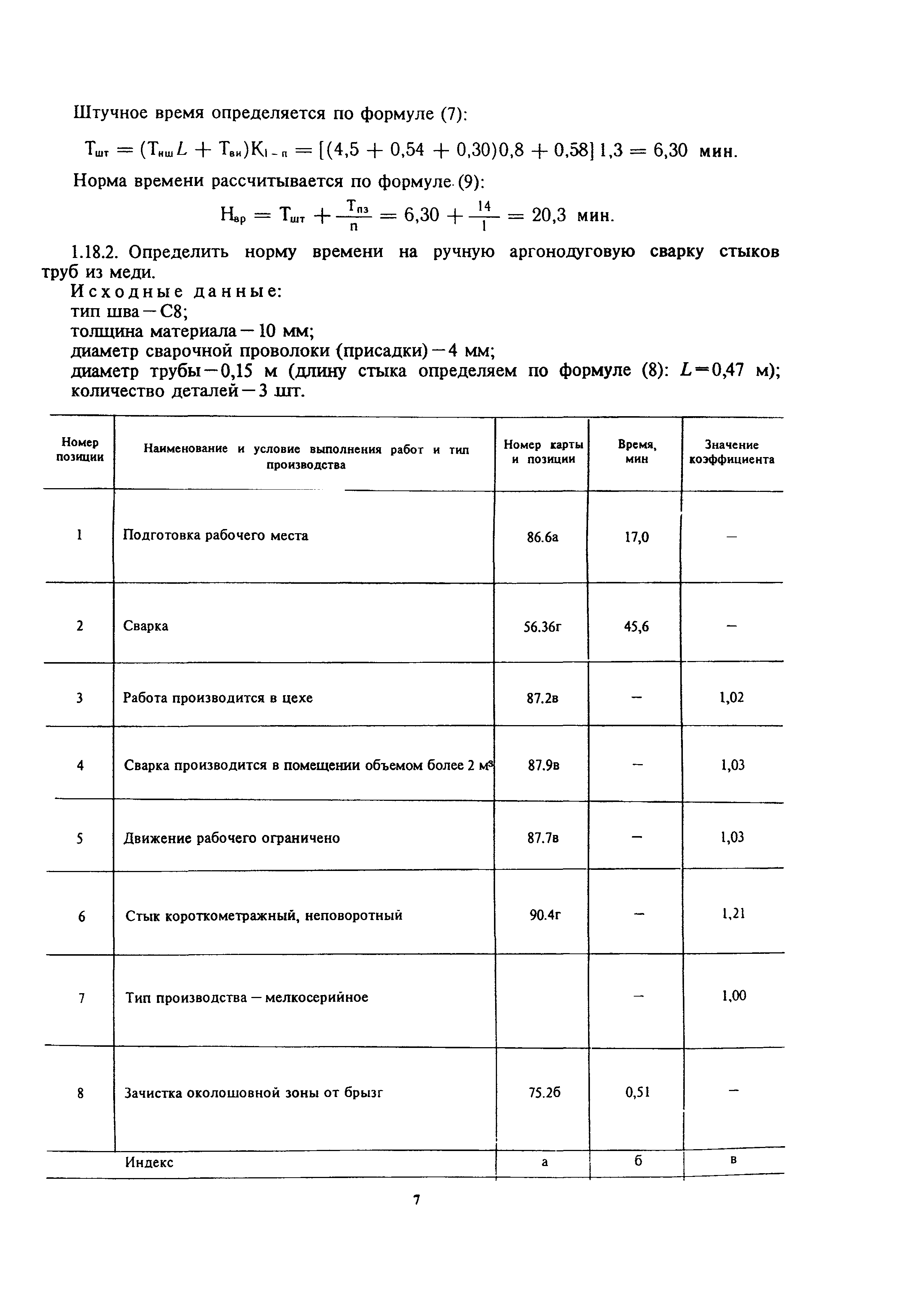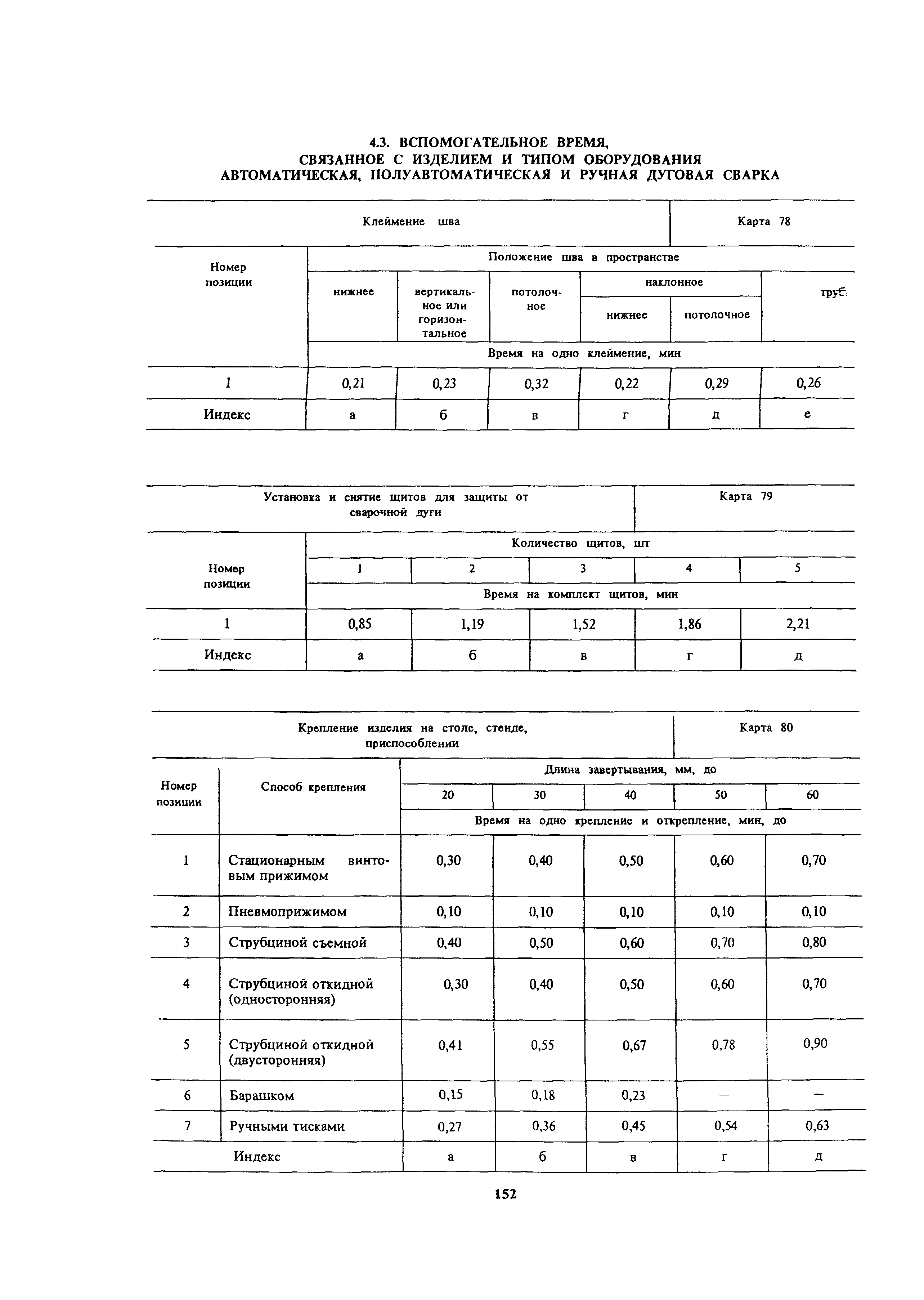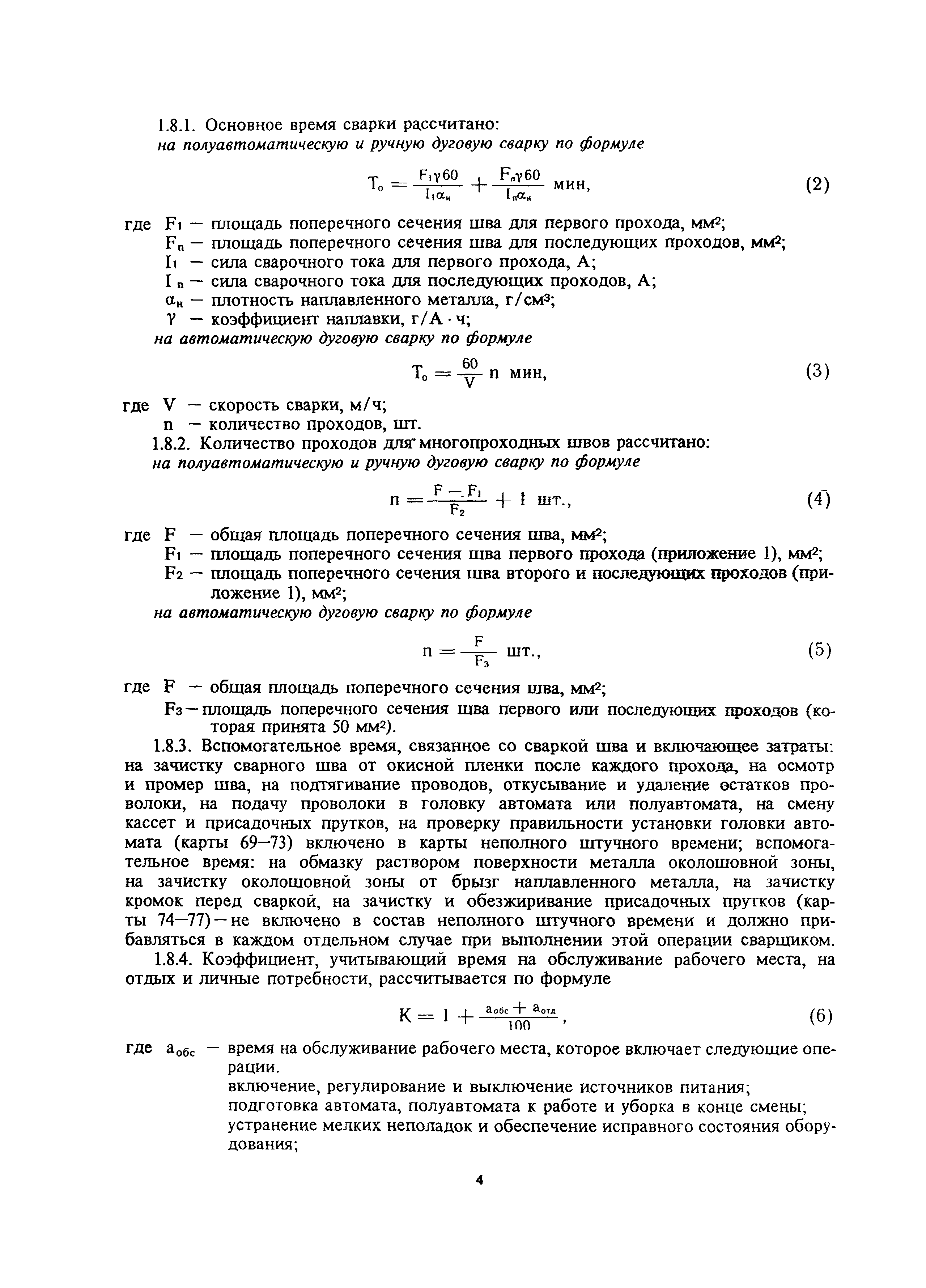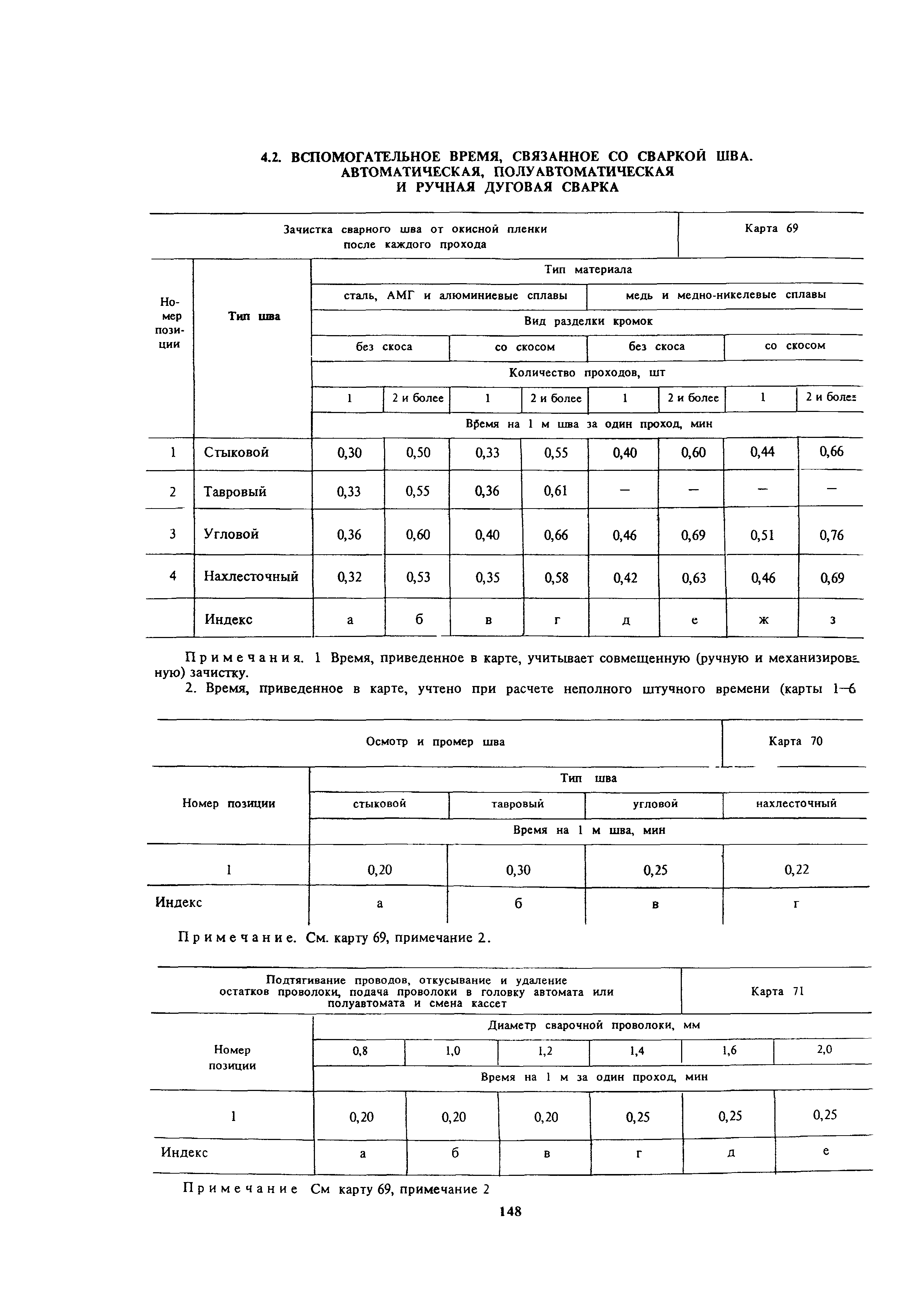 | Оглавление: | 1. Общая часть 2. Наименование оборудования и технология работы 3. Организация труда 4. Нормативная часть 4.1. Неполное штучное время на дуговую сварку 4.2. Вспомогательное время, связанное со сваркой шва. Автоматическая, полуавтоматическая и ручная дуговая сварка 4.3. Вспомогательное время, связанное с изделием и типом оборудования. Автоматическая, полуавтоматическая и ручная дуговая сварка 4.4. Поправочные коэффициенты к картам неполного штучного времени на измененные условия работы. Автоматическая, полуавтоматическая и ручная дуговая сварка 4.5. Приложения Приложения 1. Площадь поперечного сечения шва для расчета количества проходов сварки Приложение 2. Значение коэффициента наплавки металла Приложение 3. Значение коэффициента плотности наплавленного металла Приложение 4. Расчетное значение силы тока в зависимости от толщины металла и диаметра сварочной проволоки для полуавтоматической сварки стыков труб из меди и медно-никелевых сплавов Приложение 6. Расчетное значение скорости сварки в зависимости от диаметра сварочной проволоки и катета шва для автоматической дуговой сварки алюминия и алюминиевых сплавов плавящимся электродом Приложение 7. Расчетное значение скорости сварки в зависимости от диаметра сварочной проволоки и толщины металла при автоматической сварке Приложение 8. Расчетное значение скорости сварки в зависимости от диаметра присадочной проволоки и катета шва при автоматической аргонодуговой сварке алюминия и алюминиевых сплавов неплавящимся электродом Приложение 9. Расчетное значение скорости сварки в зависимости от диаметра присадочной проволоки и толщины металла при автоматической дуговой сварке алюминиевых сплавов неплавящимся электродом Приложение 10. Расчетное значение силы тока в зависимости от диаметра присадочной проволоки и толщины металла при ручной аргонодуговой сварке алюминия и алюминиевых сплавов неплавящимся электродом Приложение 11. Расчетное значение силы тока в зависимости от диаметра присадочной проволоки и толщины металла при ручной аргонодуговой сварке меди и медно-никелевых сплавов неплавящимся электродом Приложение 12. Расчетное значение силы тока в зависимости от диаметра присадочной проволоки и толщины металла при ручной аргонодуговой сварке легированных и высоколегированных сталей плавящимся электродом Приложение 13. Значение длины кольцевого стыка в зависимости от его диаметра Приложение 14. Наименование, индекс, вид шва и формулы расчета площади поперечного сечения швов |
