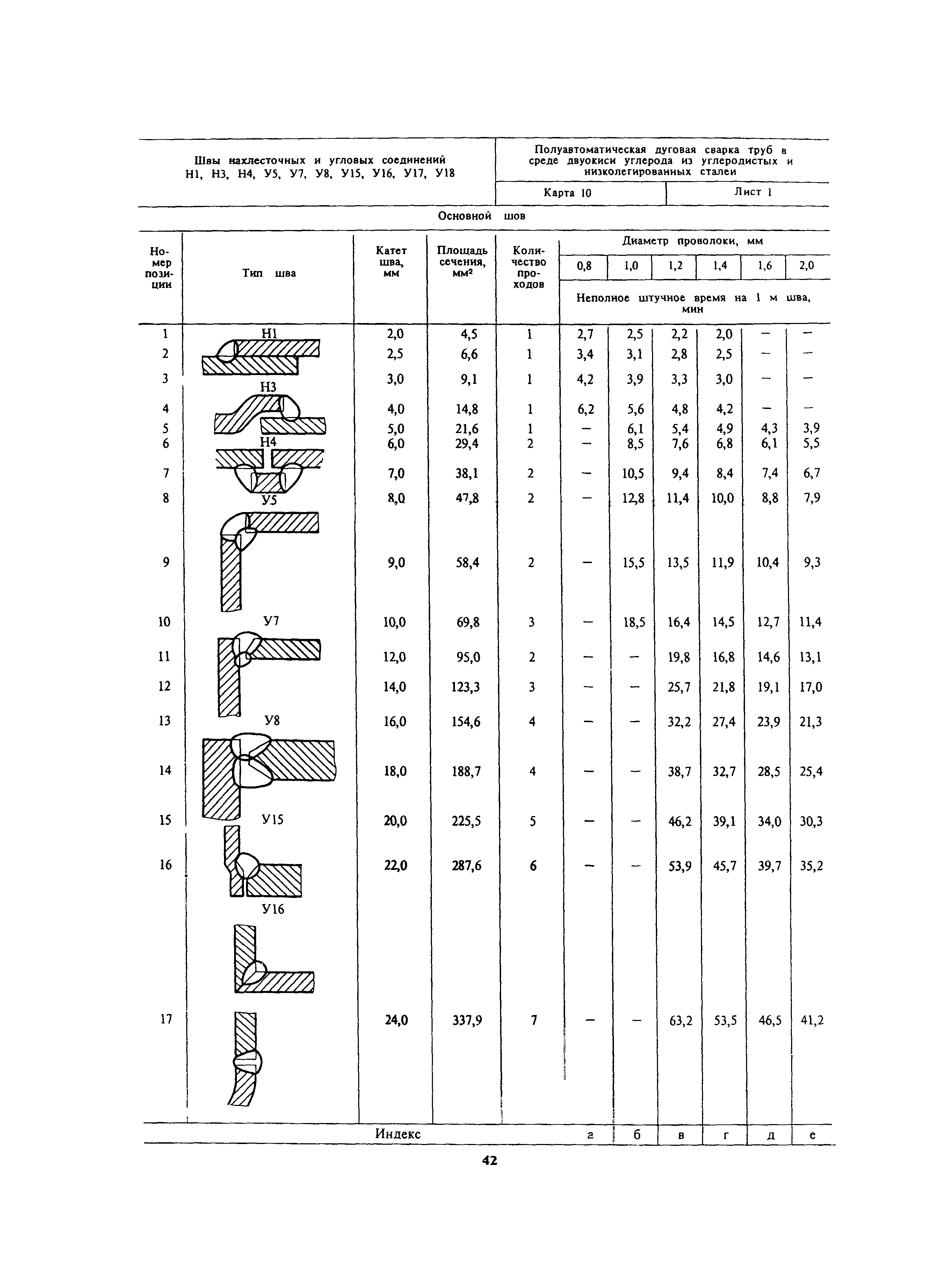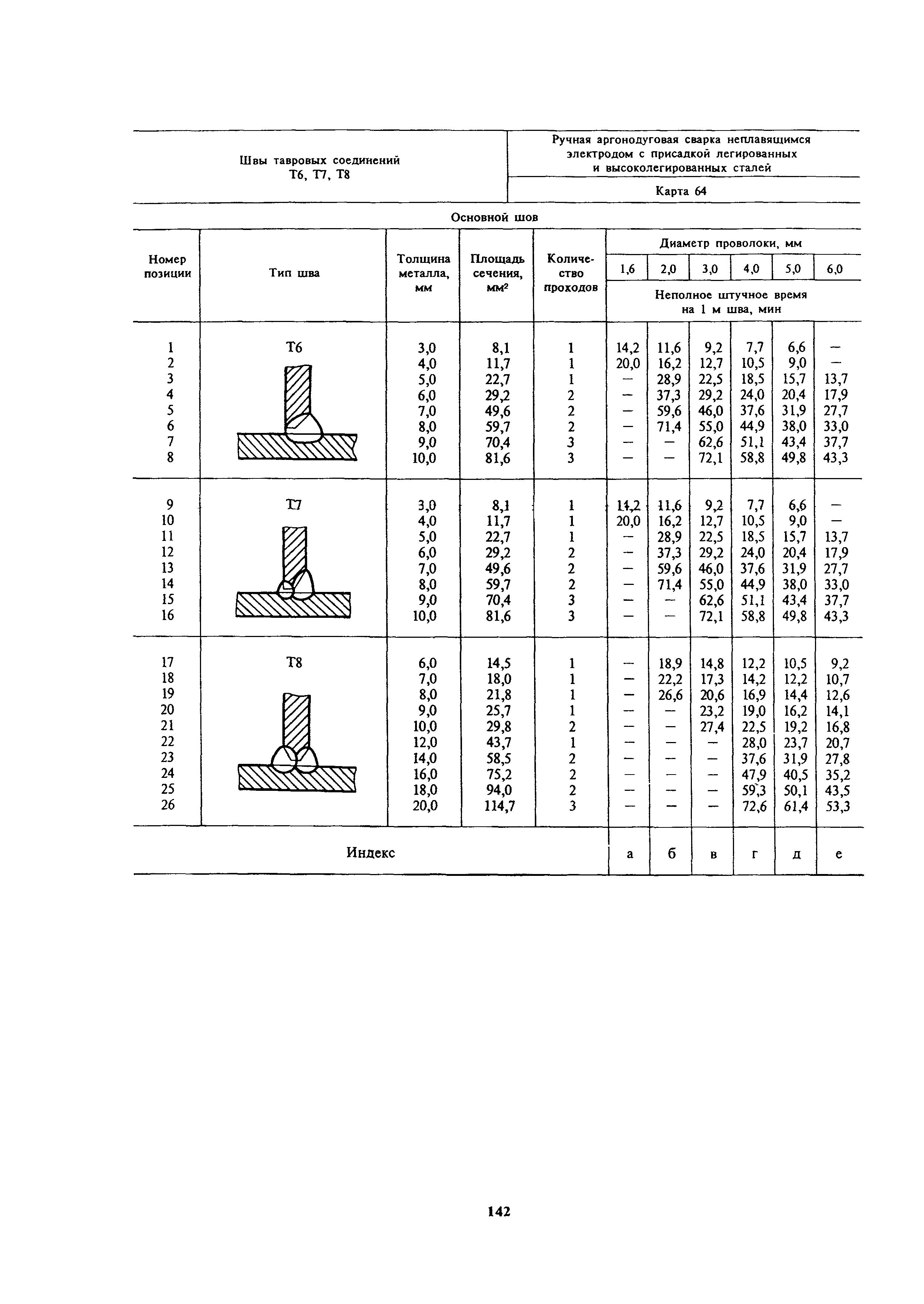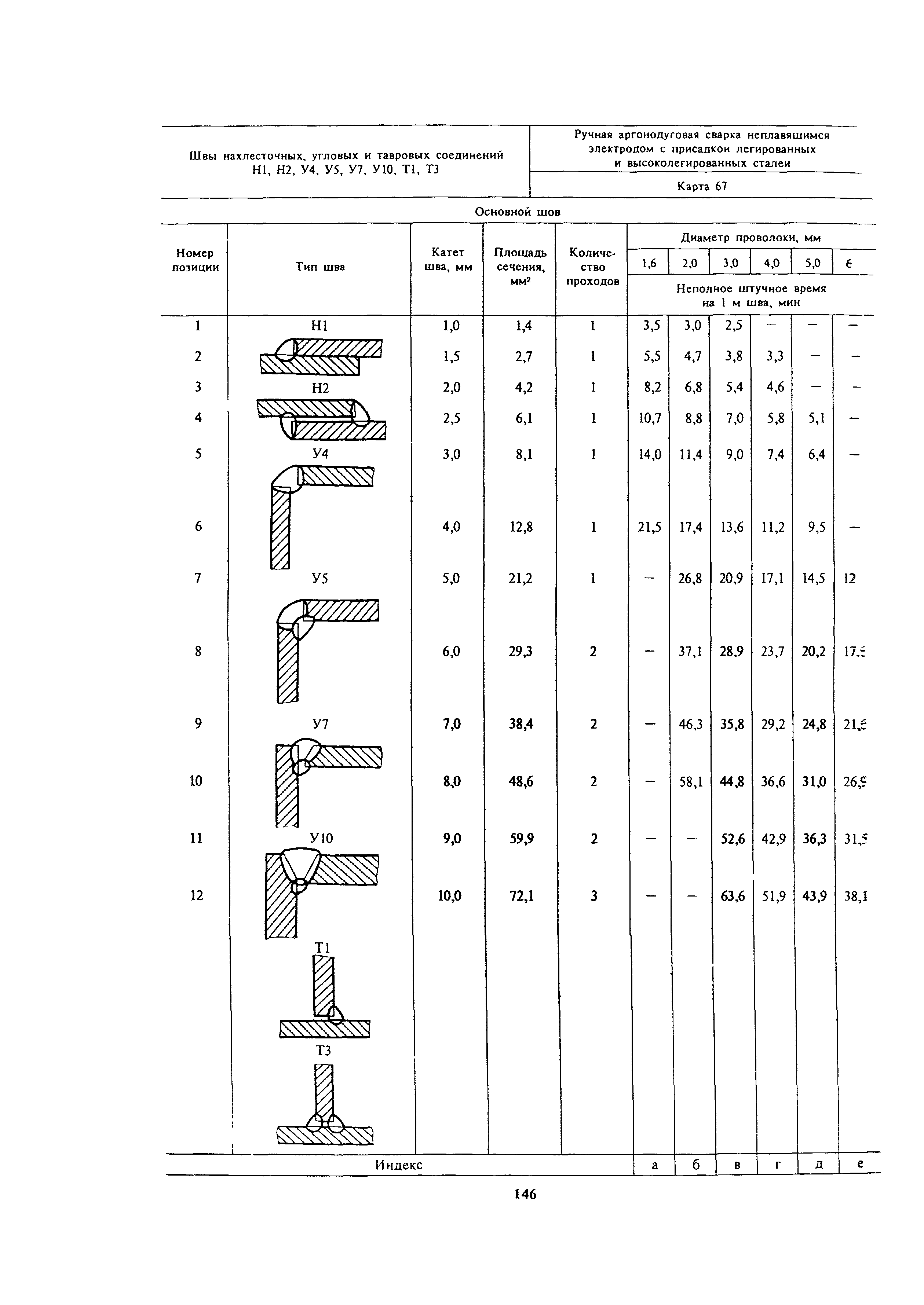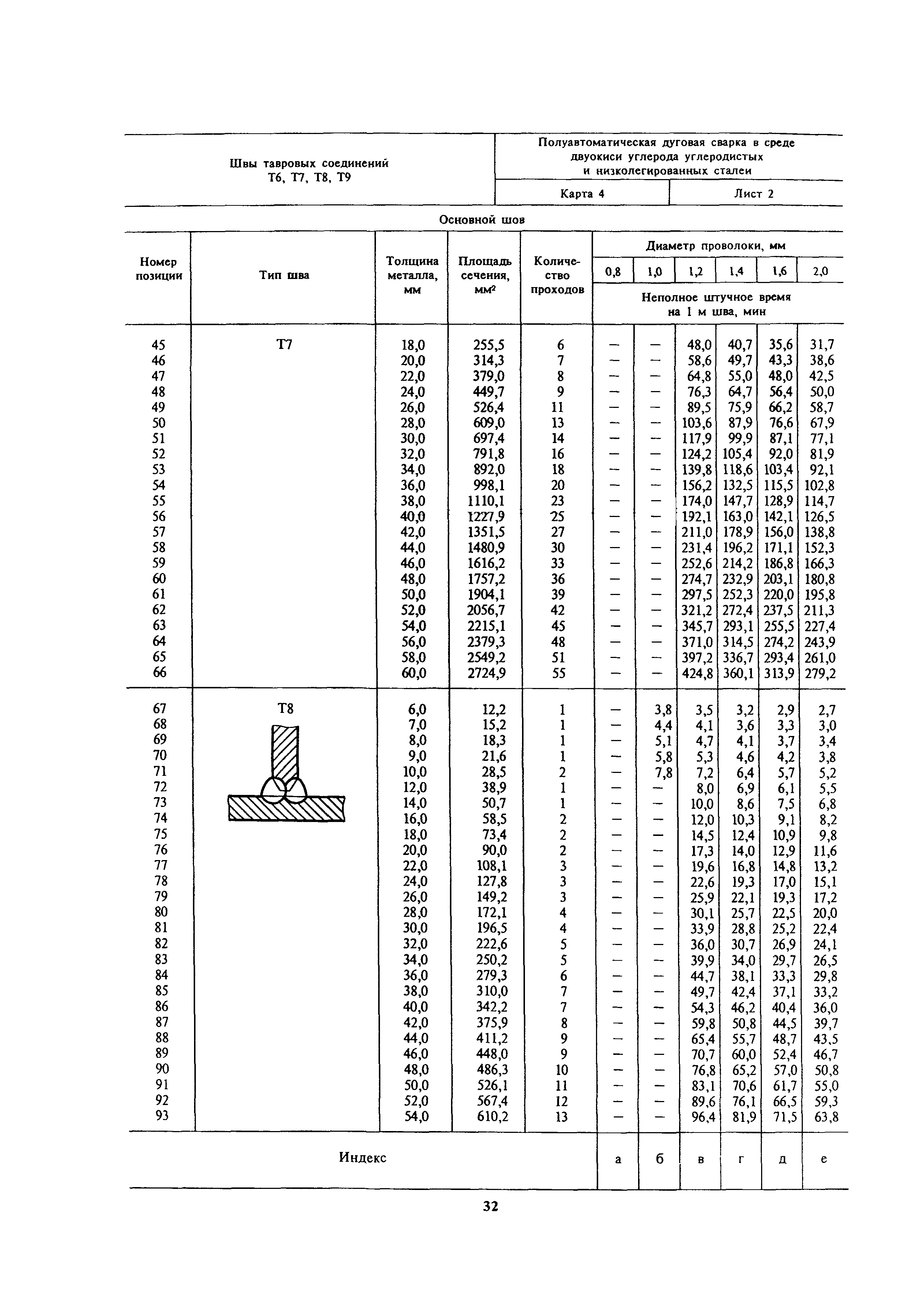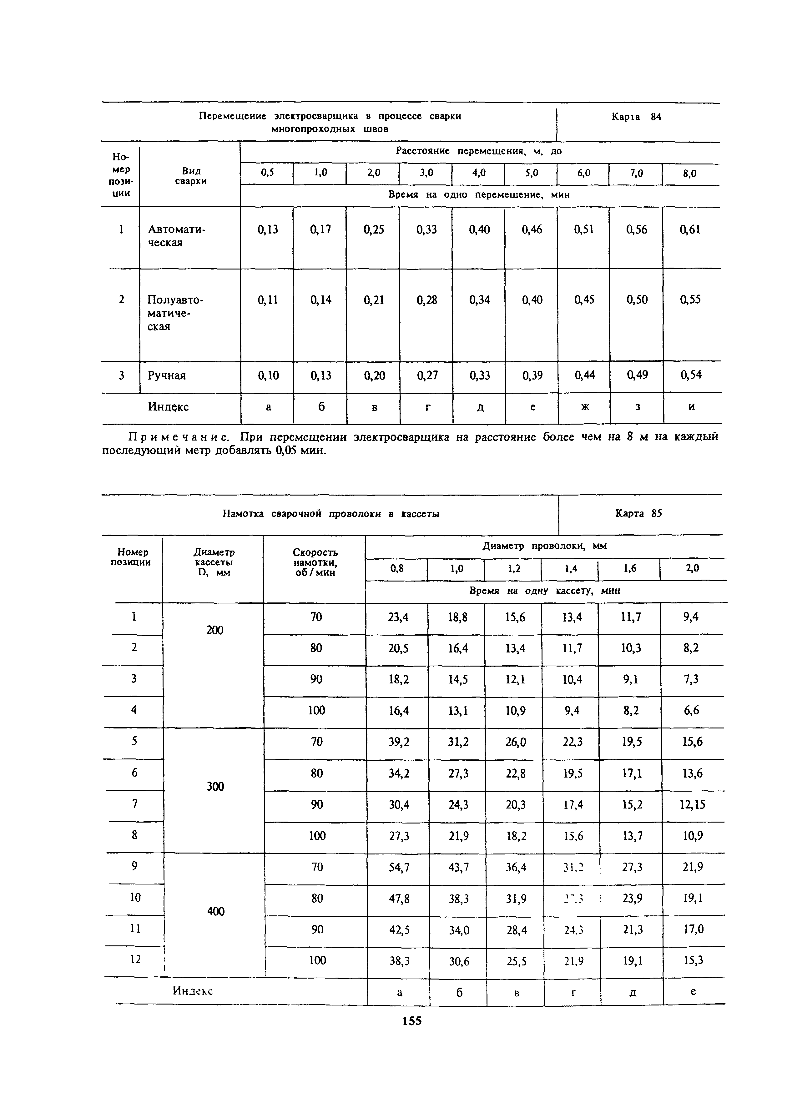 | Оглавление: | 1. Общая часть 2. Наименование оборудования и технология работы 3. Организация труда 4. Нормативная часть 4.1. Неполное штучное время на дуговую сварку 4.2. Вспомогательное время, связанное со сваркой шва. Автоматическая, полуавтоматическая и ручная дуговая сварка 4.3. Вспомогательное время, связанное с изделием и типом оборудования. Автоматическая, полуавтоматическая и ручная дуговая сварка 4.4. Поправочные коэффициенты к картам неполного штучного времени на измененные условия работы. Автоматическая, полуавтоматическая и ручная дуговая сварка 4.5. Приложения Приложения 1. Площадь поперечного сечения шва для расчета количества проходов сварки Приложение 2. Значение коэффициента наплавки металла Приложение 3. Значение коэффициента плотности наплавленного металла Приложение 4. Расчетное значение силы тока в зависимости от толщины металла и диаметра сварочной проволоки для полуавтоматической сварки стыков труб из меди и медно-никелевых сплавов Приложение 6. Расчетное значение скорости сварки в зависимости от диаметра сварочной проволоки и катета шва для автоматической дуговой сварки алюминия и алюминиевых сплавов плавящимся электродом Приложение 7. Расчетное значение скорости сварки в зависимости от диаметра сварочной проволоки и толщины металла при автоматической сварке Приложение 8. Расчетное значение скорости сварки в зависимости от диаметра присадочной проволоки и катета шва при автоматической аргонодуговой сварке алюминия и алюминиевых сплавов неплавящимся электродом Приложение 9. Расчетное значение скорости сварки в зависимости от диаметра присадочной проволоки и толщины металла при автоматической дуговой сварке алюминиевых сплавов неплавящимся электродом Приложение 10. Расчетное значение силы тока в зависимости от диаметра присадочной проволоки и толщины металла при ручной аргонодуговой сварке алюминия и алюминиевых сплавов неплавящимся электродом Приложение 11. Расчетное значение силы тока в зависимости от диаметра присадочной проволоки и толщины металла при ручной аргонодуговой сварке меди и медно-никелевых сплавов неплавящимся электродом Приложение 12. Расчетное значение силы тока в зависимости от диаметра присадочной проволоки и толщины металла при ручной аргонодуговой сварке легированных и высоколегированных сталей плавящимся электродом Приложение 13. Значение длины кольцевого стыка в зависимости от его диаметра Приложение 14. Наименование, индекс, вид шва и формулы расчета площади поперечного сечения швов |