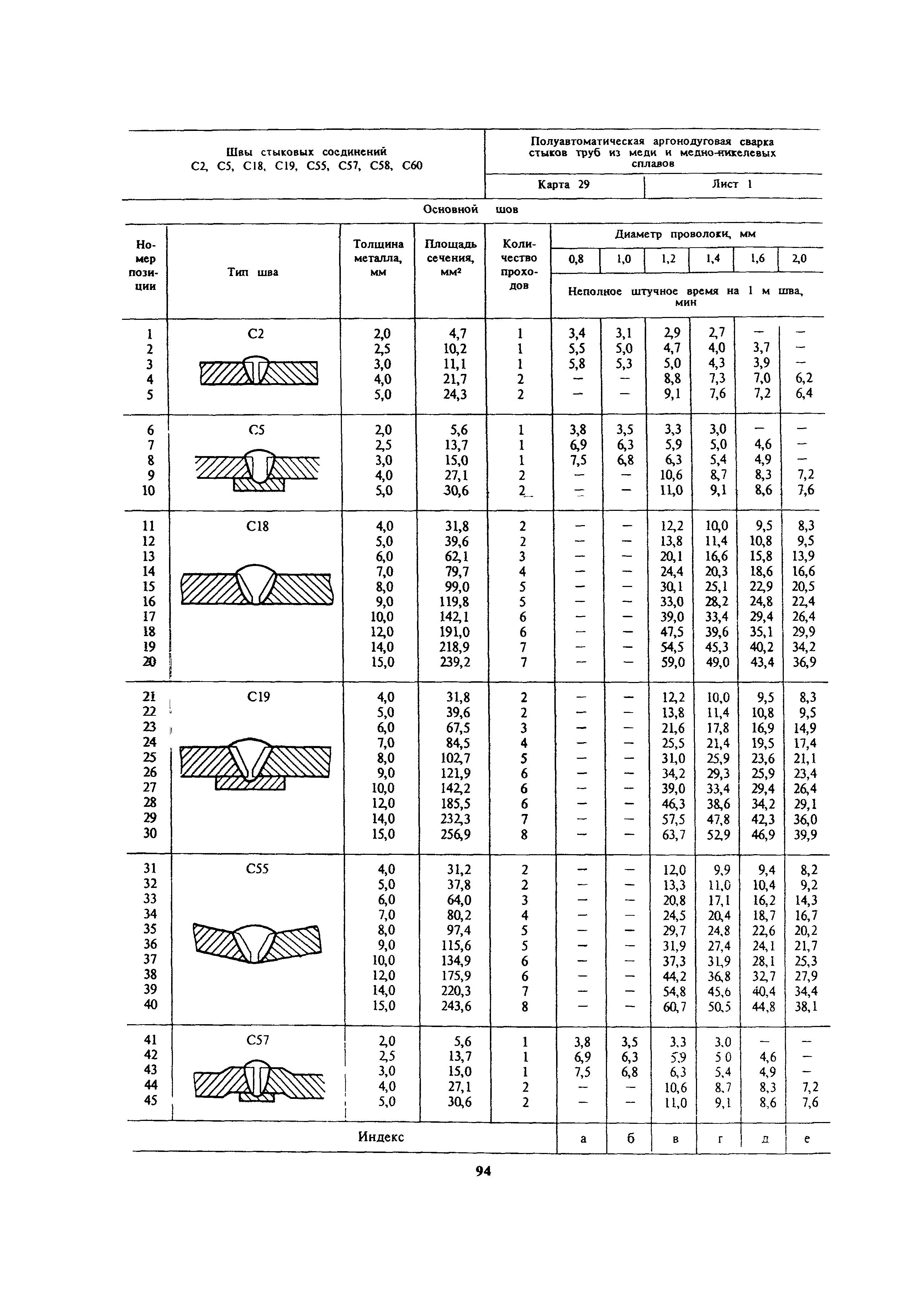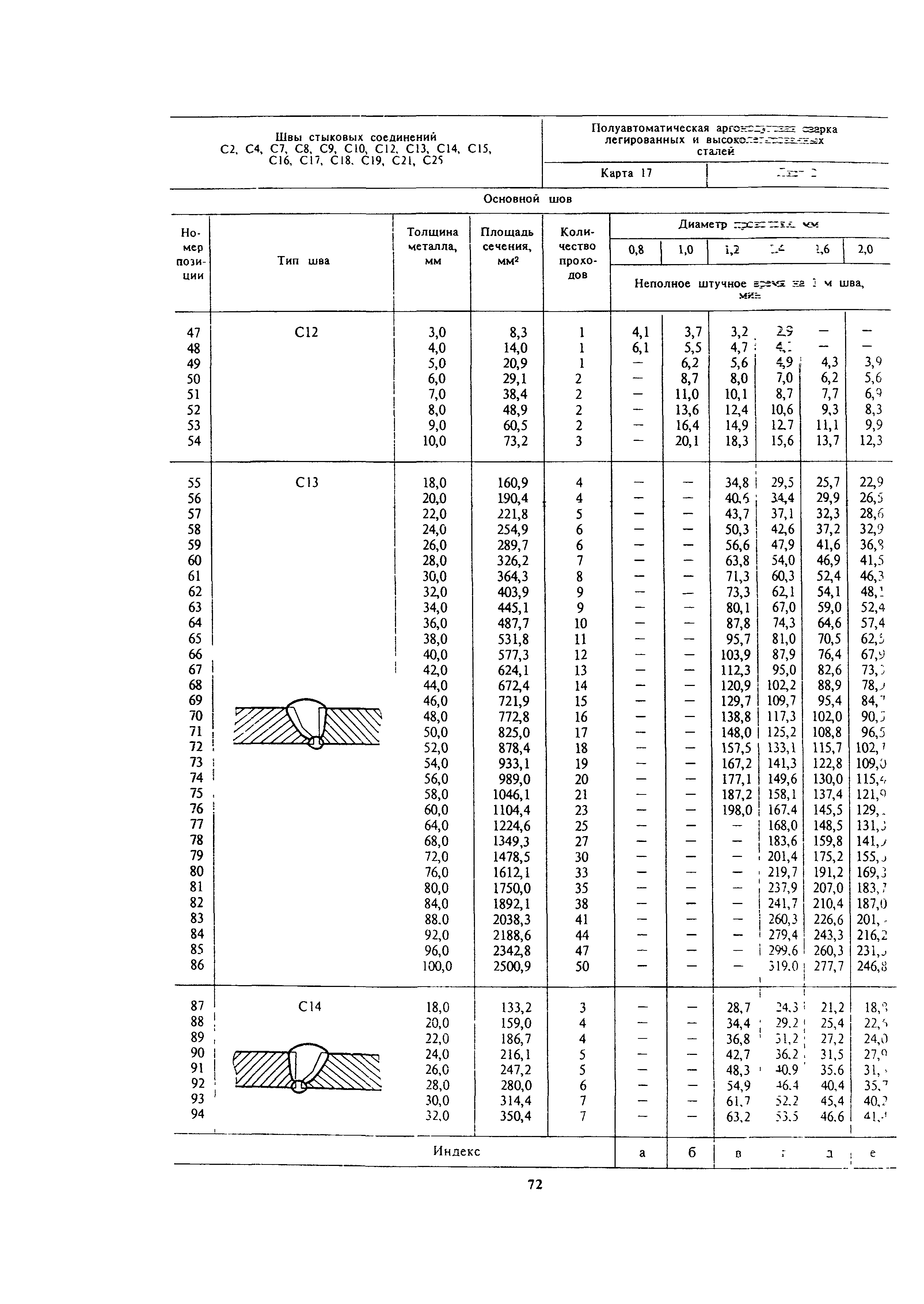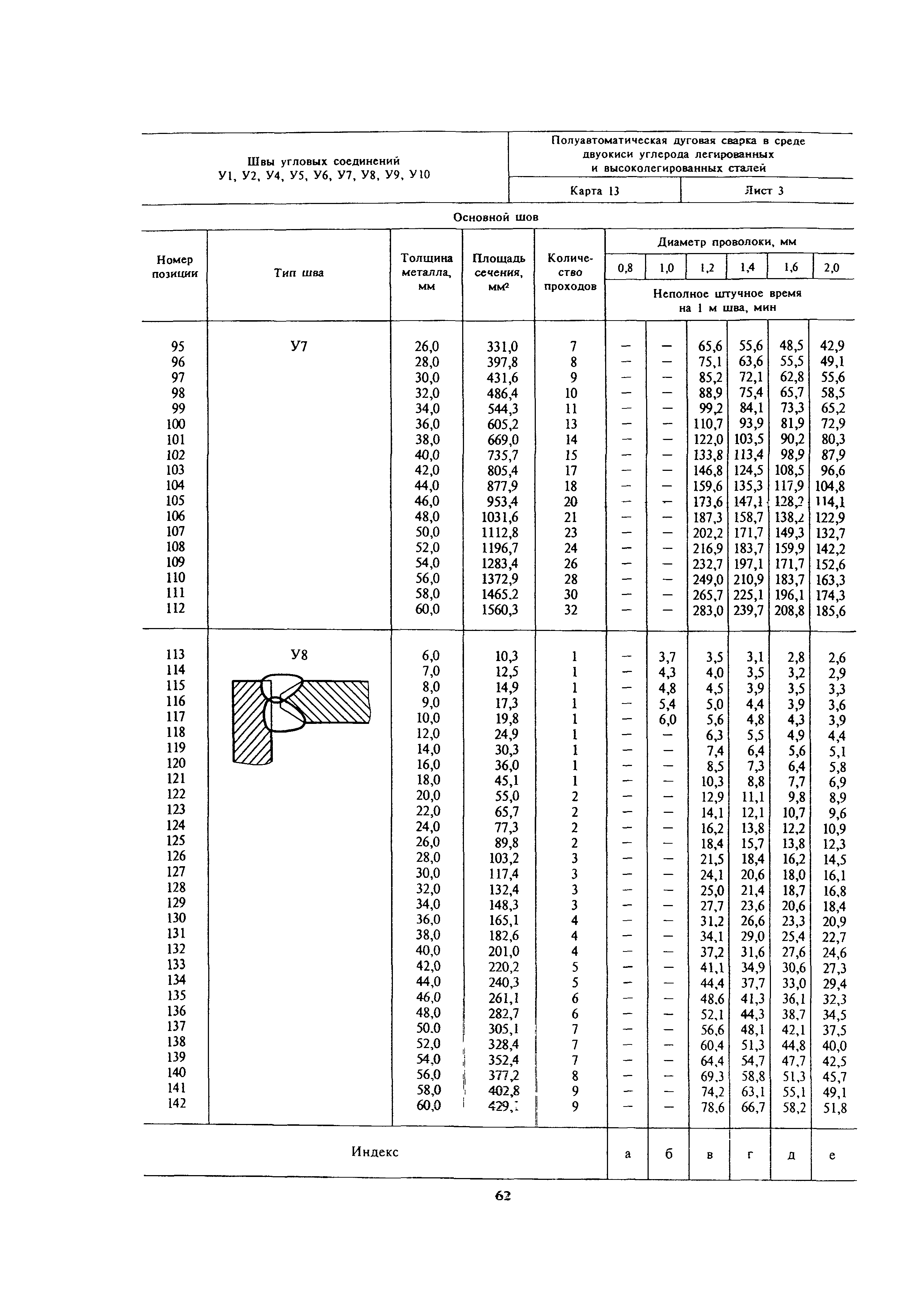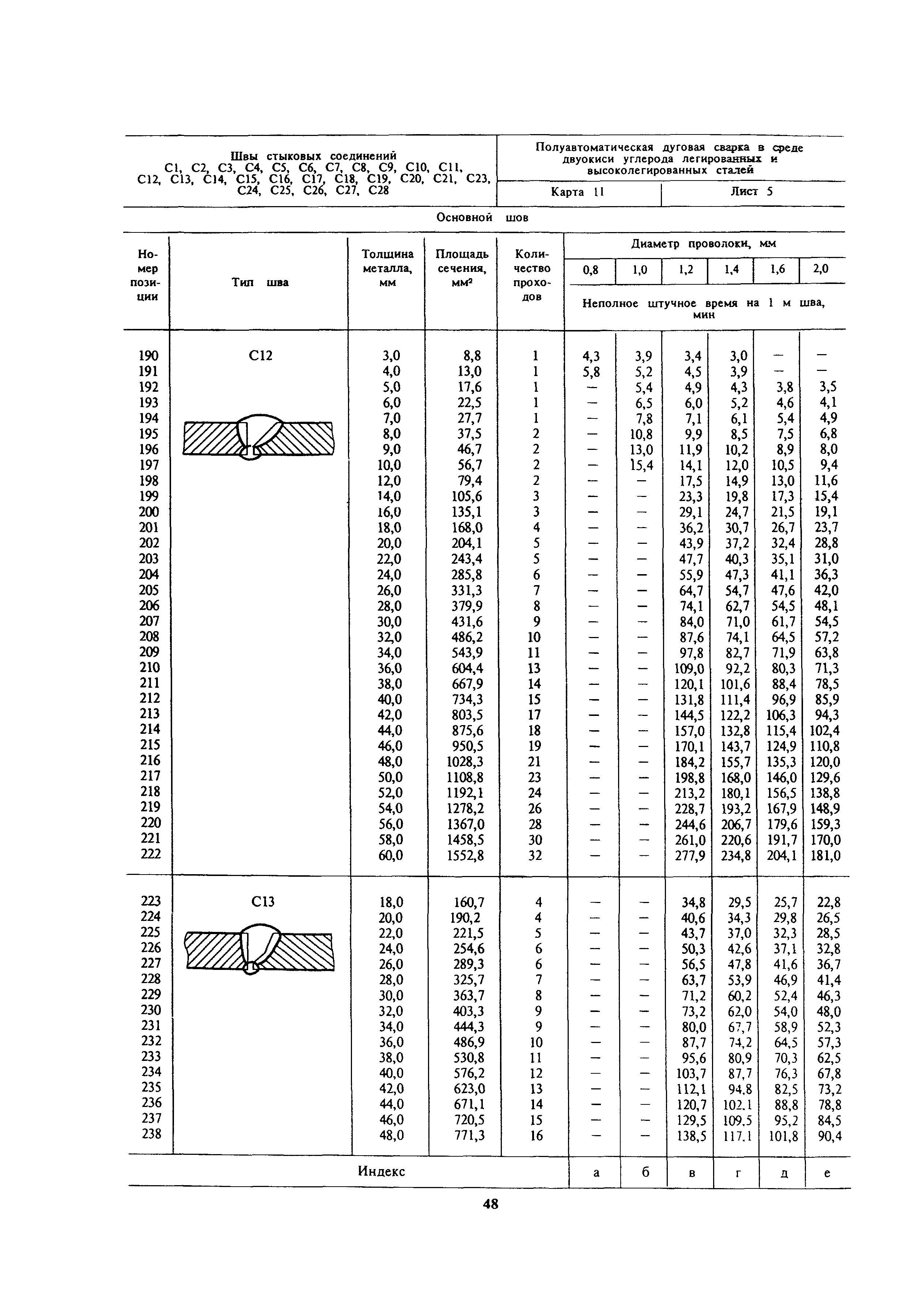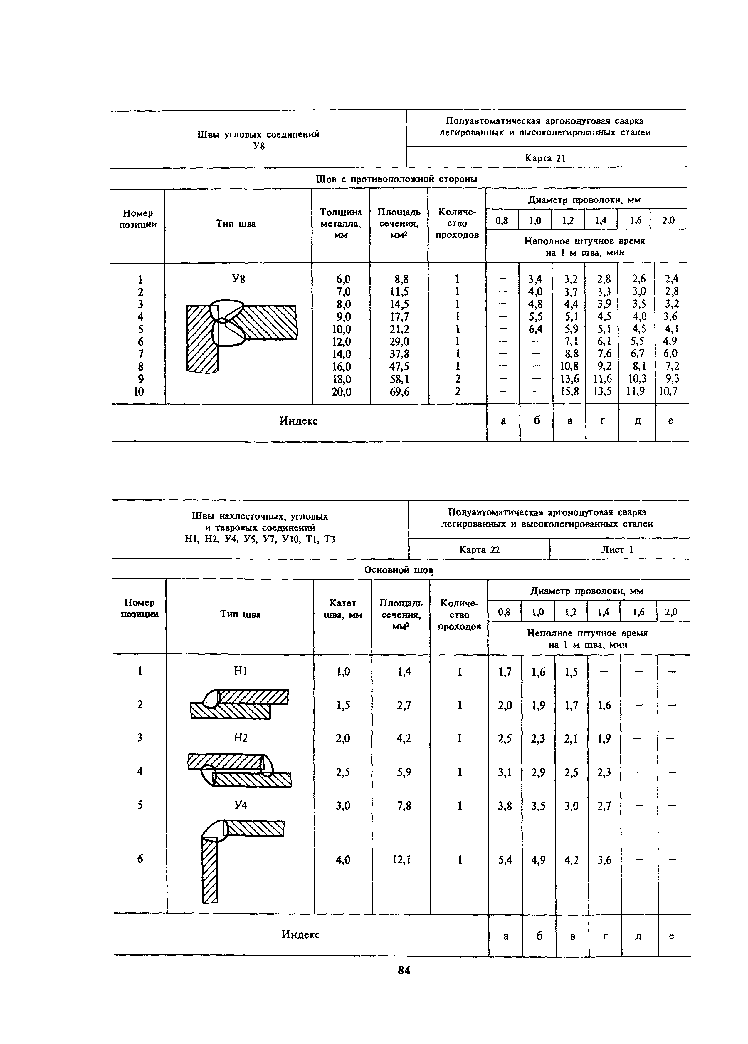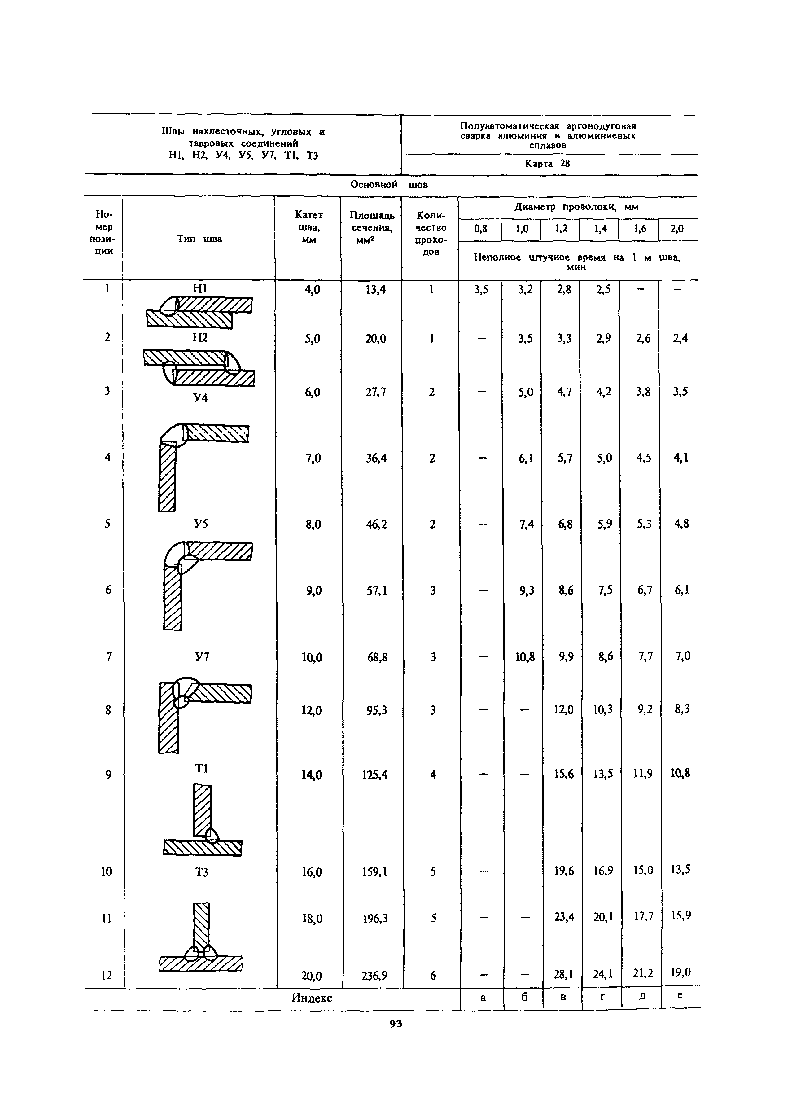 | Оглавление: | 1. Общая часть 2. Наименование оборудования и технология работы 3. Организация труда 4. Нормативная часть 4.1. Неполное штучное время на дуговую сварку 4.2. Вспомогательное время, связанное со сваркой шва. Автоматическая, полуавтоматическая и ручная дуговая сварка 4.3. Вспомогательное время, связанное с изделием и типом оборудования. Автоматическая, полуавтоматическая и ручная дуговая сварка 4.4. Поправочные коэффициенты к картам неполного штучного времени на измененные условия работы. Автоматическая, полуавтоматическая и ручная дуговая сварка 4.5. Приложения Приложения 1. Площадь поперечного сечения шва для расчета количества проходов сварки Приложение 2. Значение коэффициента наплавки металла Приложение 3. Значение коэффициента плотности наплавленного металла Приложение 4. Расчетное значение силы тока в зависимости от толщины металла и диаметра сварочной проволоки для полуавтоматической сварки стыков труб из меди и медно-никелевых сплавов Приложение 6. Расчетное значение скорости сварки в зависимости от диаметра сварочной проволоки и катета шва для автоматической дуговой сварки алюминия и алюминиевых сплавов плавящимся электродом Приложение 7. Расчетное значение скорости сварки в зависимости от диаметра сварочной проволоки и толщины металла при автоматической сварке Приложение 8. Расчетное значение скорости сварки в зависимости от диаметра присадочной проволоки и катета шва при автоматической аргонодуговой сварке алюминия и алюминиевых сплавов неплавящимся электродом Приложение 9. Расчетное значение скорости сварки в зависимости от диаметра присадочной проволоки и толщины металла при автоматической дуговой сварке алюминиевых сплавов неплавящимся электродом Приложение 10. Расчетное значение силы тока в зависимости от диаметра присадочной проволоки и толщины металла при ручной аргонодуговой сварке алюминия и алюминиевых сплавов неплавящимся электродом Приложение 11. Расчетное значение силы тока в зависимости от диаметра присадочной проволоки и толщины металла при ручной аргонодуговой сварке меди и медно-никелевых сплавов неплавящимся электродом Приложение 12. Расчетное значение силы тока в зависимости от диаметра присадочной проволоки и толщины металла при ручной аргонодуговой сварке легированных и высоколегированных сталей плавящимся электродом Приложение 13. Значение длины кольцевого стыка в зависимости от его диаметра Приложение 14. Наименование, индекс, вид шва и формулы расчета площади поперечного сечения швов |