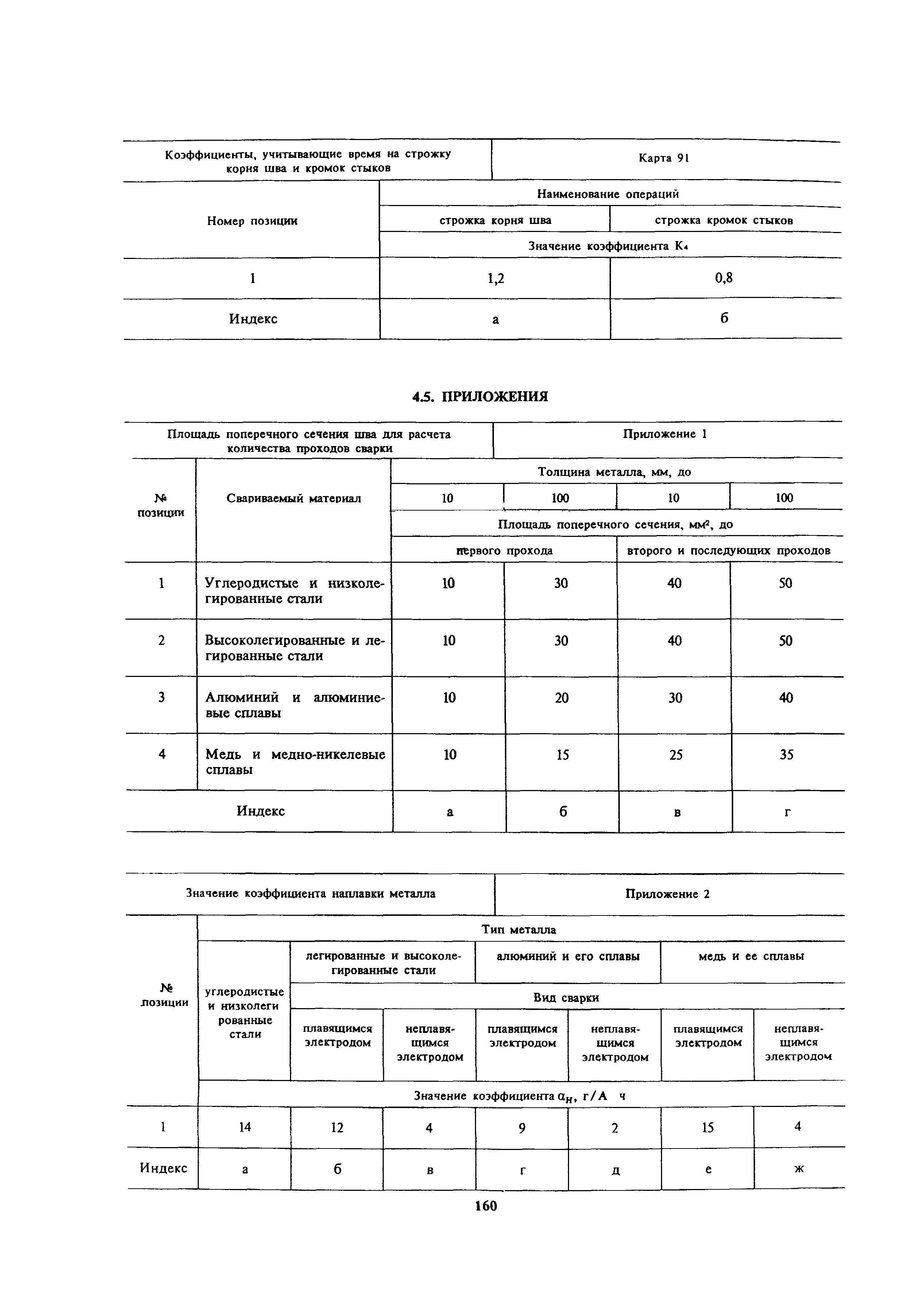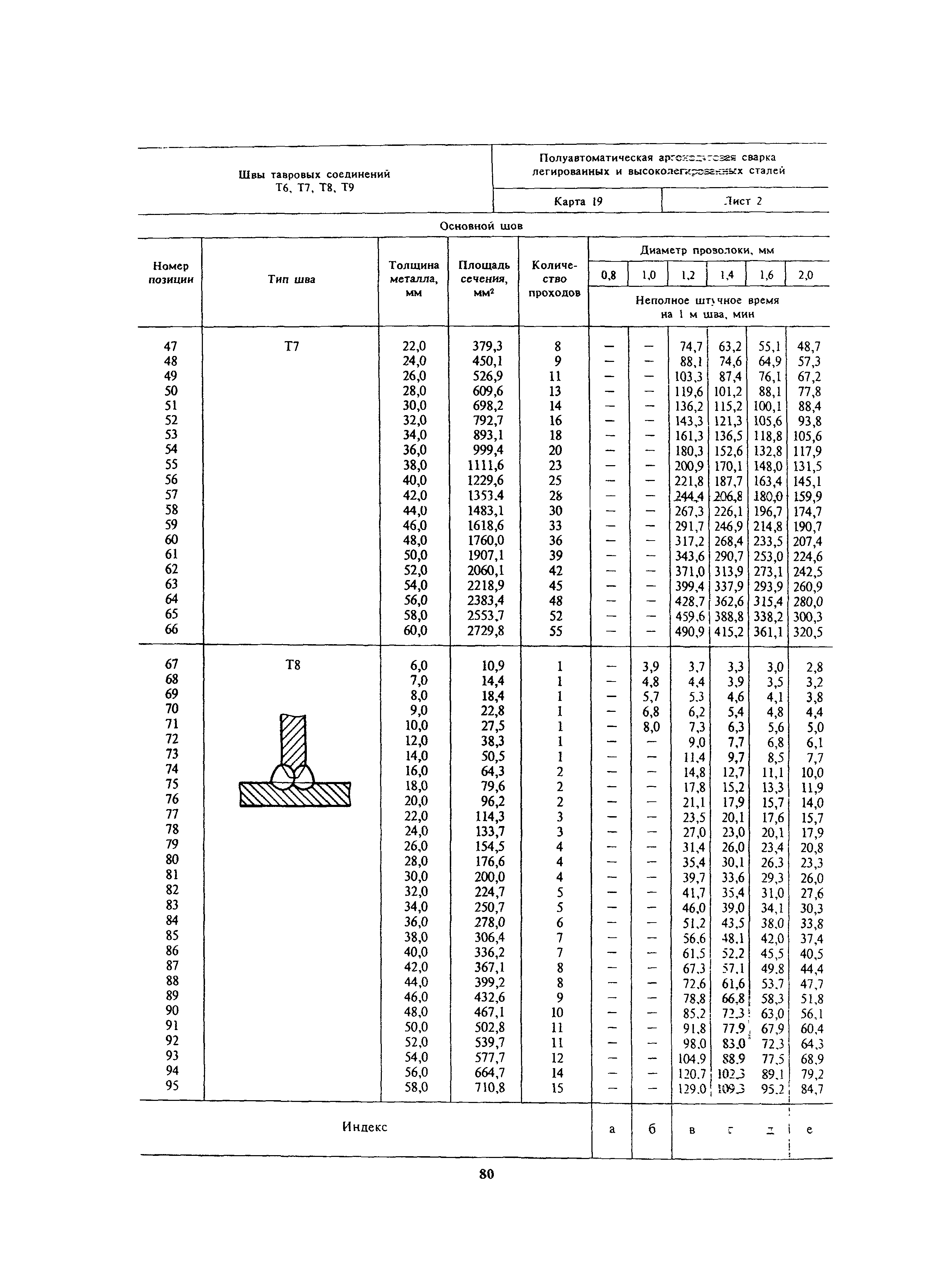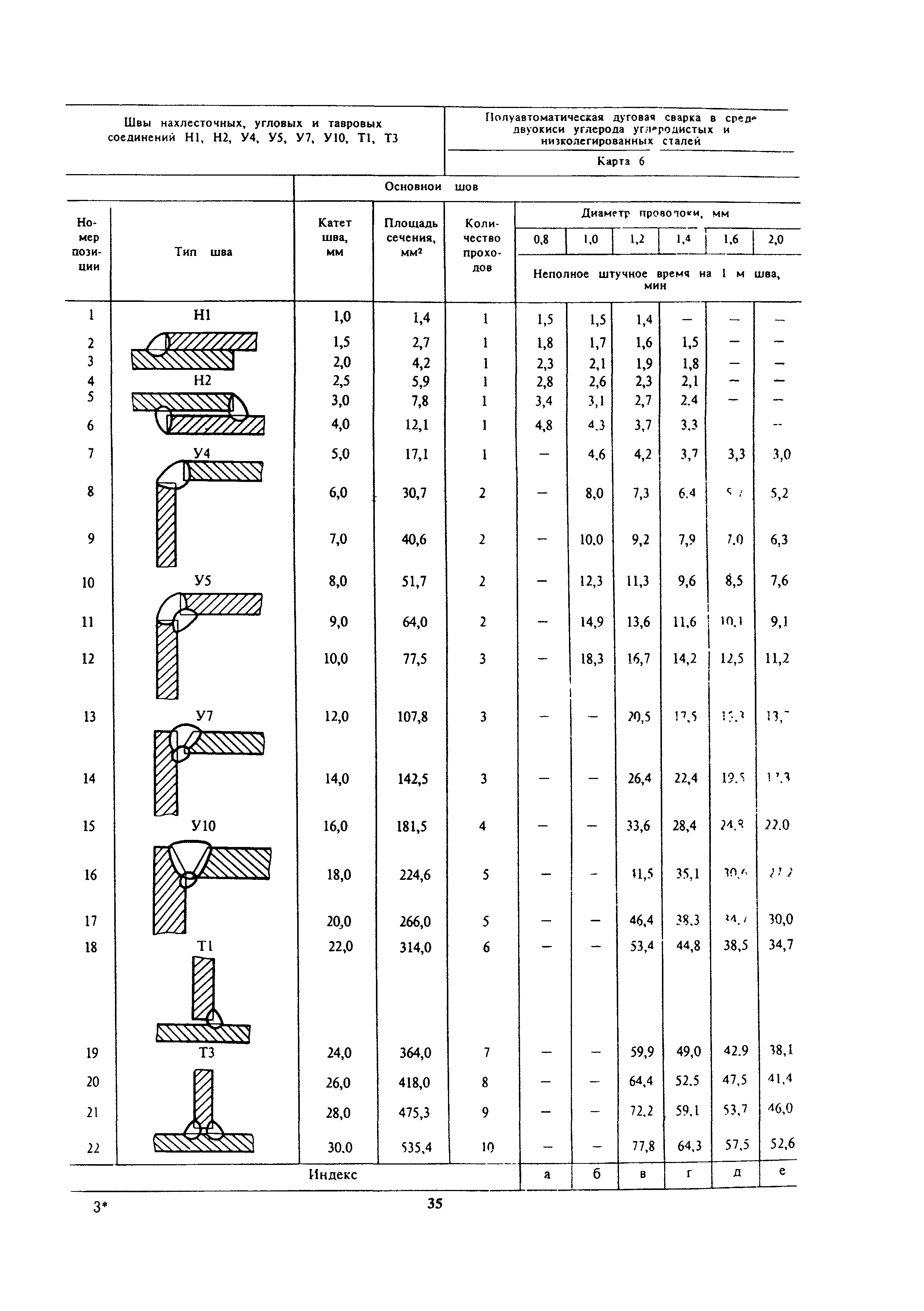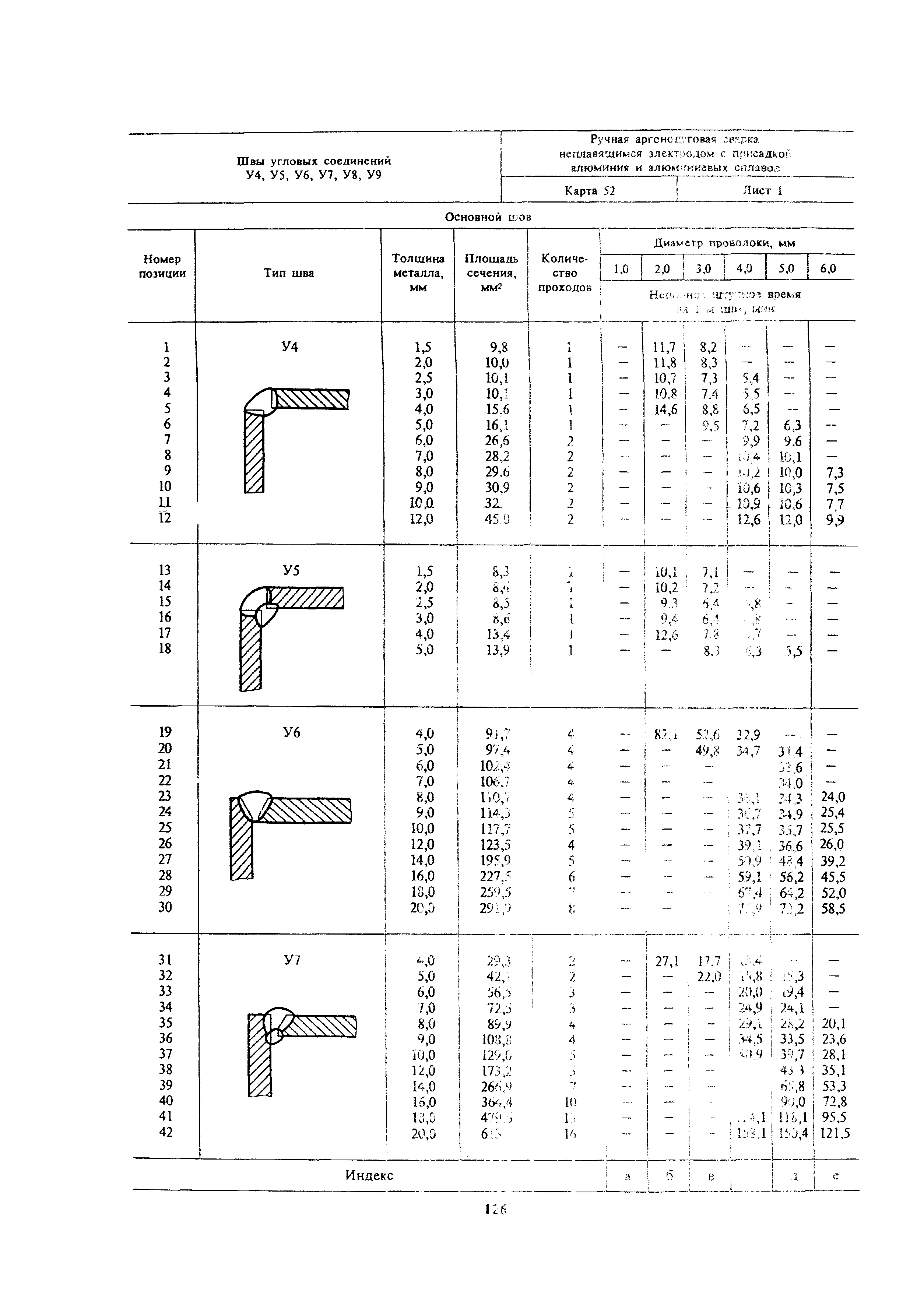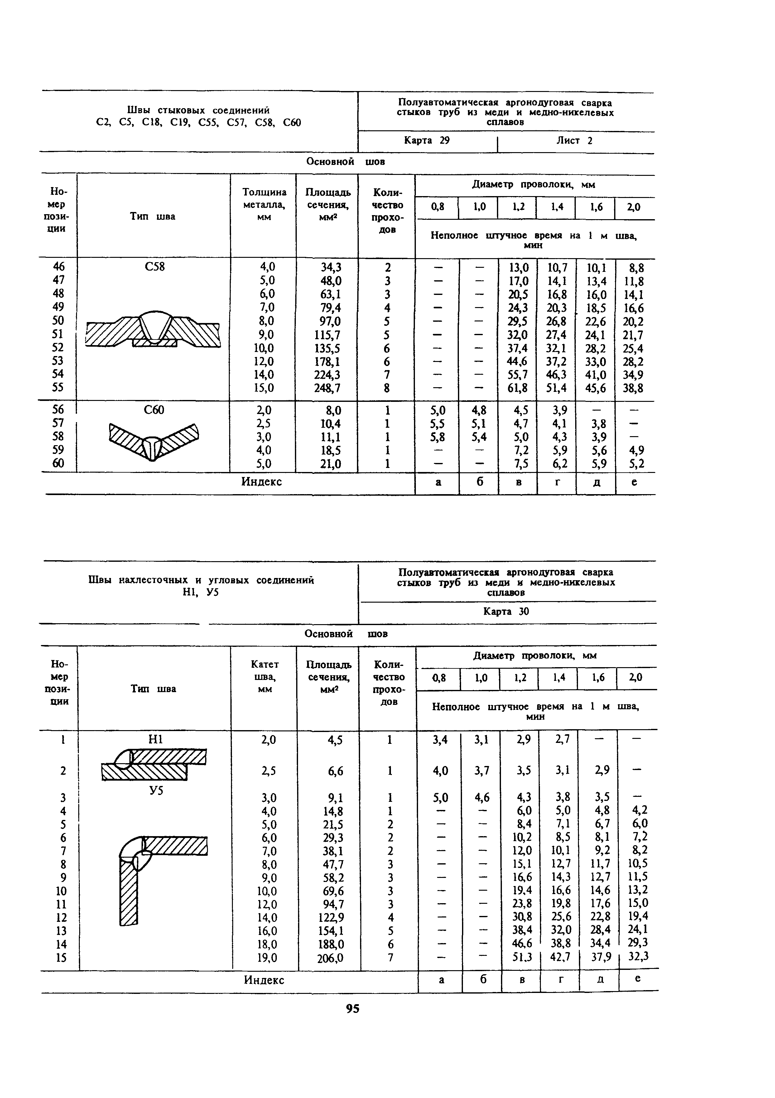| Оглавление: | 1. Общая часть 2. Наименование оборудования и технология работы 3. Организация труда 4. Нормативная часть 4.1. Неполное штучное время на дуговую сварку 4.2. Вспомогательное время, связанное со сваркой шва. Автоматическая, полуавтоматическая и ручная дуговая сварка 4.3. Вспомогательное время, связанное с изделием и типом оборудования. Автоматическая, полуавтоматическая и ручная дуговая сварка 4.4. Поправочные коэффициенты к картам неполного штучного времени на измененные условия работы. Автоматическая, полуавтоматическая и ручная дуговая сварка 4.5. Приложения Приложения 1. Площадь поперечного сечения шва для расчета количества проходов сварки Приложение 2. Значение коэффициента наплавки металла Приложение 3. Значение коэффициента плотности наплавленного металла Приложение 4. Расчетное значение силы тока в зависимости от толщины металла и диаметра сварочной проволоки для полуавтоматической сварки стыков труб из меди и медно-никелевых сплавов Приложение 6. Расчетное значение скорости сварки в зависимости от диаметра сварочной проволоки и катета шва для автоматической дуговой сварки алюминия и алюминиевых сплавов плавящимся электродом Приложение 7. Расчетное значение скорости сварки в зависимости от диаметра сварочной проволоки и толщины металла при автоматической сварке Приложение 8. Расчетное значение скорости сварки в зависимости от диаметра присадочной проволоки и катета шва при автоматической аргонодуговой сварке алюминия и алюминиевых сплавов неплавящимся электродом Приложение 9. Расчетное значение скорости сварки в зависимости от диаметра присадочной проволоки и толщины металла при автоматической дуговой сварке алюминиевых сплавов неплавящимся электродом Приложение 10. Расчетное значение силы тока в зависимости от диаметра присадочной проволоки и толщины металла при ручной аргонодуговой сварке алюминия и алюминиевых сплавов неплавящимся электродом Приложение 11. Расчетное значение силы тока в зависимости от диаметра присадочной проволоки и толщины металла при ручной аргонодуговой сварке меди и медно-никелевых сплавов неплавящимся электродом Приложение 12. Расчетное значение силы тока в зависимости от диаметра присадочной проволоки и толщины металла при ручной аргонодуговой сварке легированных и высоколегированных сталей плавящимся электродом Приложение 13. Значение длины кольцевого стыка в зависимости от его диаметра Приложение 14. Наименование, индекс, вид шва и формулы расчета площади поперечного сечения швов |
