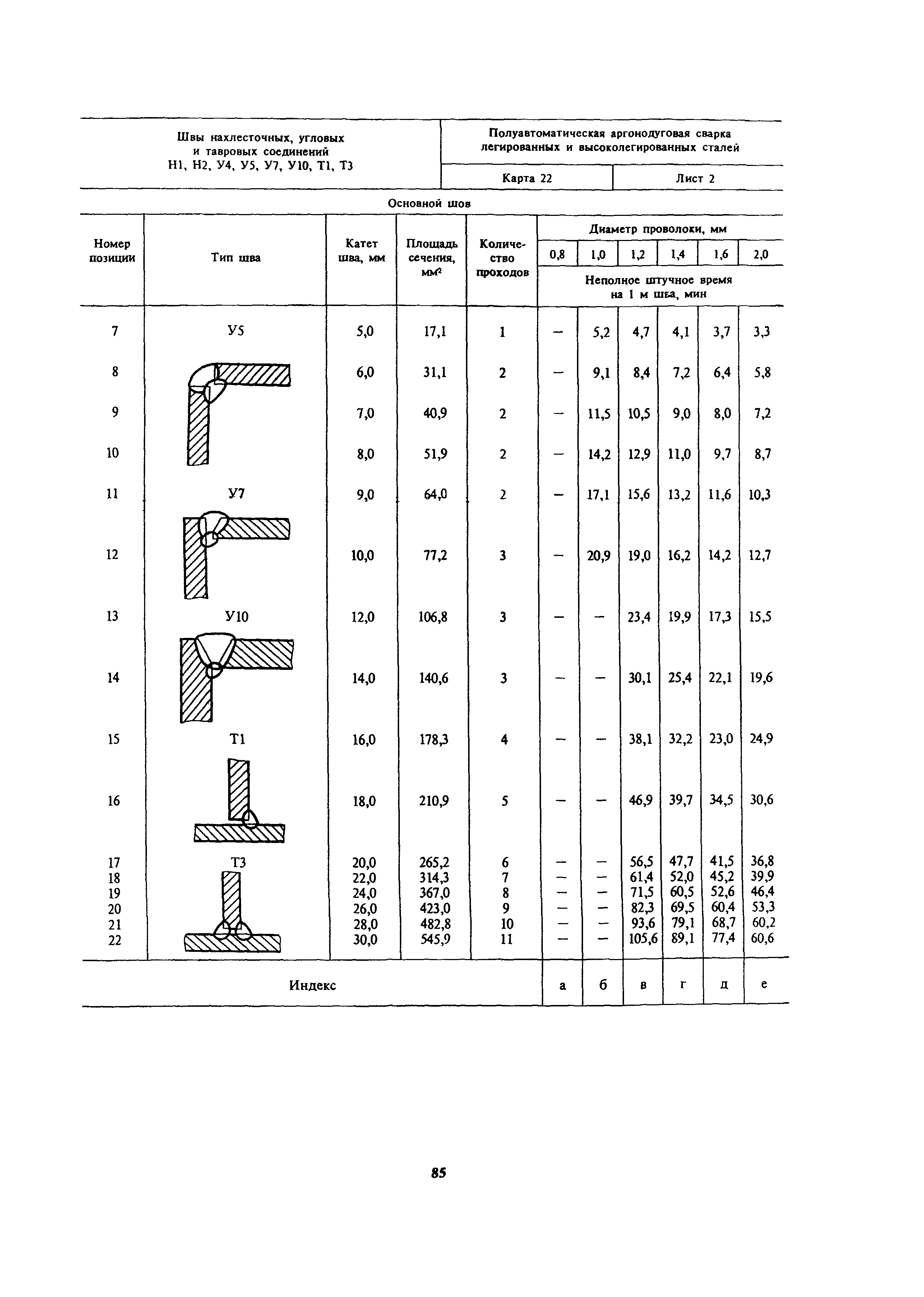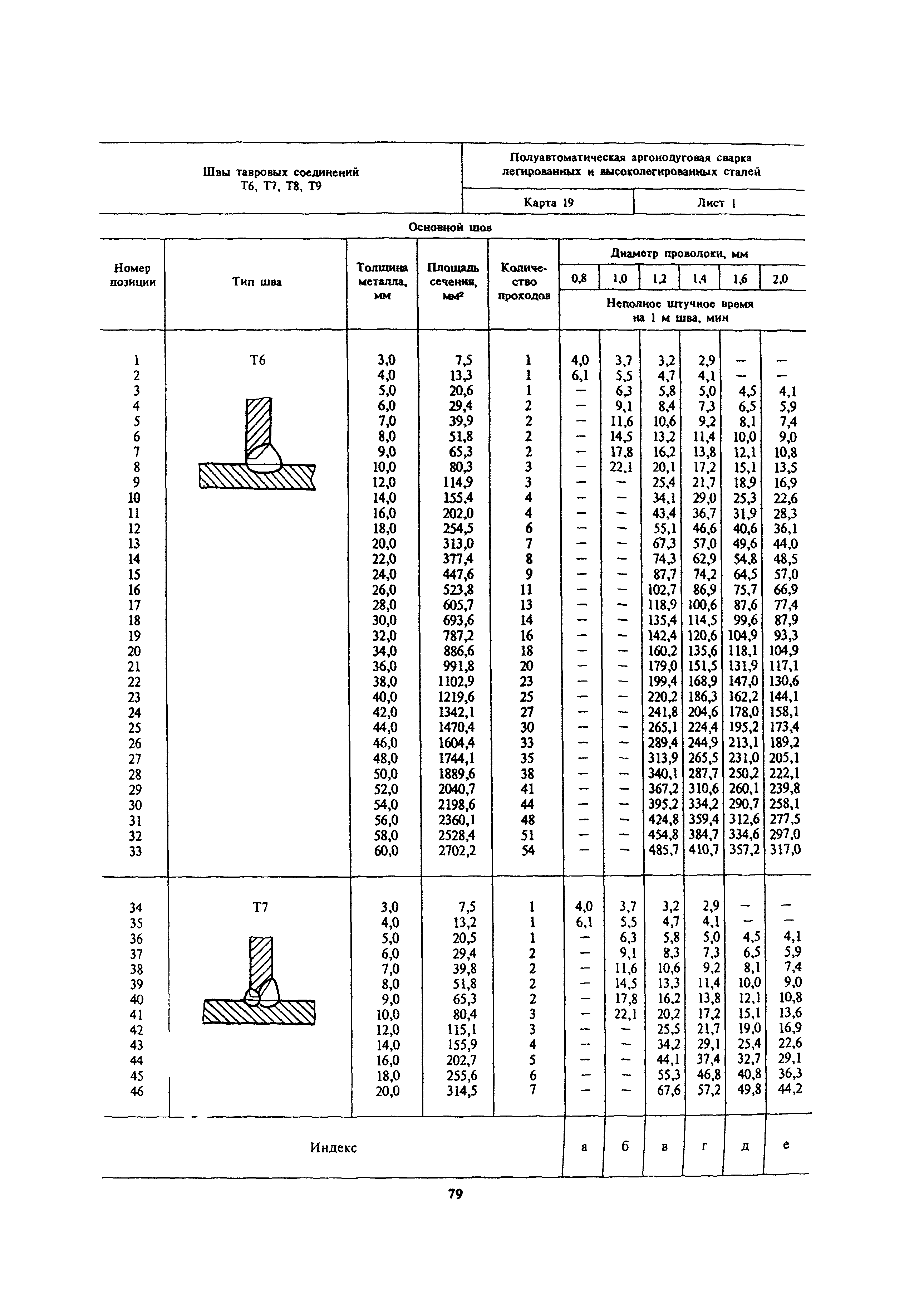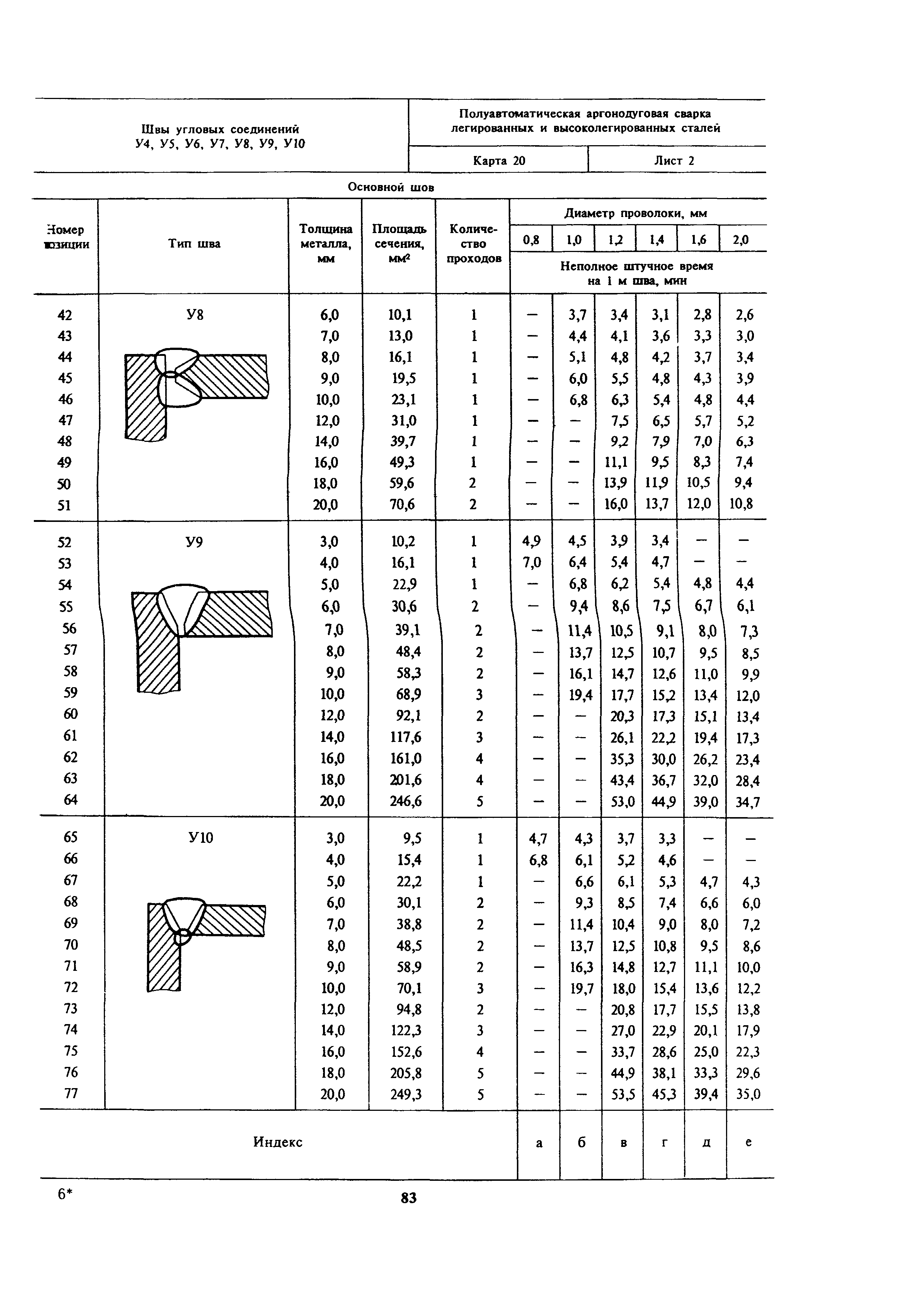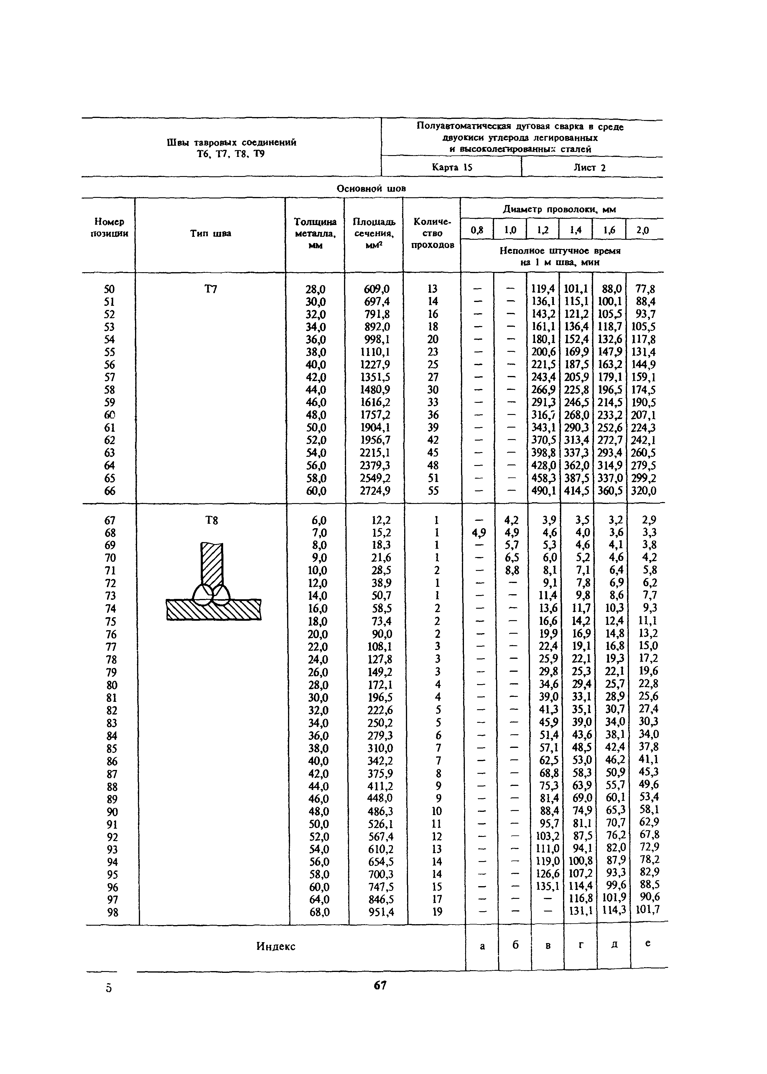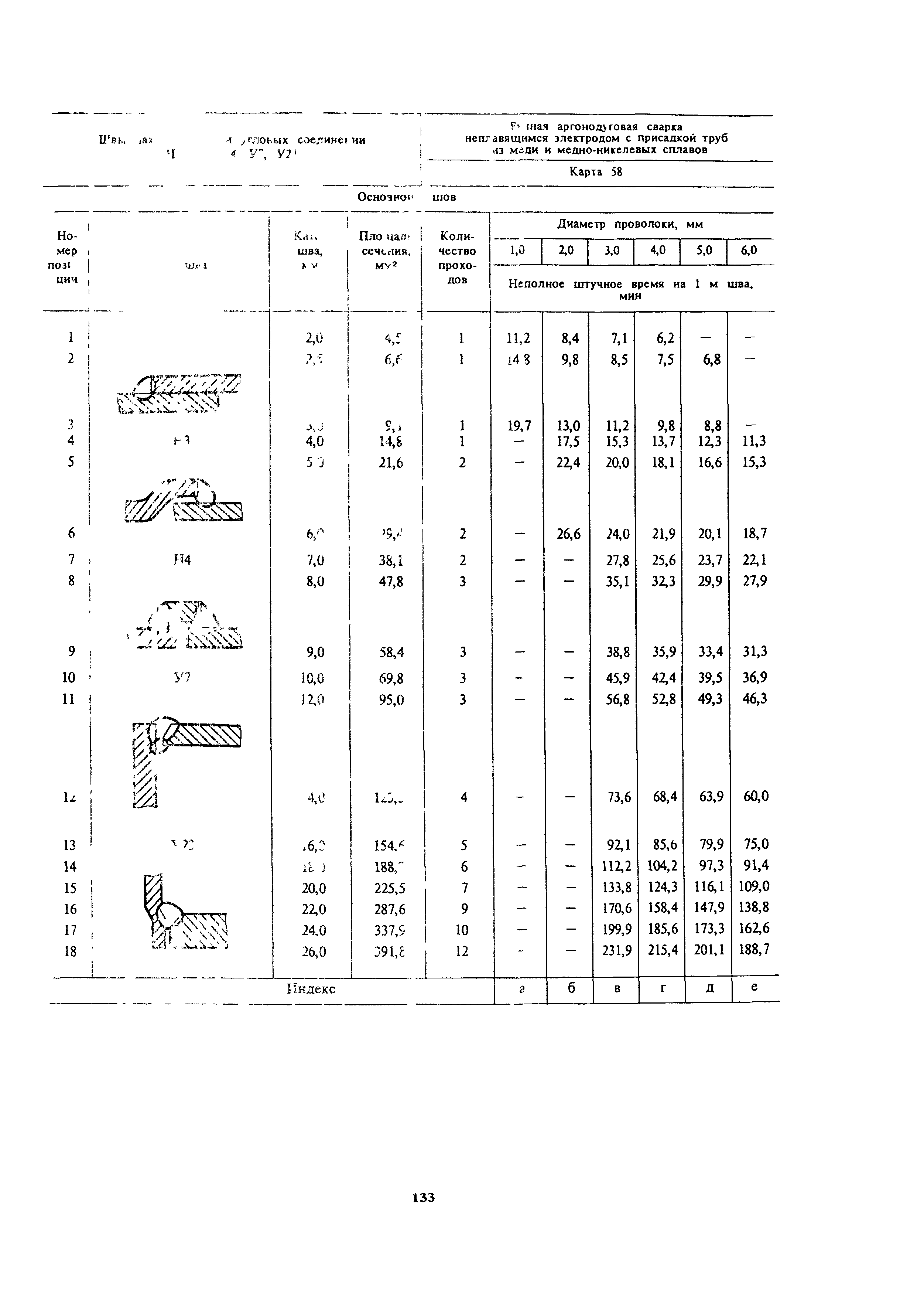 | Оглавление: | 1. Общая часть 2. Наименование оборудования и технология работы 3. Организация труда 4. Нормативная часть 4.1. Неполное штучное время на дуговую сварку 4.2. Вспомогательное время, связанное со сваркой шва. Автоматическая, полуавтоматическая и ручная дуговая сварка 4.3. Вспомогательное время, связанное с изделием и типом оборудования. Автоматическая, полуавтоматическая и ручная дуговая сварка 4.4. Поправочные коэффициенты к картам неполного штучного времени на измененные условия работы. Автоматическая, полуавтоматическая и ручная дуговая сварка 4.5. Приложения Приложения 1. Площадь поперечного сечения шва для расчета количества проходов сварки Приложение 2. Значение коэффициента наплавки металла Приложение 3. Значение коэффициента плотности наплавленного металла Приложение 4. Расчетное значение силы тока в зависимости от толщины металла и диаметра сварочной проволоки для полуавтоматической сварки стыков труб из меди и медно-никелевых сплавов Приложение 6. Расчетное значение скорости сварки в зависимости от диаметра сварочной проволоки и катета шва для автоматической дуговой сварки алюминия и алюминиевых сплавов плавящимся электродом Приложение 7. Расчетное значение скорости сварки в зависимости от диаметра сварочной проволоки и толщины металла при автоматической сварке Приложение 8. Расчетное значение скорости сварки в зависимости от диаметра присадочной проволоки и катета шва при автоматической аргонодуговой сварке алюминия и алюминиевых сплавов неплавящимся электродом Приложение 9. Расчетное значение скорости сварки в зависимости от диаметра присадочной проволоки и толщины металла при автоматической дуговой сварке алюминиевых сплавов неплавящимся электродом Приложение 10. Расчетное значение силы тока в зависимости от диаметра присадочной проволоки и толщины металла при ручной аргонодуговой сварке алюминия и алюминиевых сплавов неплавящимся электродом Приложение 11. Расчетное значение силы тока в зависимости от диаметра присадочной проволоки и толщины металла при ручной аргонодуговой сварке меди и медно-никелевых сплавов неплавящимся электродом Приложение 12. Расчетное значение силы тока в зависимости от диаметра присадочной проволоки и толщины металла при ручной аргонодуговой сварке легированных и высоколегированных сталей плавящимся электродом Приложение 13. Значение длины кольцевого стыка в зависимости от его диаметра Приложение 14. Наименование, индекс, вид шва и формулы расчета площади поперечного сечения швов |