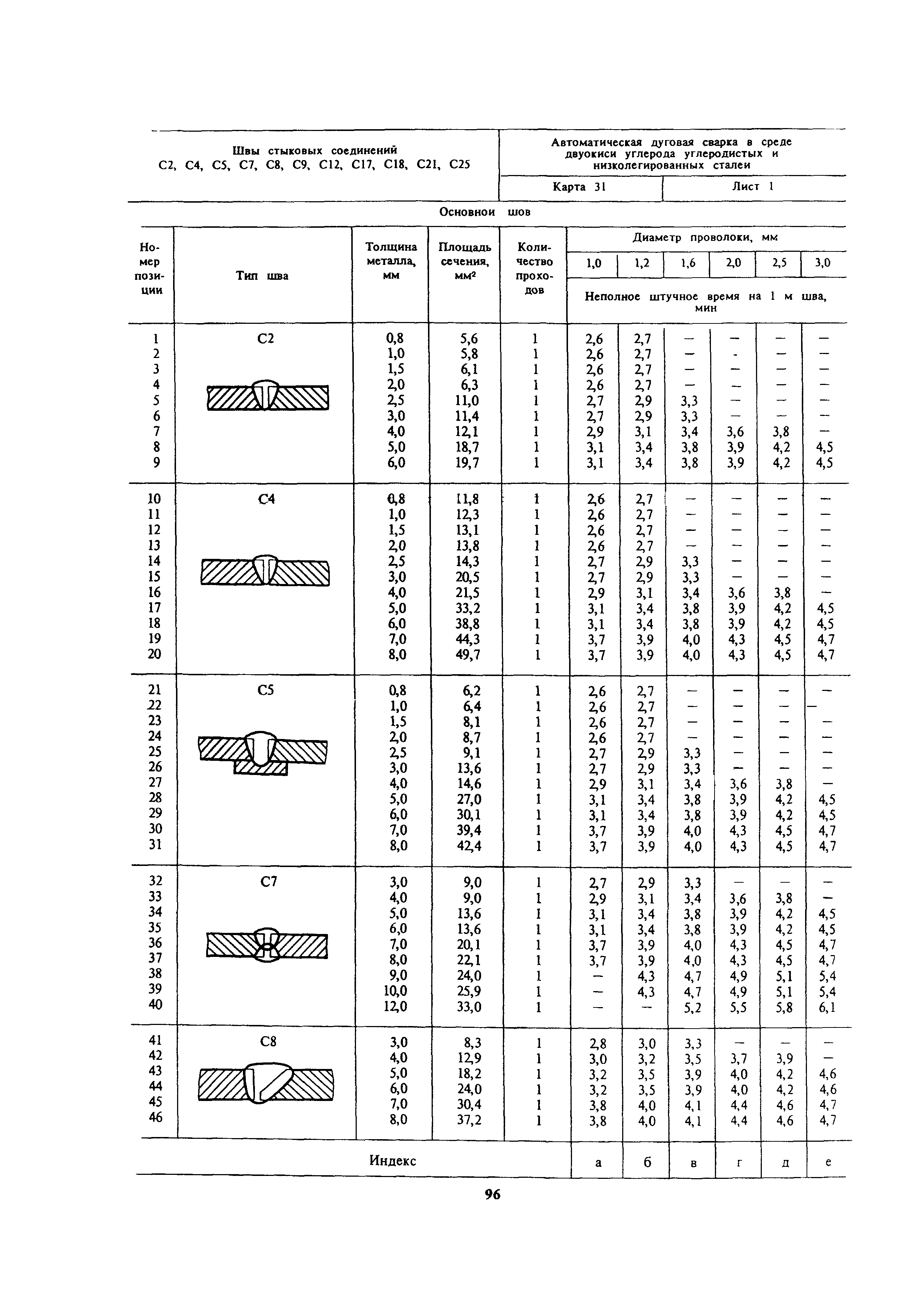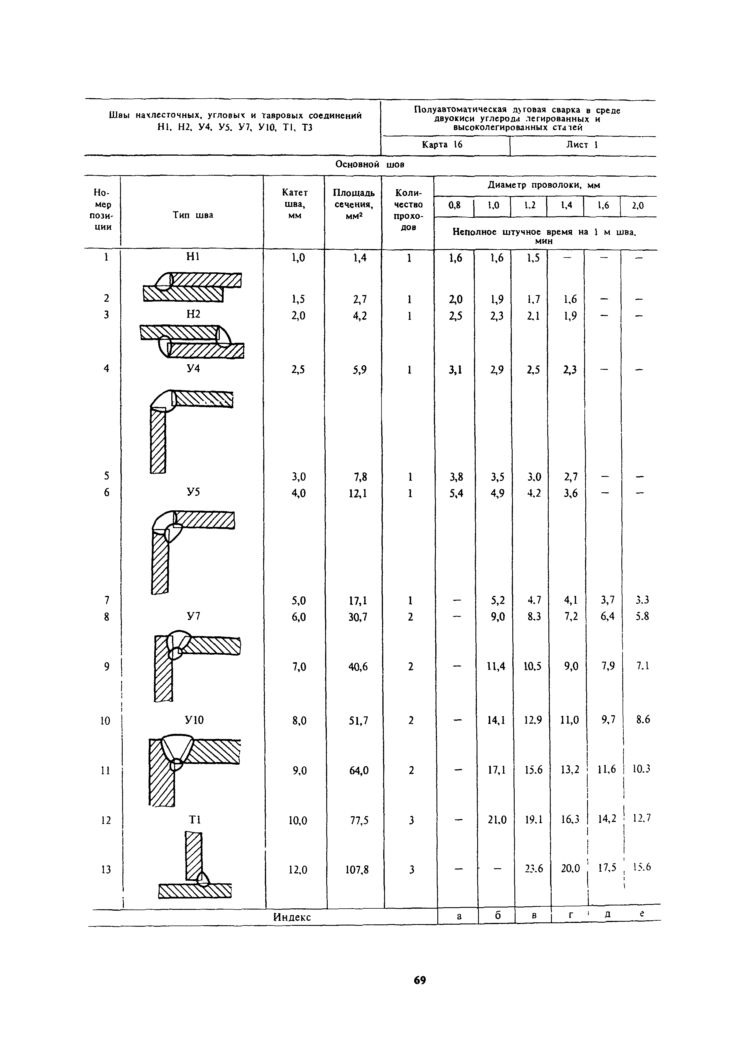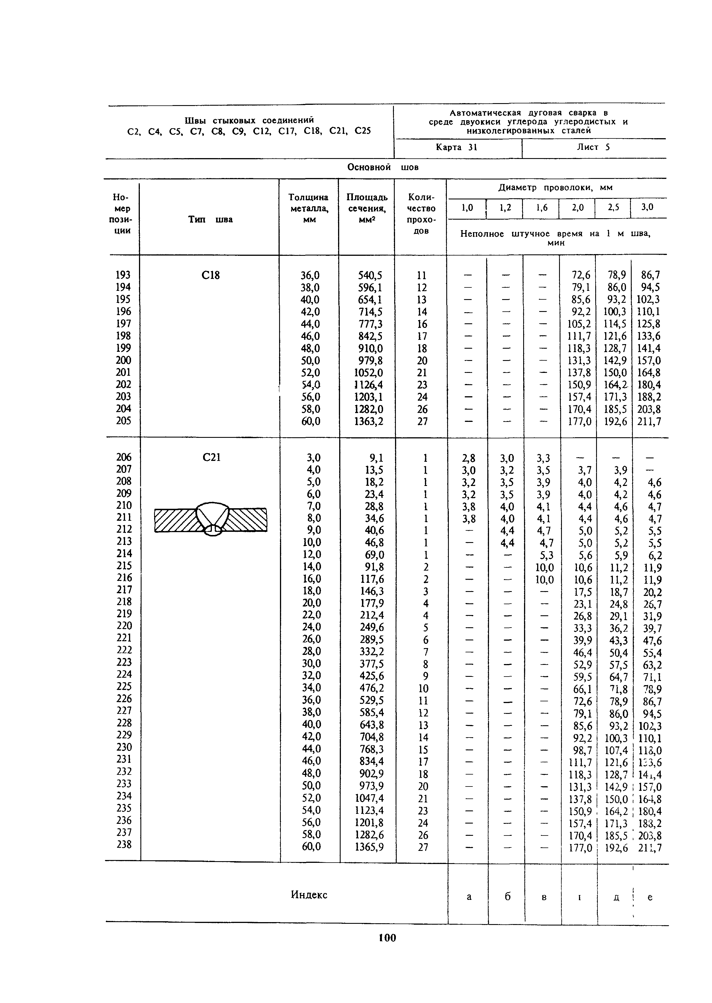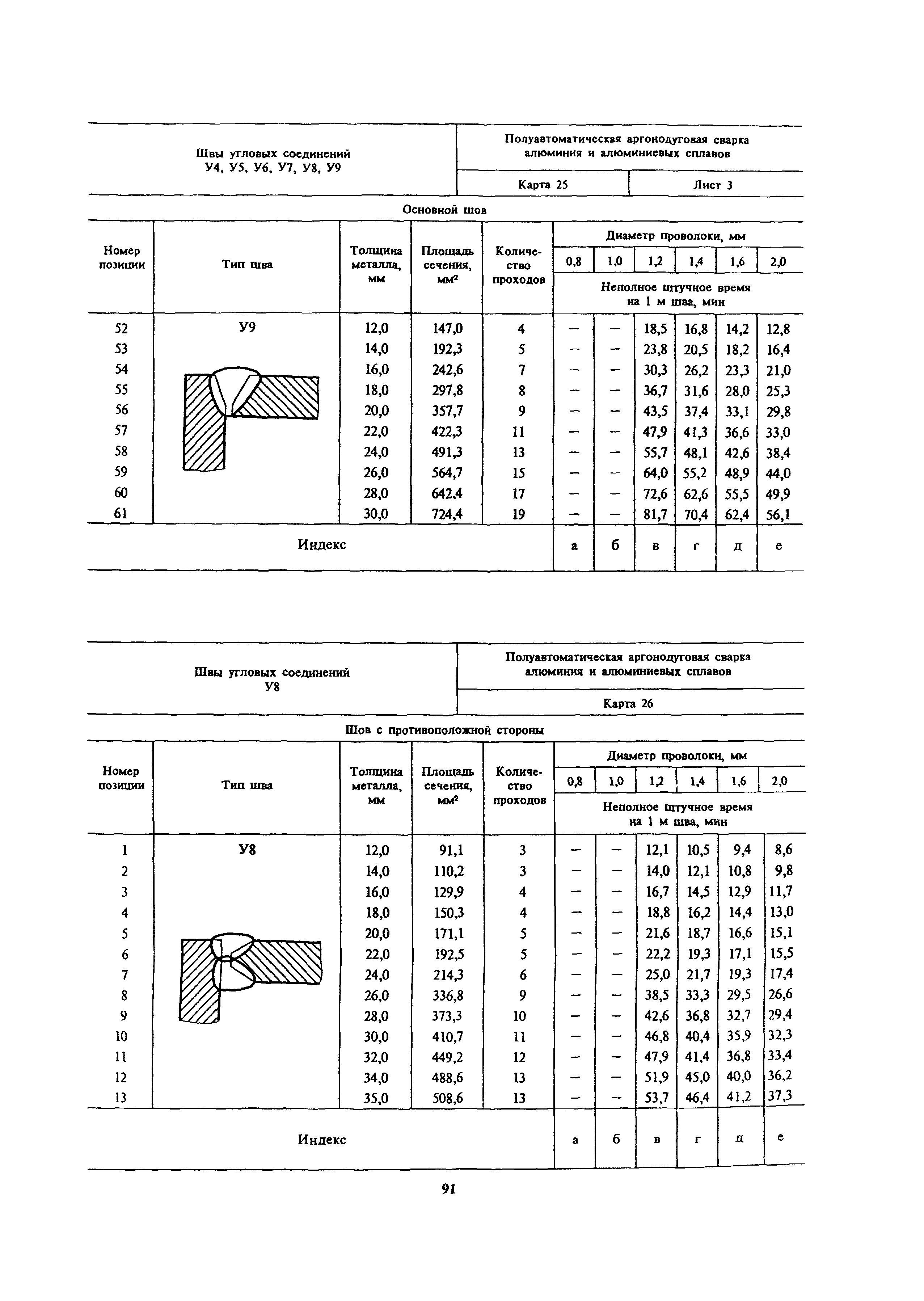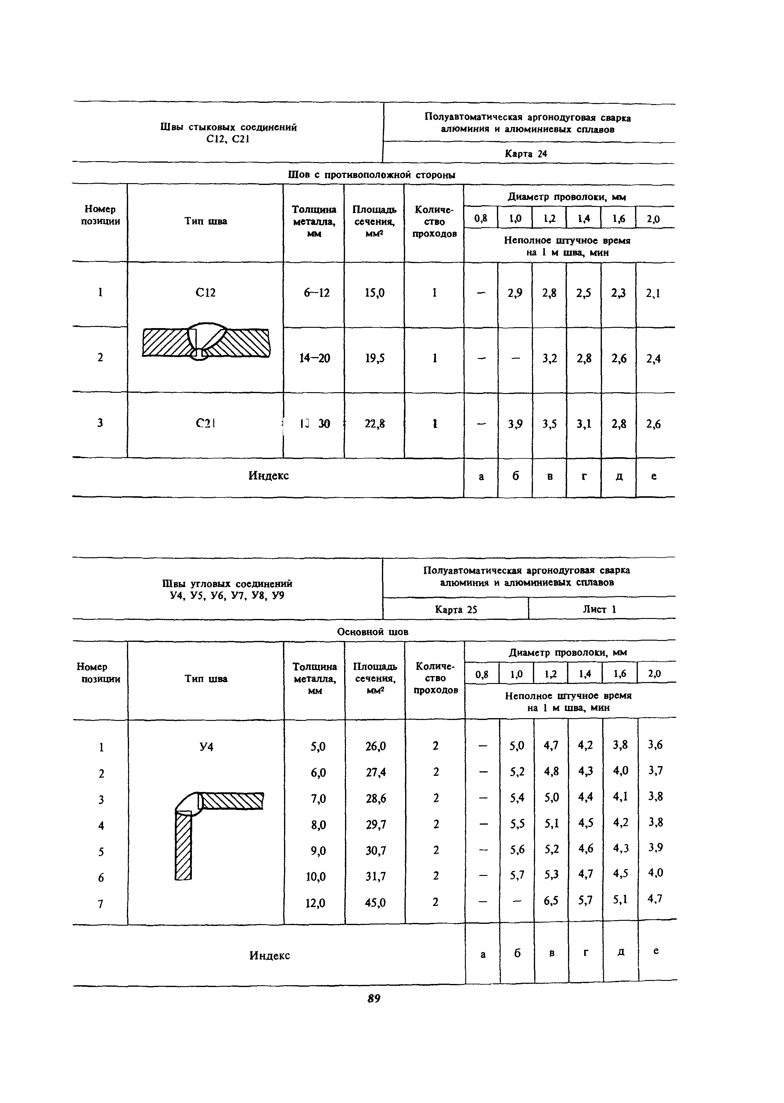 | Оглавление: | 1. Общая часть 2. Наименование оборудования и технология работы 3. Организация труда 4. Нормативная часть 4.1. Неполное штучное время на дуговую сварку 4.2. Вспомогательное время, связанное со сваркой шва. Автоматическая, полуавтоматическая и ручная дуговая сварка 4.3. Вспомогательное время, связанное с изделием и типом оборудования. Автоматическая, полуавтоматическая и ручная дуговая сварка 4.4. Поправочные коэффициенты к картам неполного штучного времени на измененные условия работы. Автоматическая, полуавтоматическая и ручная дуговая сварка 4.5. Приложения Приложения 1. Площадь поперечного сечения шва для расчета количества проходов сварки Приложение 2. Значение коэффициента наплавки металла Приложение 3. Значение коэффициента плотности наплавленного металла Приложение 4. Расчетное значение силы тока в зависимости от толщины металла и диаметра сварочной проволоки для полуавтоматической сварки стыков труб из меди и медно-никелевых сплавов Приложение 6. Расчетное значение скорости сварки в зависимости от диаметра сварочной проволоки и катета шва для автоматической дуговой сварки алюминия и алюминиевых сплавов плавящимся электродом Приложение 7. Расчетное значение скорости сварки в зависимости от диаметра сварочной проволоки и толщины металла при автоматической сварке Приложение 8. Расчетное значение скорости сварки в зависимости от диаметра присадочной проволоки и катета шва при автоматической аргонодуговой сварке алюминия и алюминиевых сплавов неплавящимся электродом Приложение 9. Расчетное значение скорости сварки в зависимости от диаметра присадочной проволоки и толщины металла при автоматической дуговой сварке алюминиевых сплавов неплавящимся электродом Приложение 10. Расчетное значение силы тока в зависимости от диаметра присадочной проволоки и толщины металла при ручной аргонодуговой сварке алюминия и алюминиевых сплавов неплавящимся электродом Приложение 11. Расчетное значение силы тока в зависимости от диаметра присадочной проволоки и толщины металла при ручной аргонодуговой сварке меди и медно-никелевых сплавов неплавящимся электродом Приложение 12. Расчетное значение силы тока в зависимости от диаметра присадочной проволоки и толщины металла при ручной аргонодуговой сварке легированных и высоколегированных сталей плавящимся электродом Приложение 13. Значение длины кольцевого стыка в зависимости от его диаметра Приложение 14. Наименование, индекс, вид шва и формулы расчета площади поперечного сечения швов |